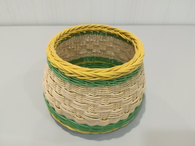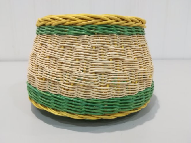 Petite corbeille en moelle de rotin avec tressage en super en alternant la distribution des montants pour créer un effet damassé.