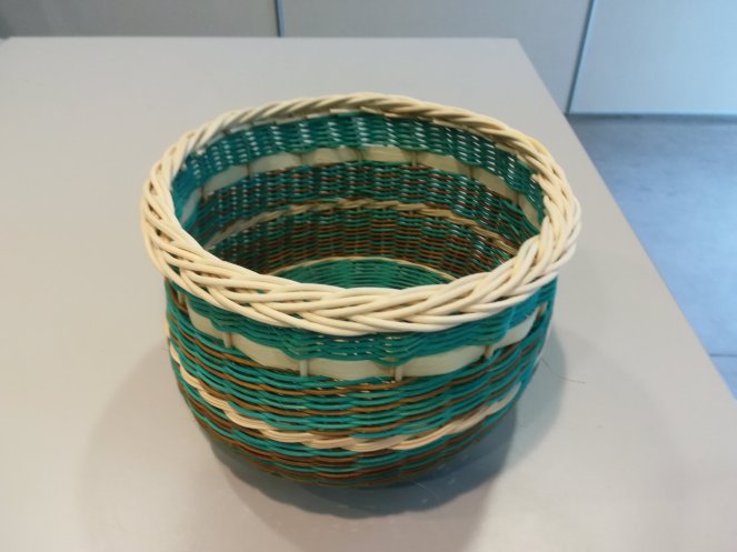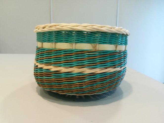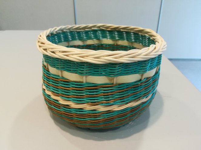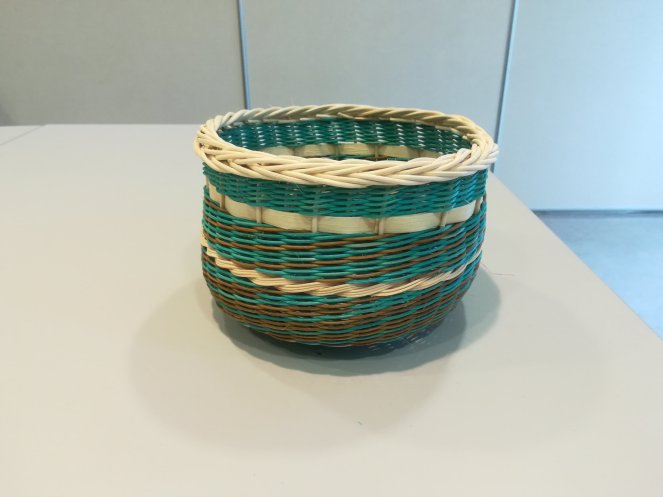 Une petite corbeille haute tout en rotin sur un fond en croisée suédoise. Le tressage est en torche à 3 brins avec une torche à 6 et une bande naturelle pour faire ressortir les couleurs. Une bordure ordinaire termine l’ouvrage.