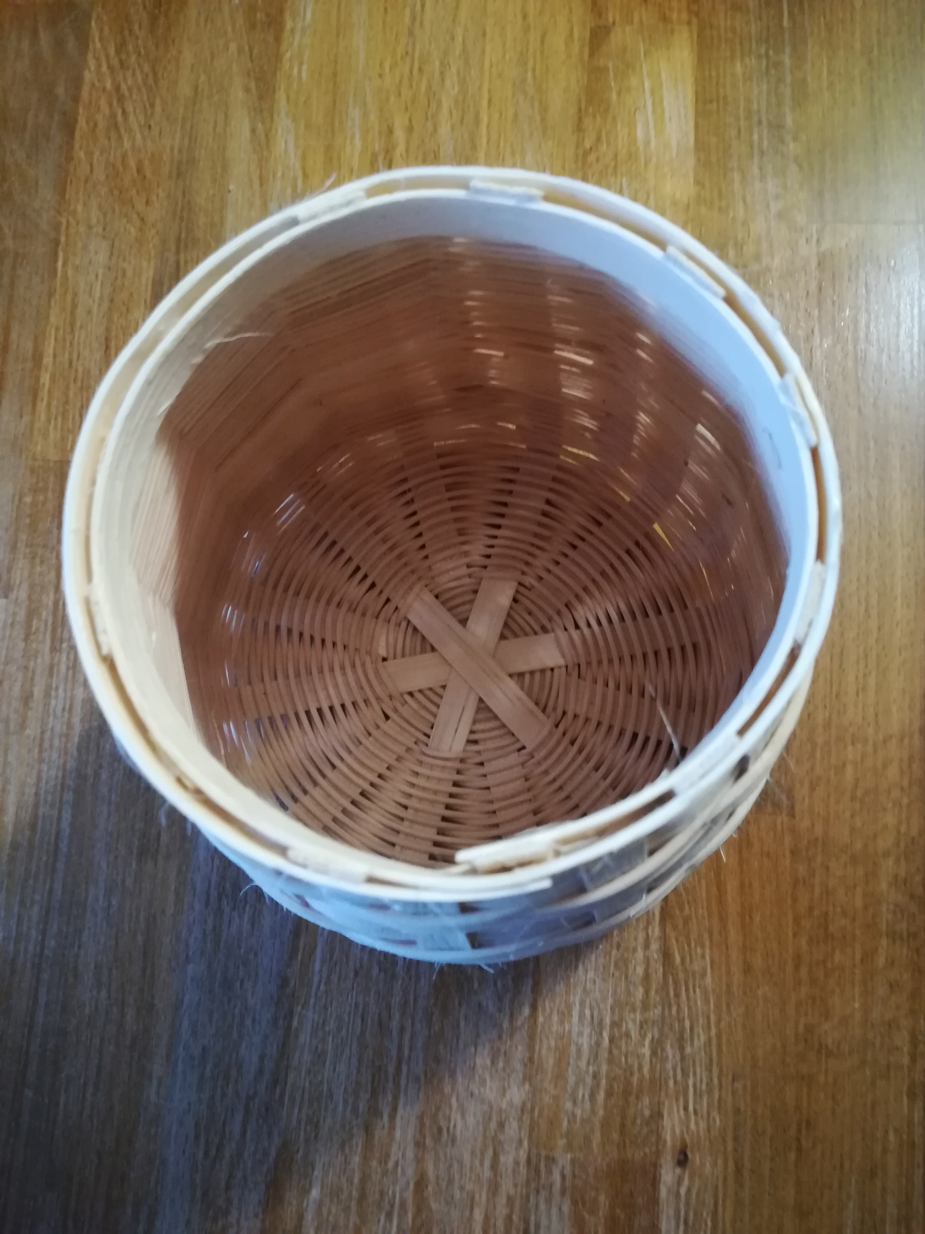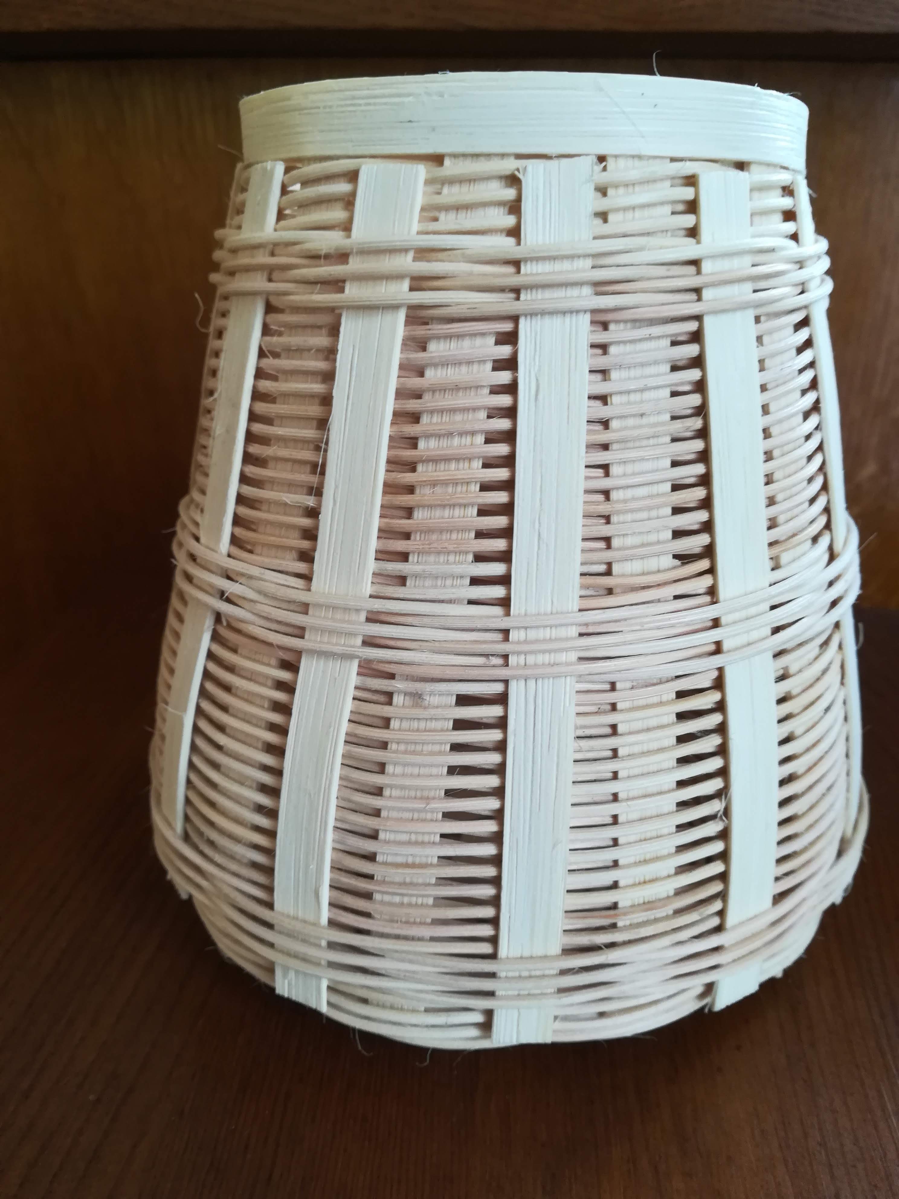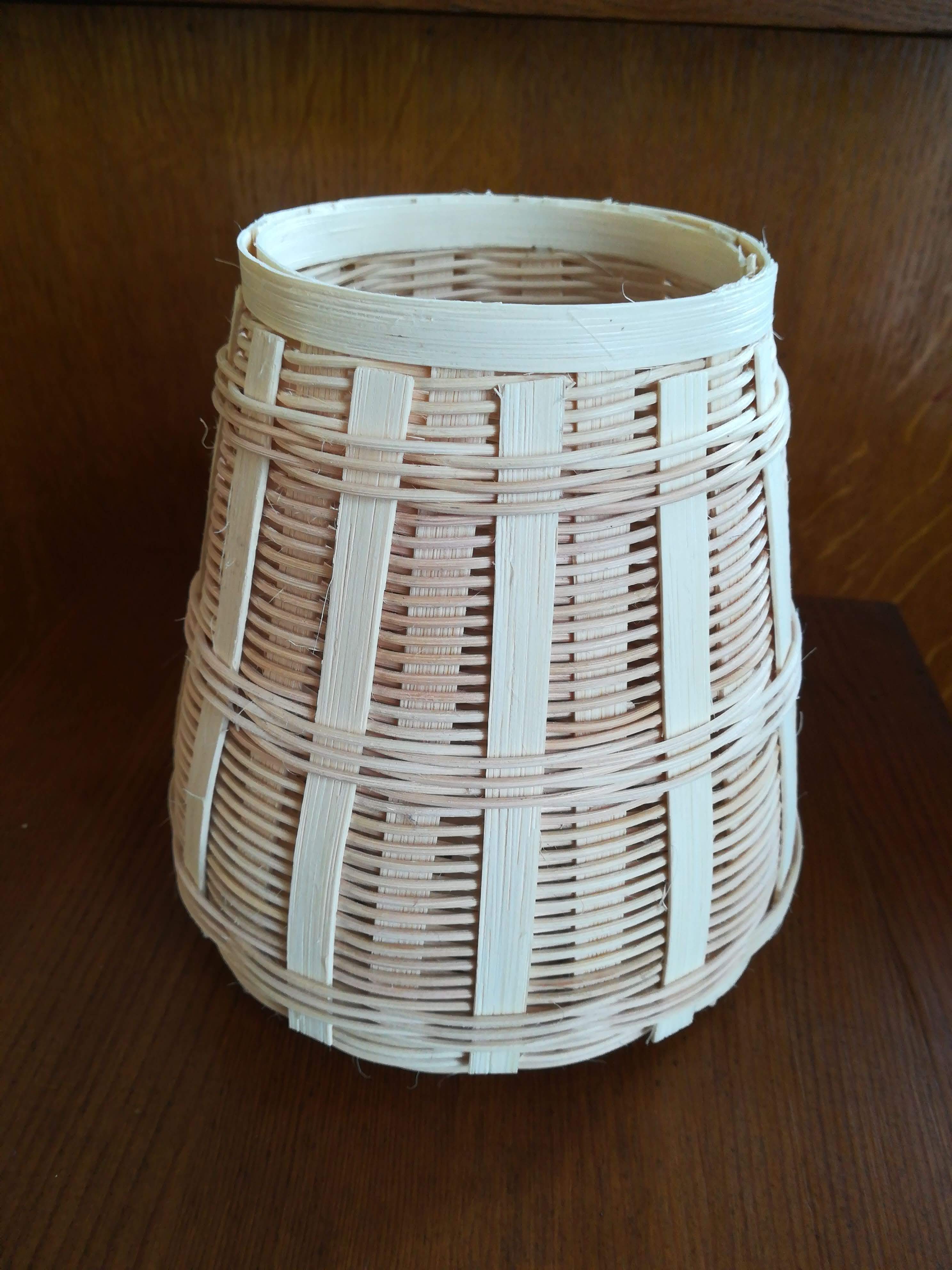 Petite corbeille, tout en rotin naturel, réalisée sur une armature en bande puis tressée en super avec de la moelle. Et pour décorer, j’ai inséré par dessus le tressage des bandes de rotin, maintenues par les trois séries de rangs en torche.