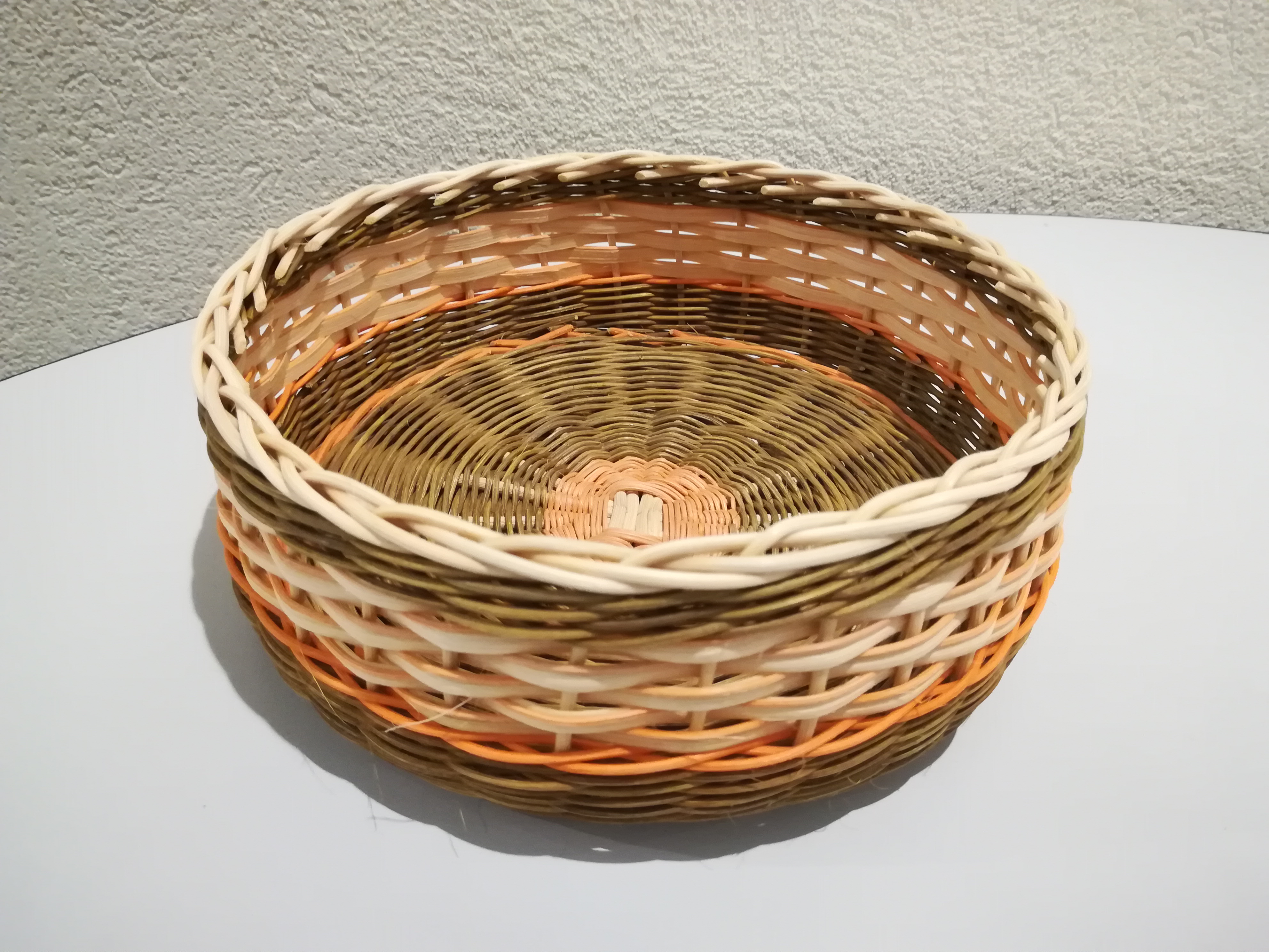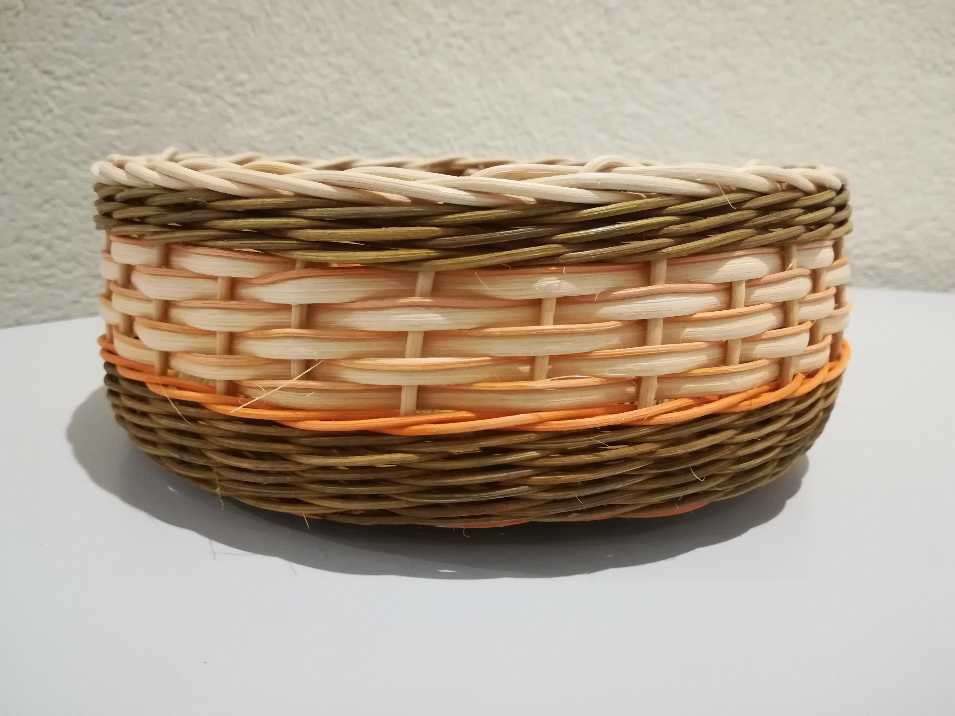 Pour sa deuxième réalisation, Marie-Chantal a fabriqué cette petite corbeille tout en rotin. Sur un fond en croisée percée, elle a tressé en super et en torche avec de la moelle de rotin puis avec de l’éclisse. Joli résultat 🙂