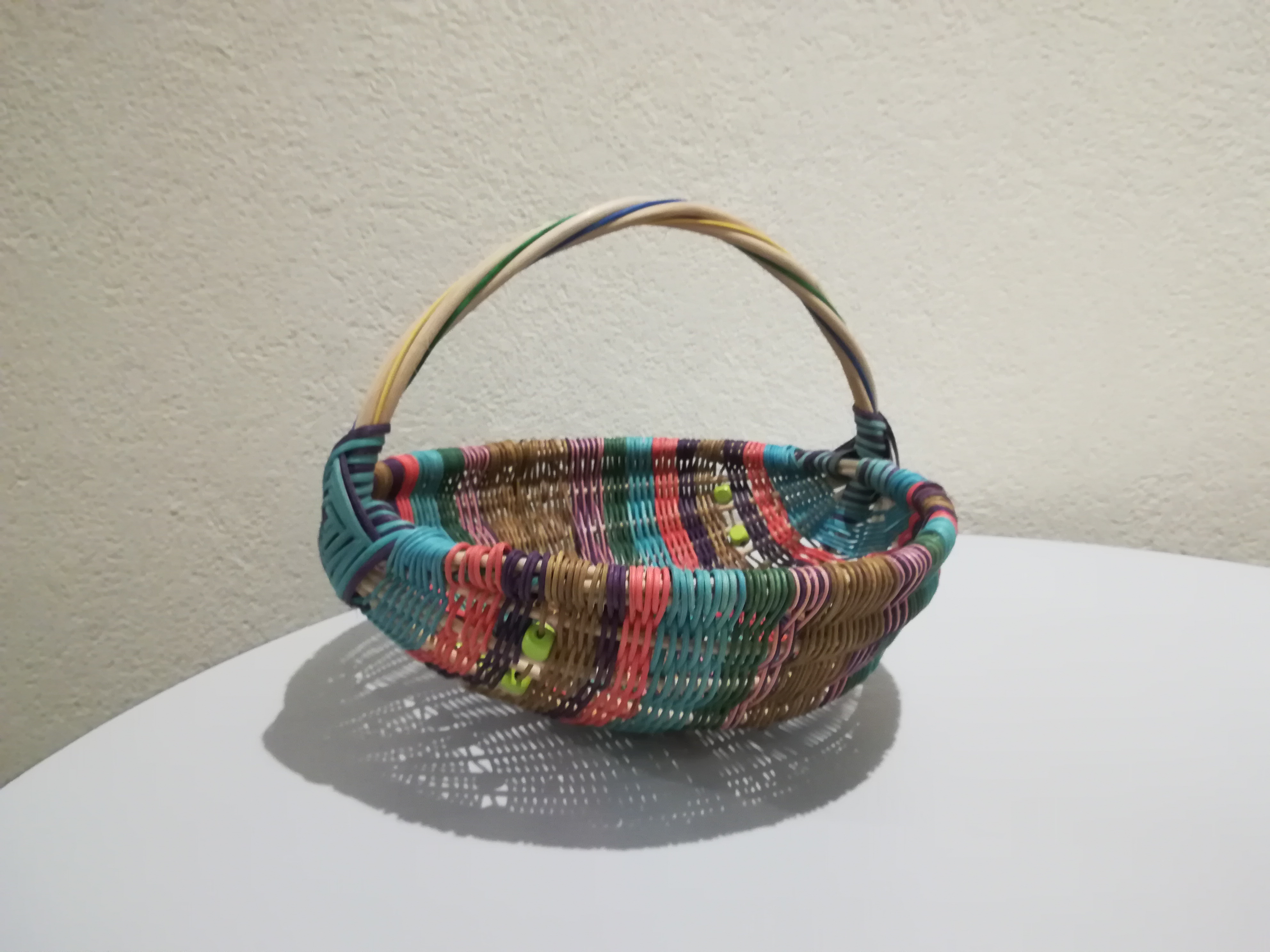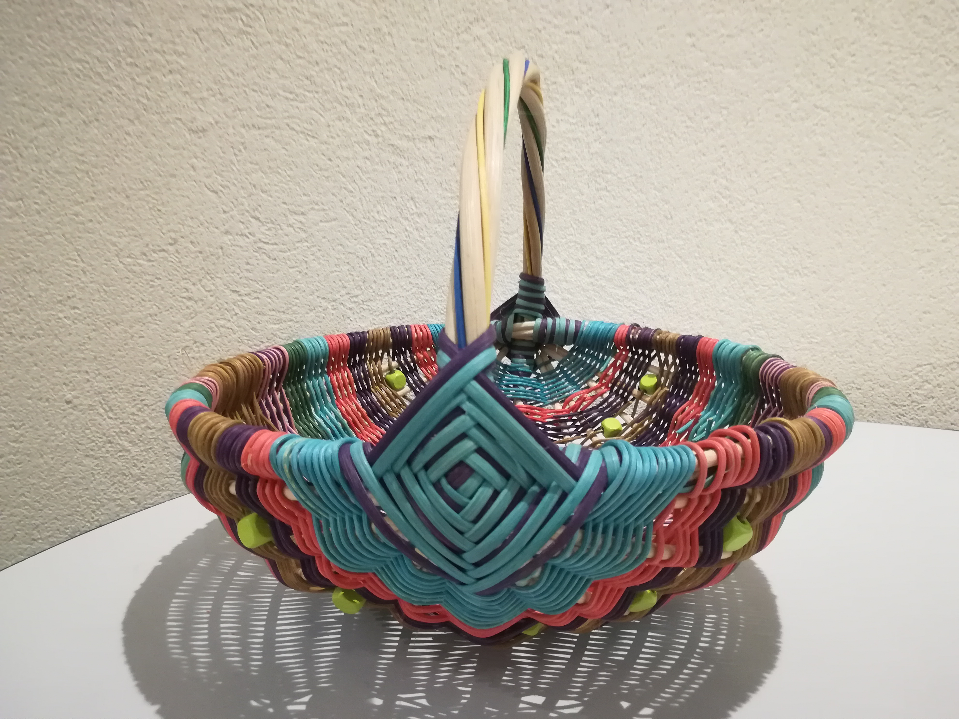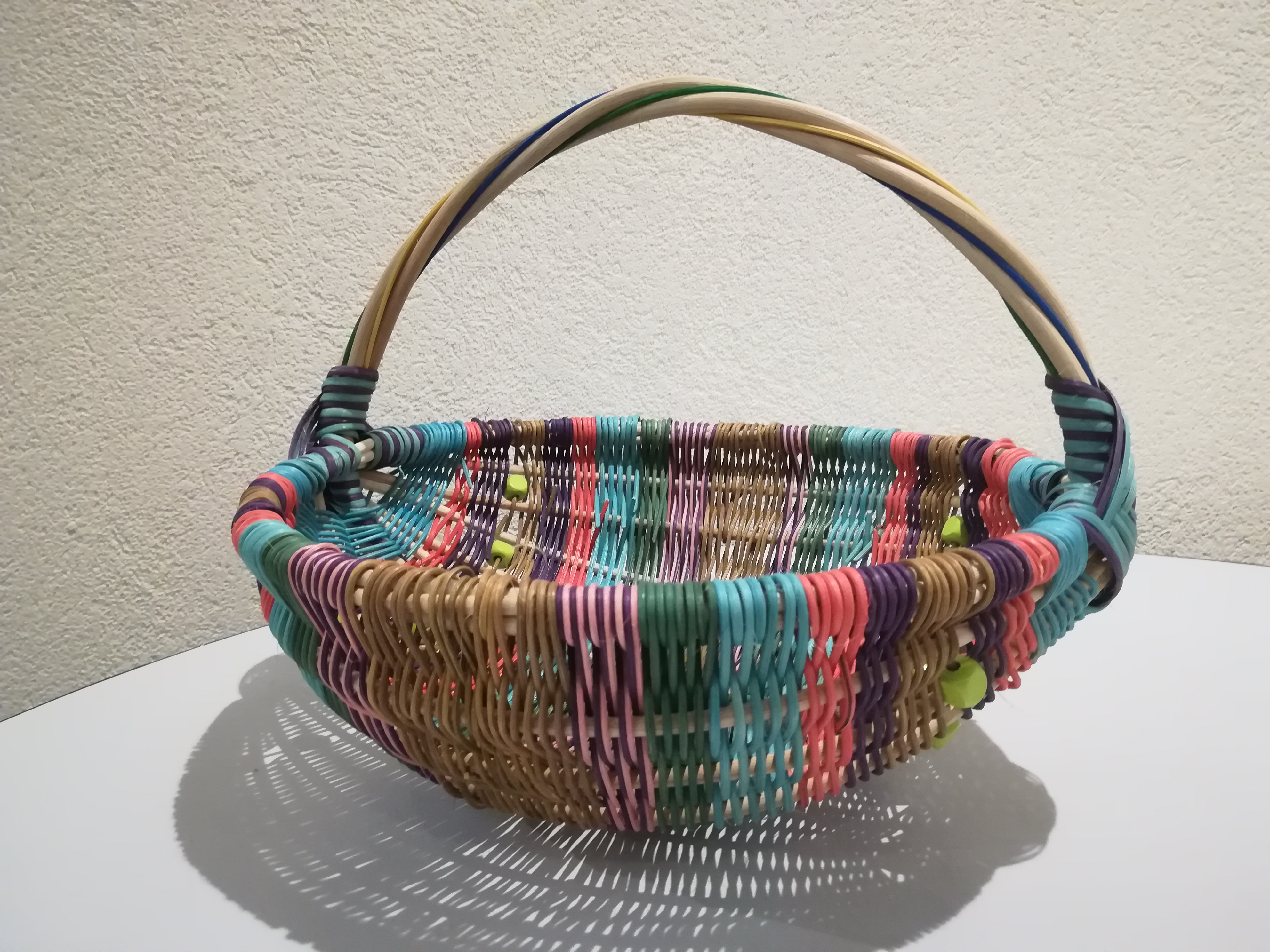 Pour sa dernière réalisation, Nelly a tressé ce panier sur arceaux tout en couleur avec de la moelle de rotin et quelques perles ajoutées sur les côtés pour la déco !