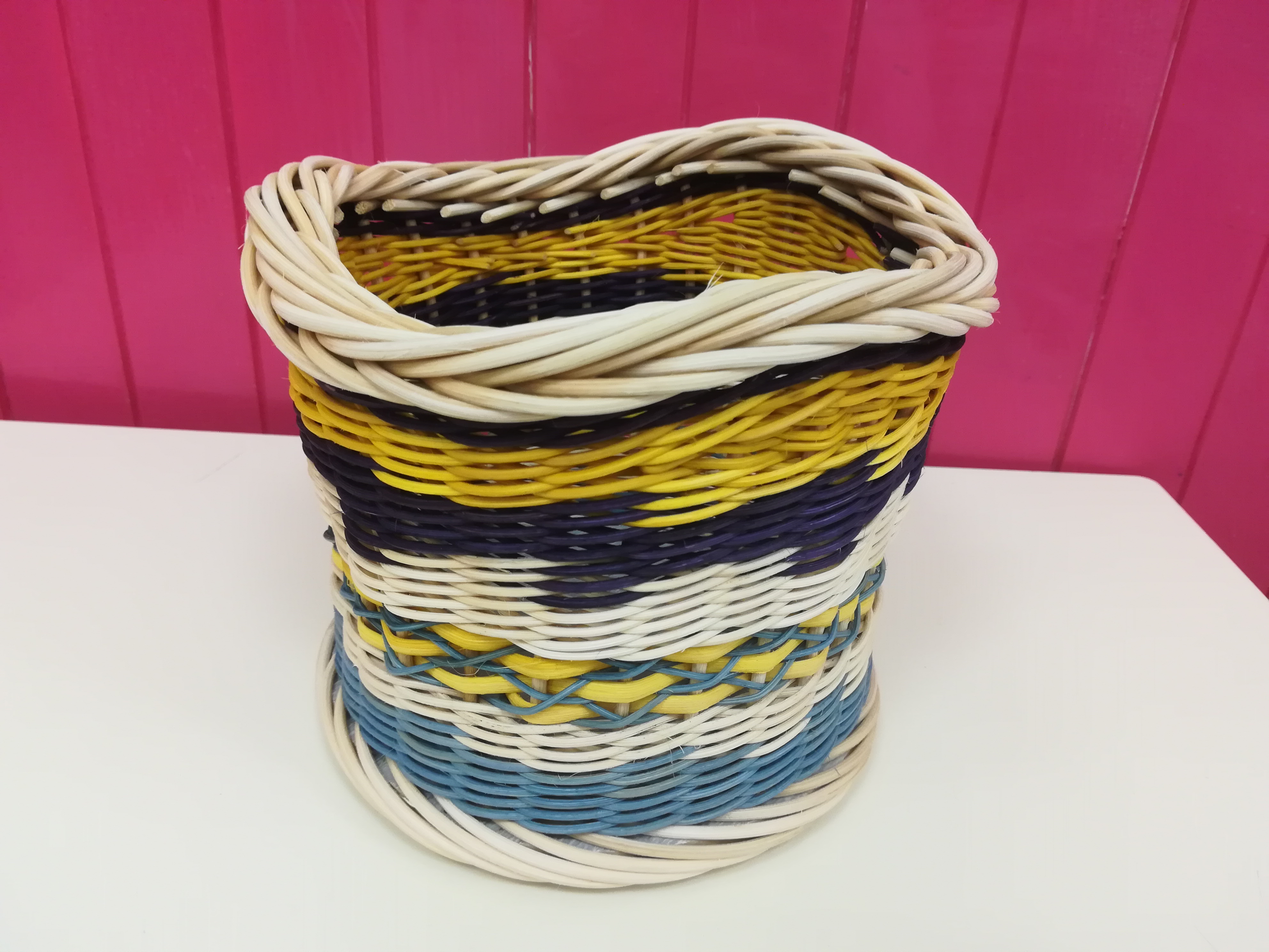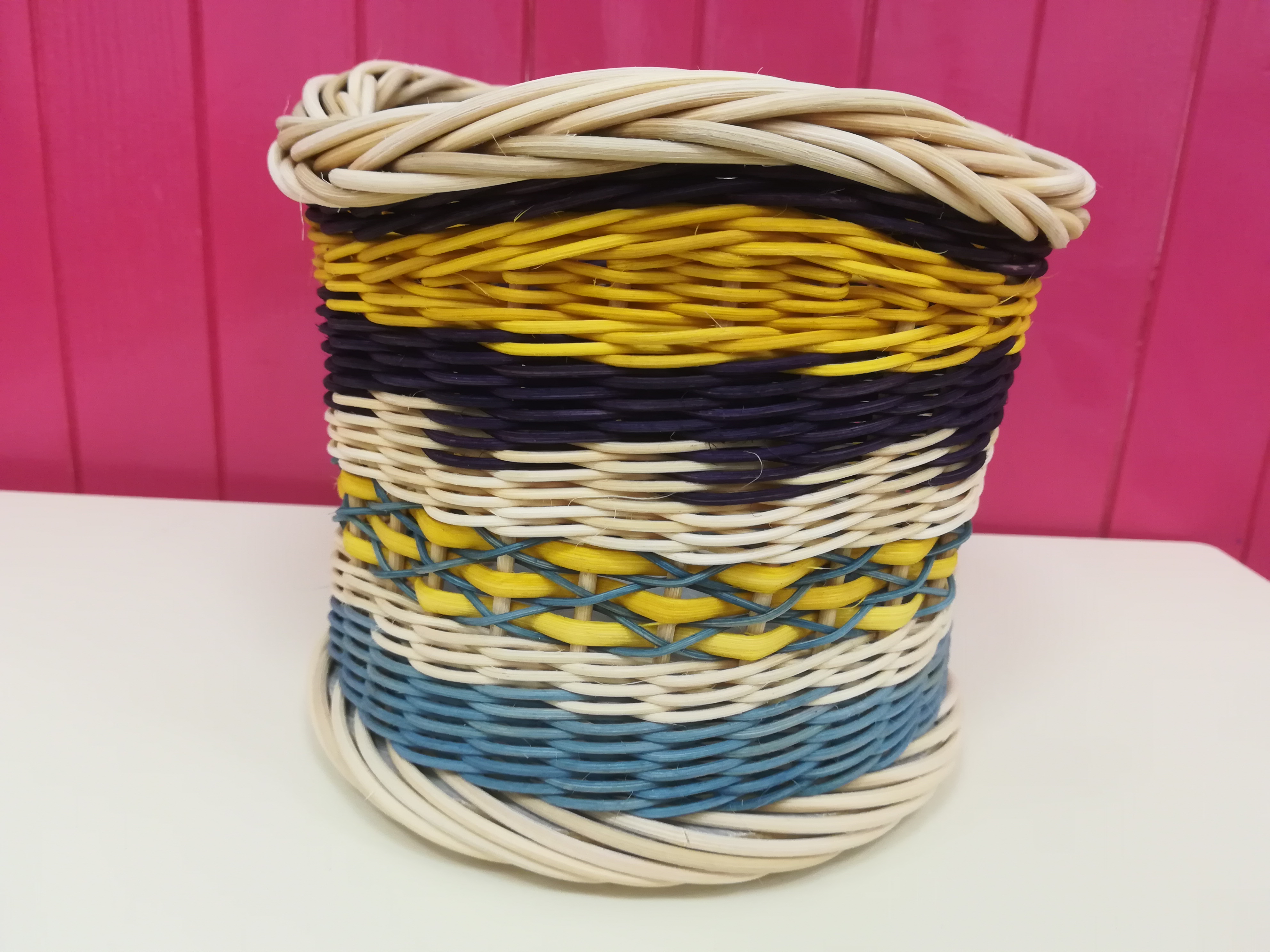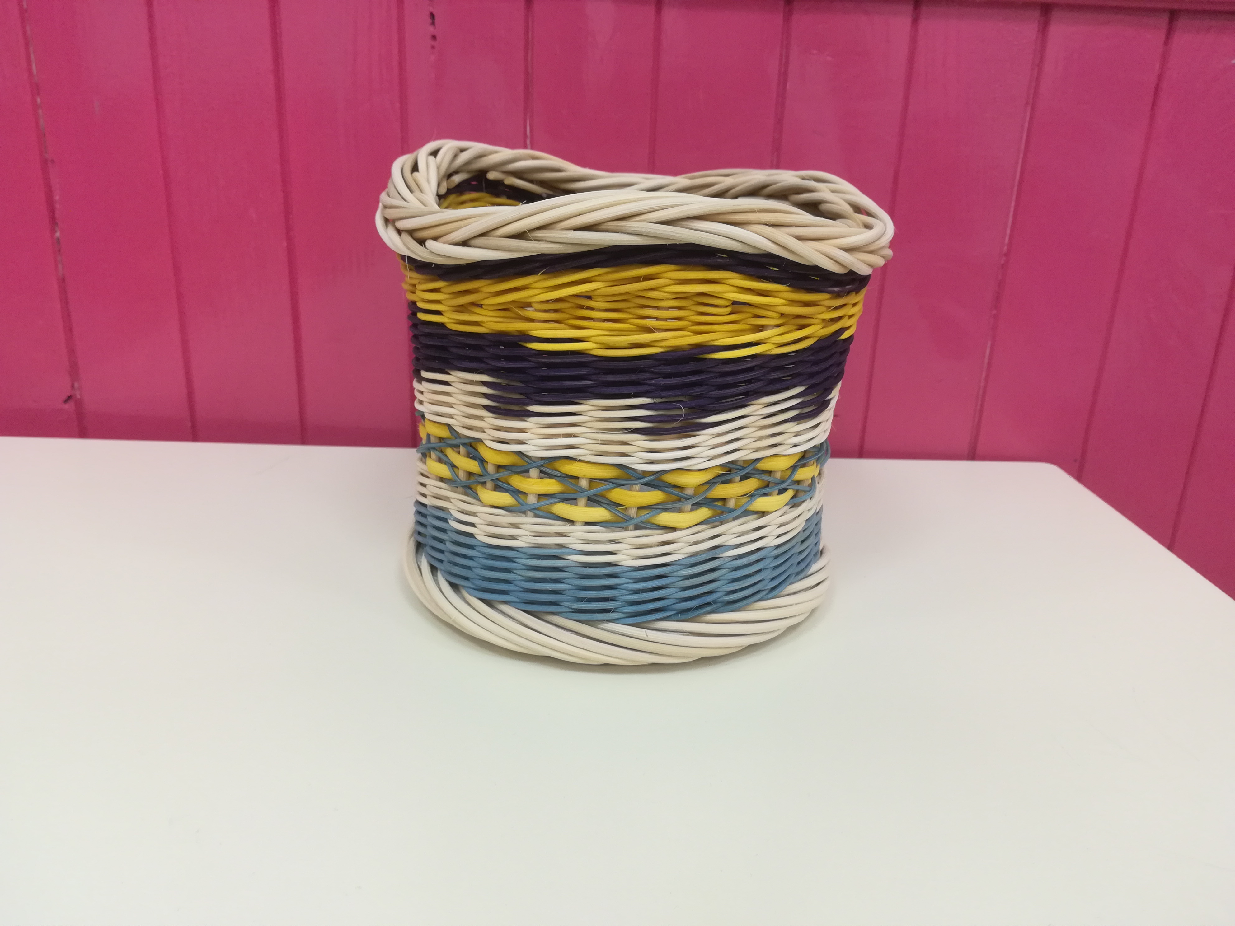 Fanny a choisi un fond en stratifié pour son grand pot à crayons. Elle a varié tressages, matériaux et coloris : super, torche, point diamant avec de la moelle et de l’éclisse de rotin. Et pour la finition, elle a tressé une bordure ordinaire.