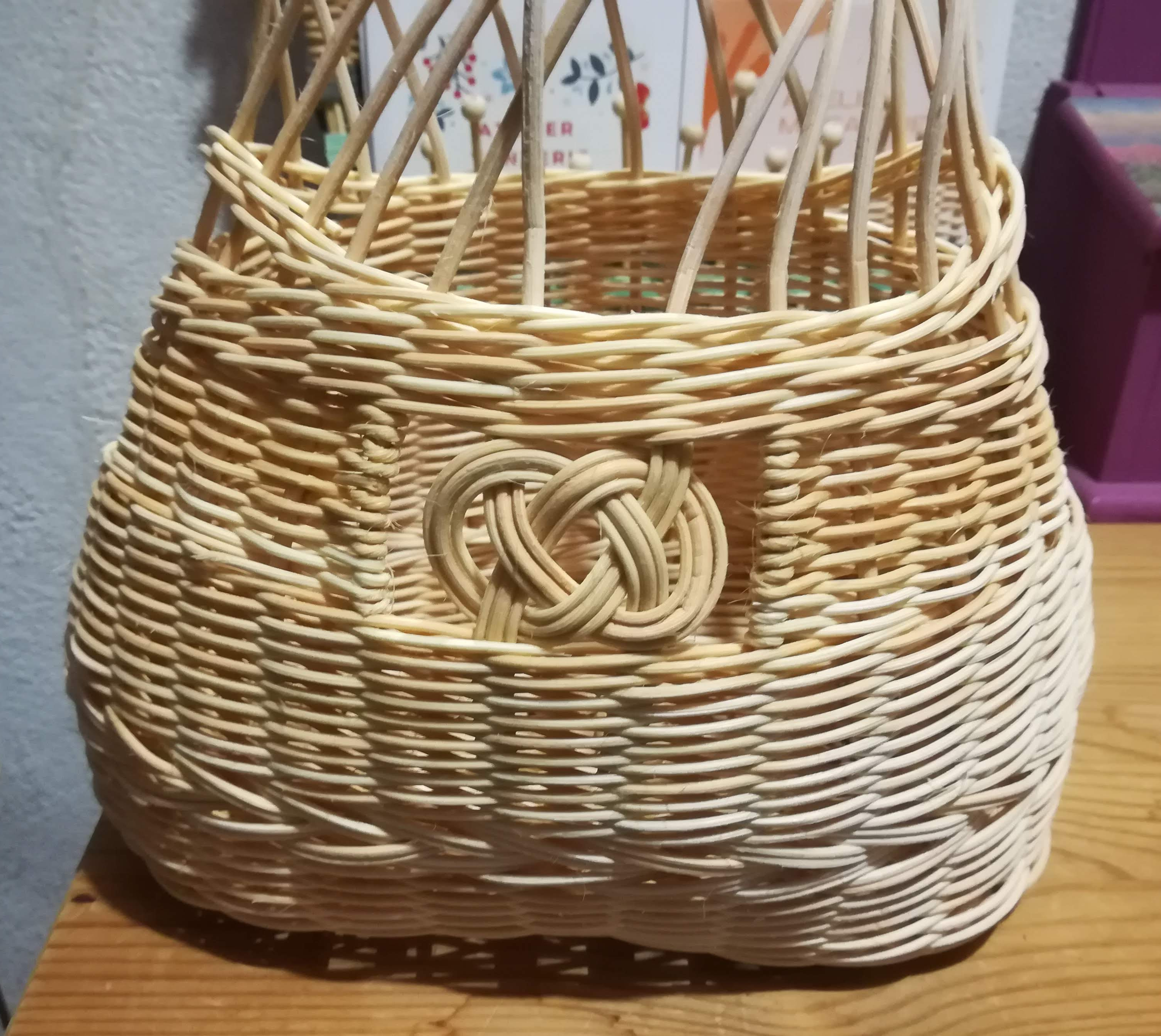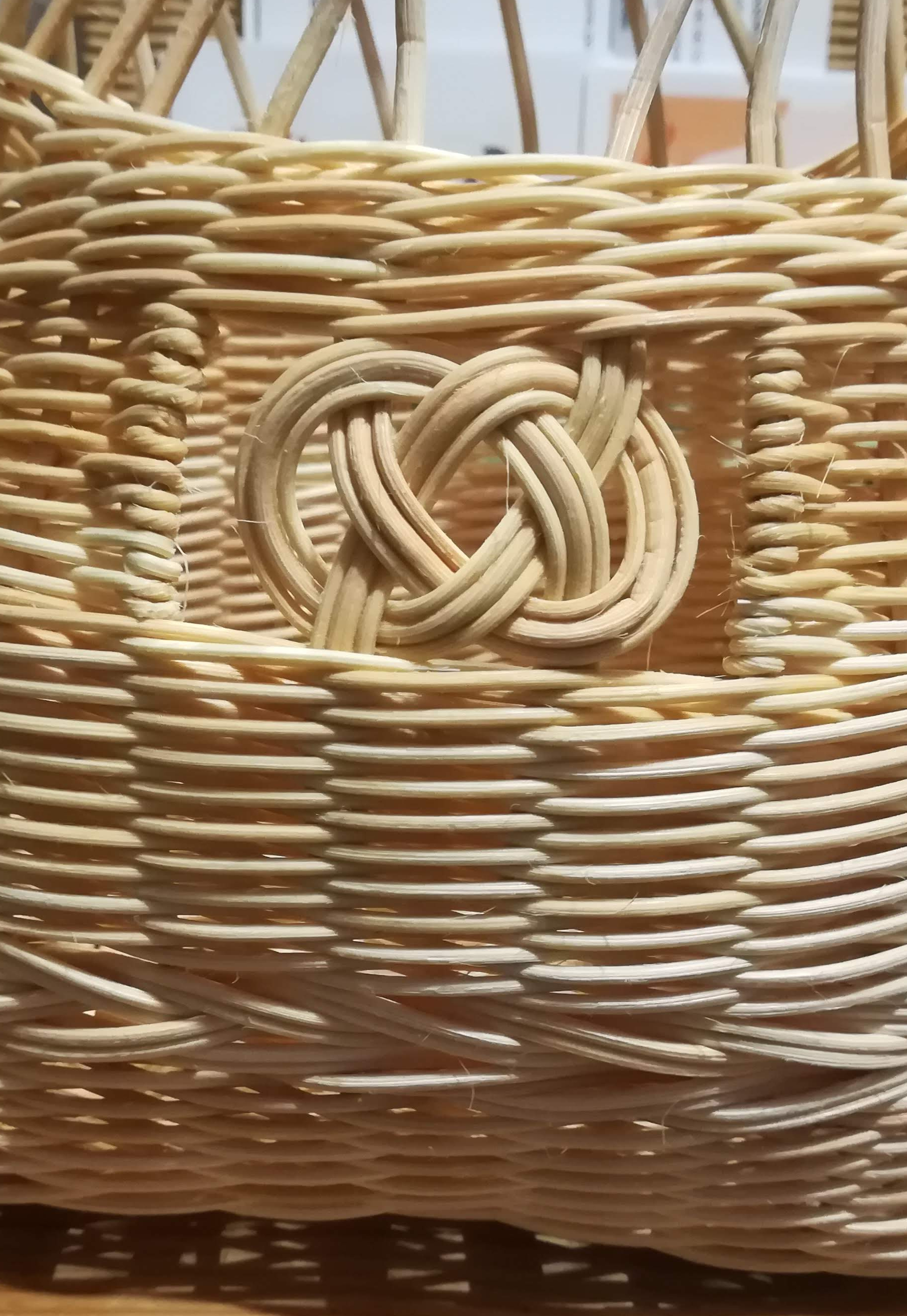 Tout en moelle de rotin, sur un fond en croisée ovale, le tressage est varié : torche, fleur de lys, brins suivis et un petit nœud en milieu de tressage pour la déco !