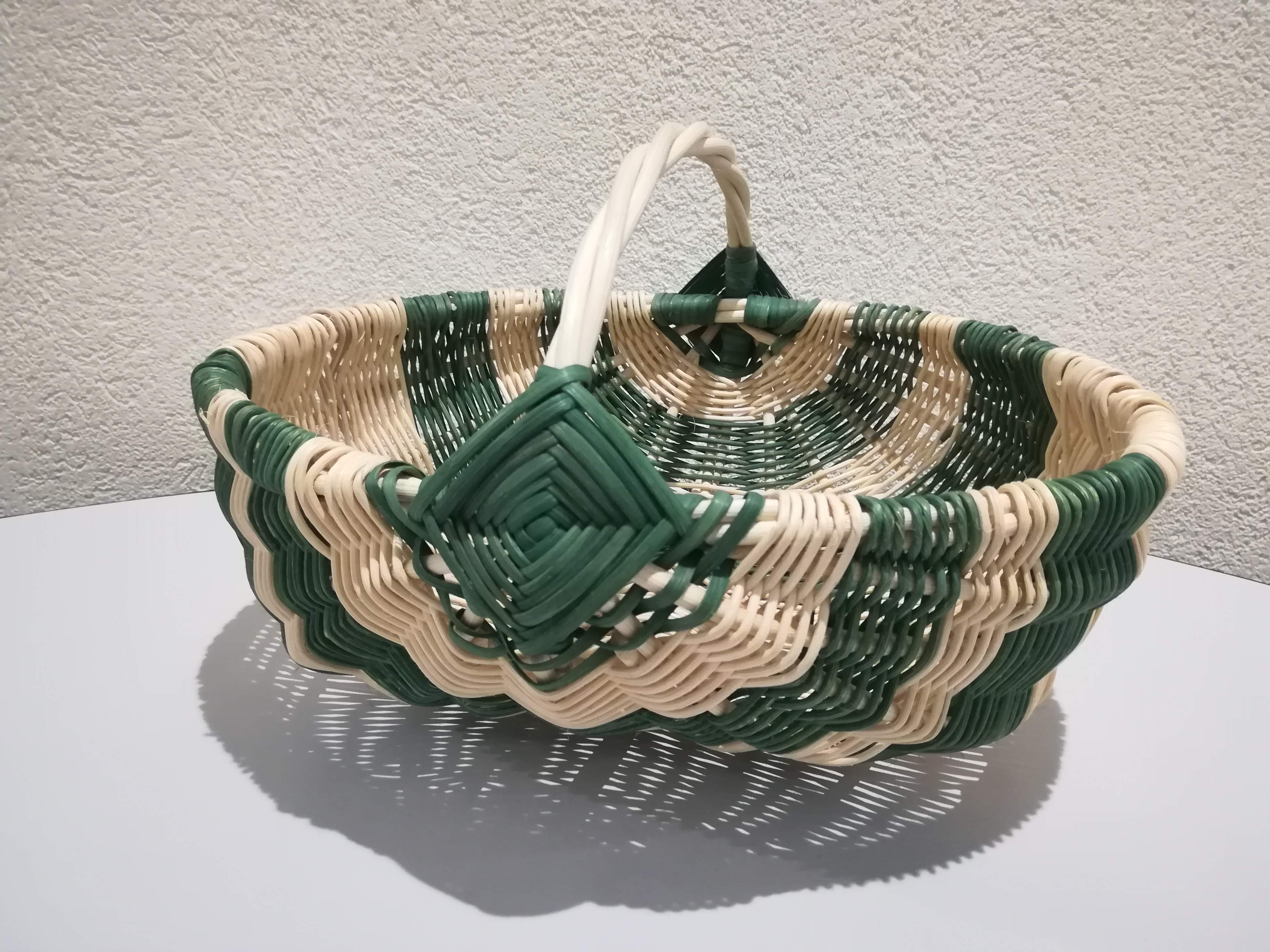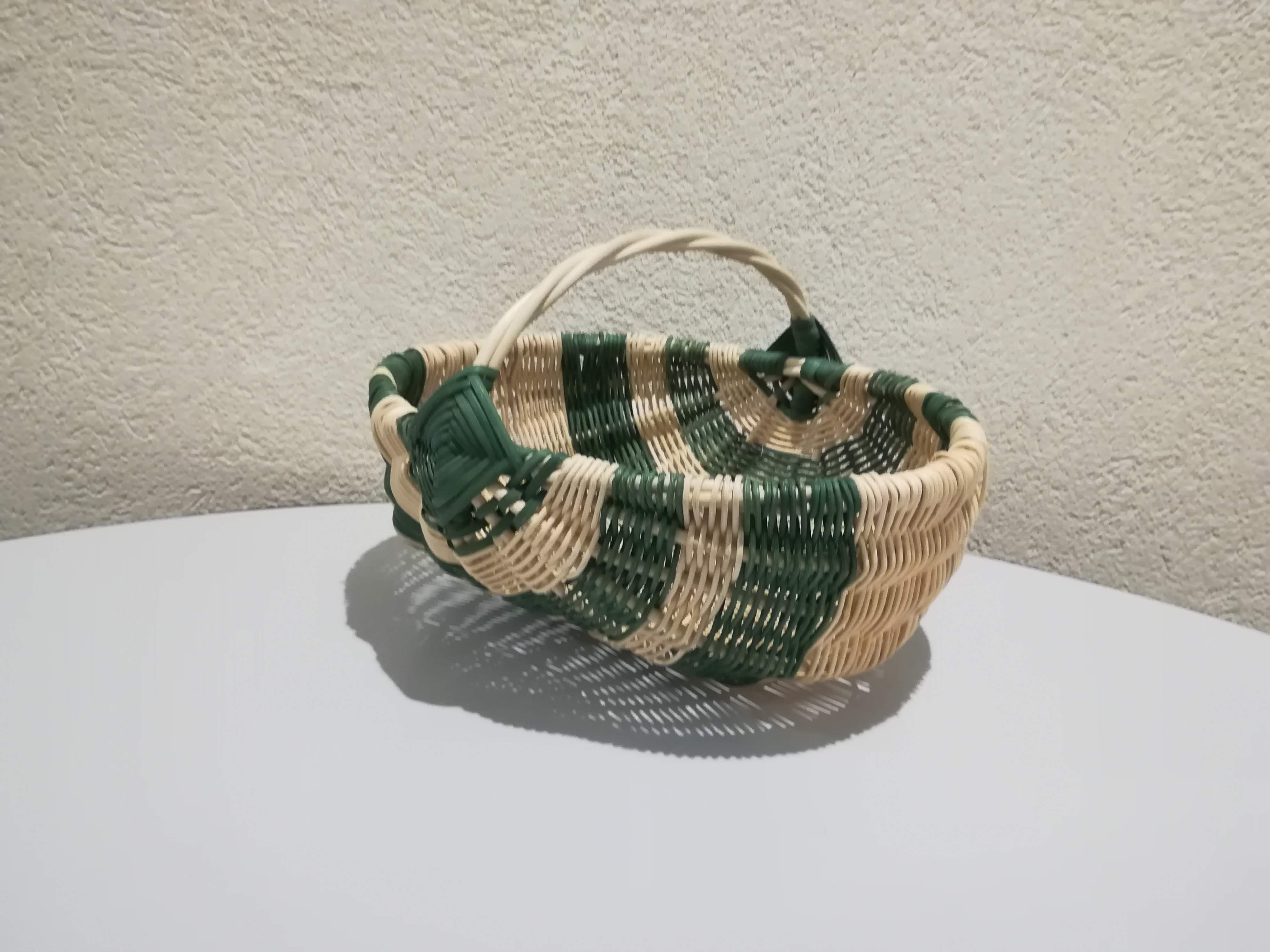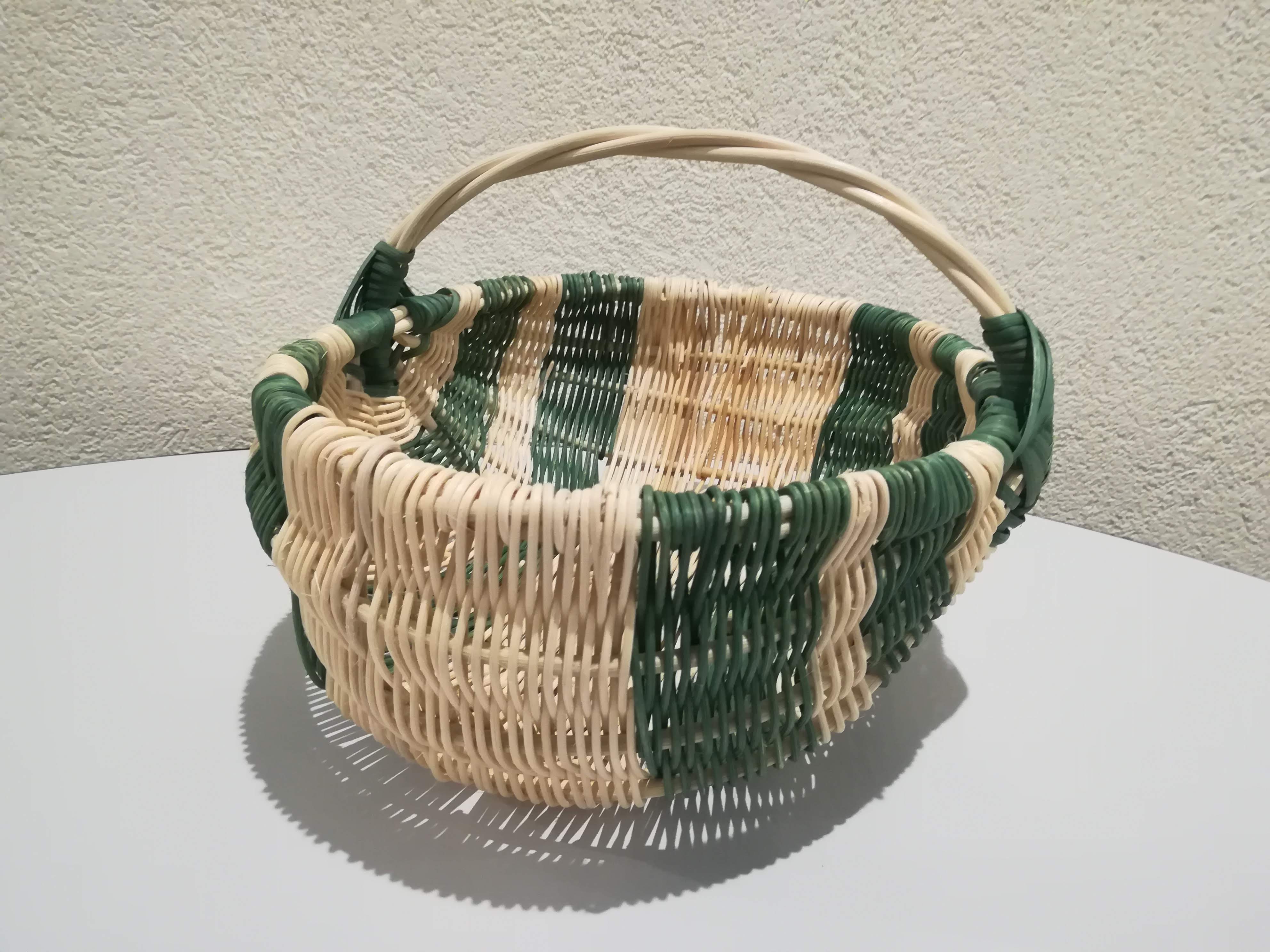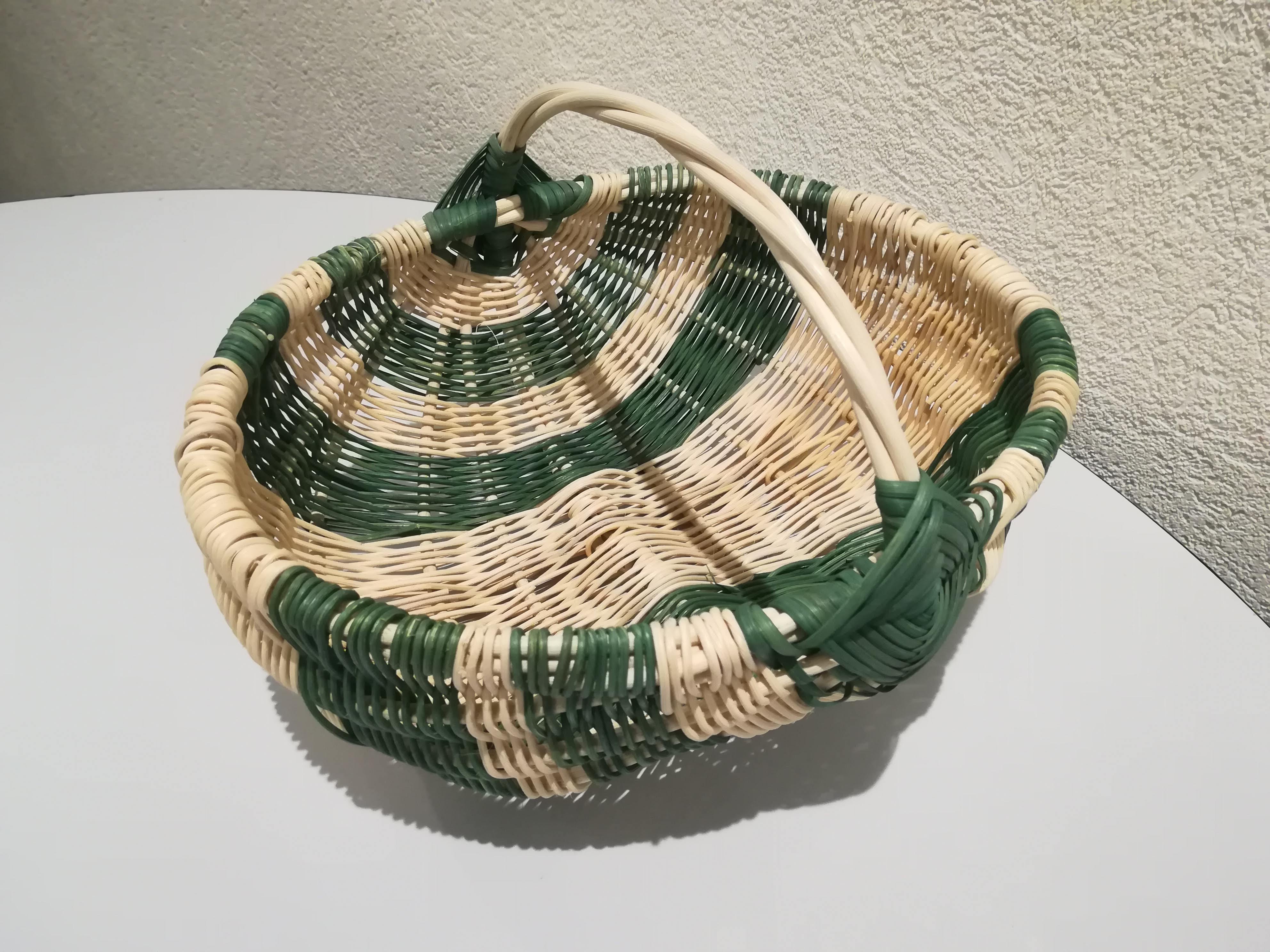 Nicole a terminé un nouveau panier sur arceaux, tressé intégralement en moelle de rotin verte et naturelle. Achevé mercredi et déjà offert, il a fait un heureux 🙂