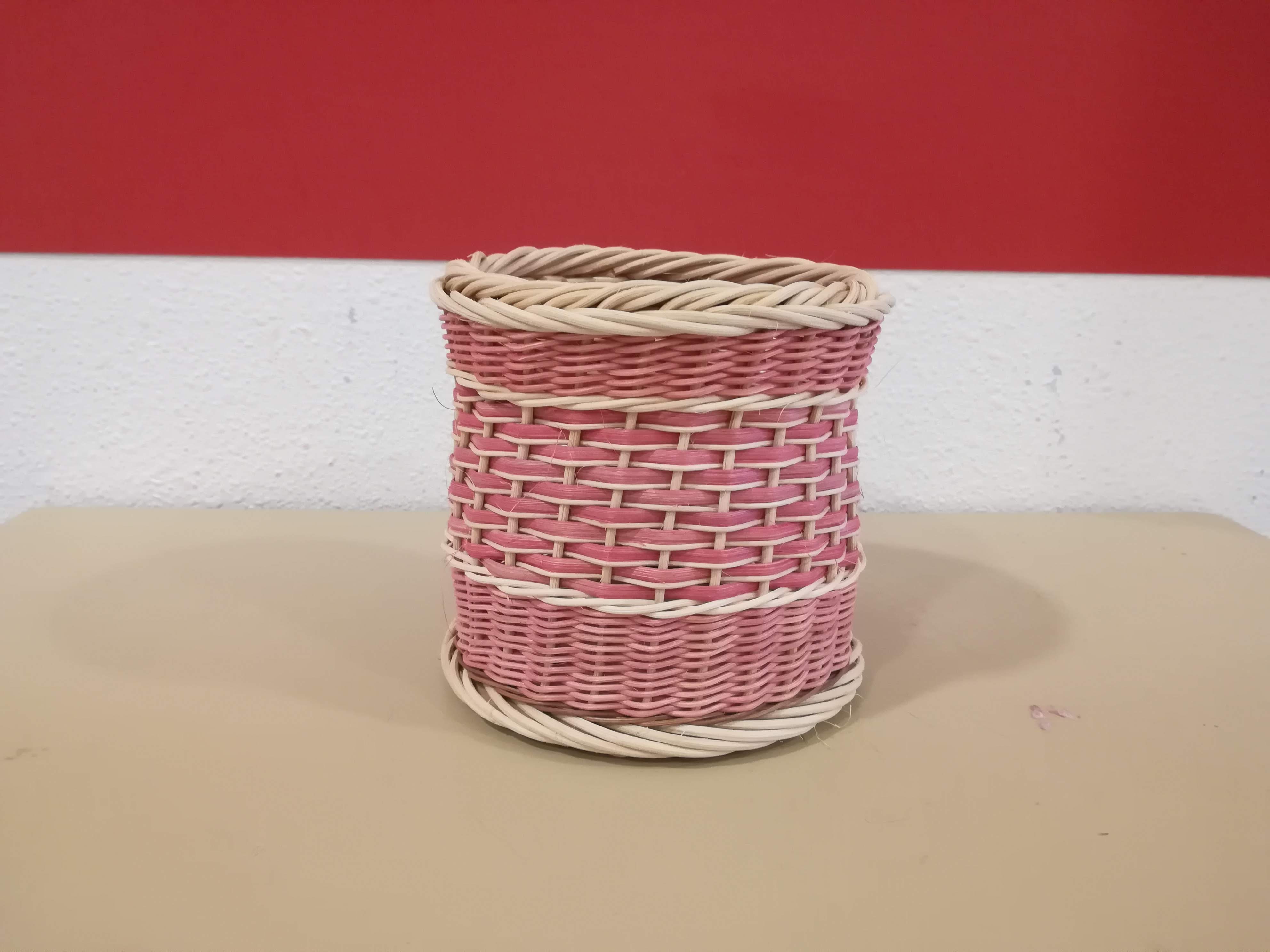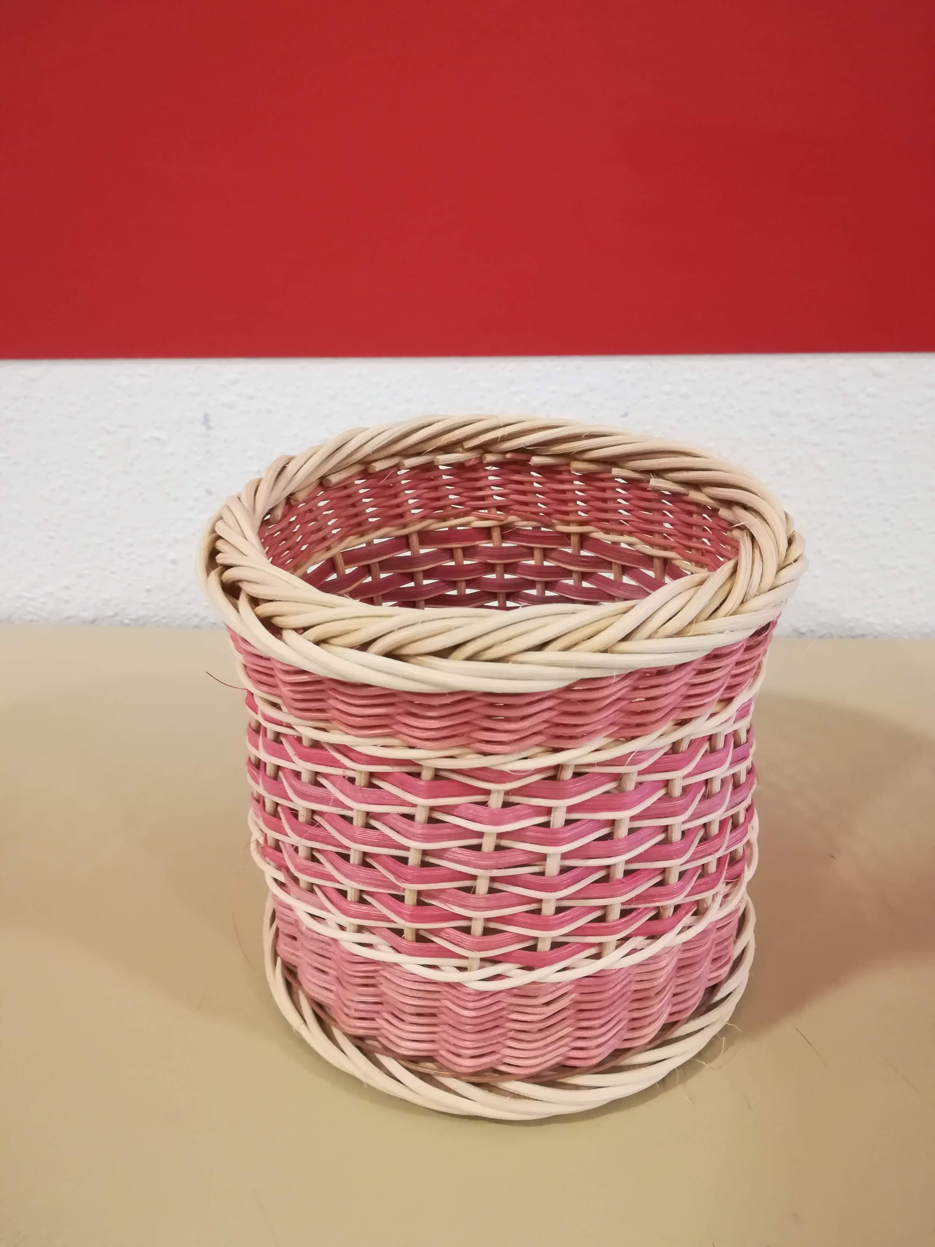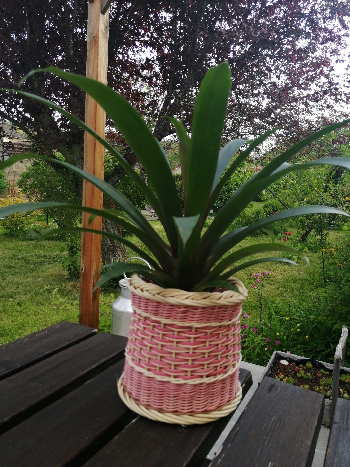 Pour sa première réalisation, Véronique a tressé ce cache-pot sur un support en bois avec de la moelle et de l’éclisse de rotin.