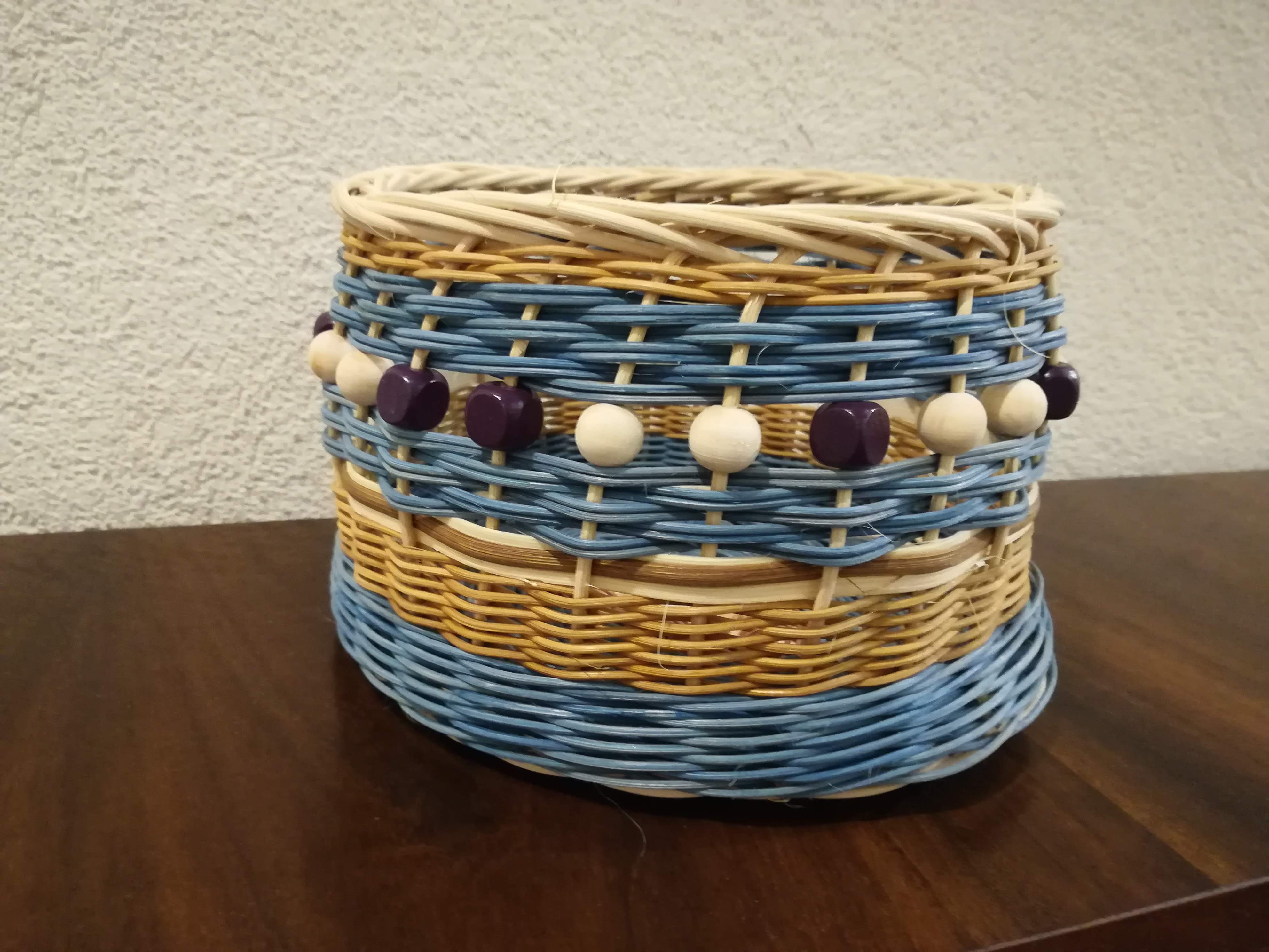 Nelly a réalisé cette petite corbeille en moelle de rotin. Elle a tressé en super, en torche et en planchette et a ajouté quelques perles en bois.