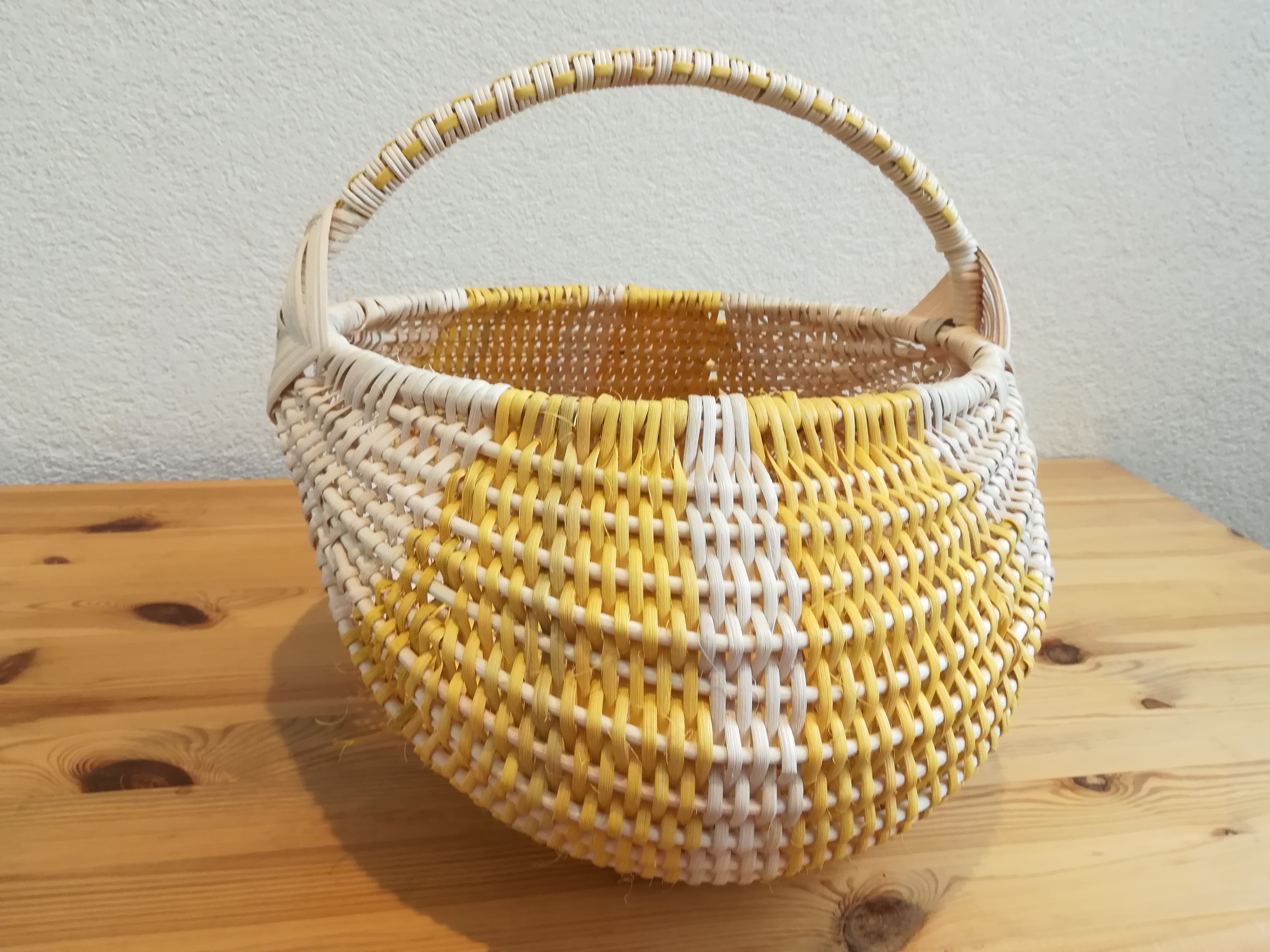 Francis a cédé à l’éclisse de rotin pour réaliser ce grand panier sur arceaux, lui qui n’utilise habituellement que la moelle de rotin 😉 Très beau rendu !