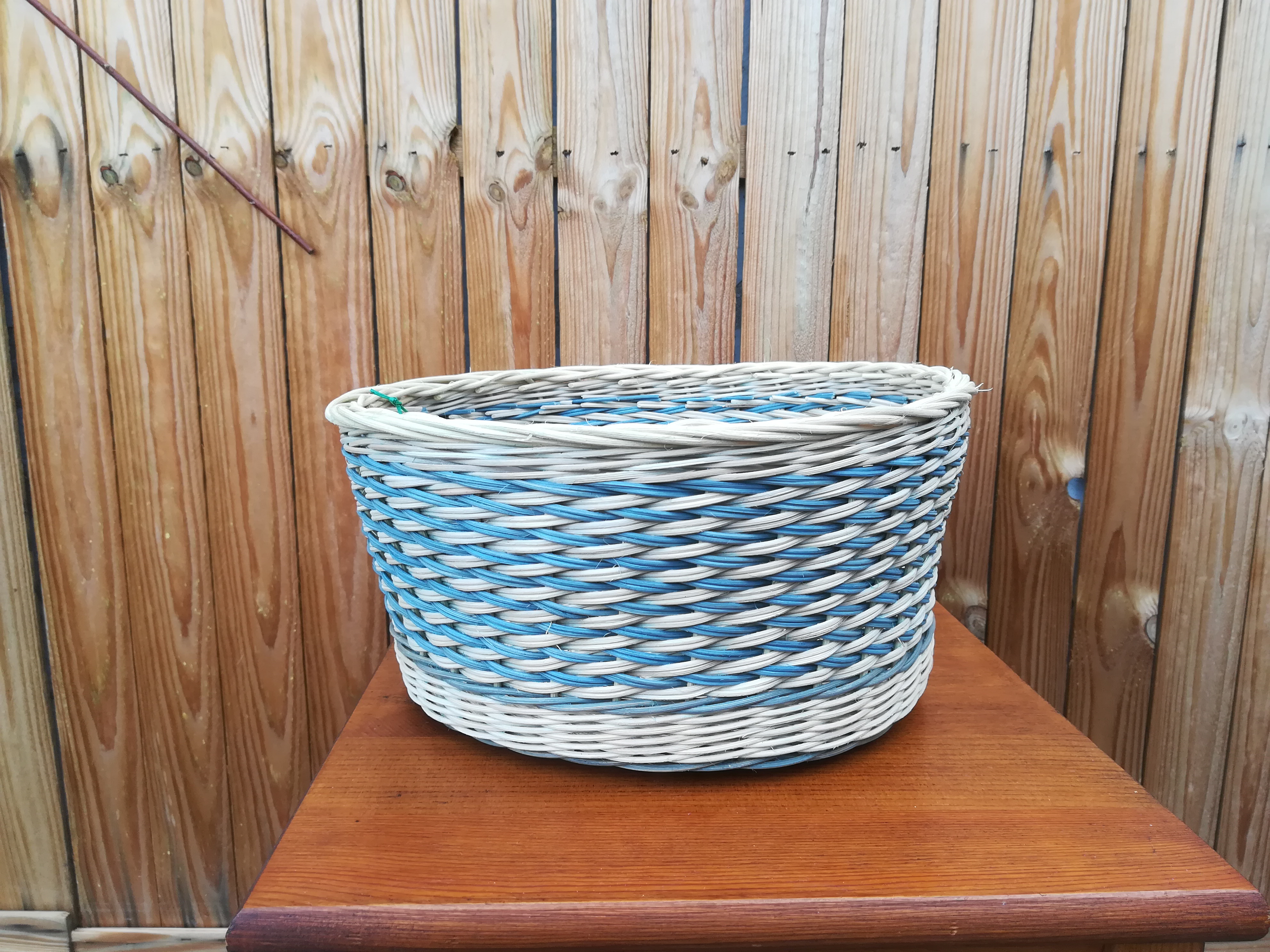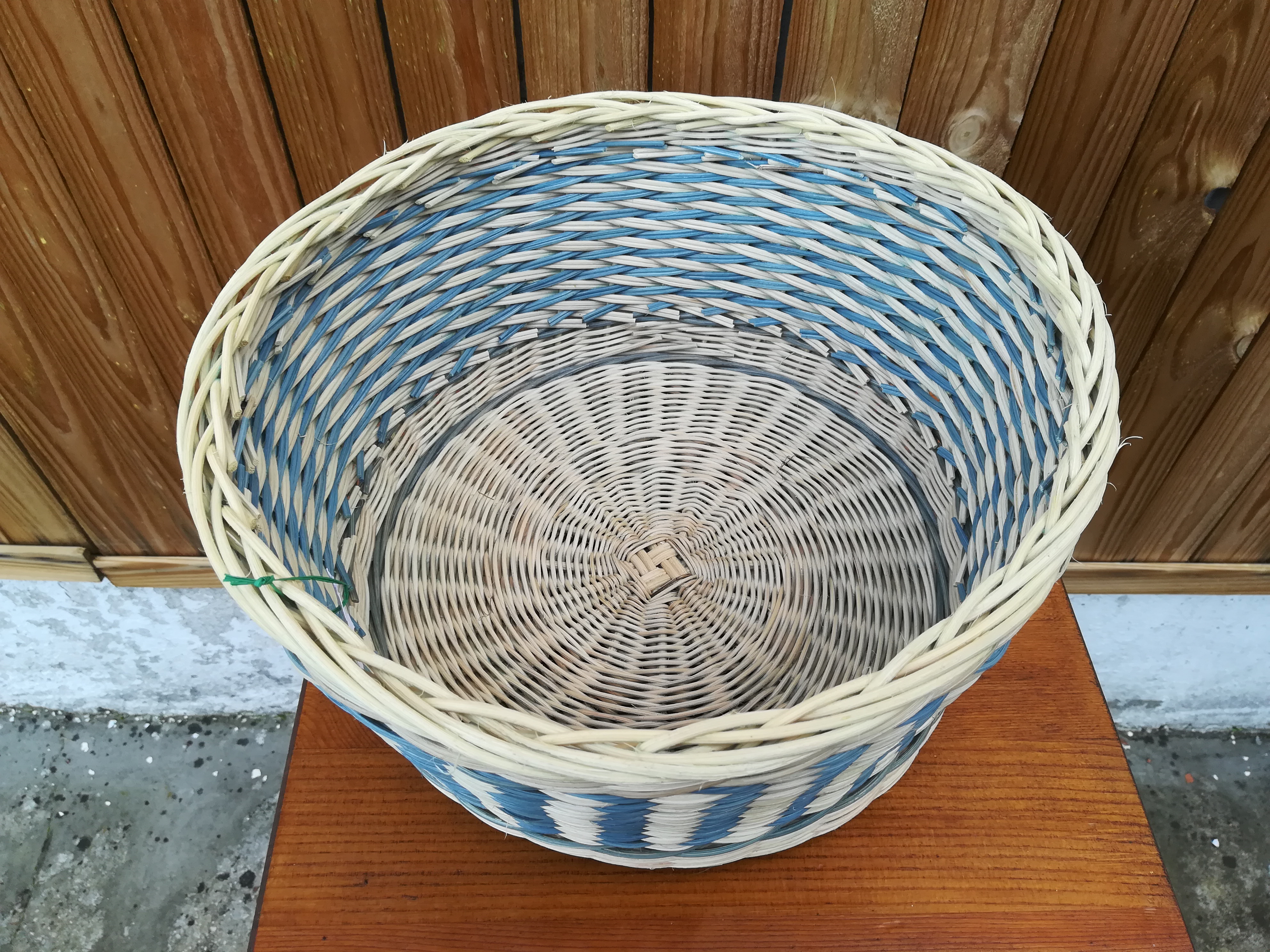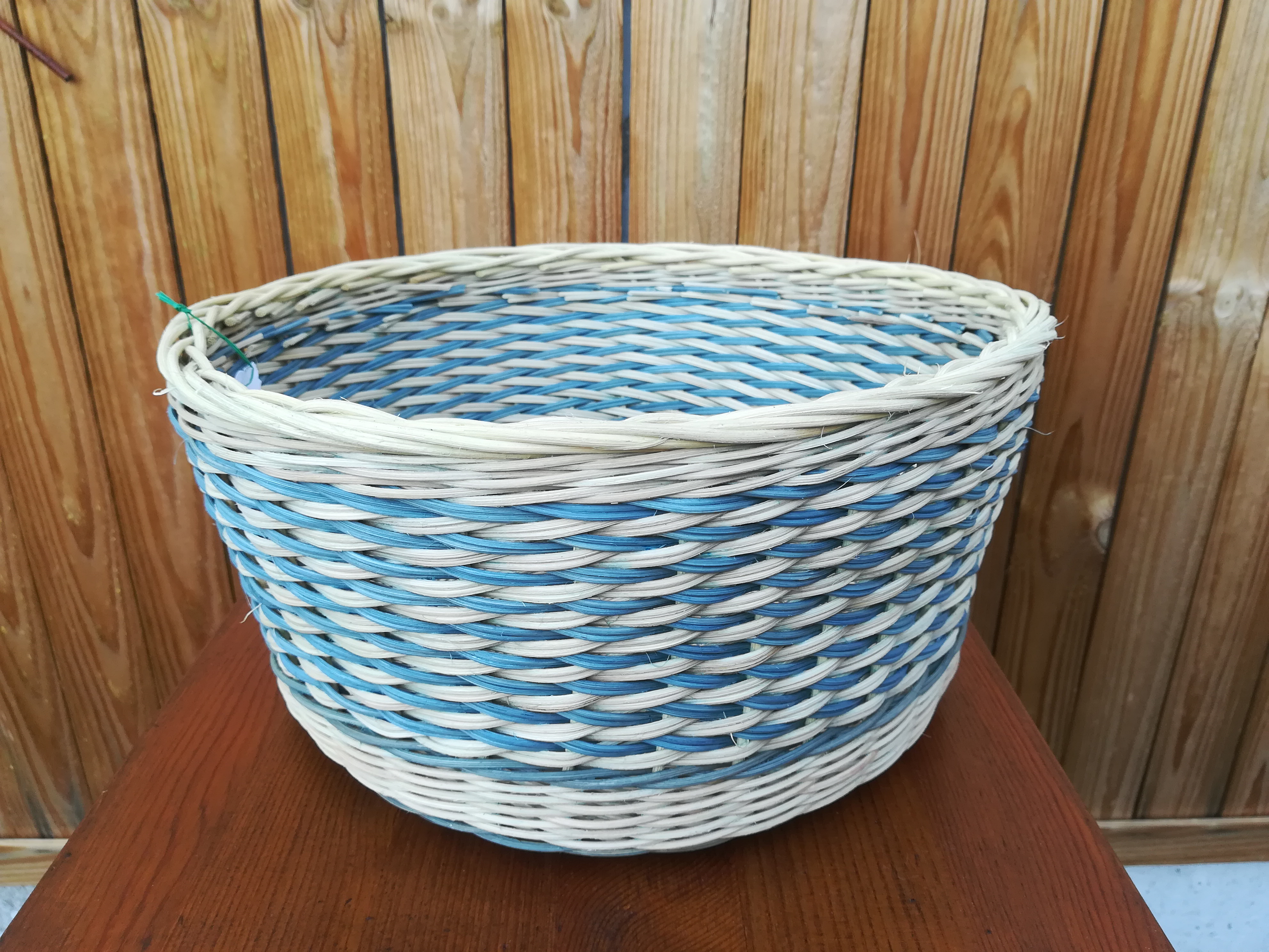 La grande corbeille Bariloche est tressée en crocane avec deux fils de moelle de rotin bleu croisant deux fils de moelle de rotin naturel. Ca fait beaucoup de fils à gérer d’un coup, mais le résultat est intéressant !