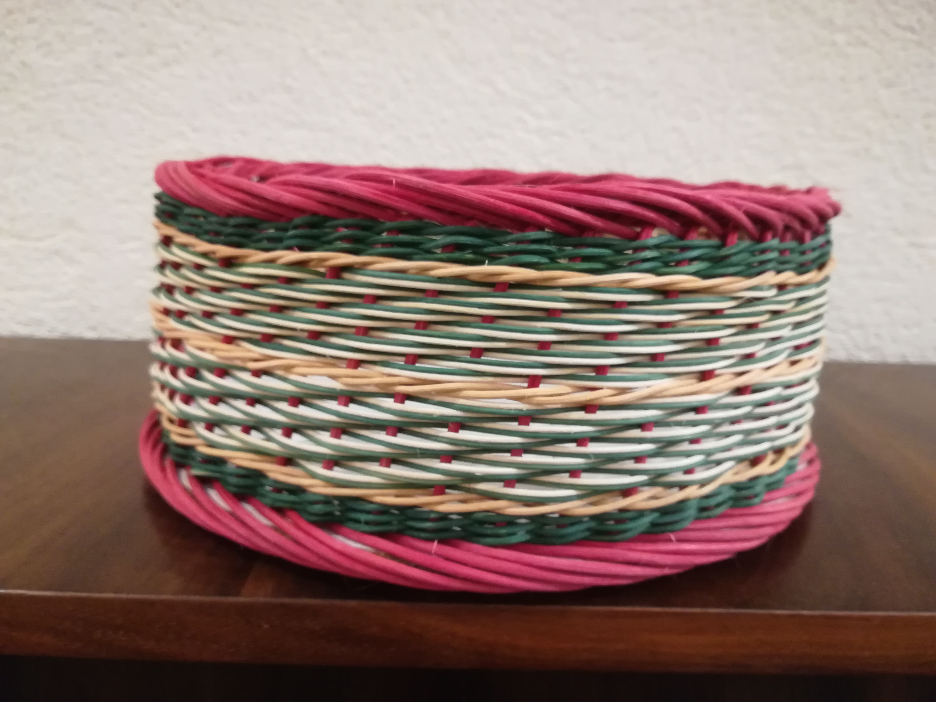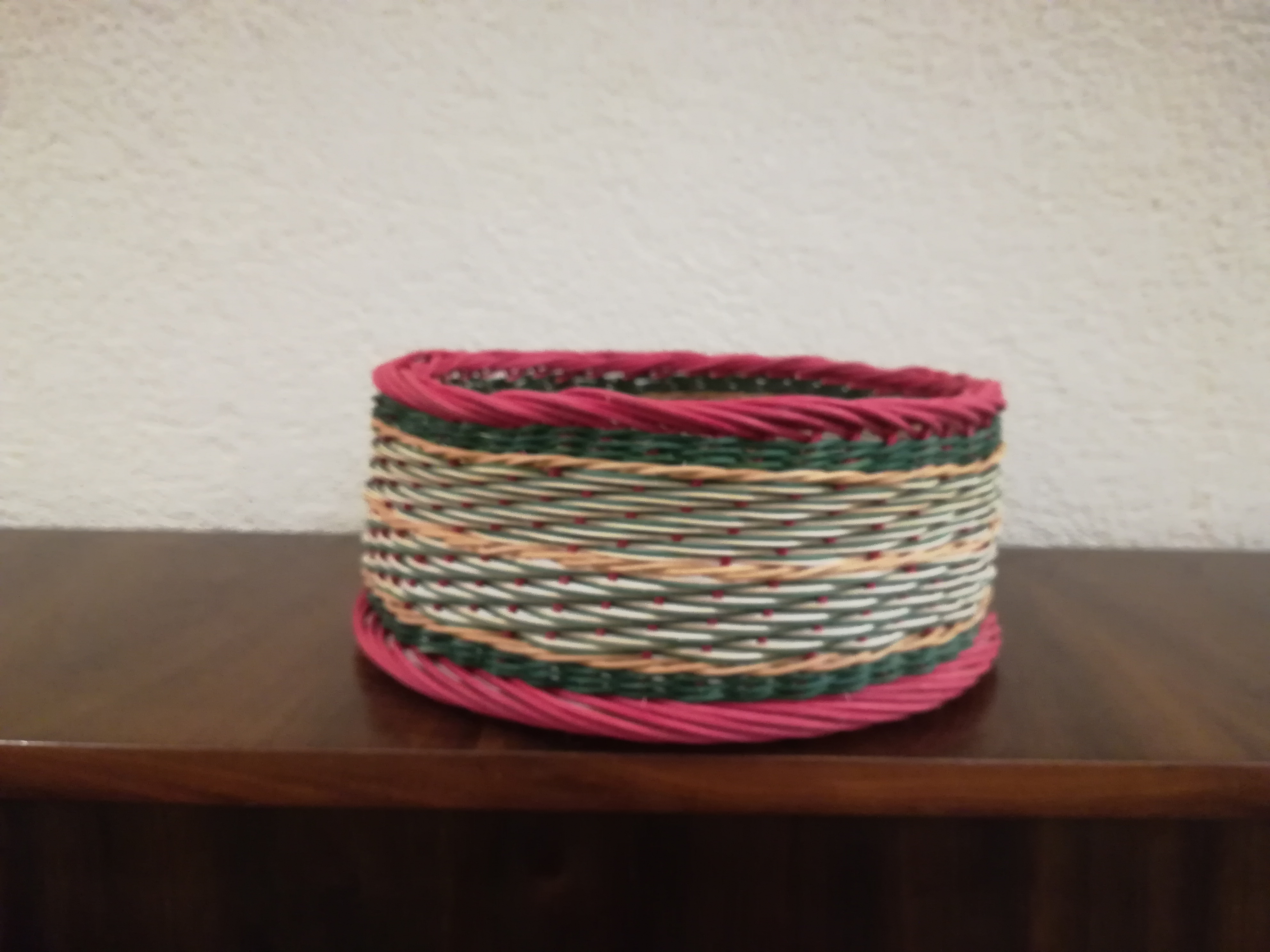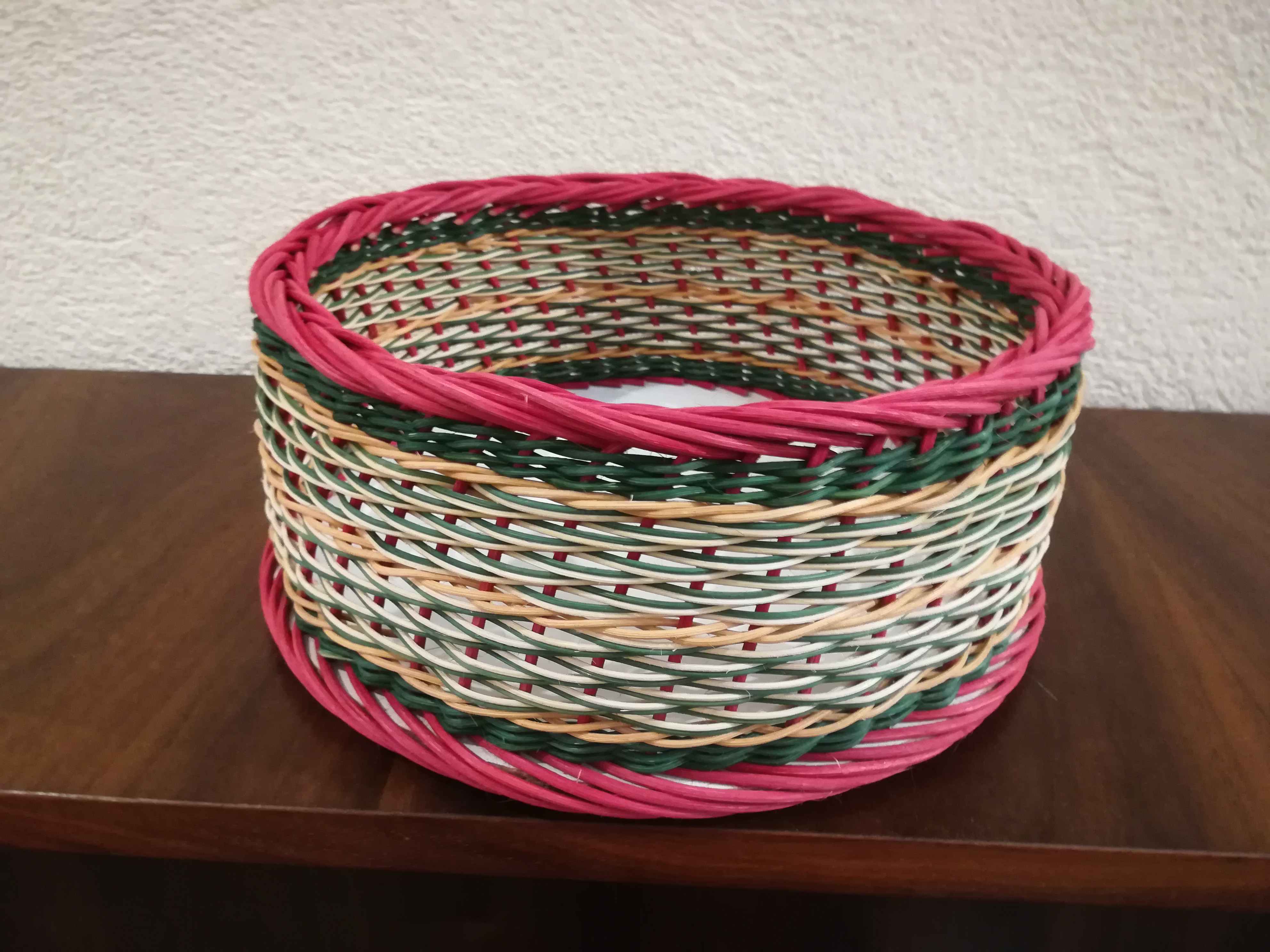 Nadia a terminé sa première corbeille. Sur un fond en bois, elle a tressé avec de la moelle de rotin en alternant les points de vannerie : super, torche et planchette décalée.