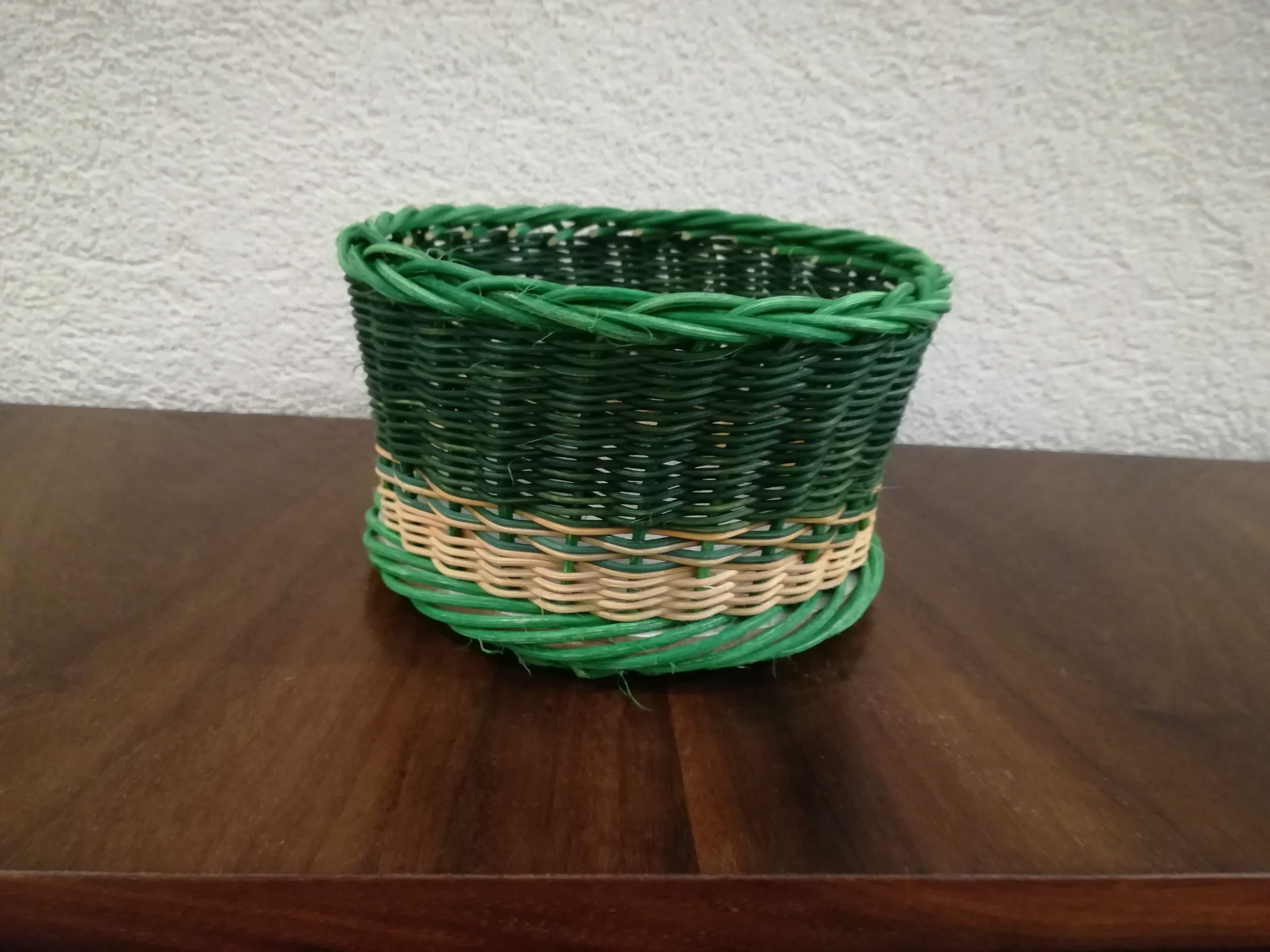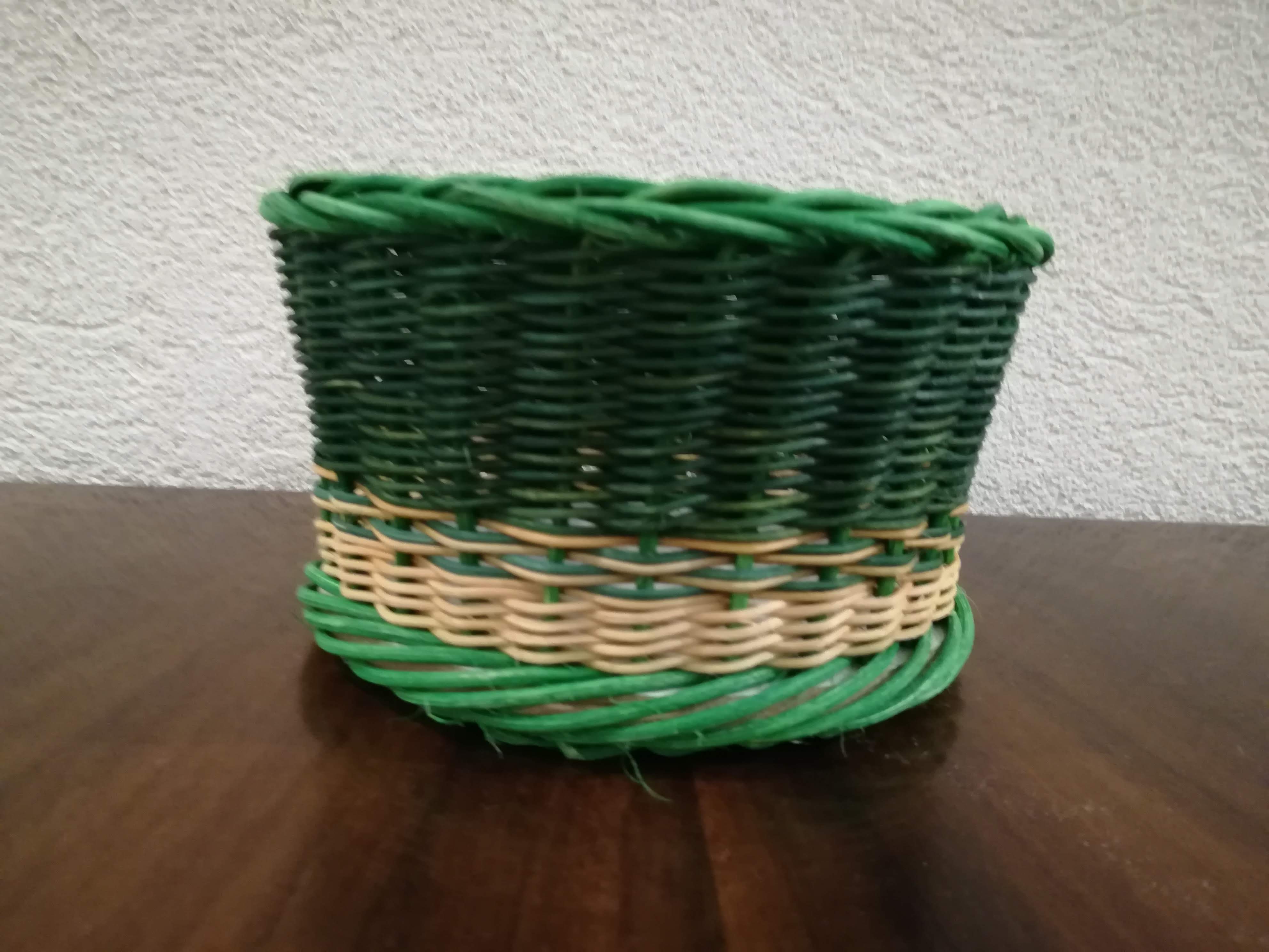 Sur un fond en bois, Nicole a réalisé sa toute première corbeille. Elle a tressé en super et en planchettes avec de la moelle de rotin.