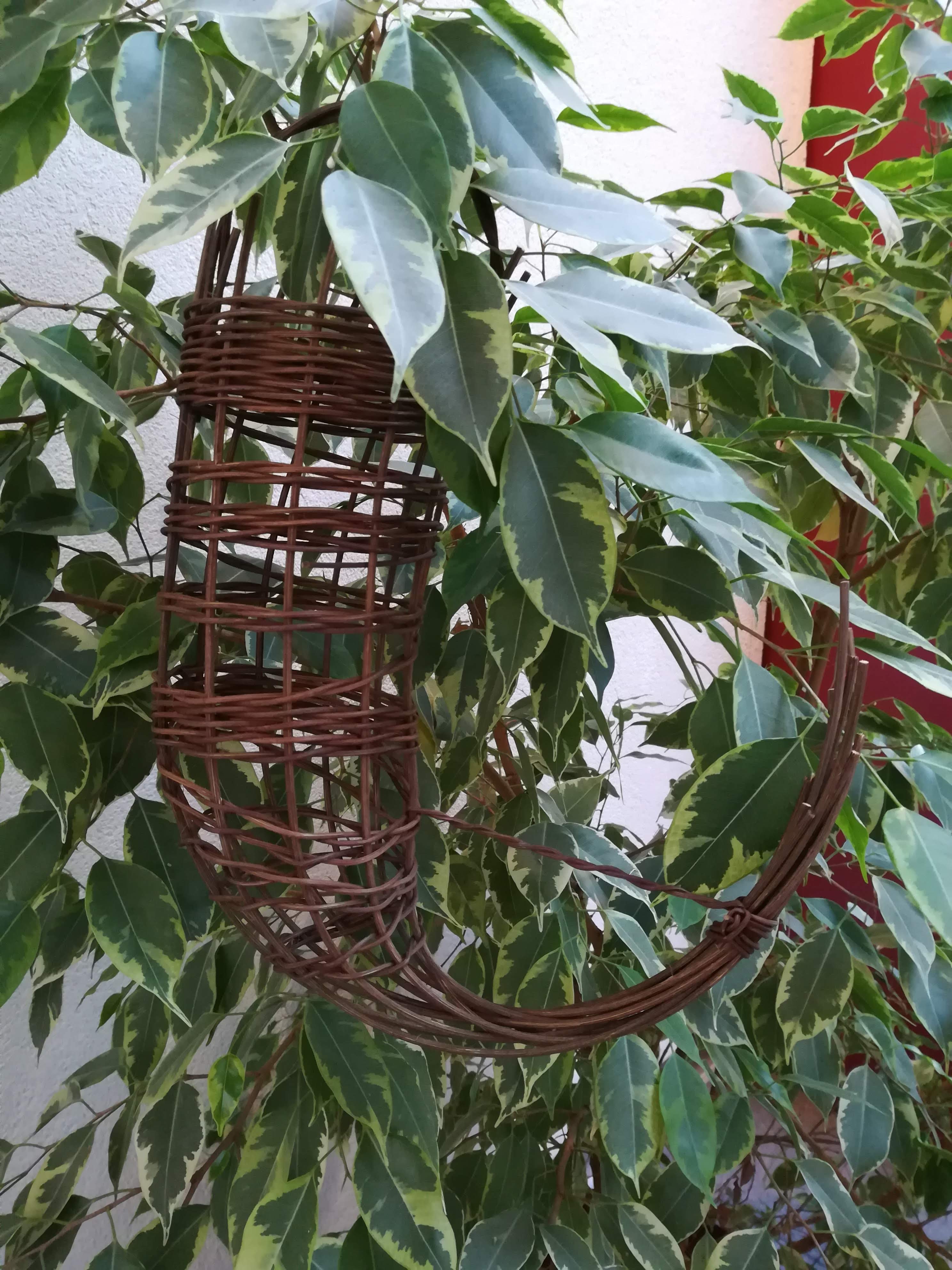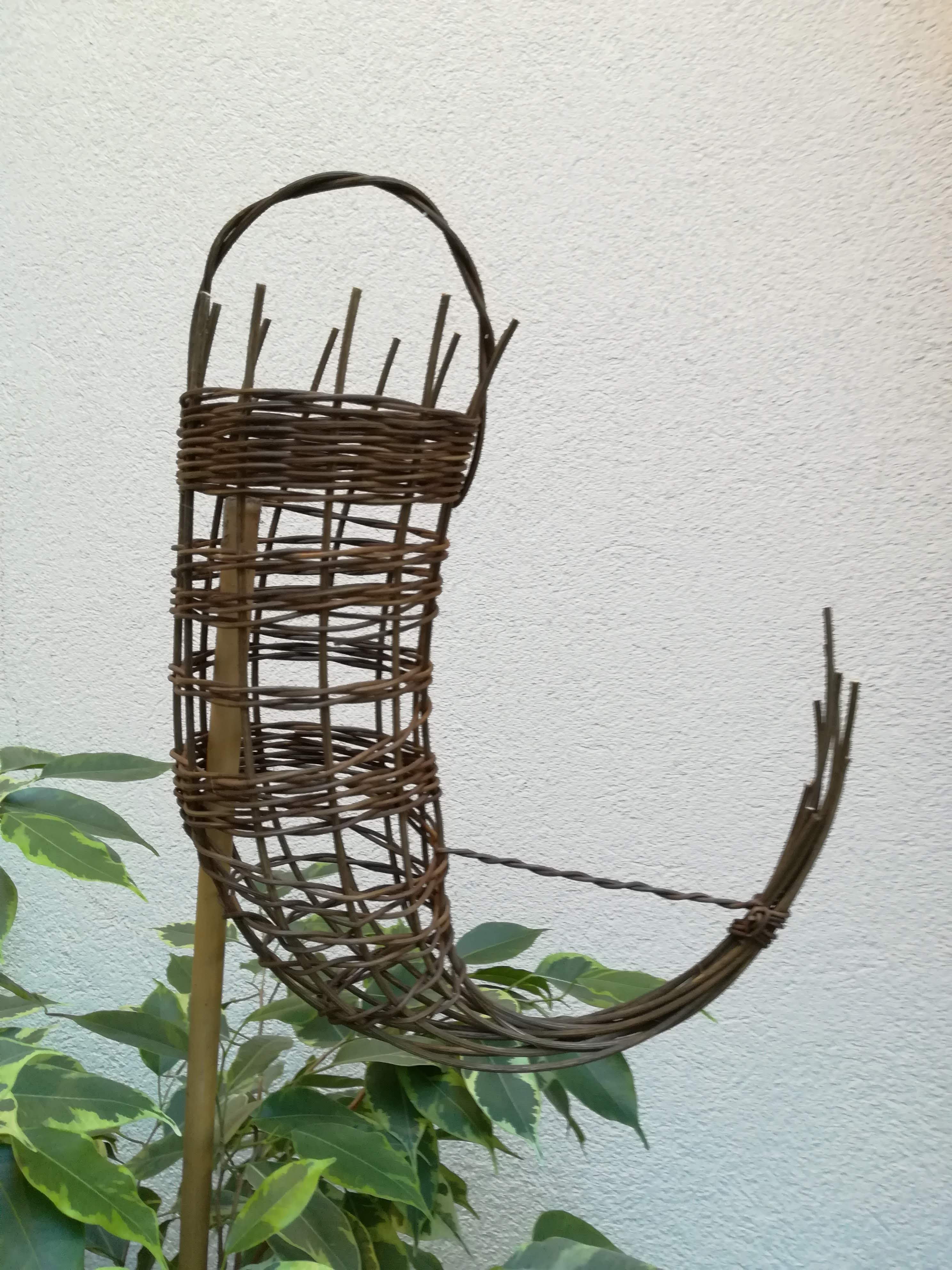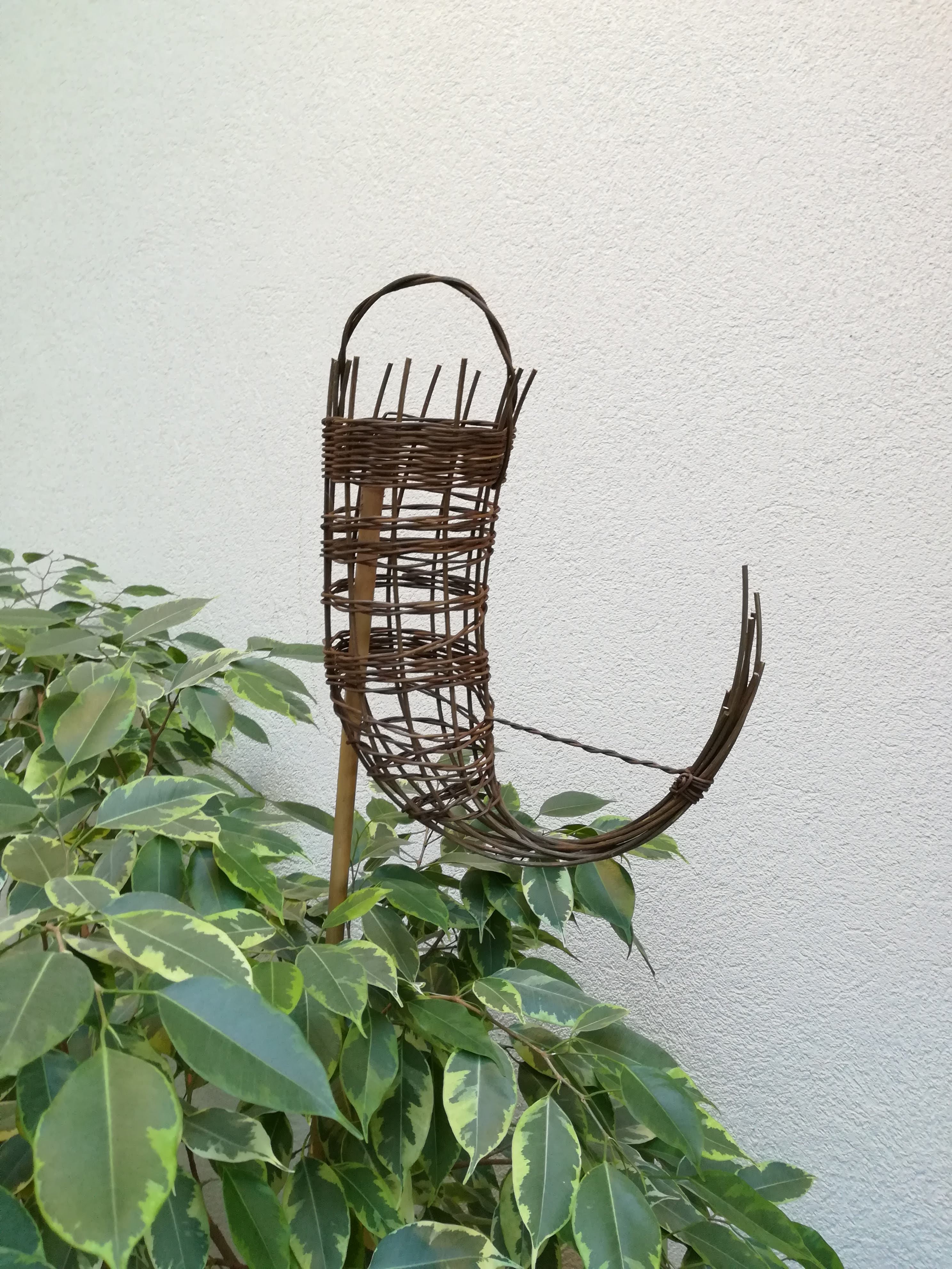 Marie-Alix a tressé cette jolie corne d’abondance toute en moelle de rotin marron. Elle pourra servir de mangeoire à oiseaux mais aussi pour garder les oignons dans la cuisine par exemple.