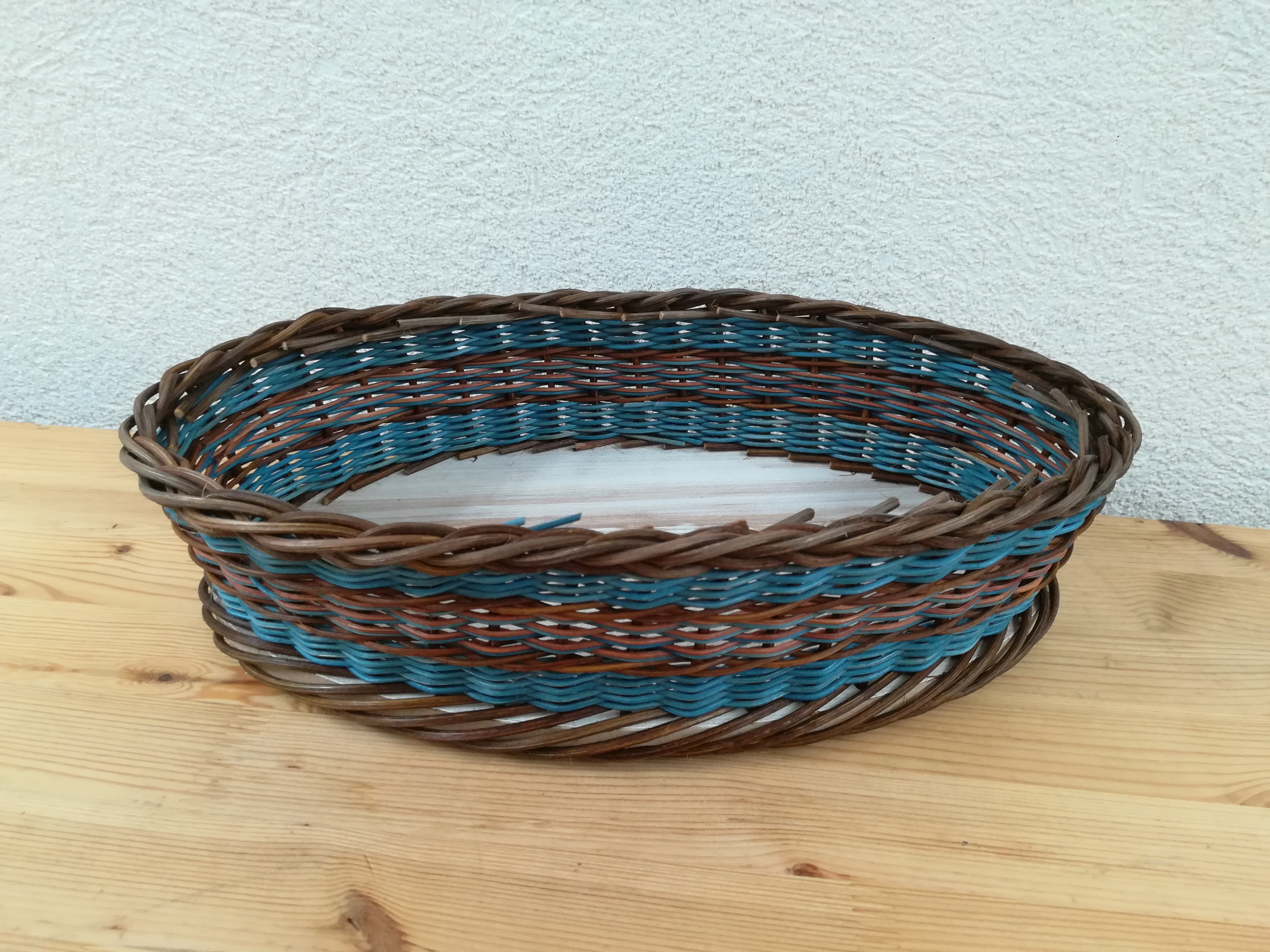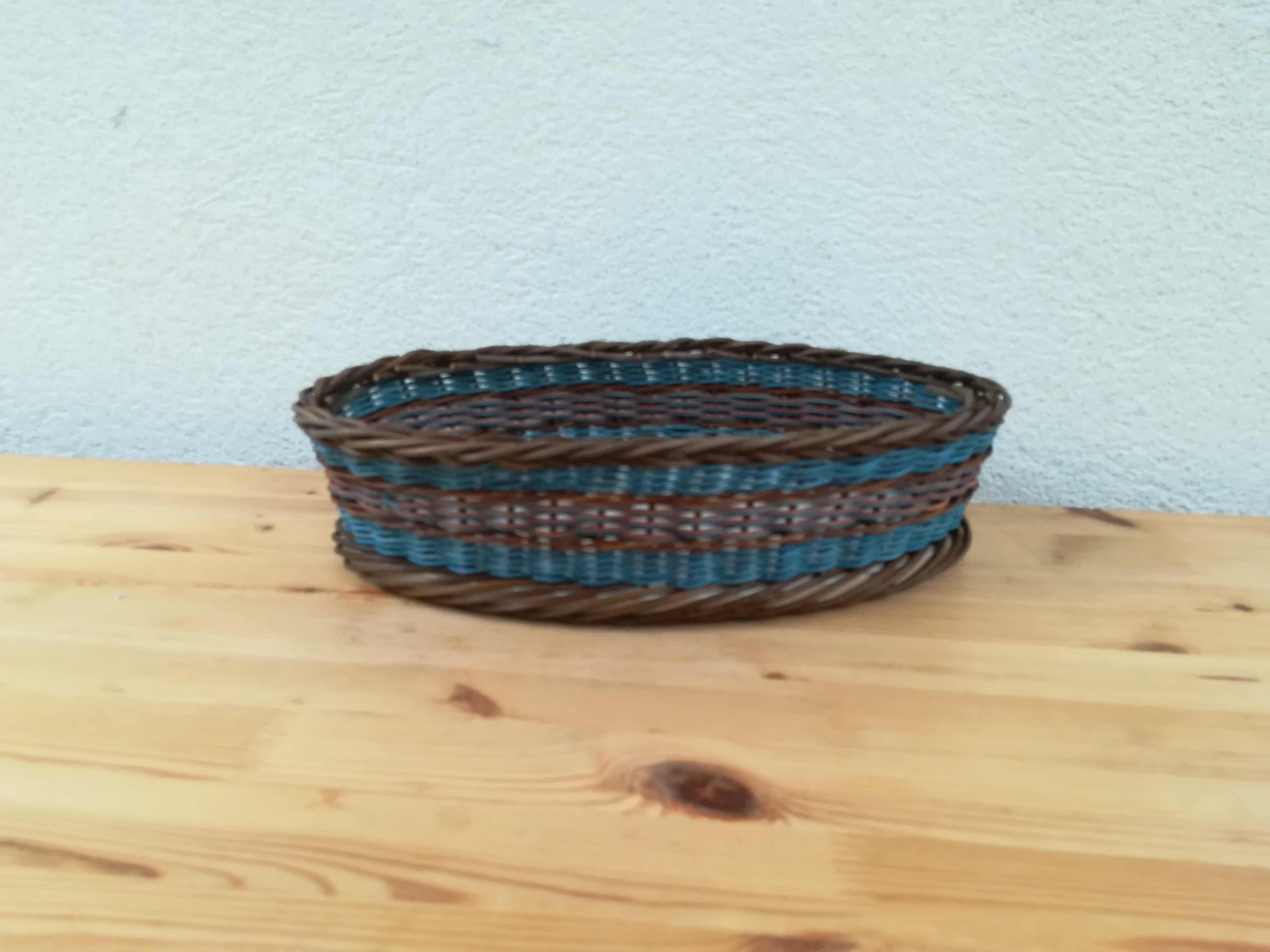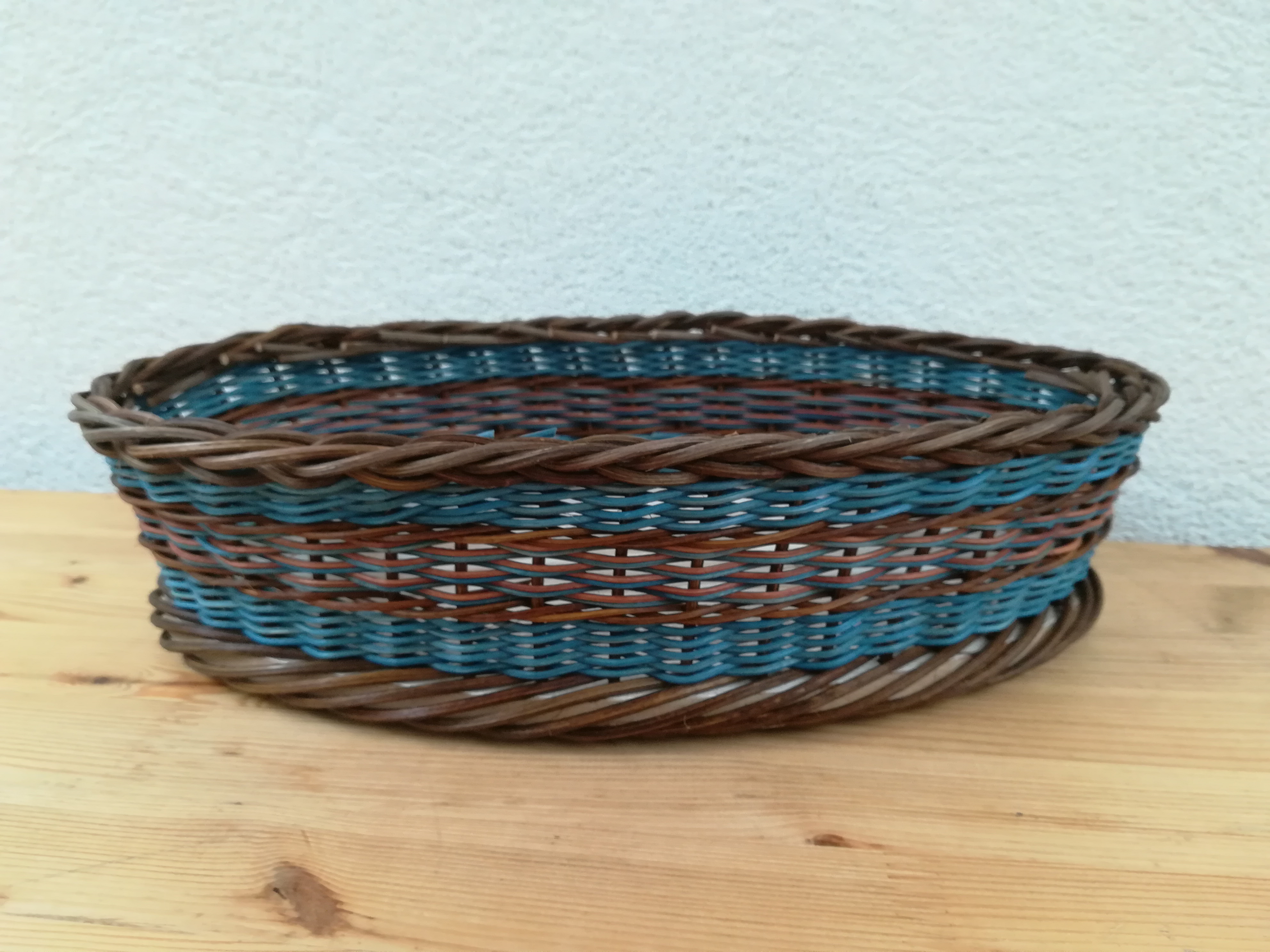 Retour sur une corbeille avec un fond en stratifié pour Nelly : tressage en super, torche et planchette et bordure ordinaire.