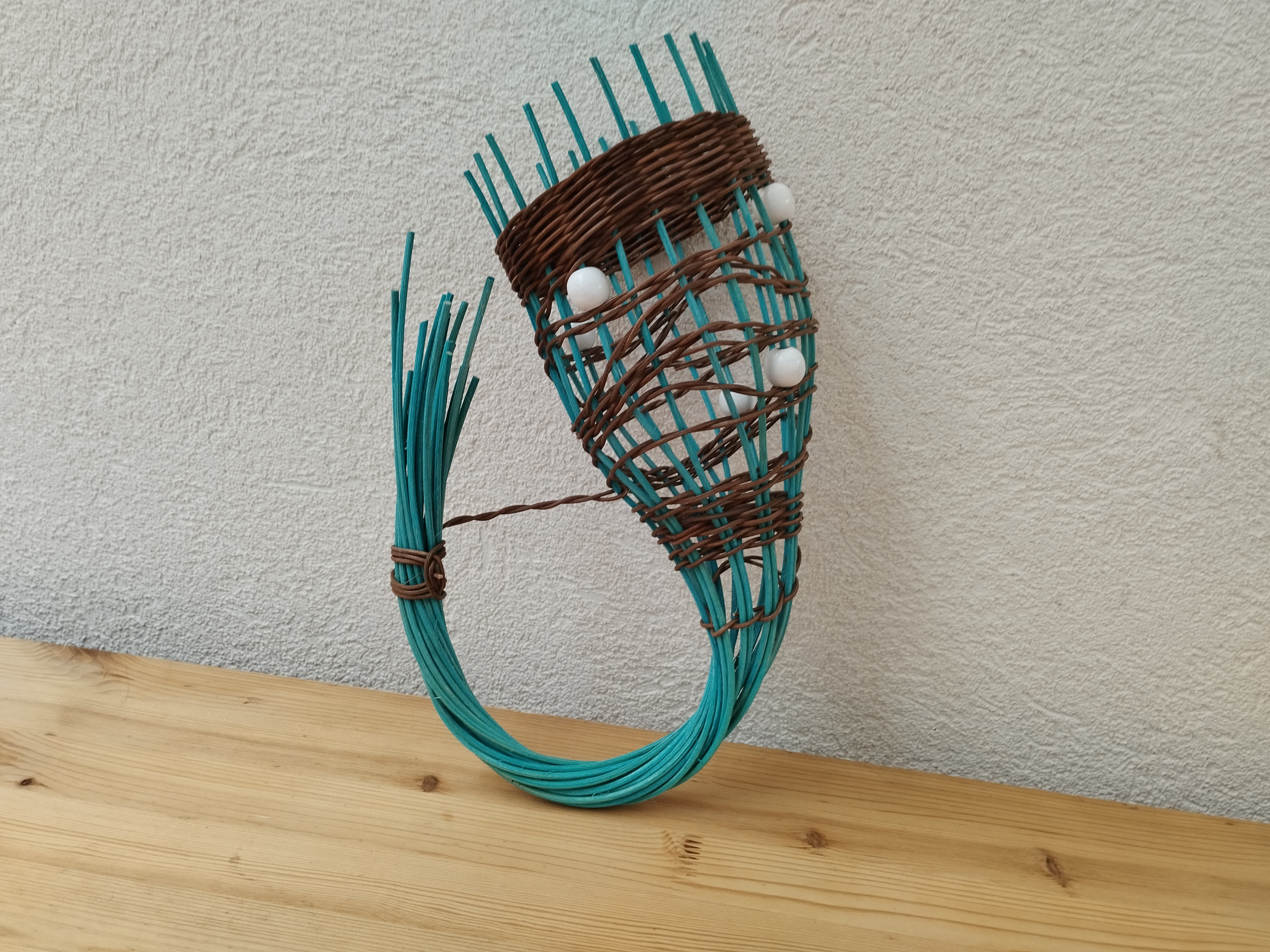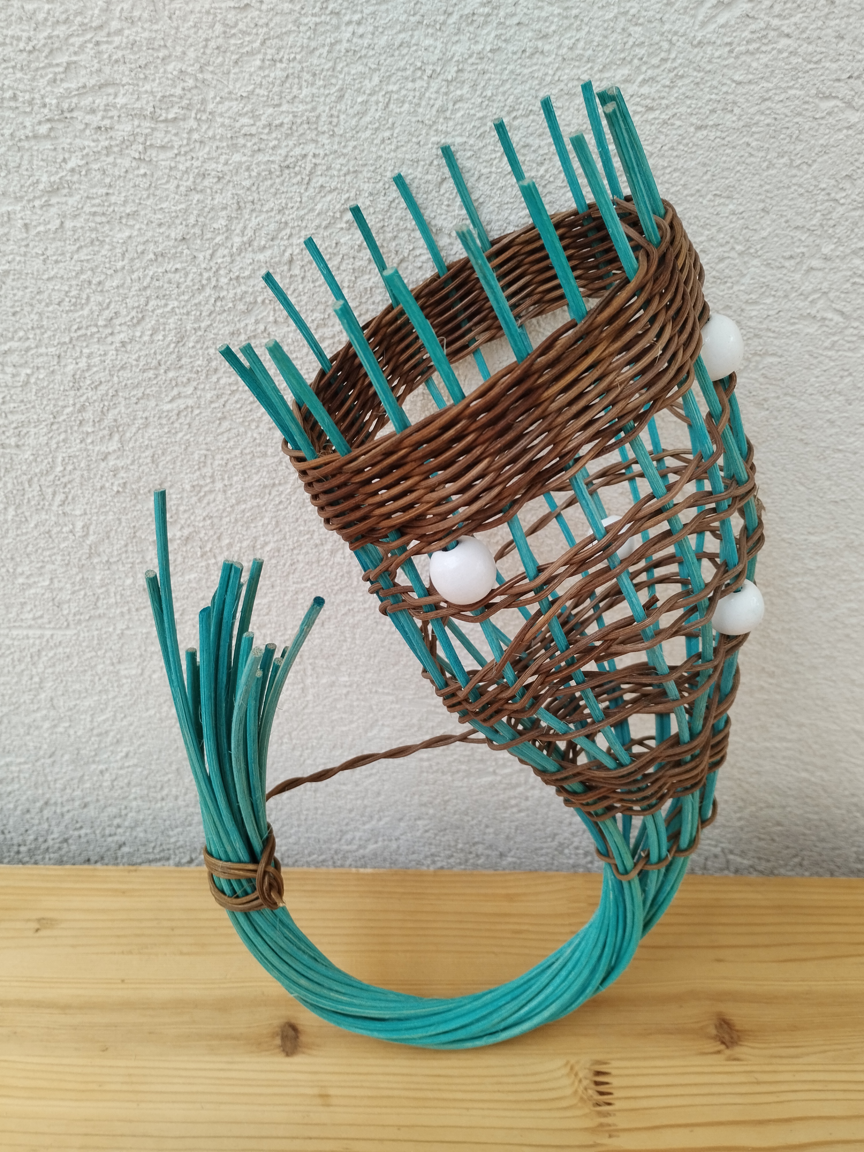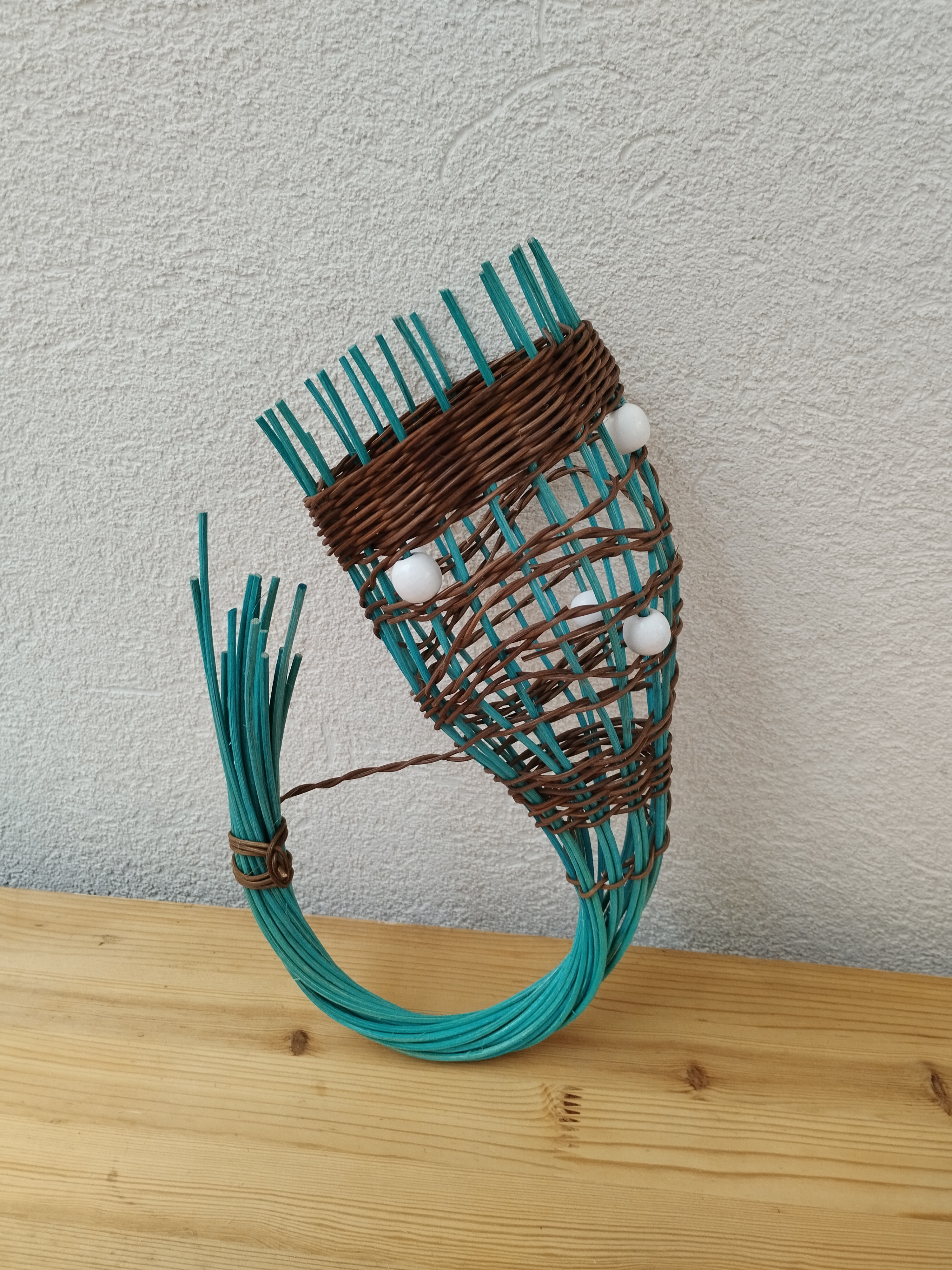 Deux cornes d’abondance tressées par Nelly lors de la journée vannerie début juillet. Réalisées en moelle de rotin et décorées de nœuds japonais et perles en bois.