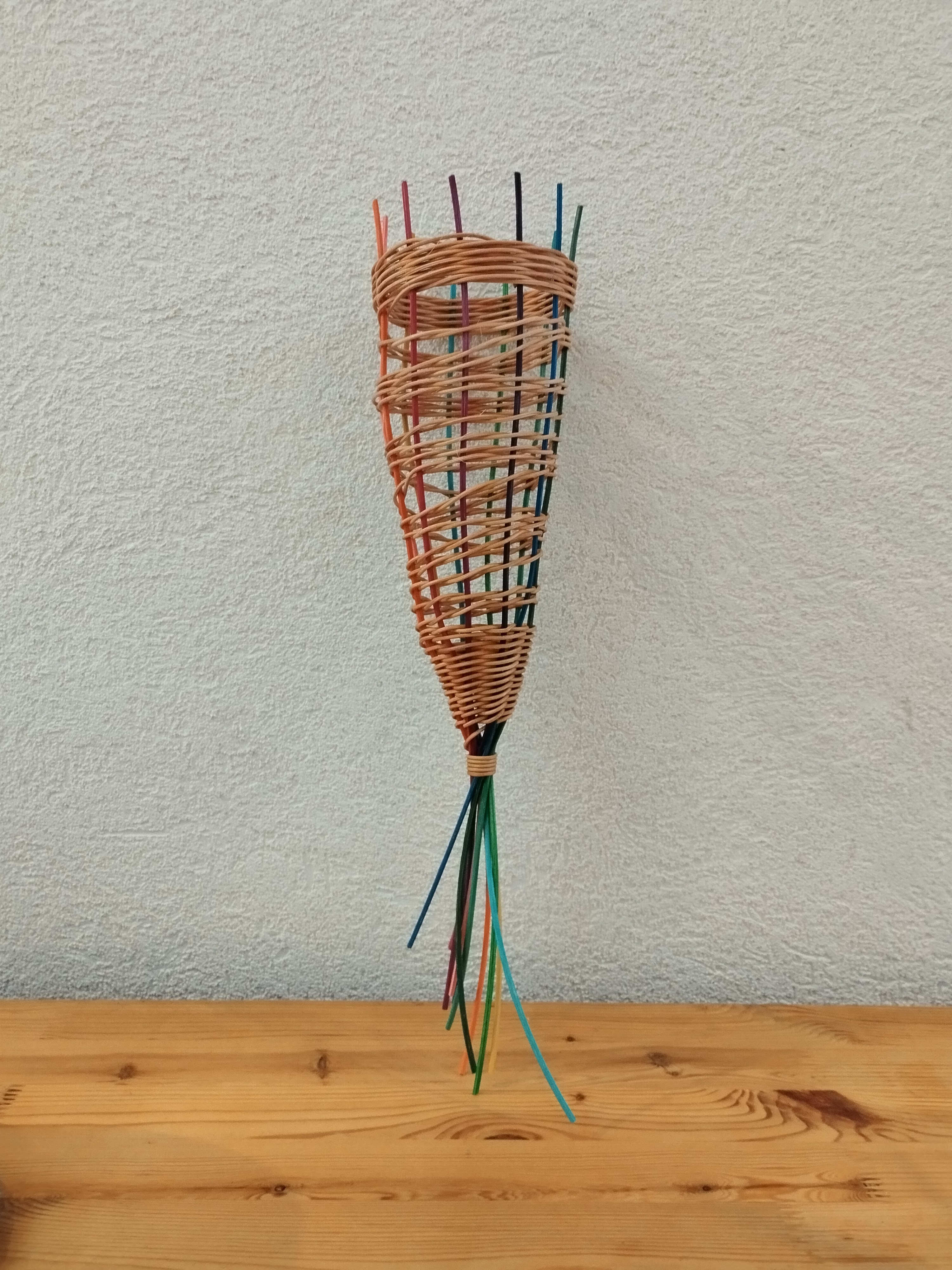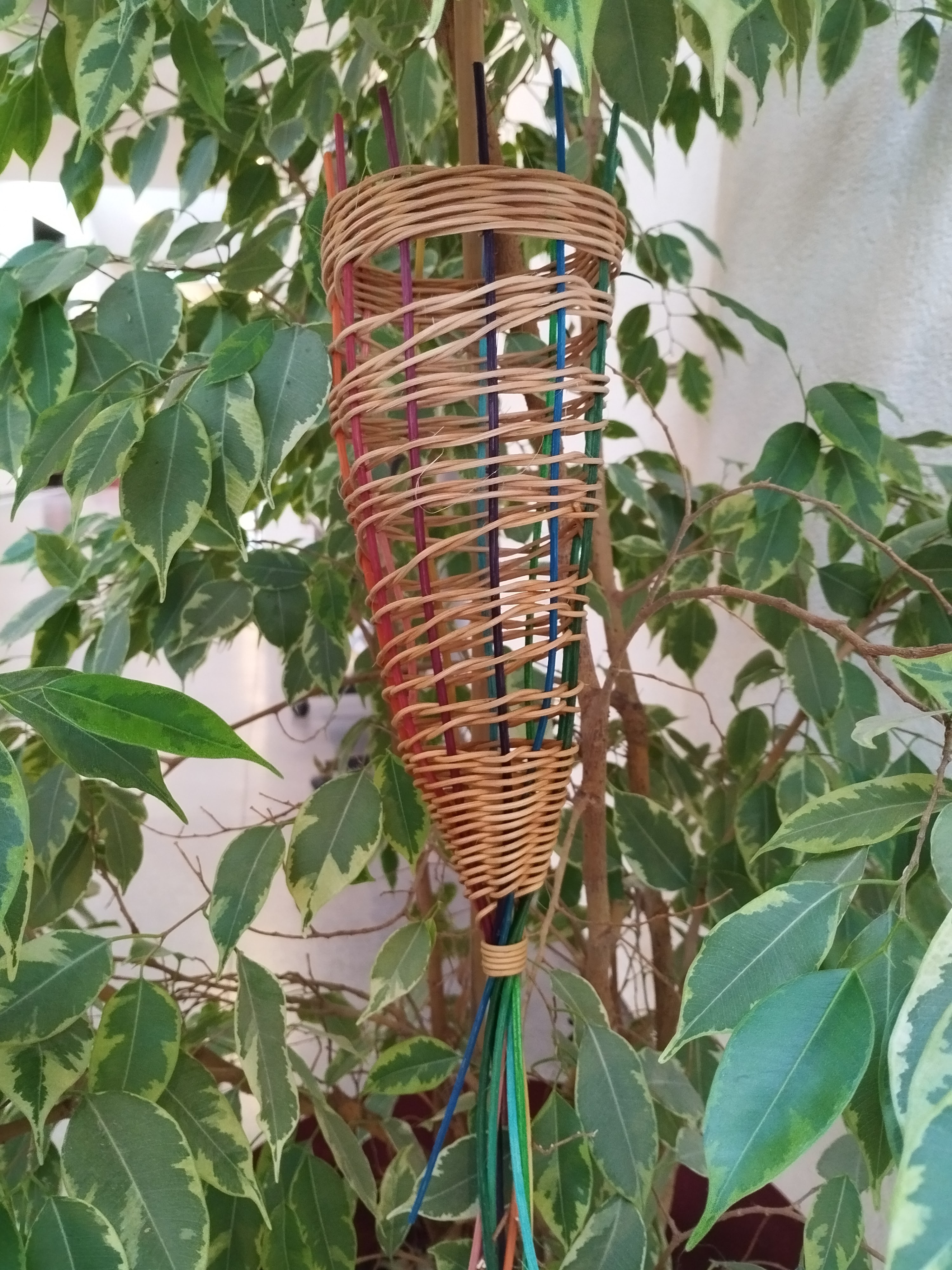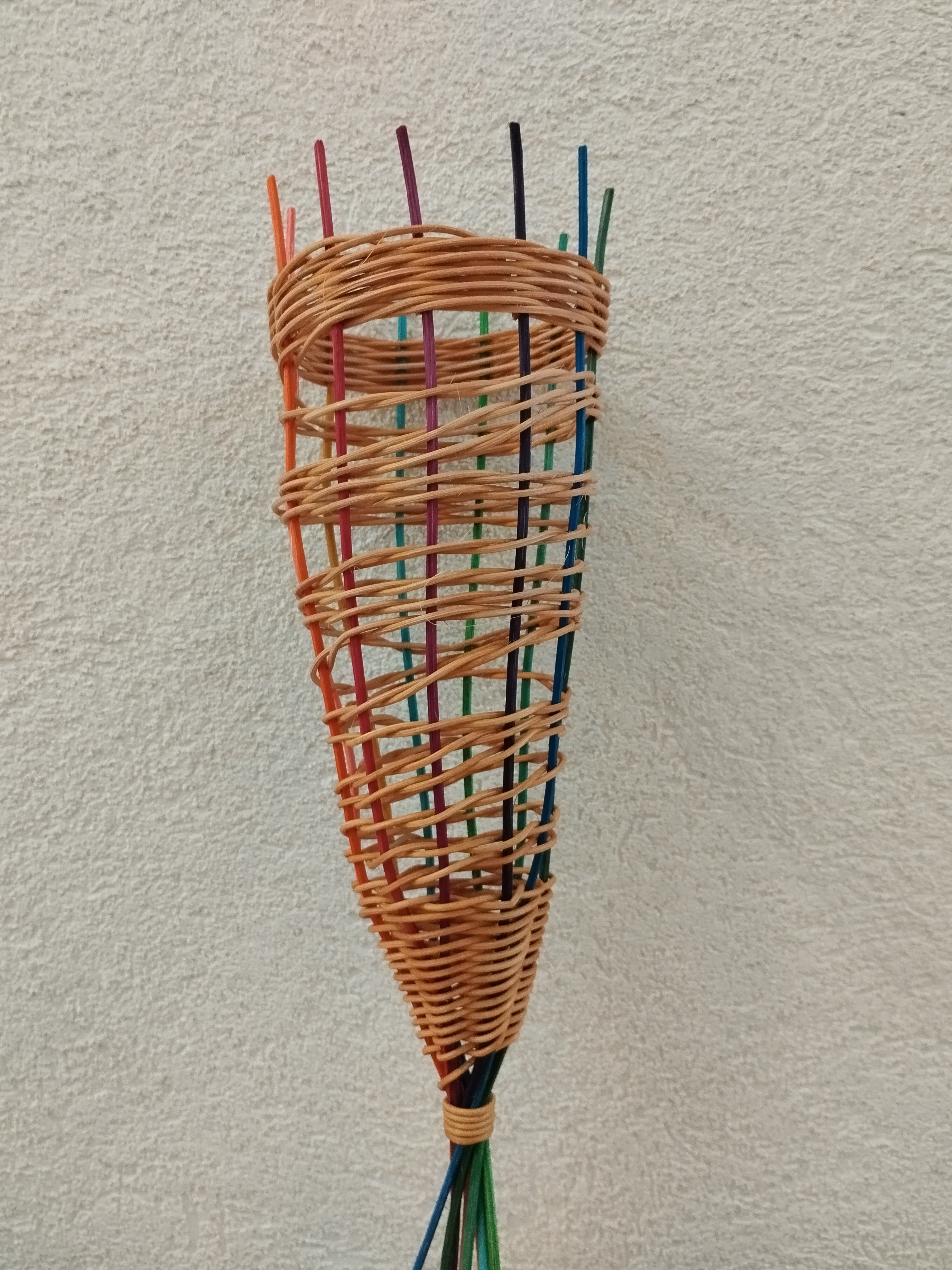 Pour sa première séance de vannerie, Charlotte a réalisé ce cône en rotin qui servira de mangeoire à oiseaux ou pour conserver les oignons et échalottes à la maison.