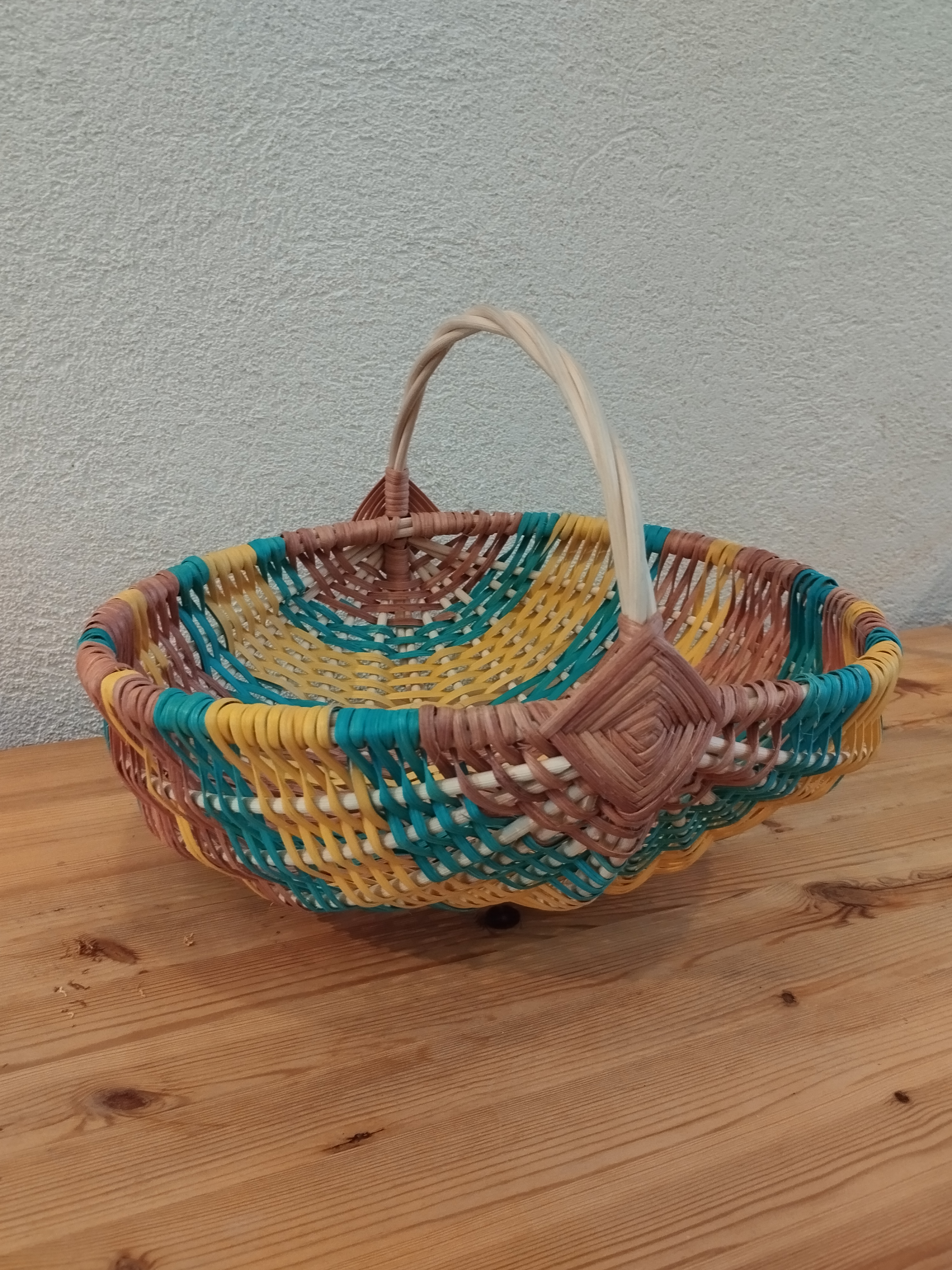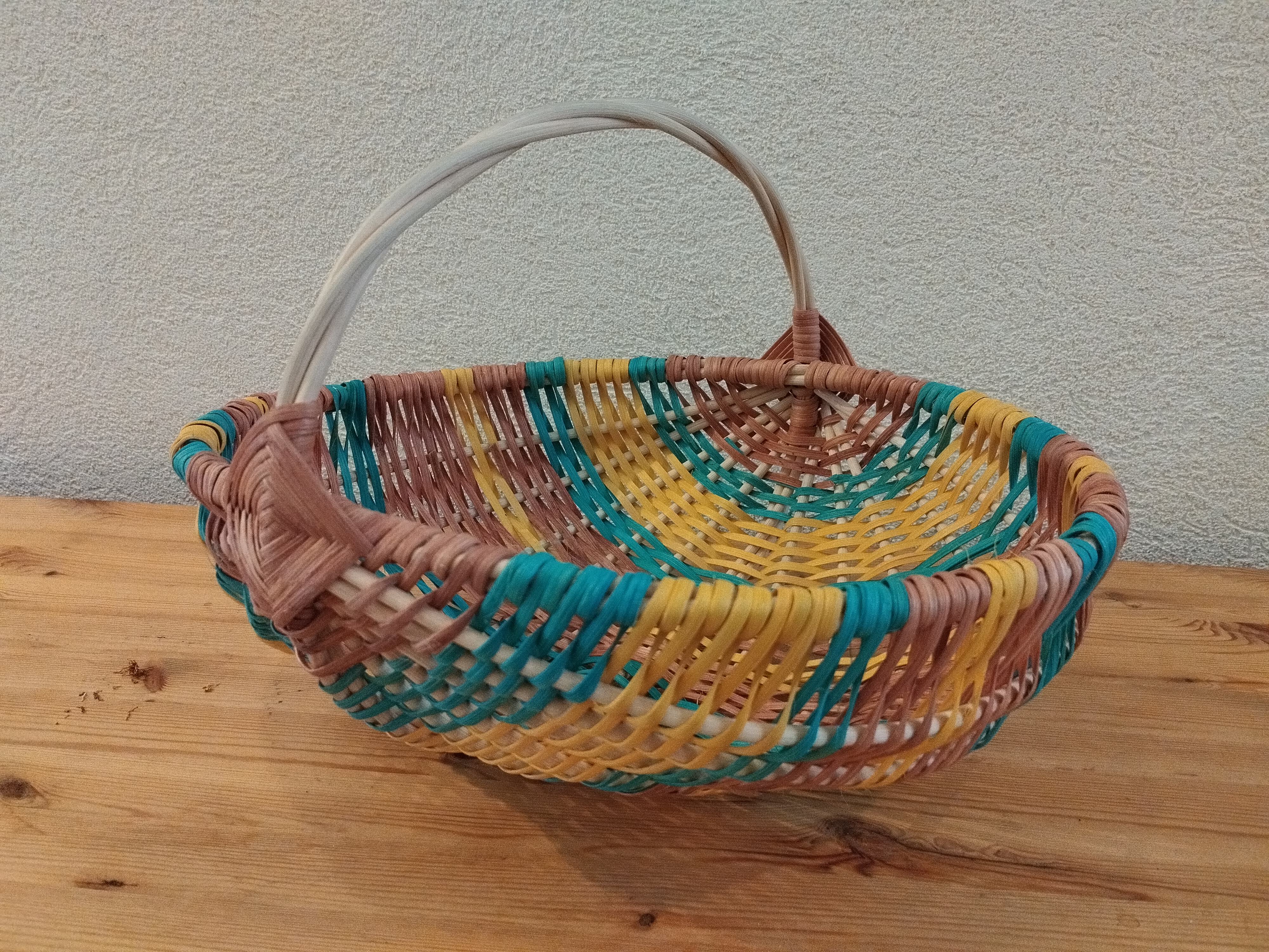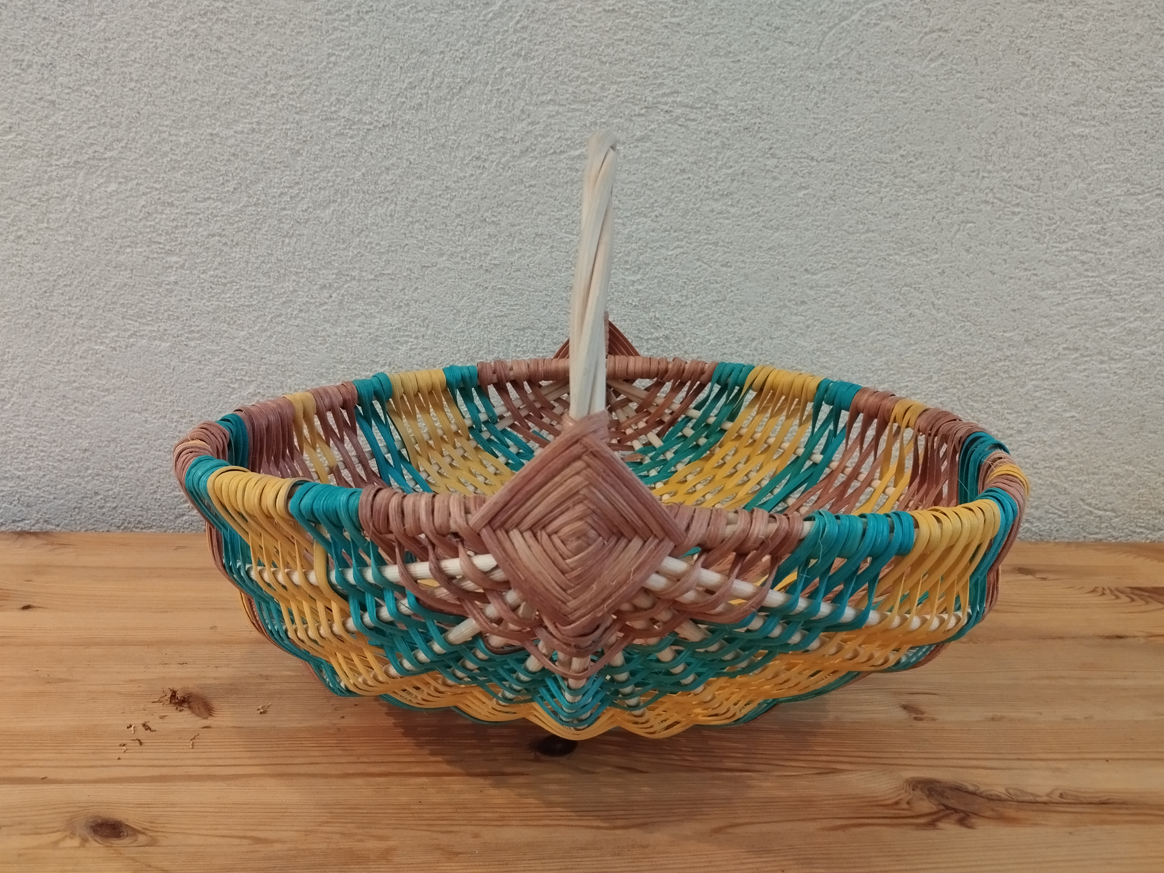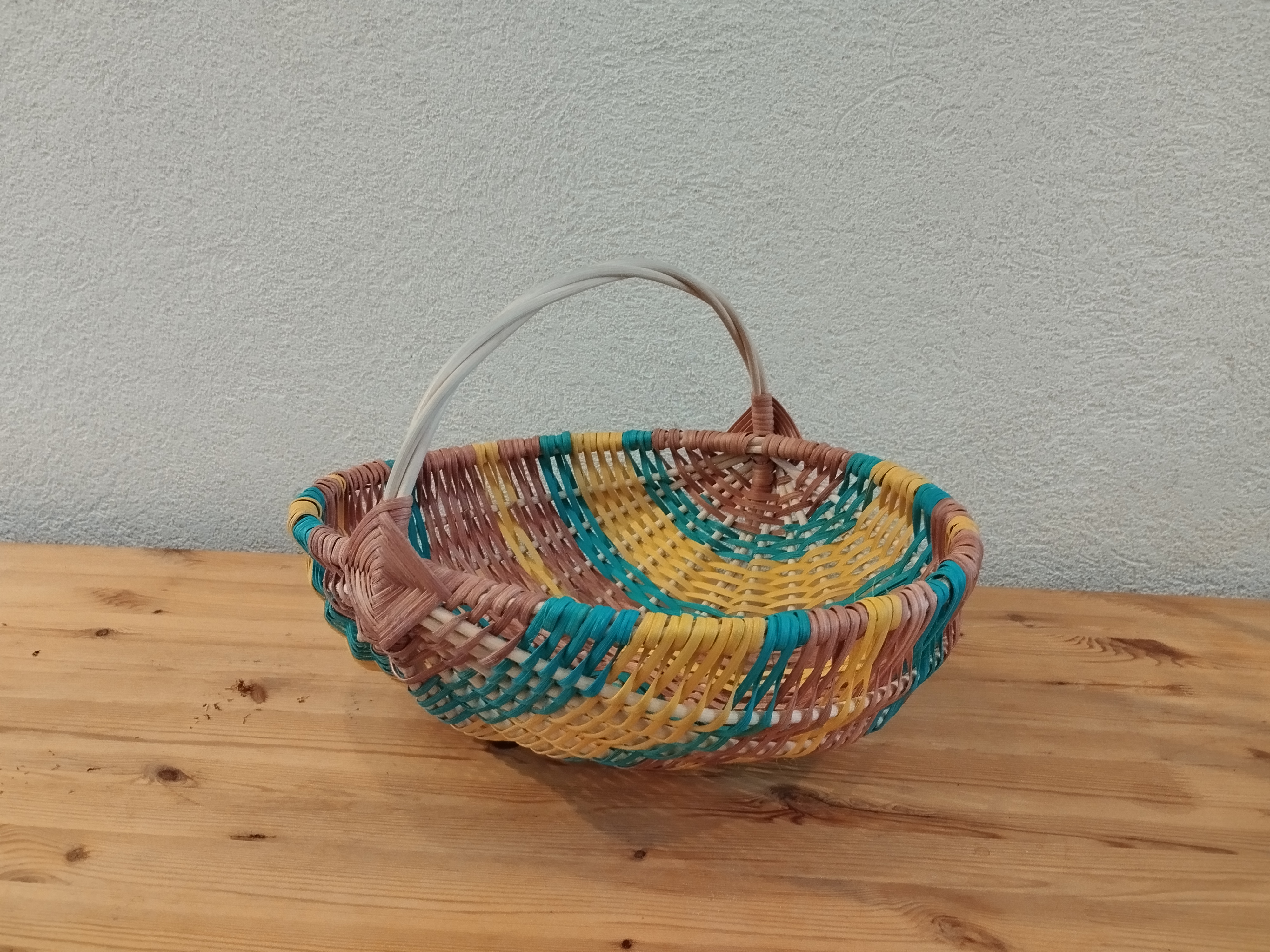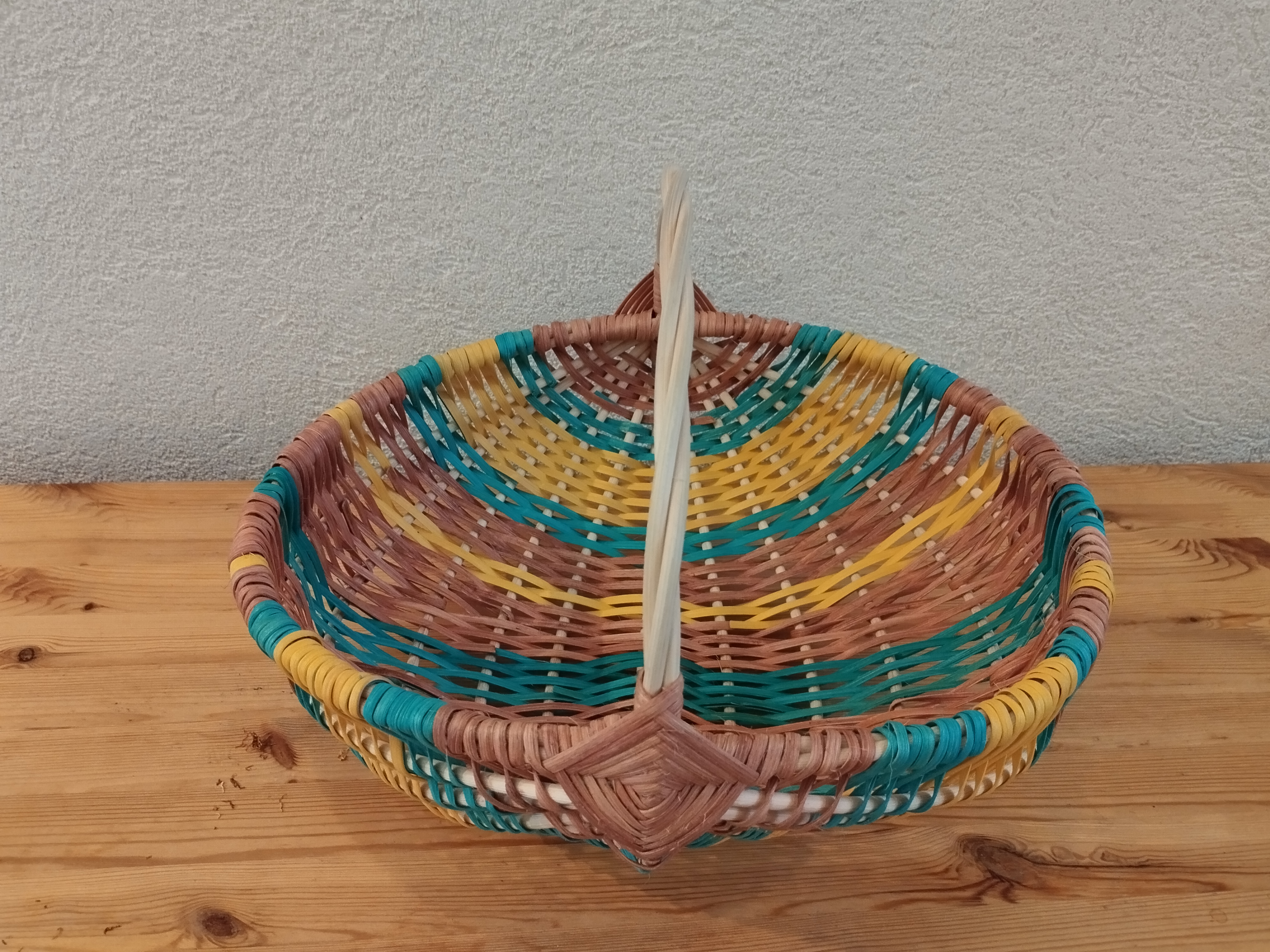 Lors de la dernière journée de vannerie, Laura a tressé son premier panier sur arceaux avec de l’éclisse de rotin. Joli choix de couleurs 🙂