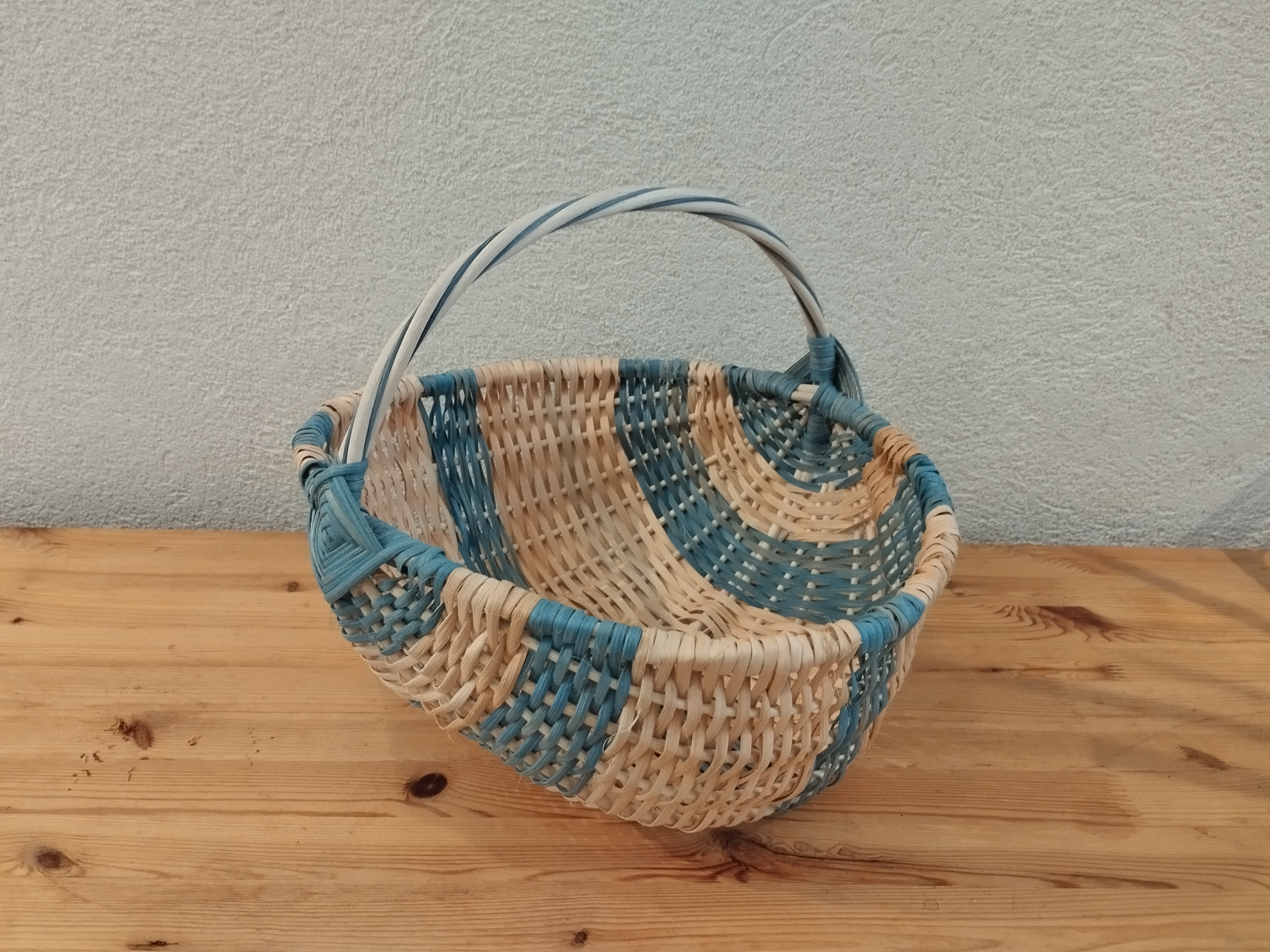 Un joli panier sur arceaux bicolore réalisé par Béatrice lors de la dernière journée de vannerie. Elle a utilisé de l’éclisse de moelle de rotin pour le tressage.
