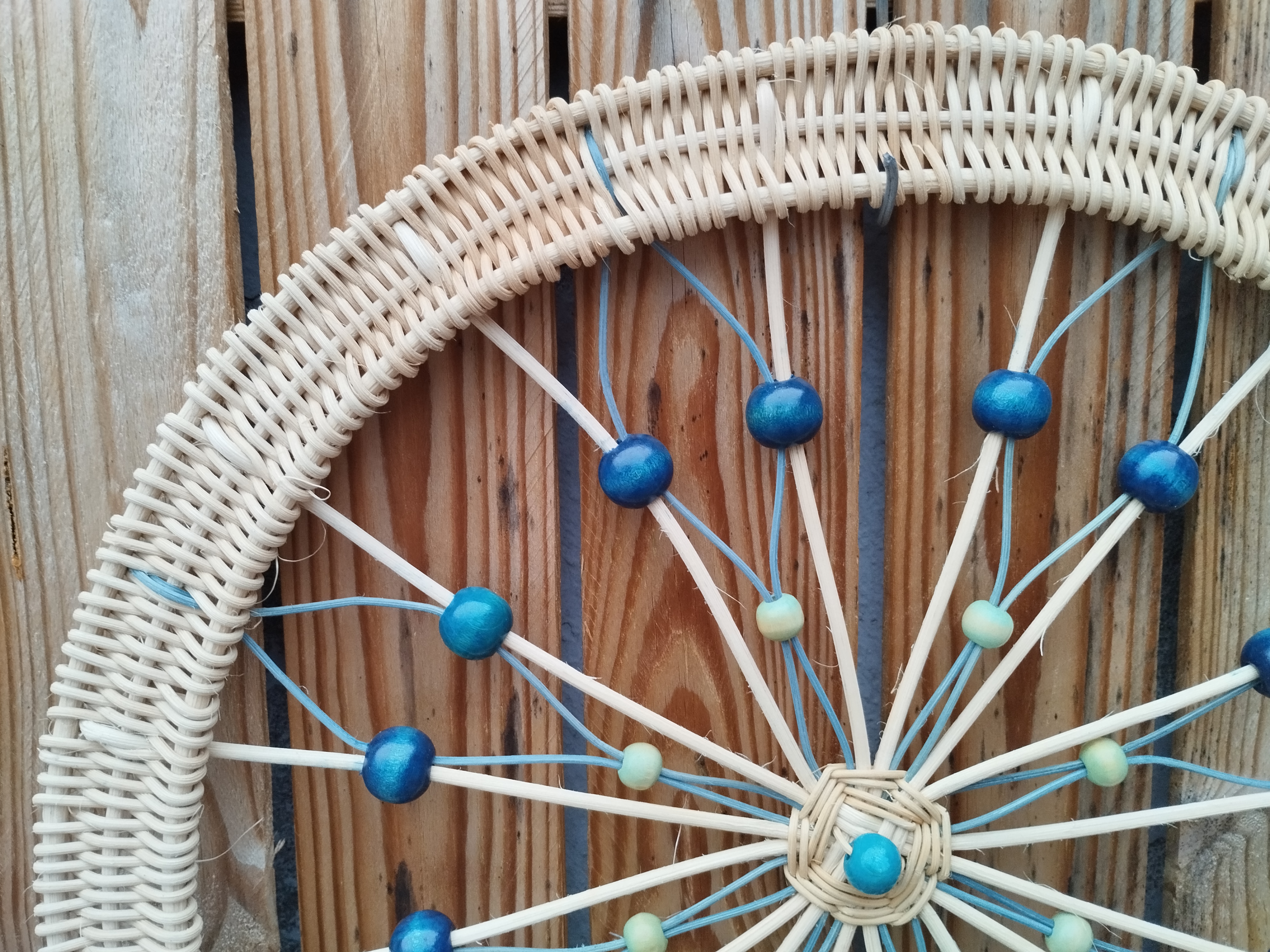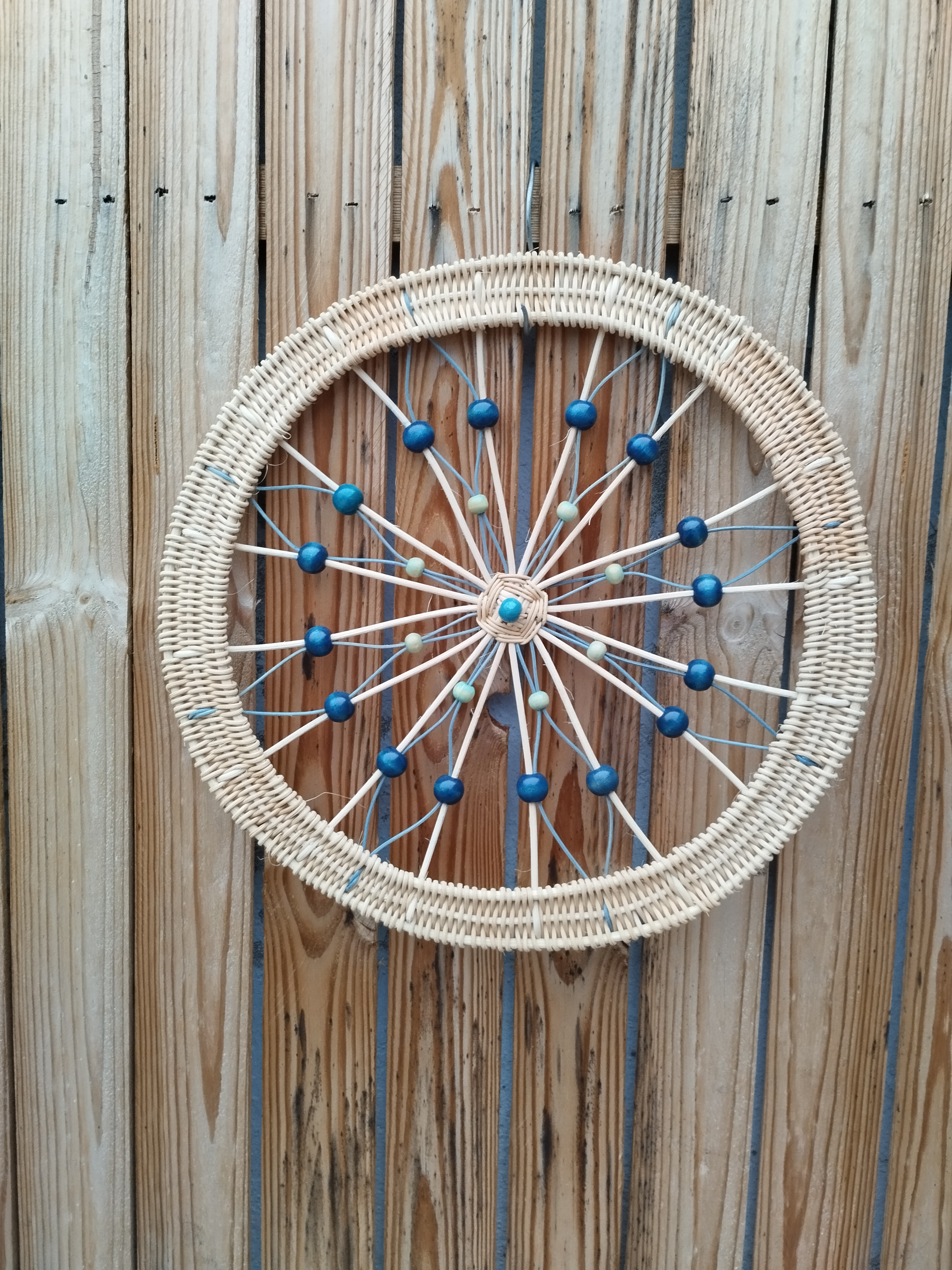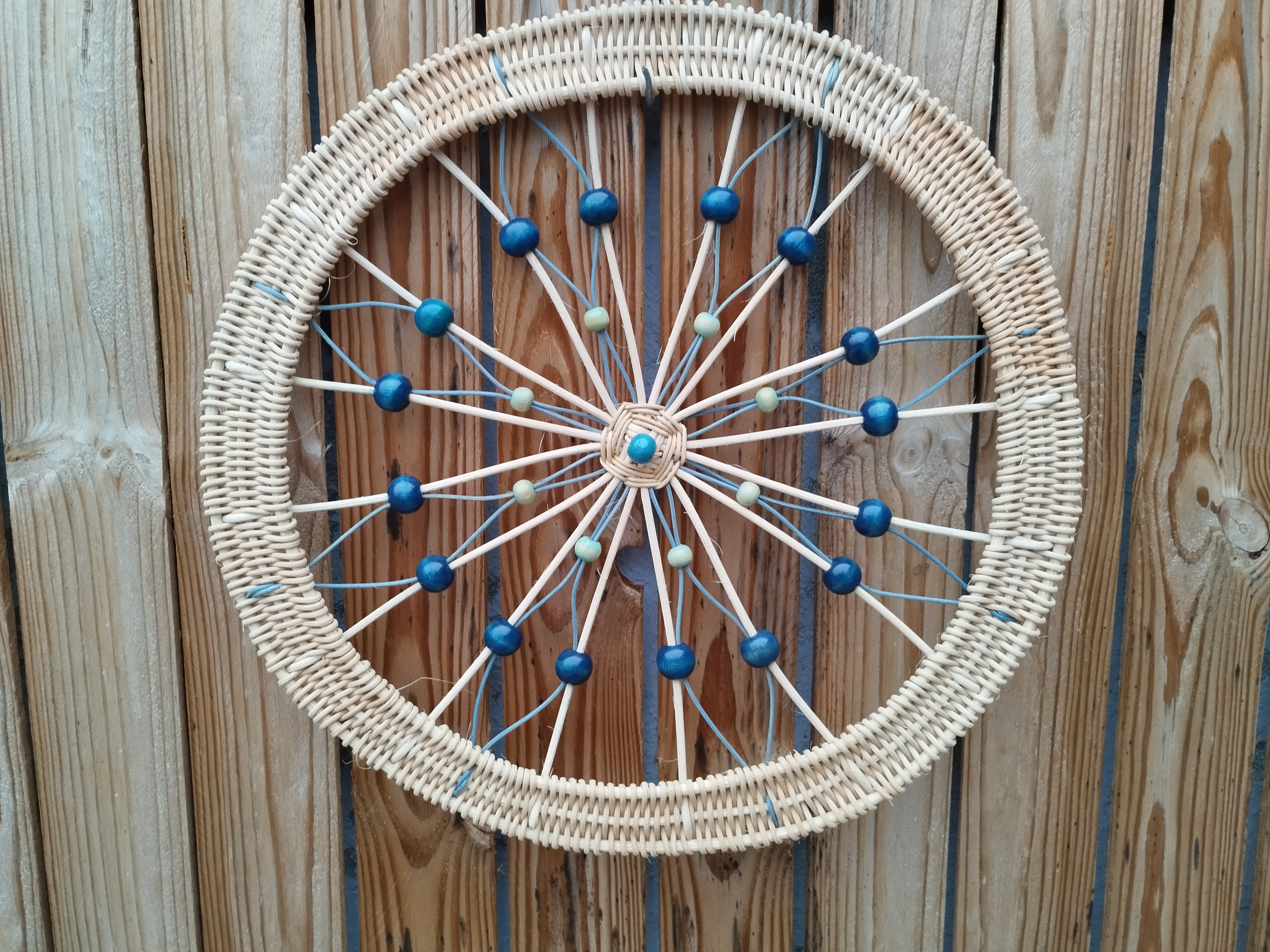 Pour changer un peu, voici une décoration murale faite en moelle de rotin et perles en bois. Le cercle extérieur et la croisée centrale sont indépendants et ne sont reliés qu’à la toute fin, une fois les perles insérées dans les montants.