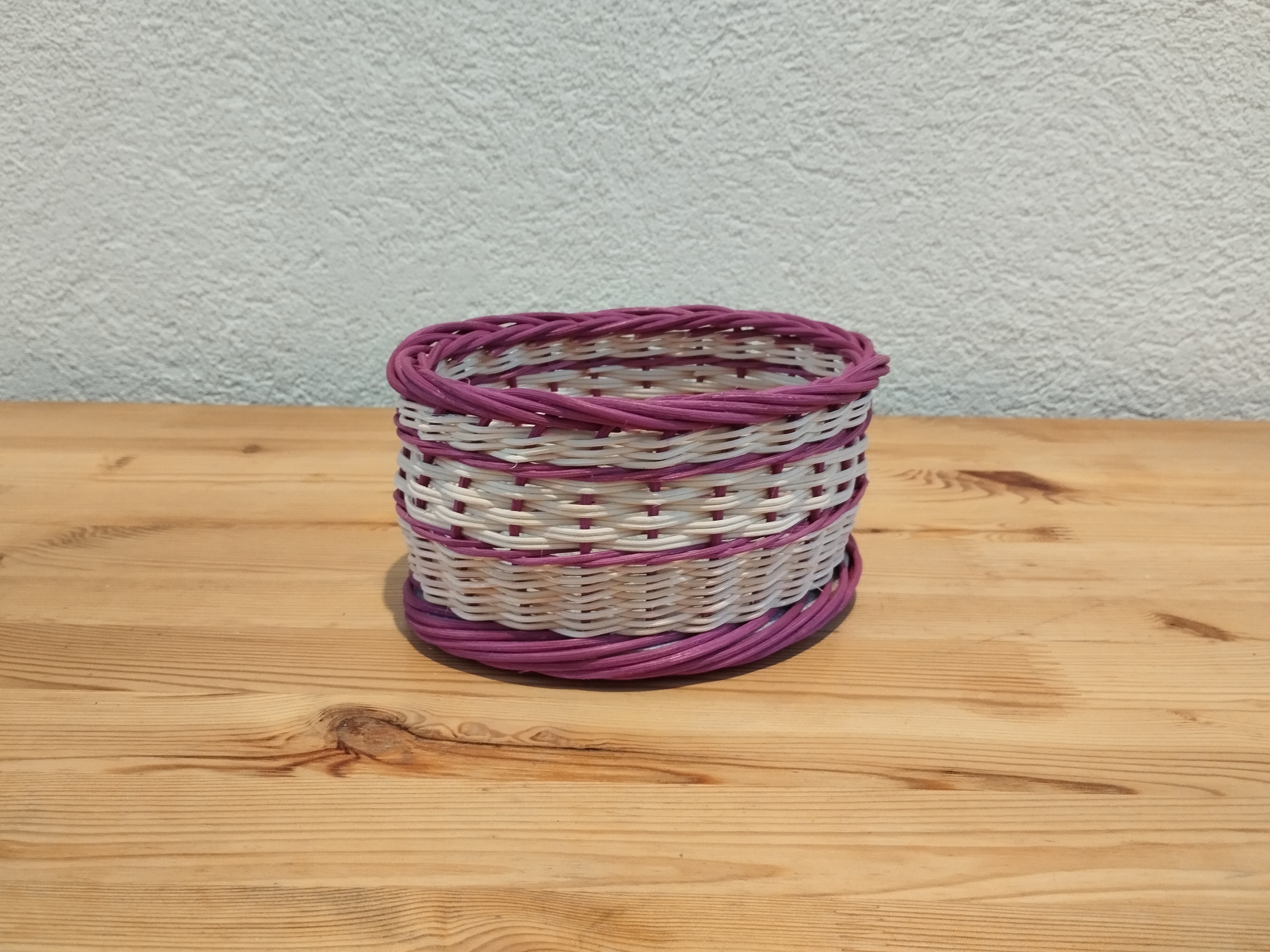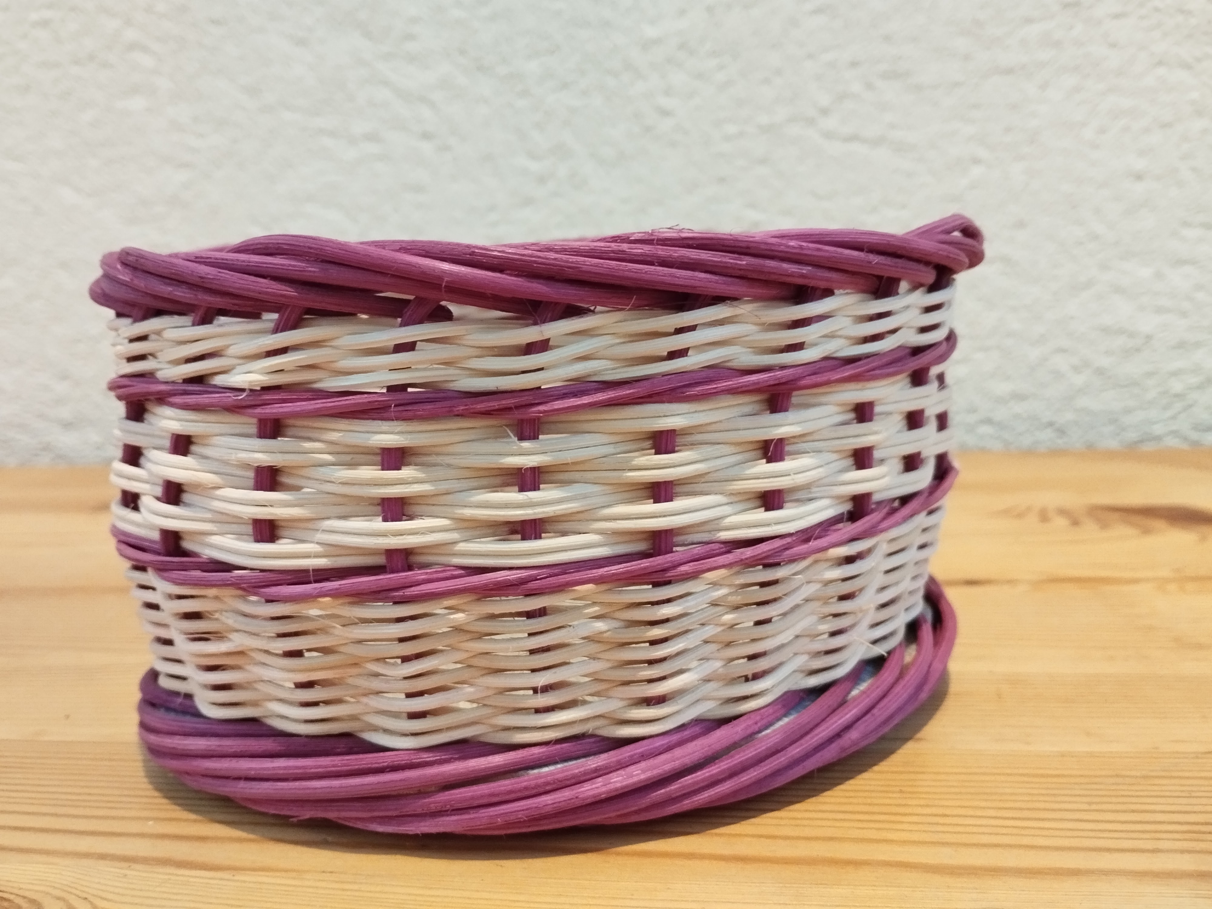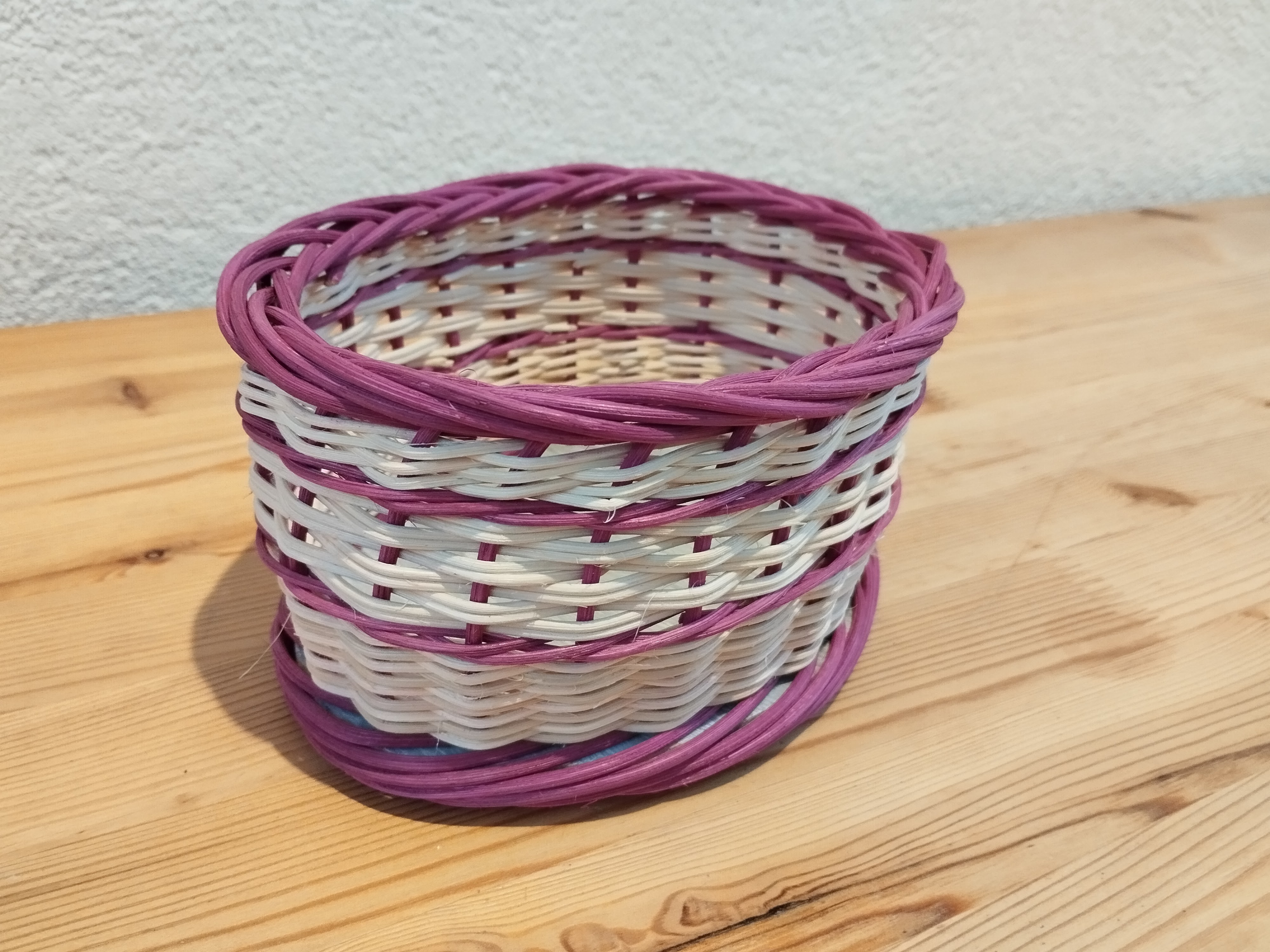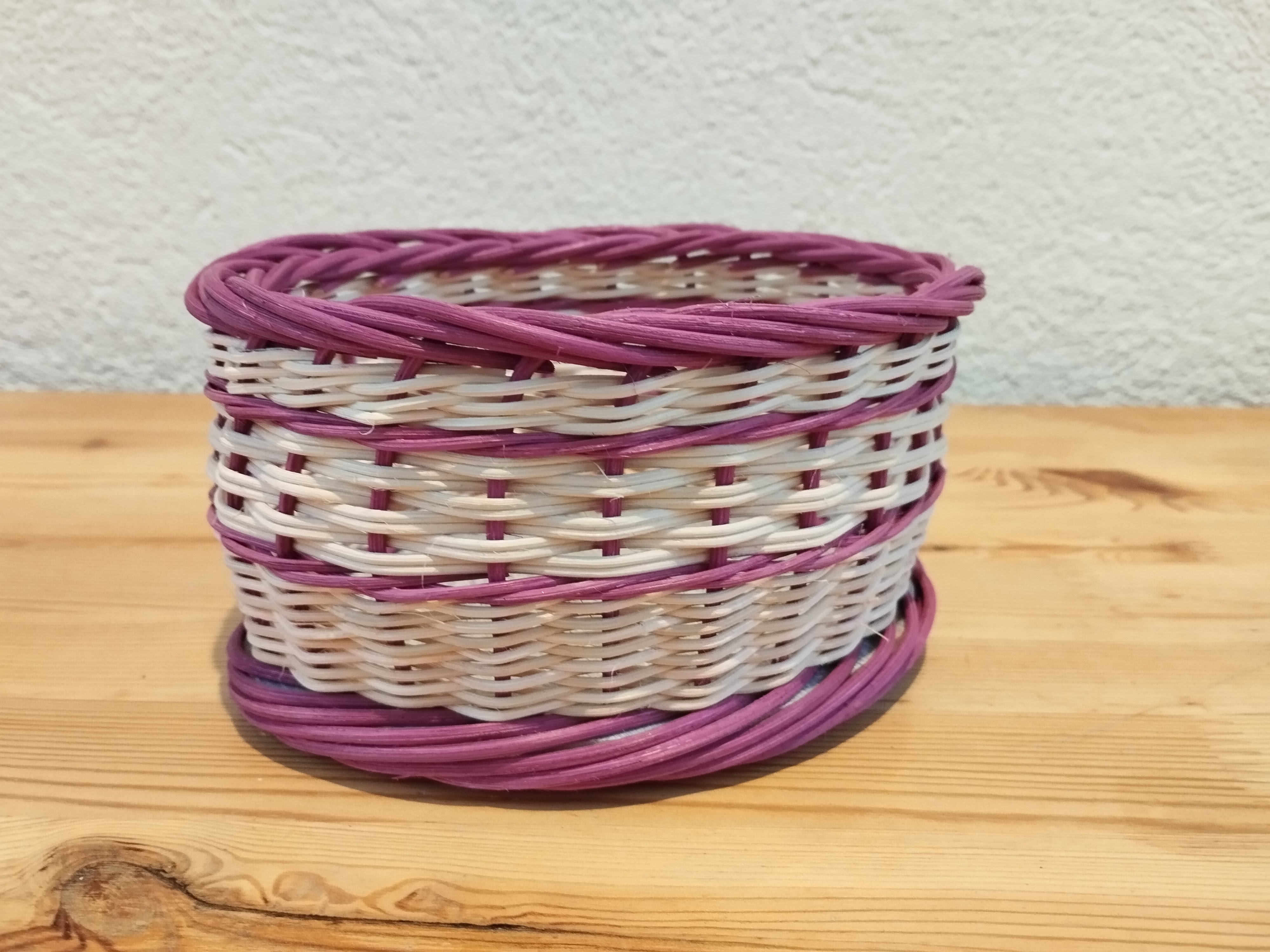 Pour sa première réalisation, Pascale a tressé sur un fond en bois avec de la moelle de rotin naturelle et magenta. Elle a varié les points de tressage, super, torche et planchette.