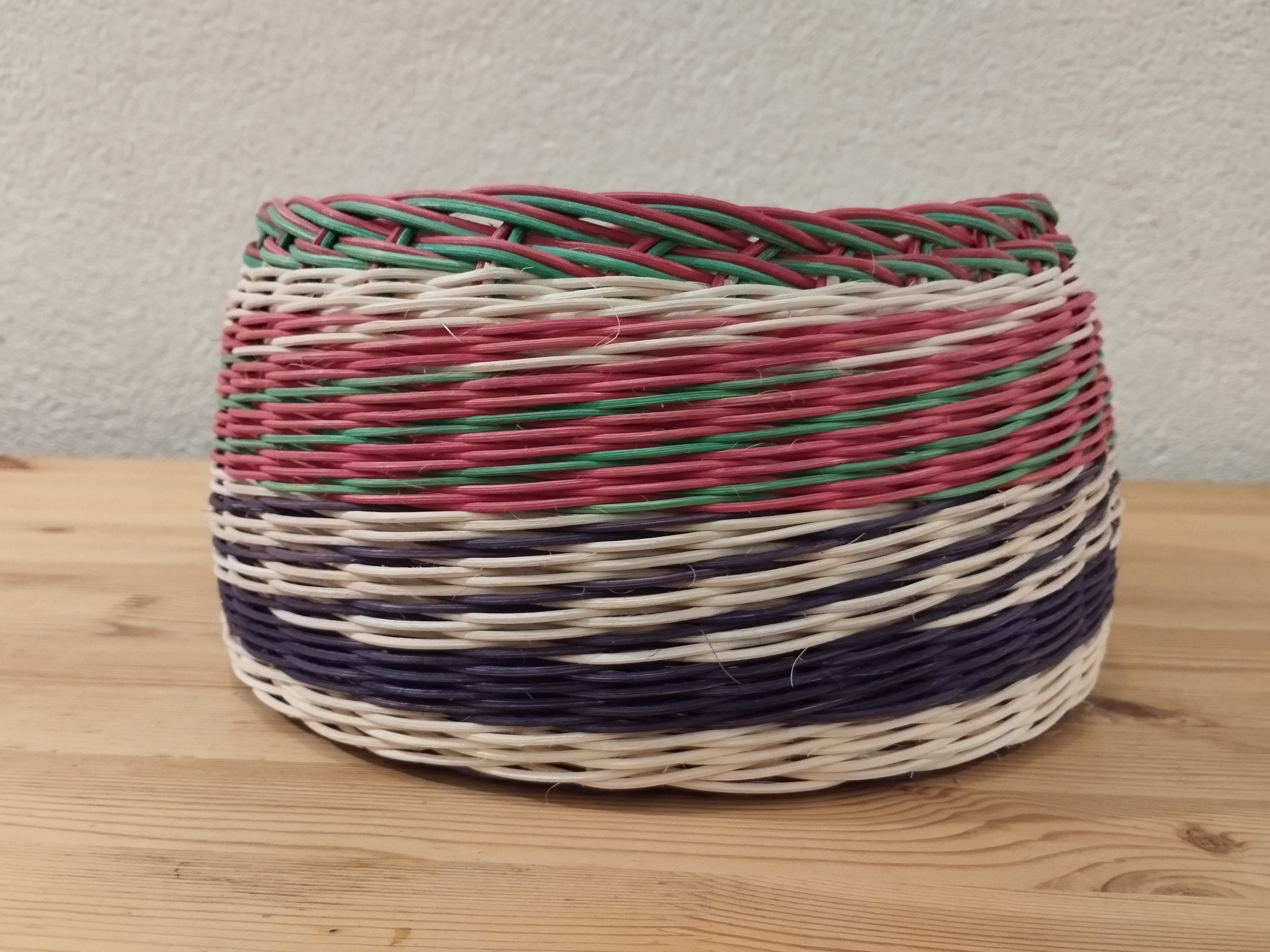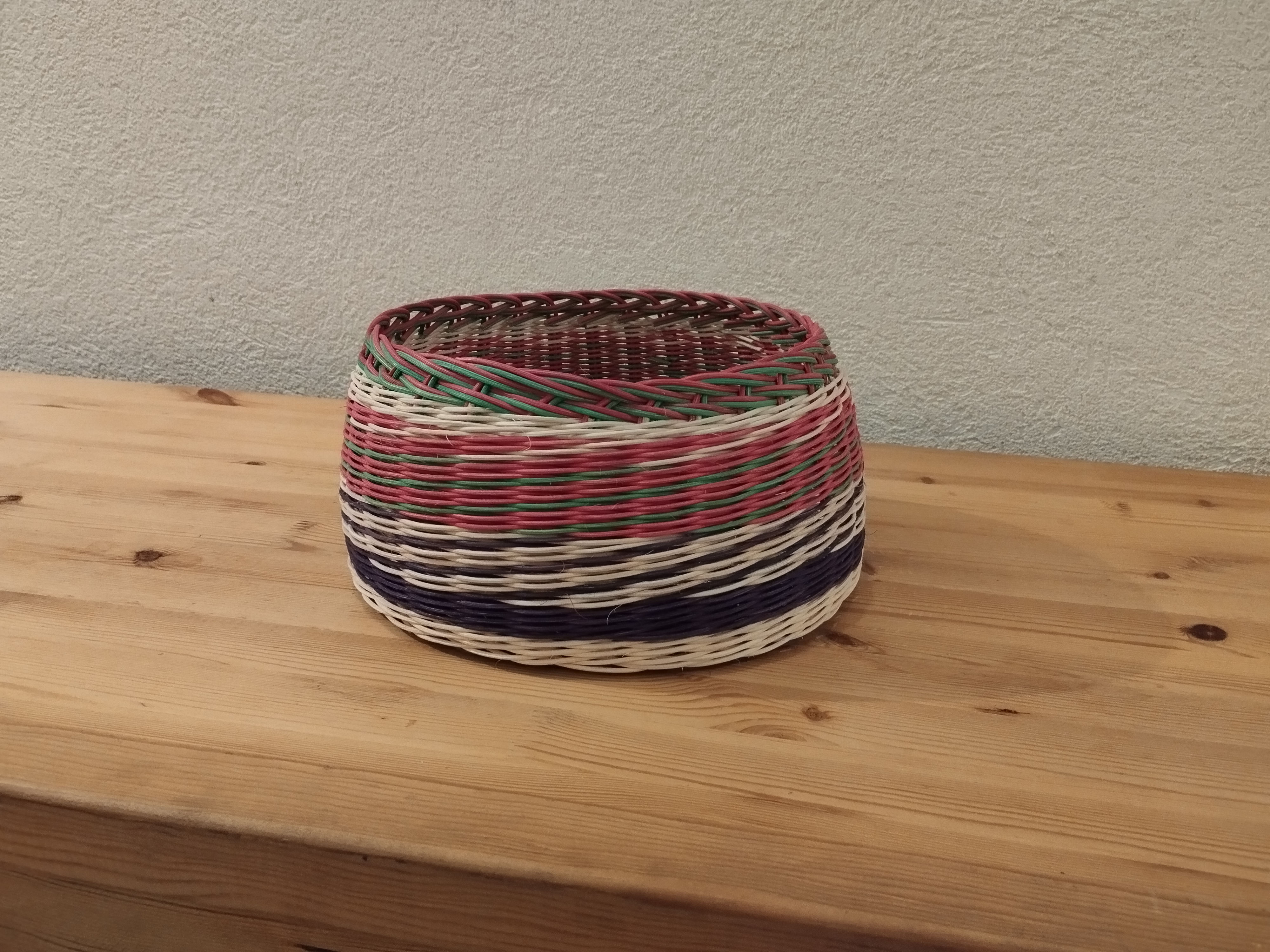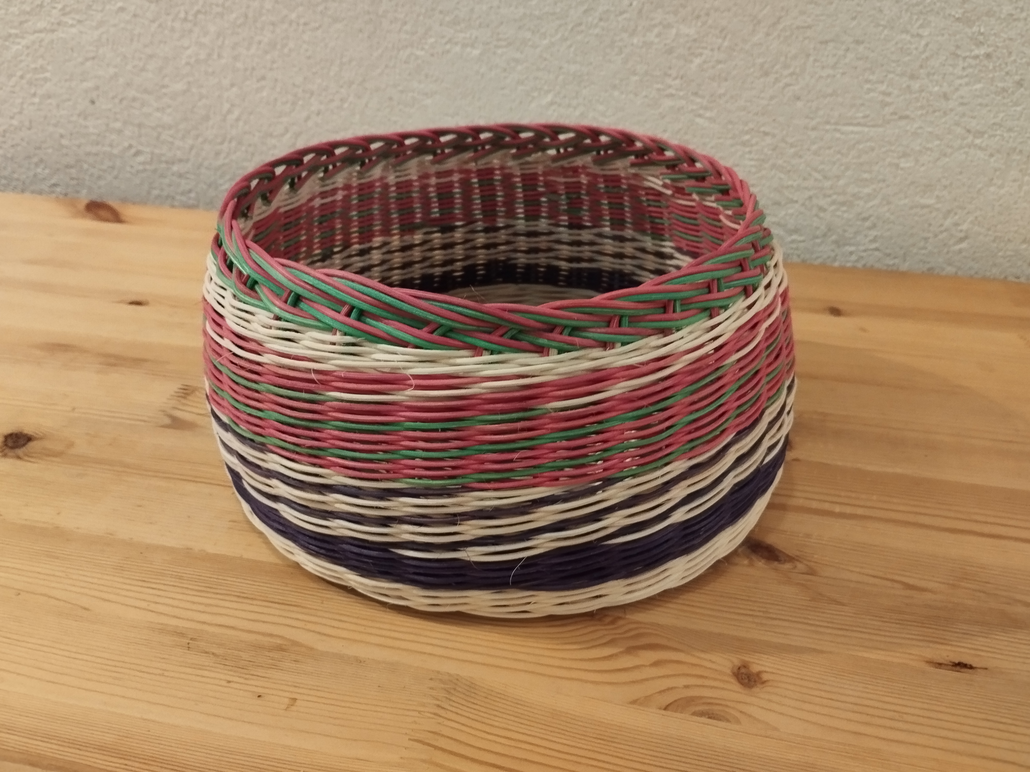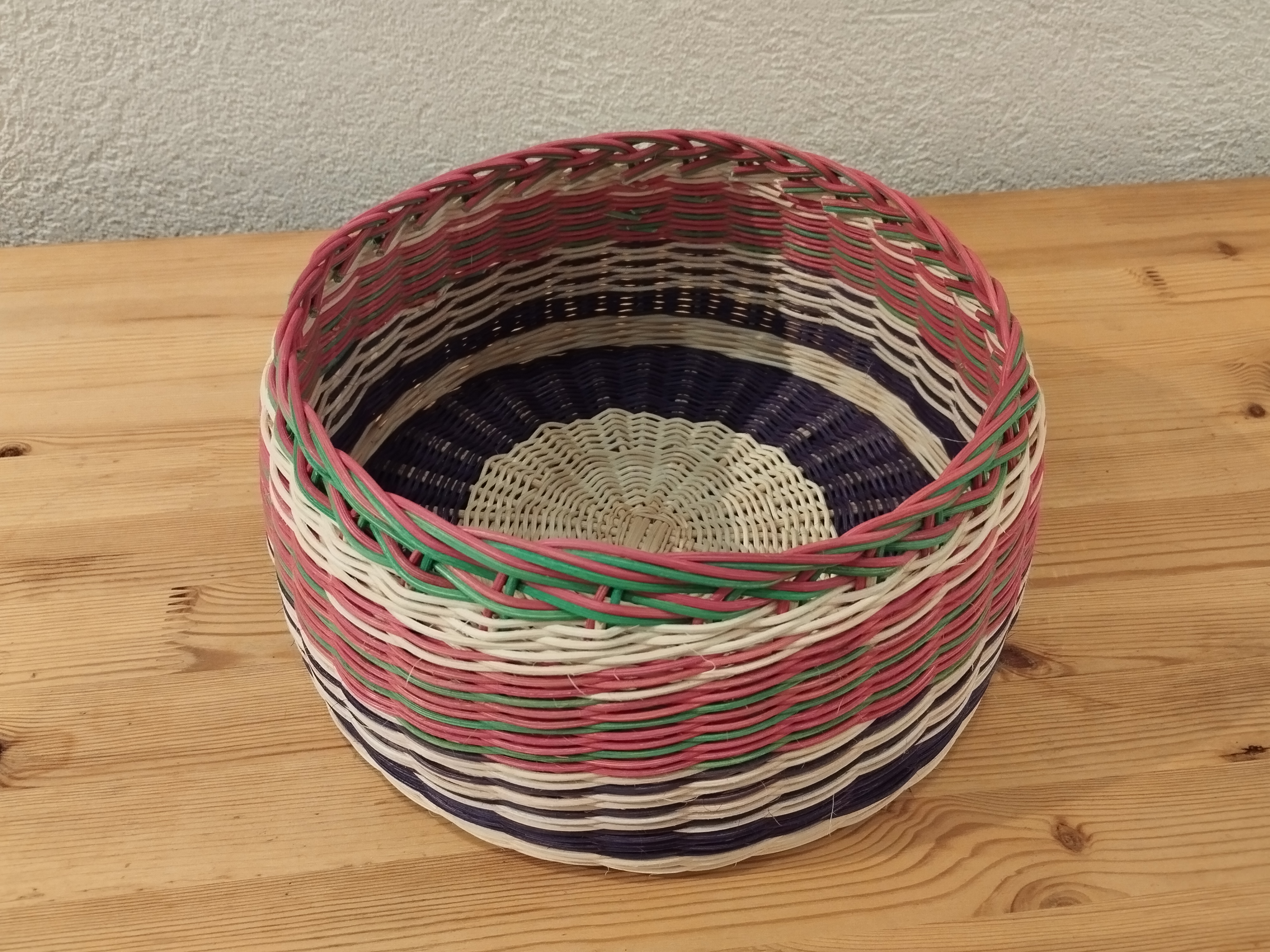 Une corbeille réalisée tout en rotin par Francis. Sur un fond en croisée percée, il a tressé en super et en torche et terminé par une bordure Madère.