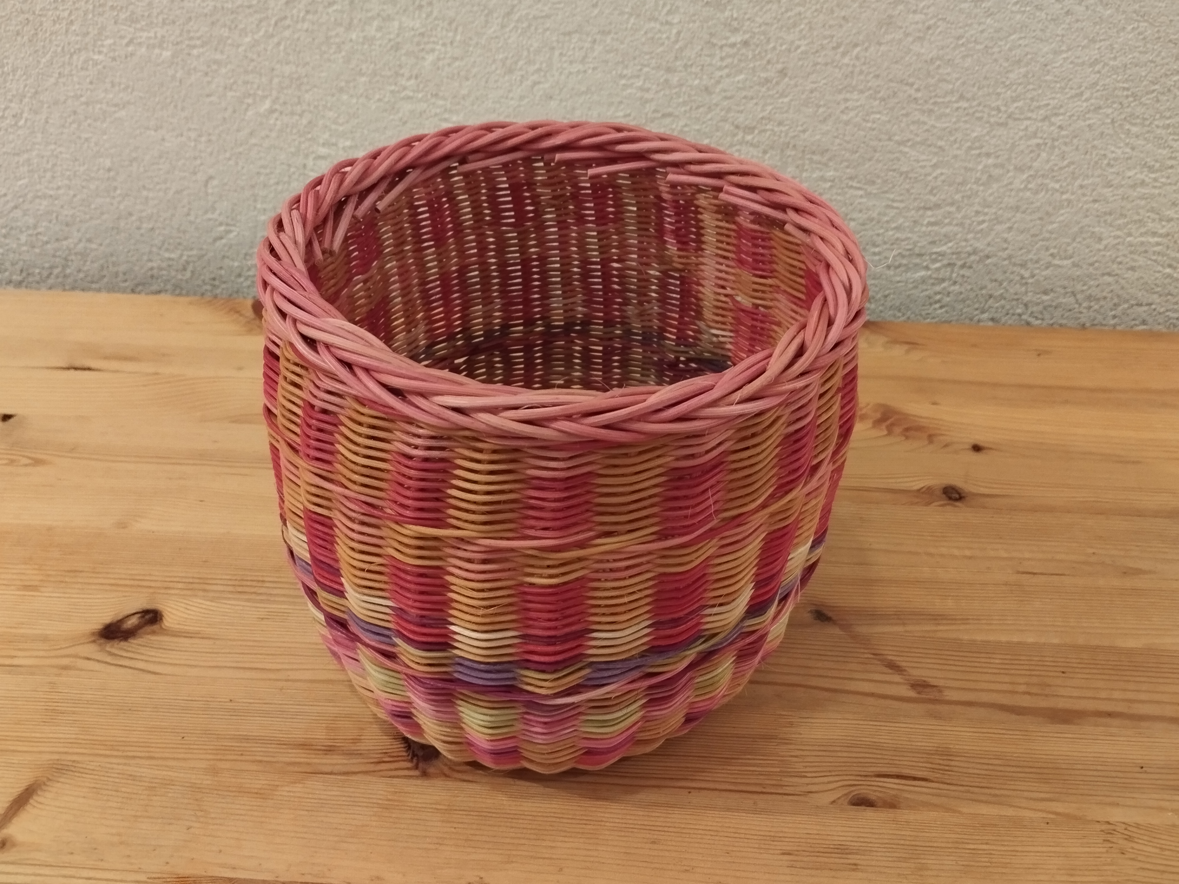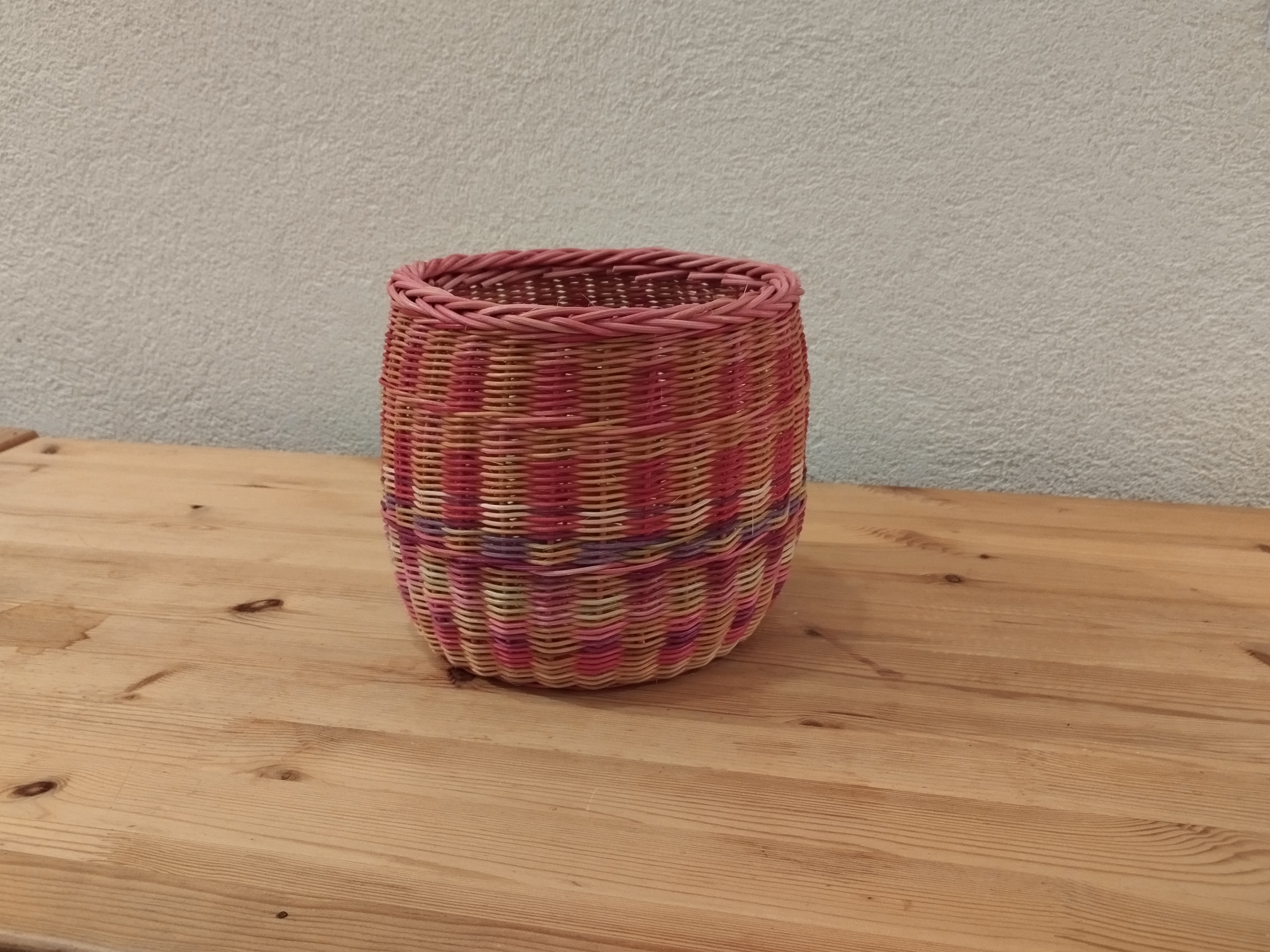 Toute en teintes rosées, cette petite corbeille a été tressée par Béatrice sur un fond en croisée. Elle a ensuite tressé en super et en torche, avec de la moelle de rotin.