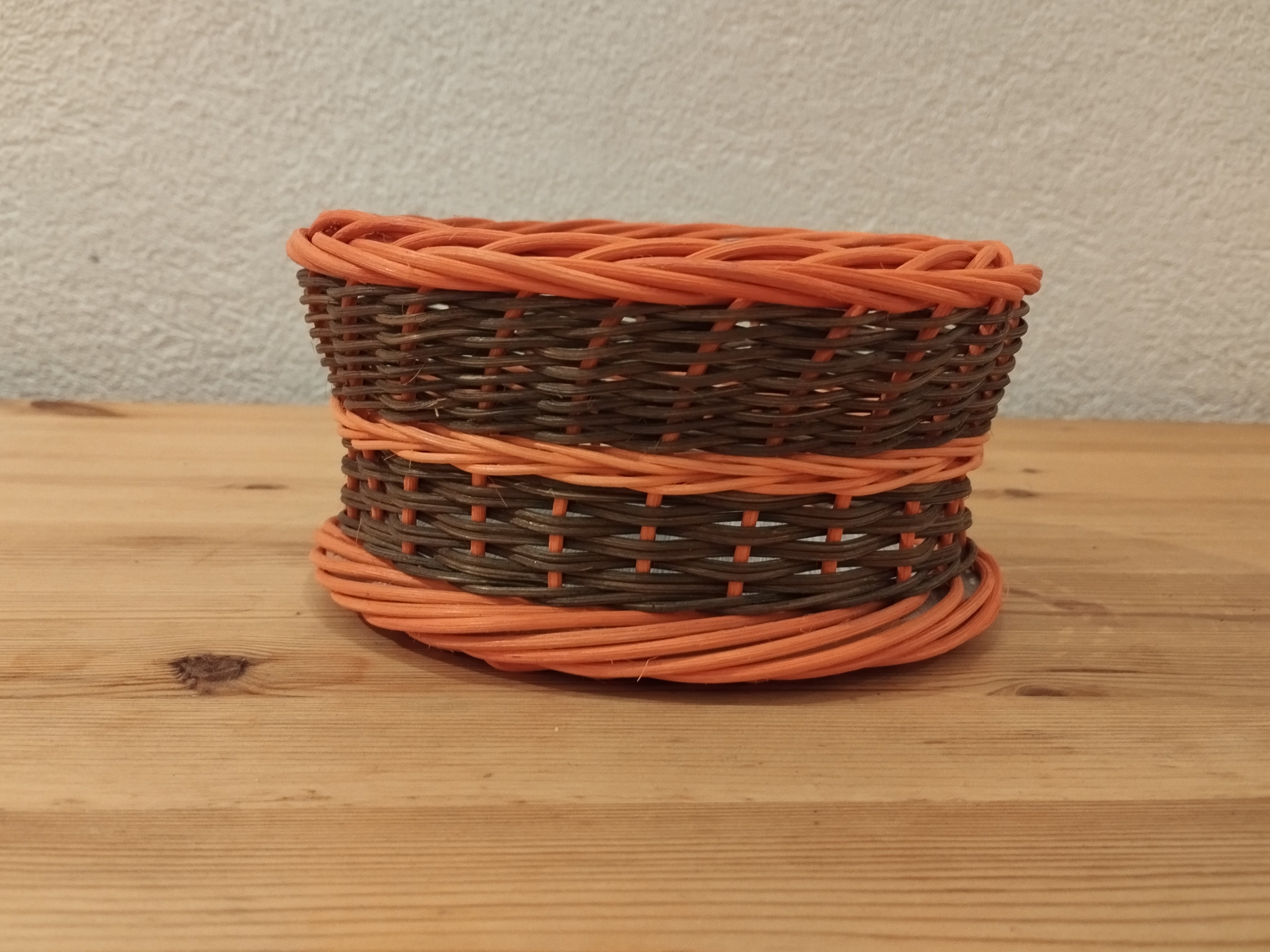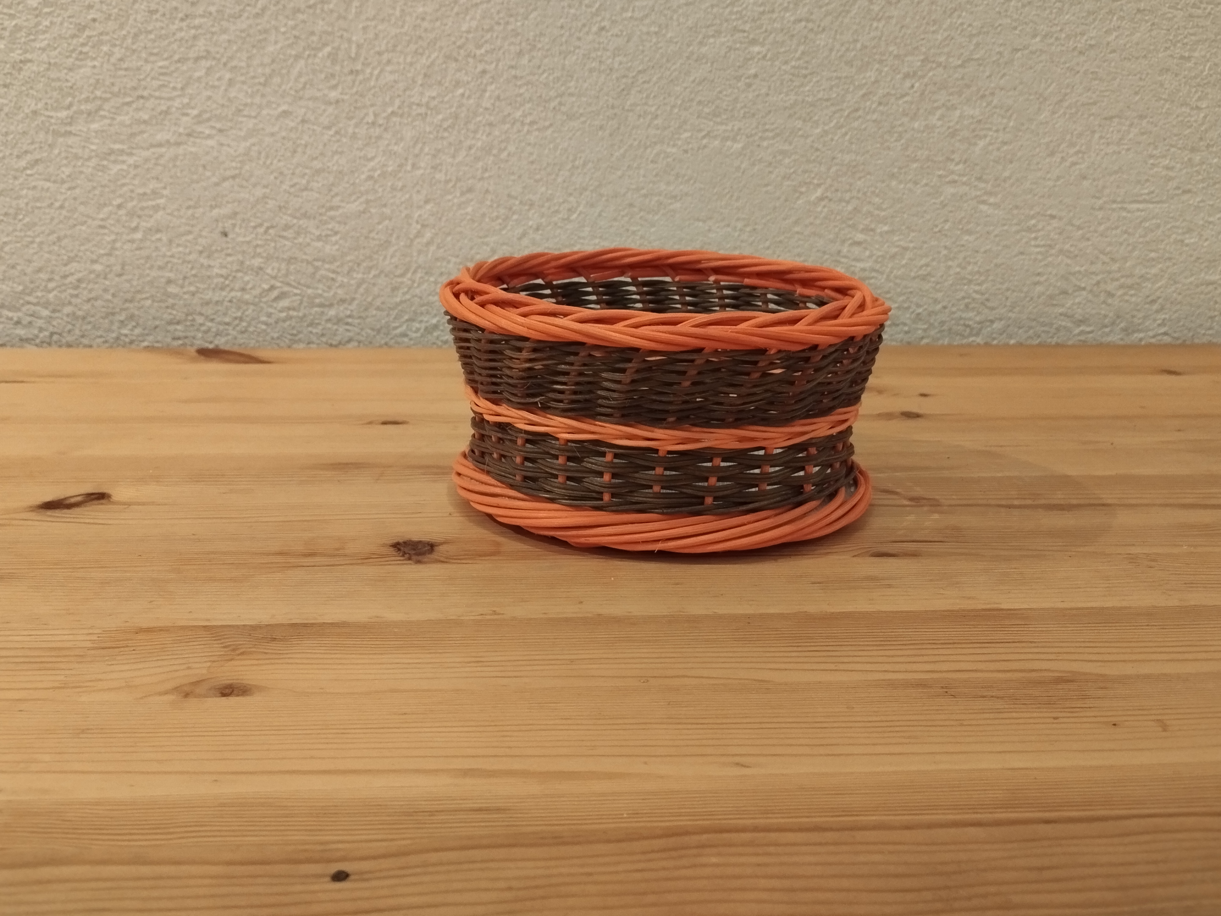 Marie-Alix continue sa série de petite corbeille. Sur un fond en bois, elle tresse avec de la moelle de rotin en super et insère une fleur de lys à mi-hauteur.