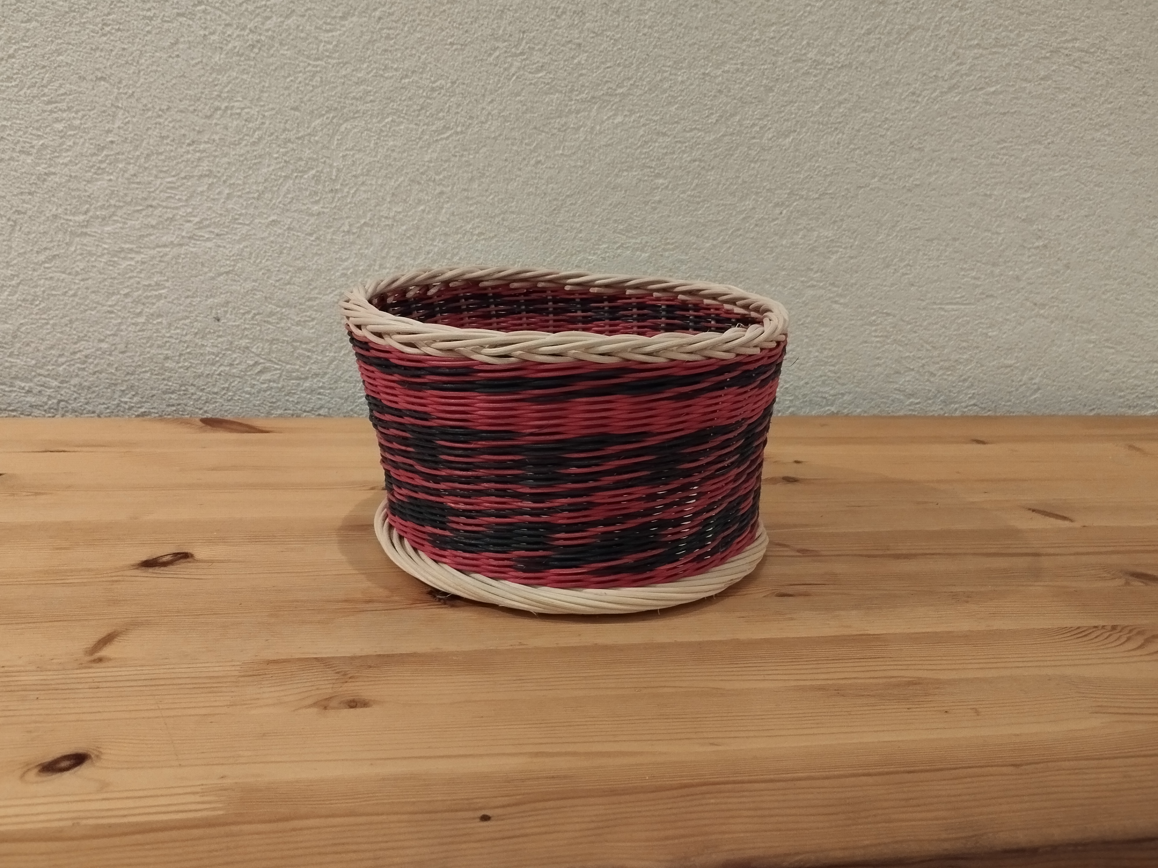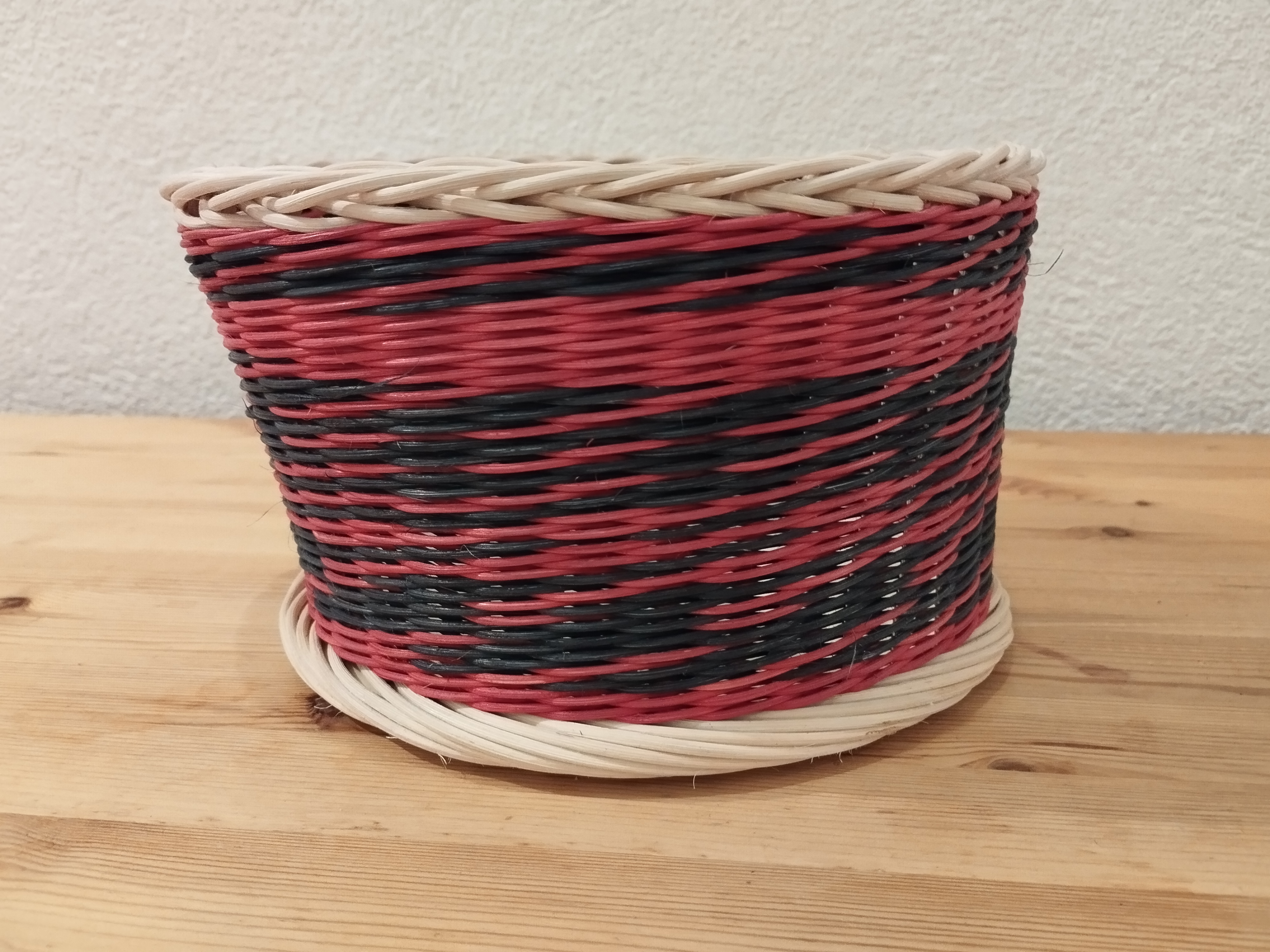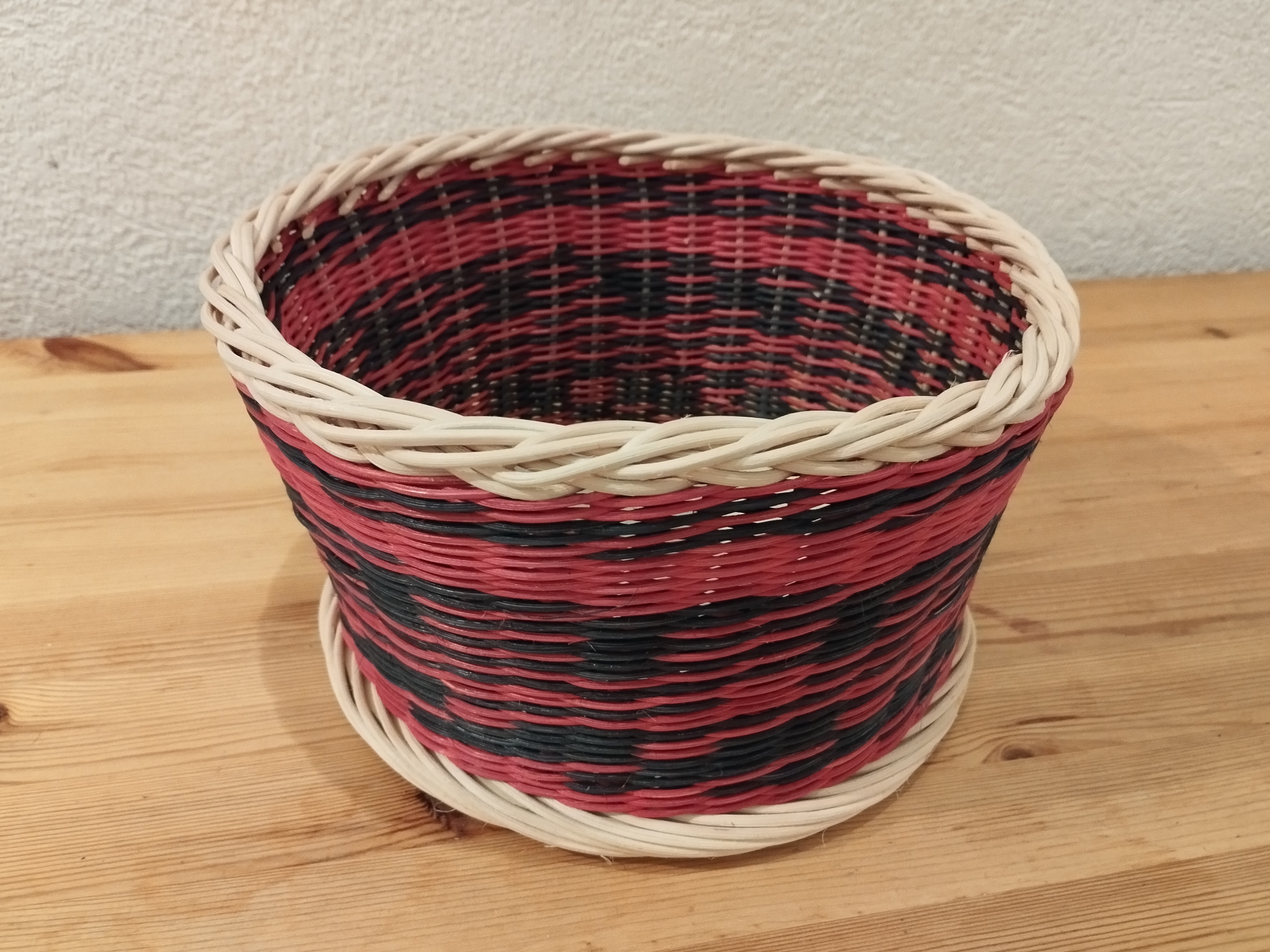 Sur un fond en bois, Claude a réalisé cette corbeille en moelle de rotin. Il a tressé en torche et varié la couleur au gré des changements de brins.
