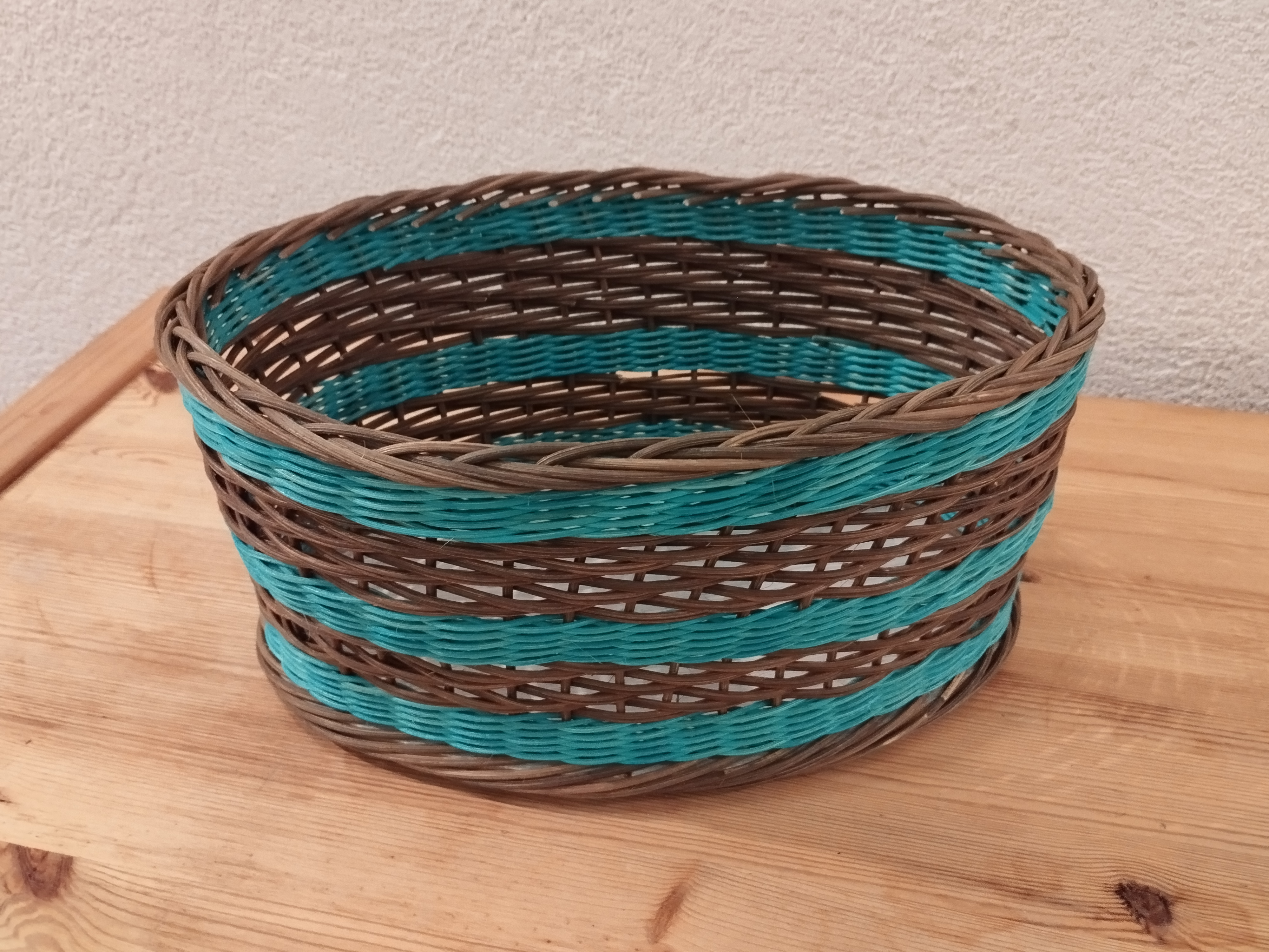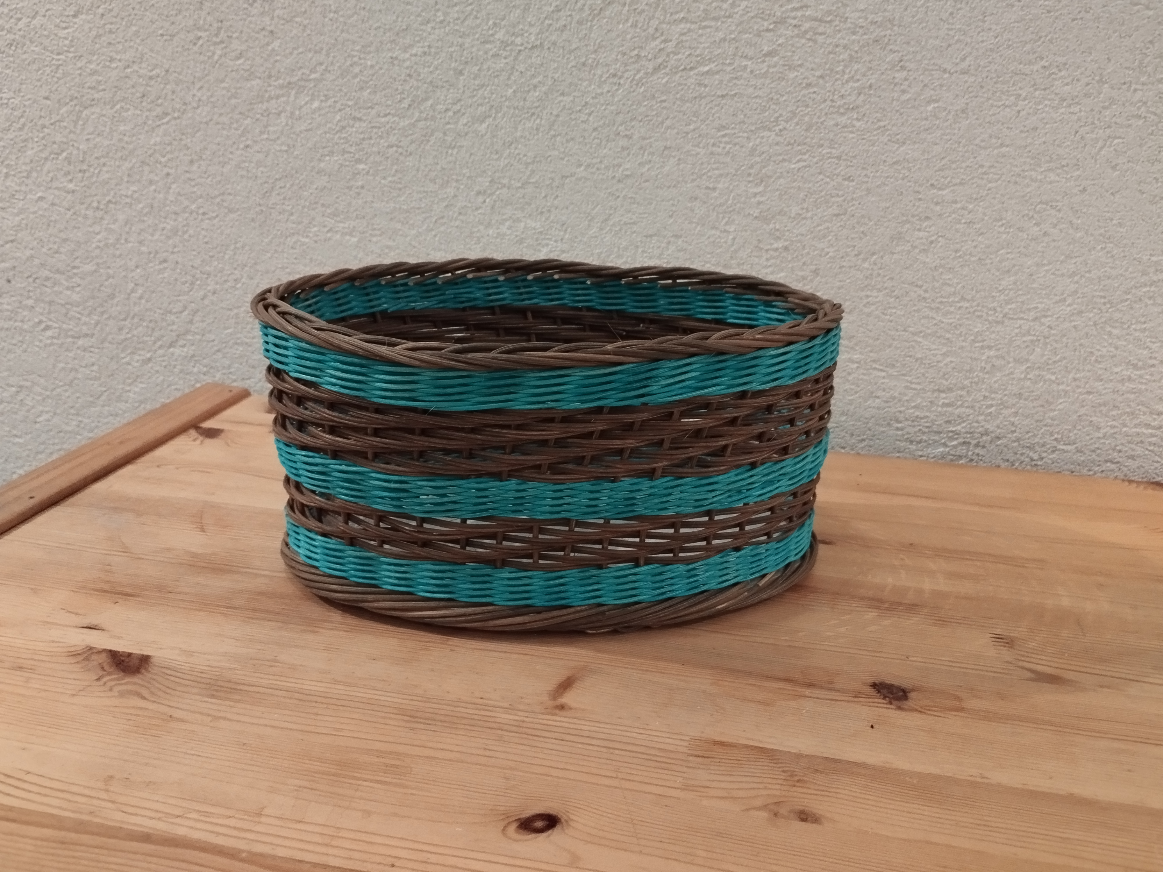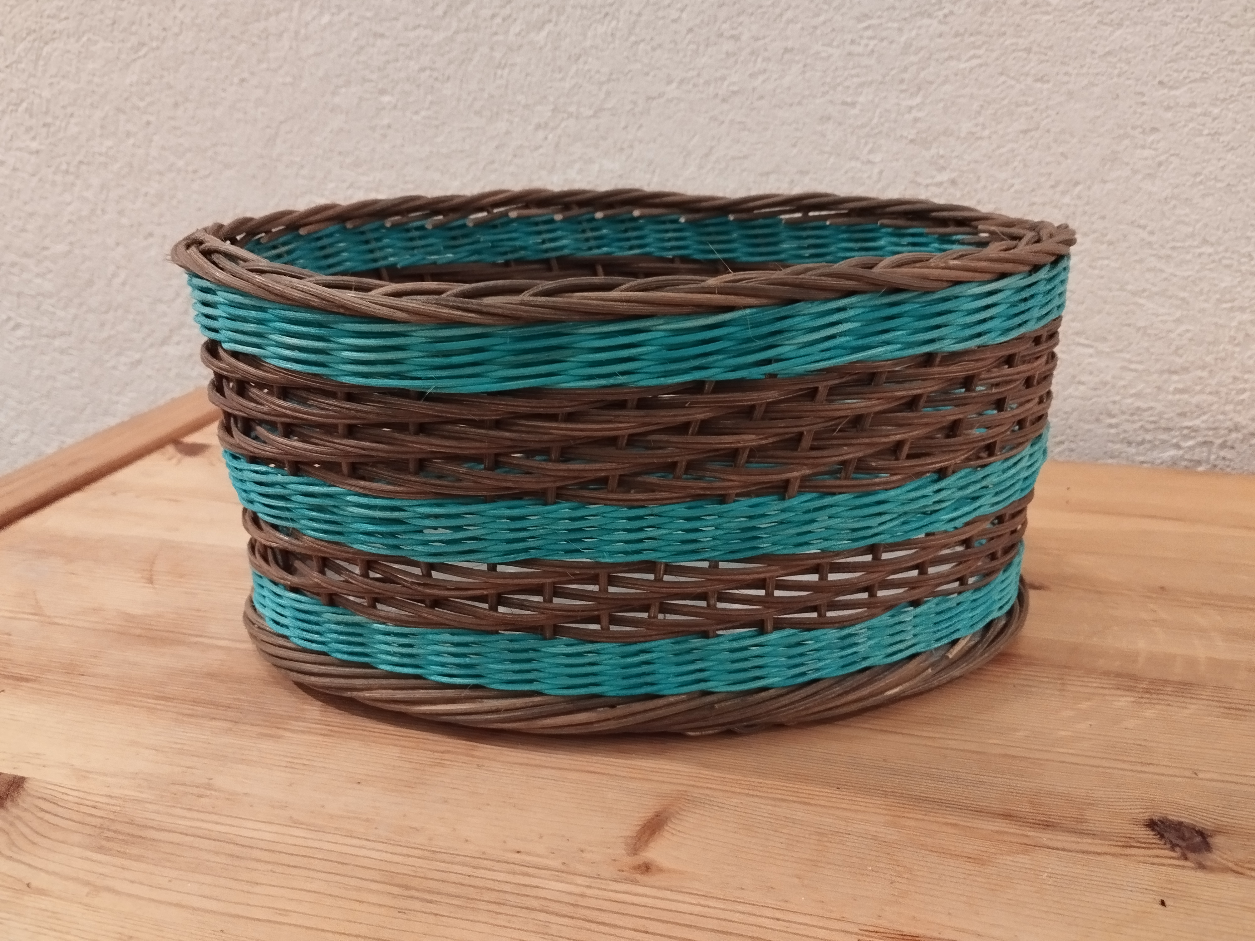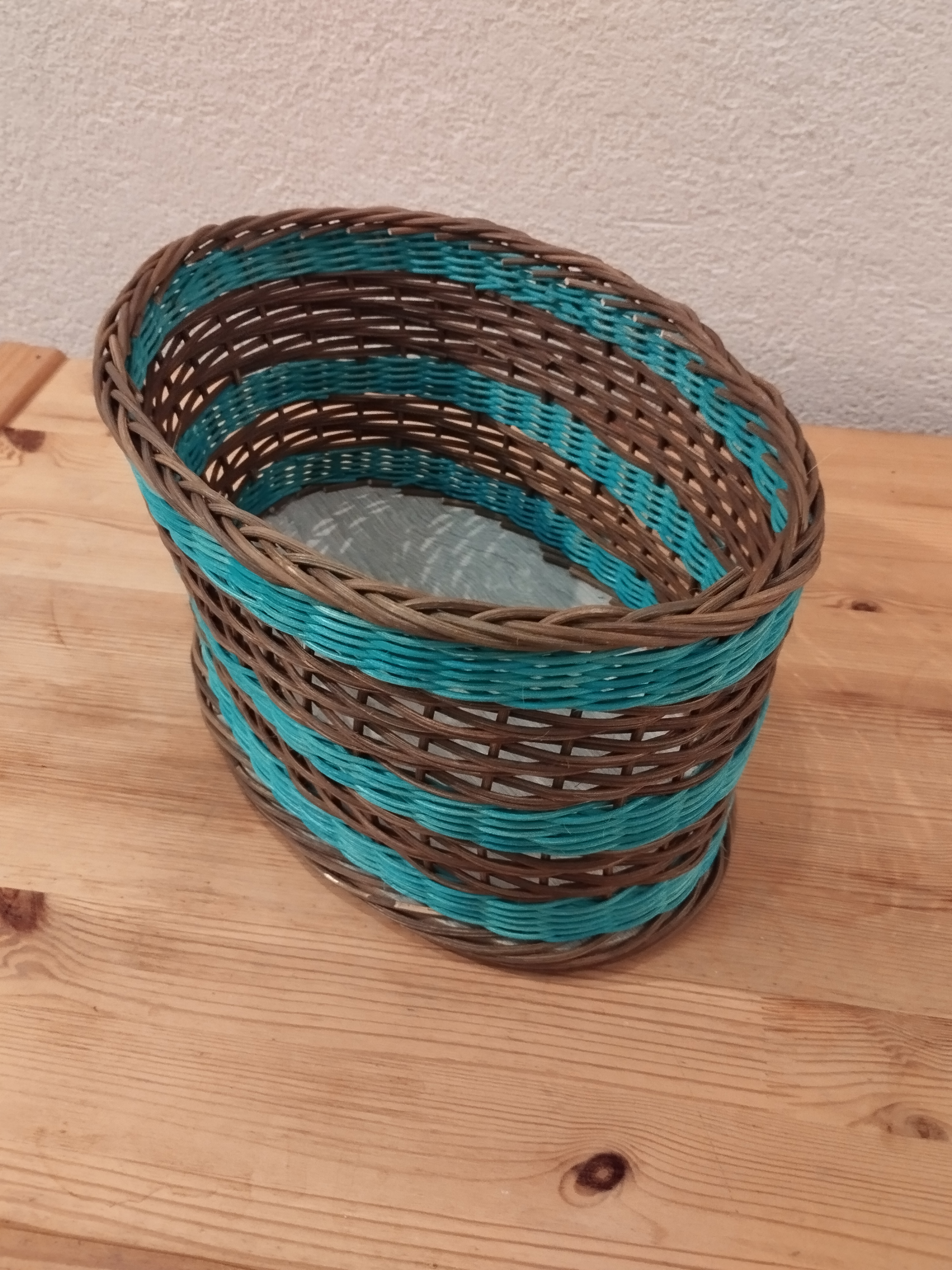 Pascale a réalisé cette jolie corbeille sur un fond en stratifié. Elle a tressé en torche et en planchette avec de la moelle de rotin.
