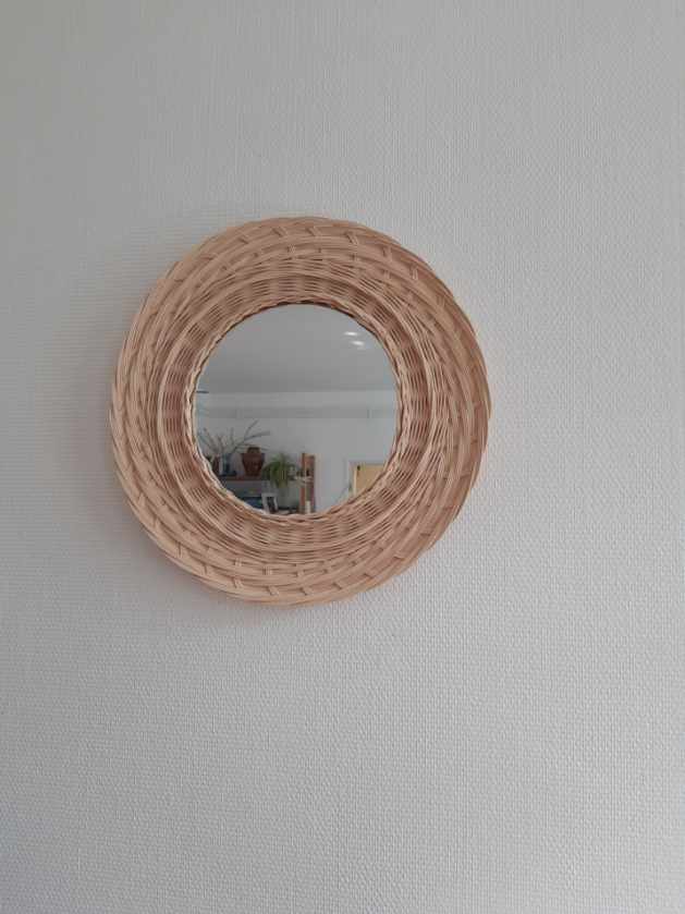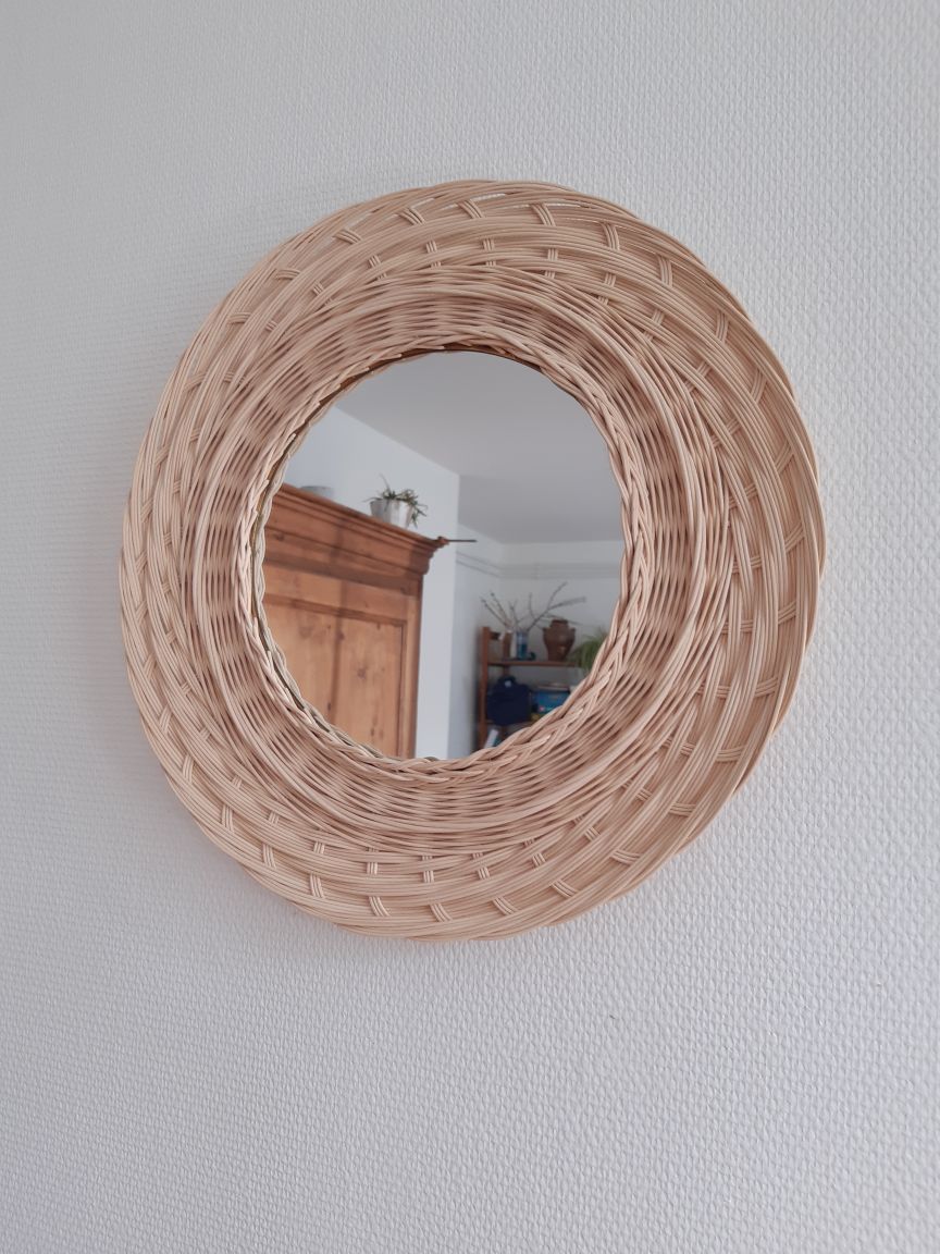 Laura a tressé ce miroir tout en moelle de rotin naturel. Elle a utilisé plusieurs points de vannerie : super, torche, bordure madère, …