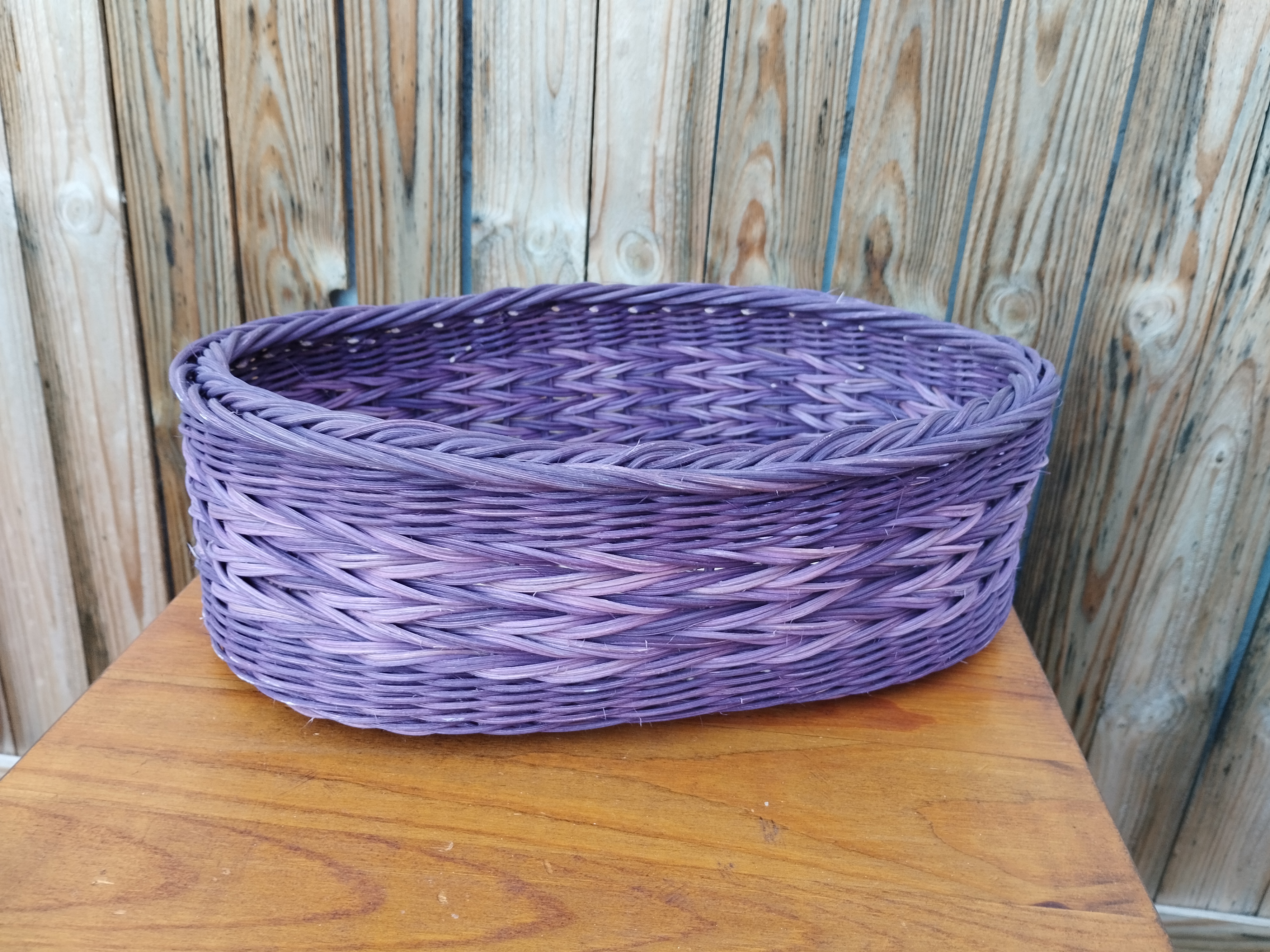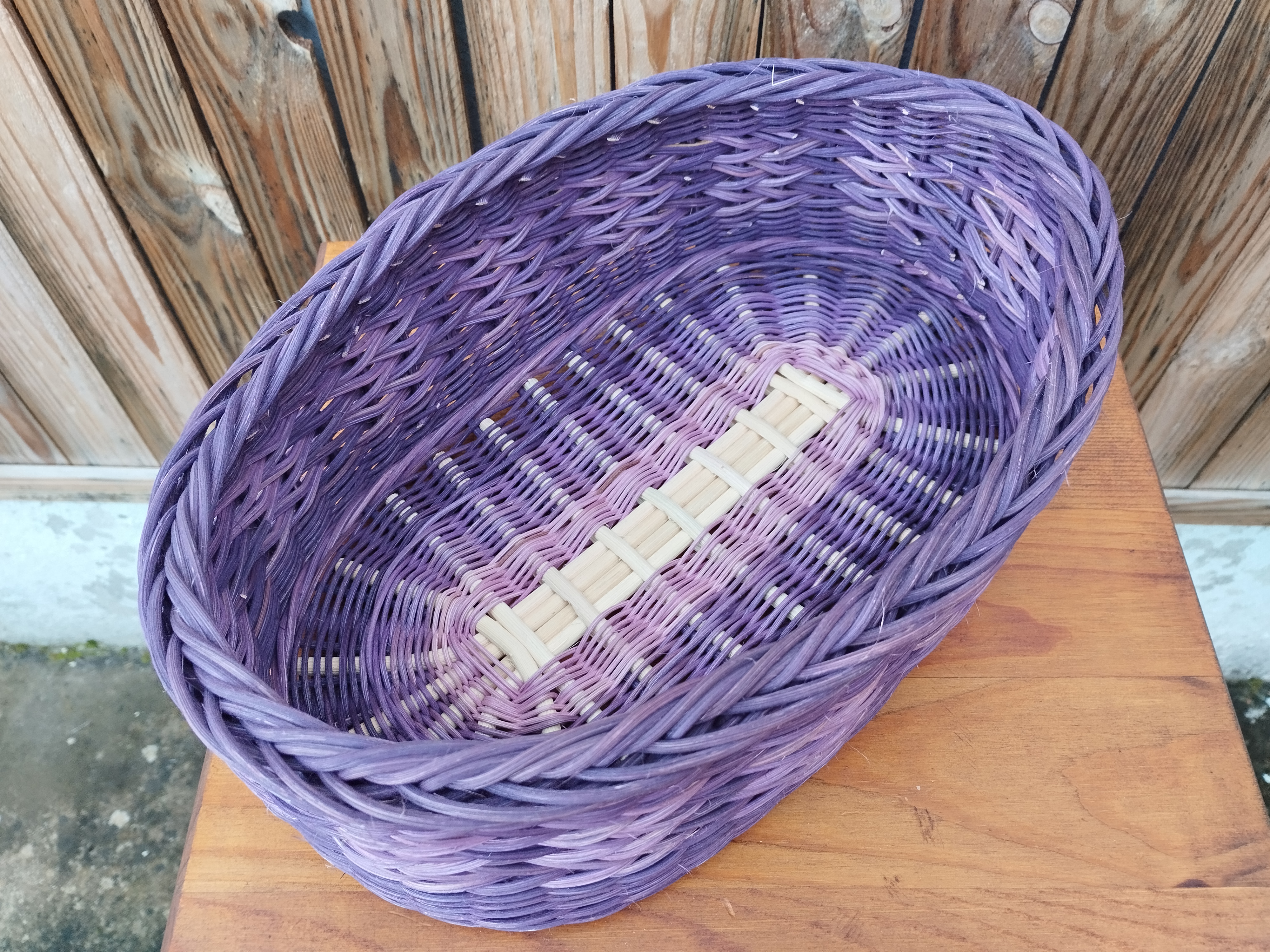Cette corbeille ovale est réalisée avec différentes nuances de moelle de rotin mauve et violet. La clôture est tressée en torche et fleur de lys.