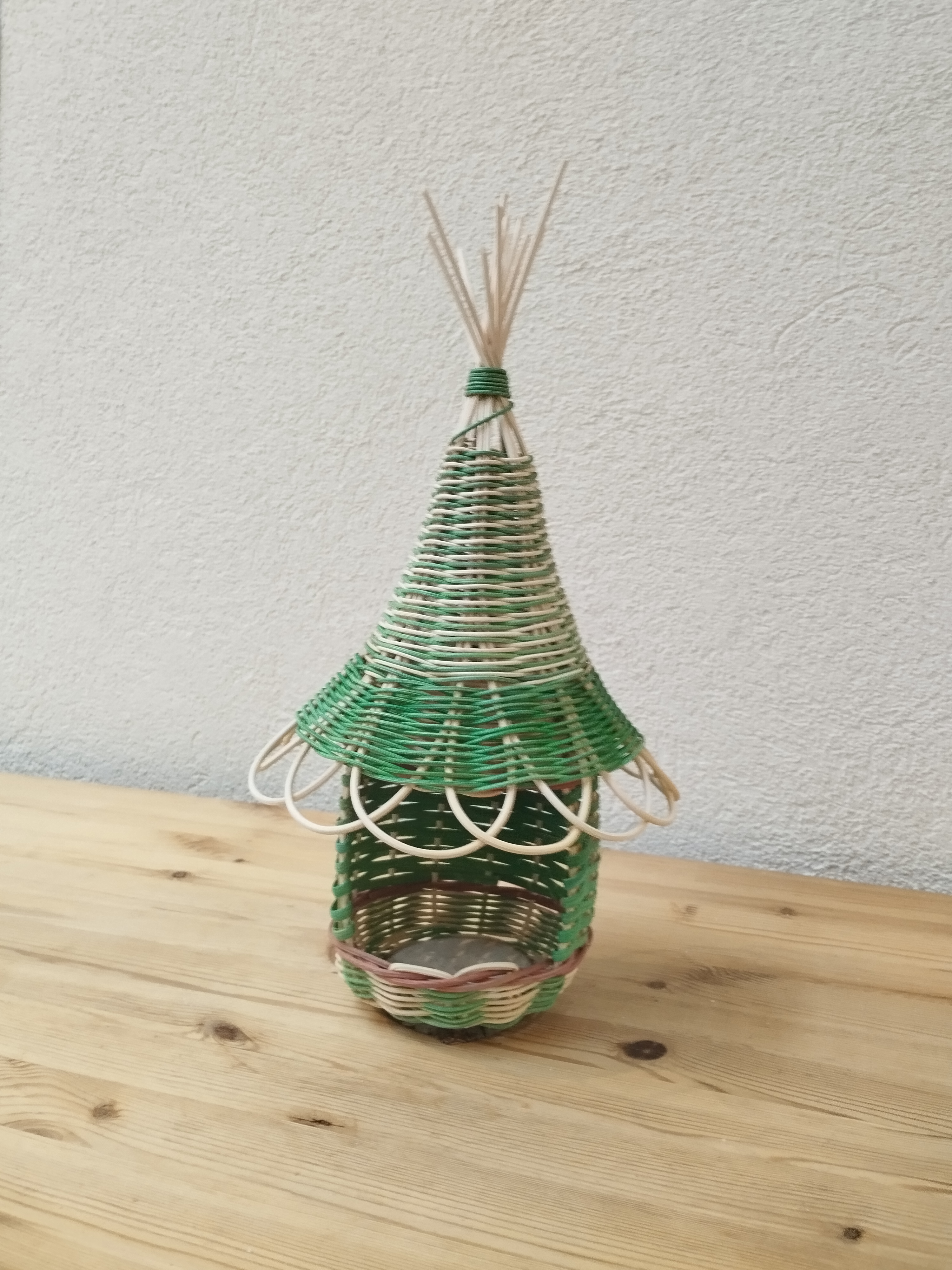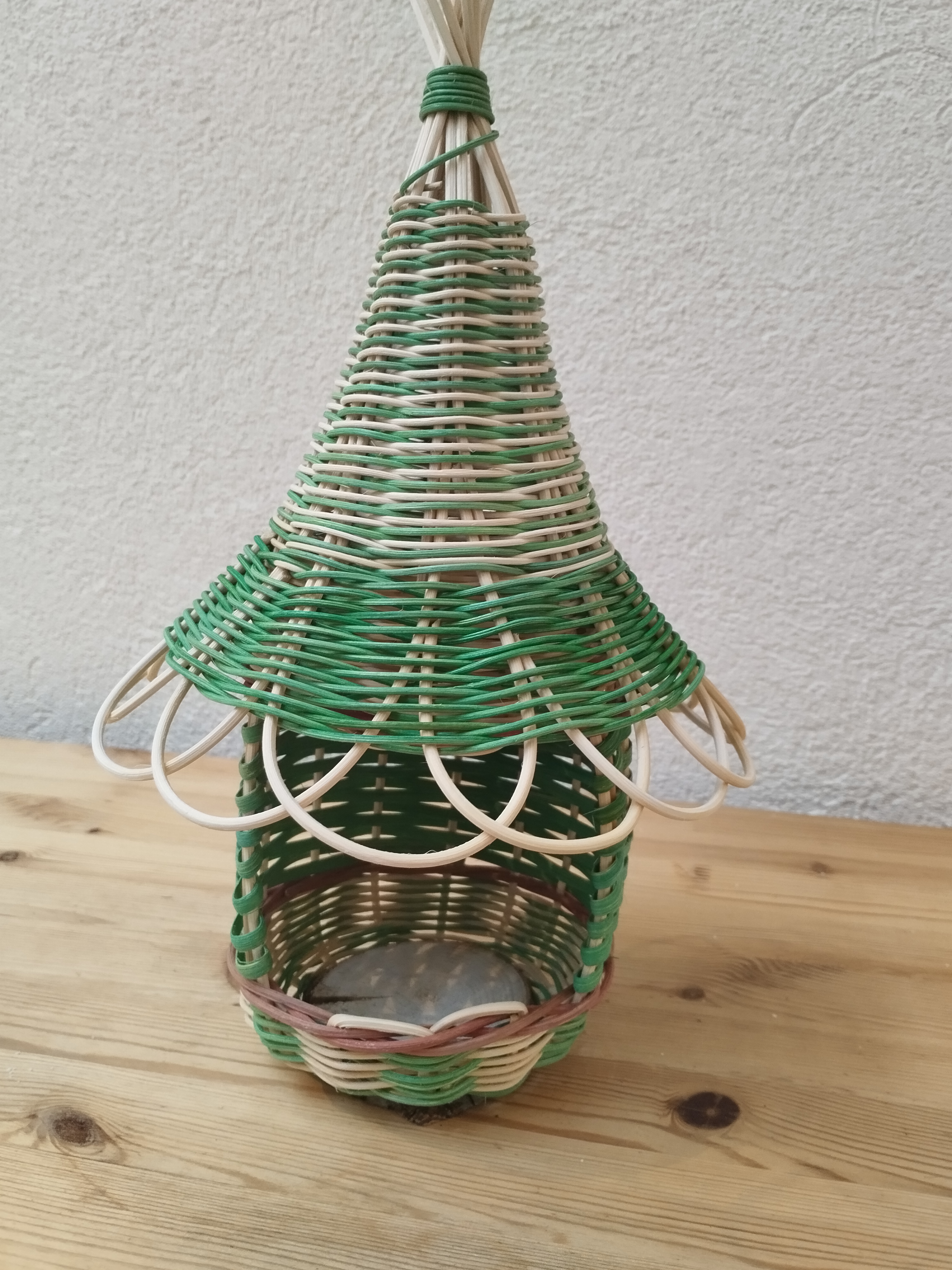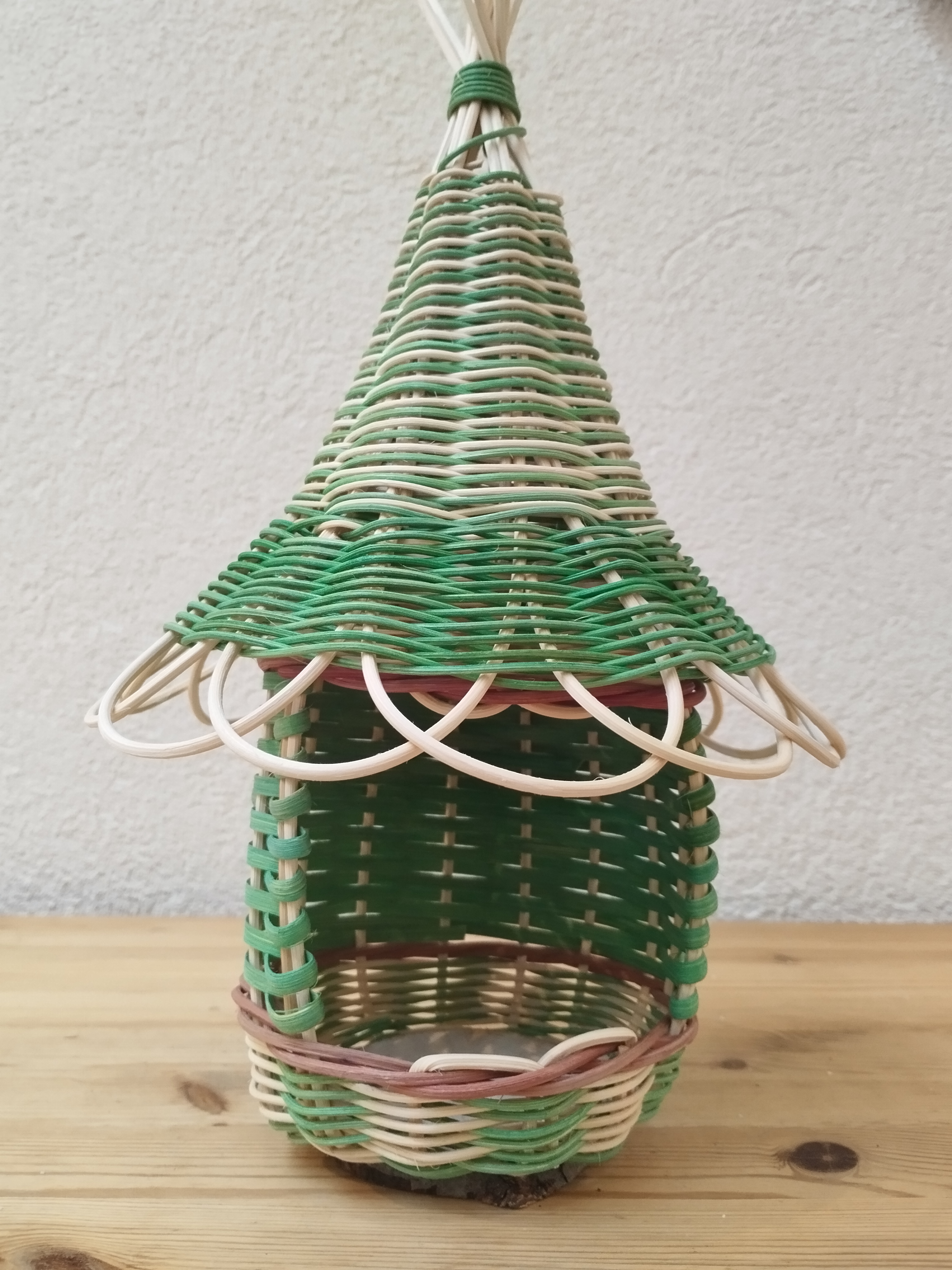 Nous poursuivons la série de mangeoire à oiseaux. Pascale l’a réalisée sur la base d’une rondelle en bois en associant moelle et éclisse de rotin.