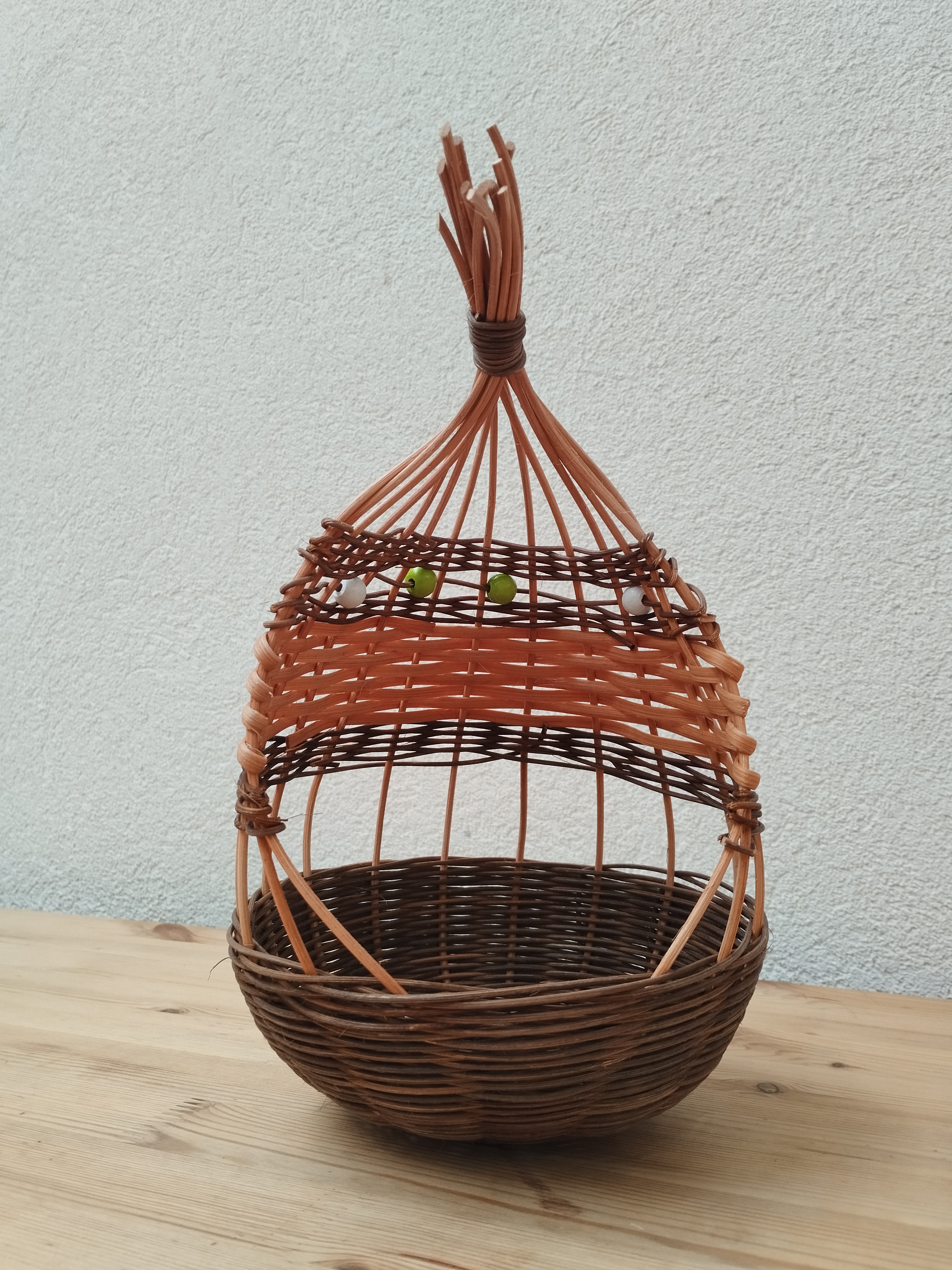 Sur le modèle des mangeoires à oiseaux, Nelly a tressé cette jolie corbeille en moelle et éclisse de rotin, avec pour base une rondelle de bois.