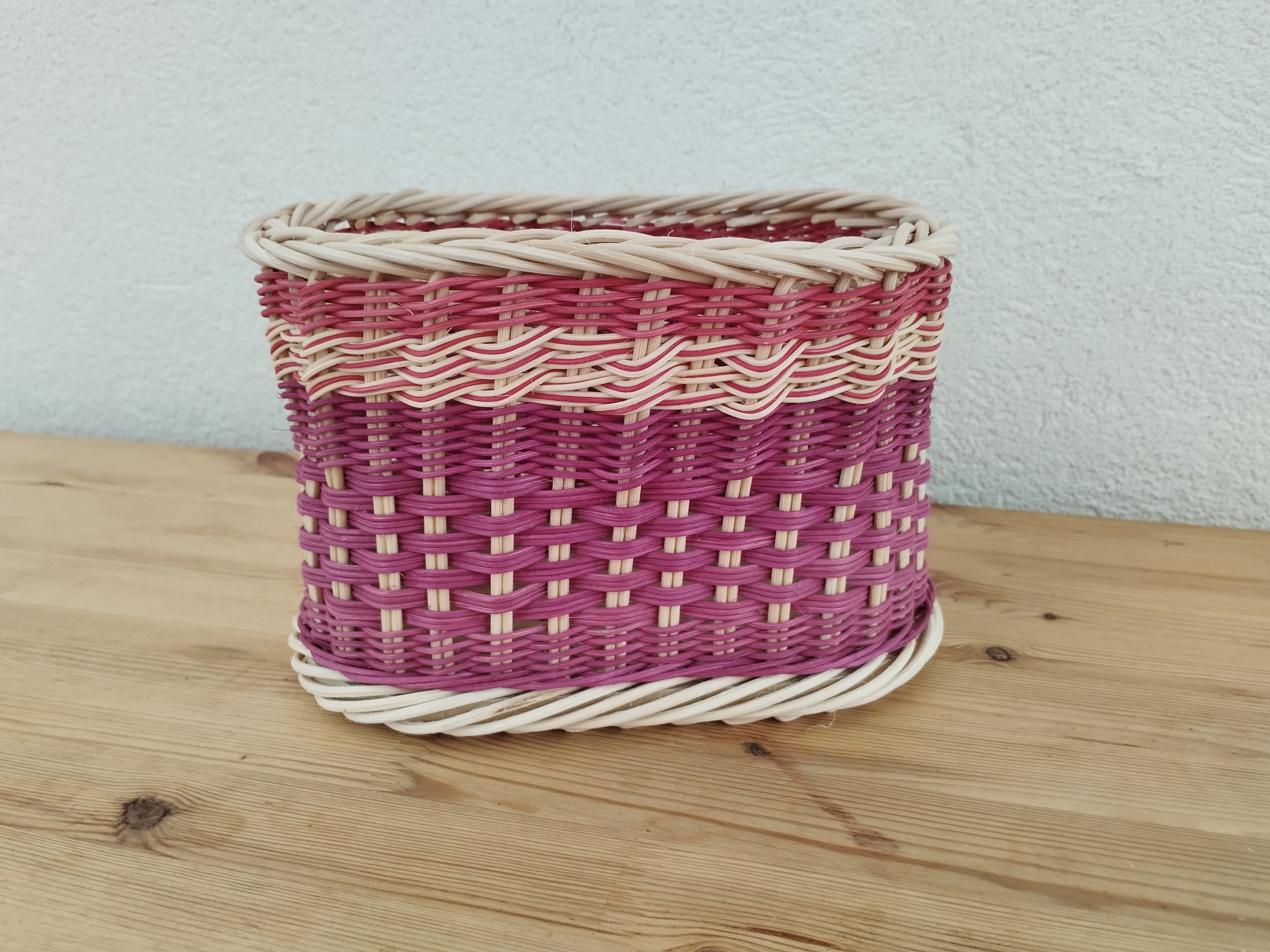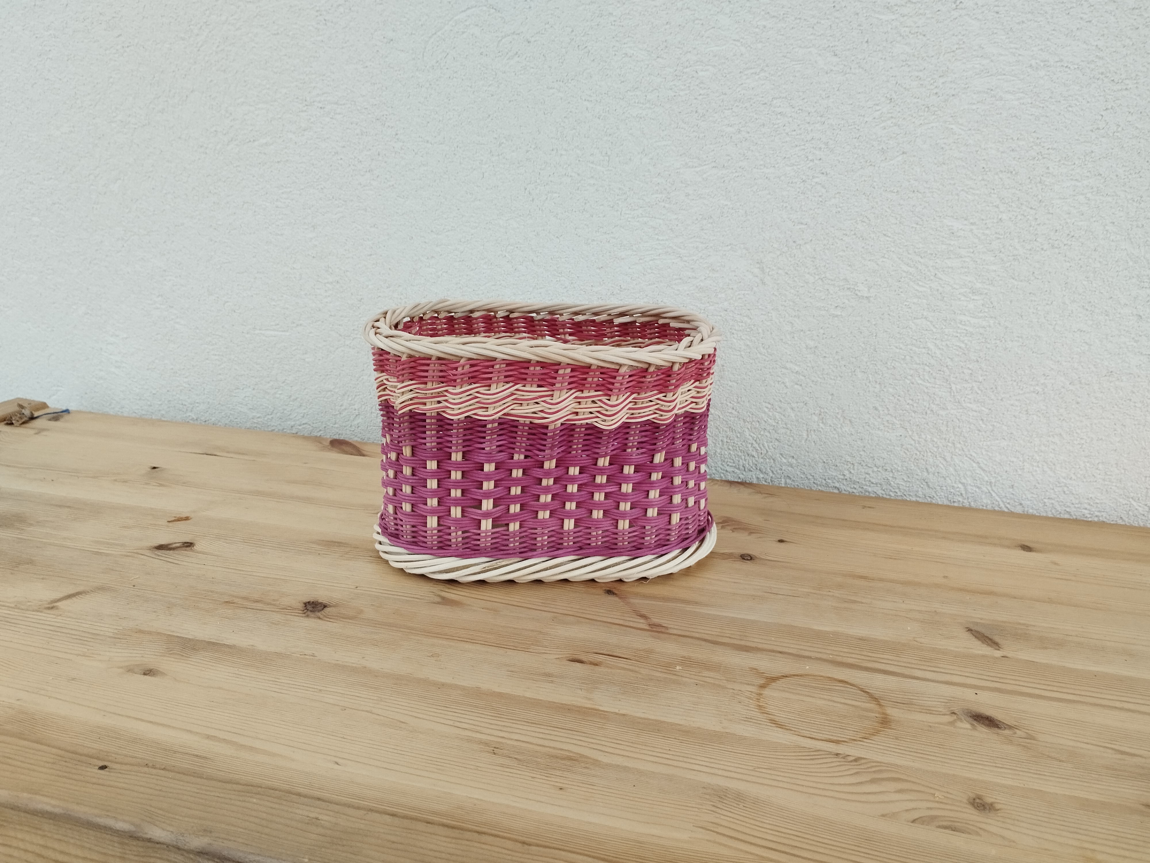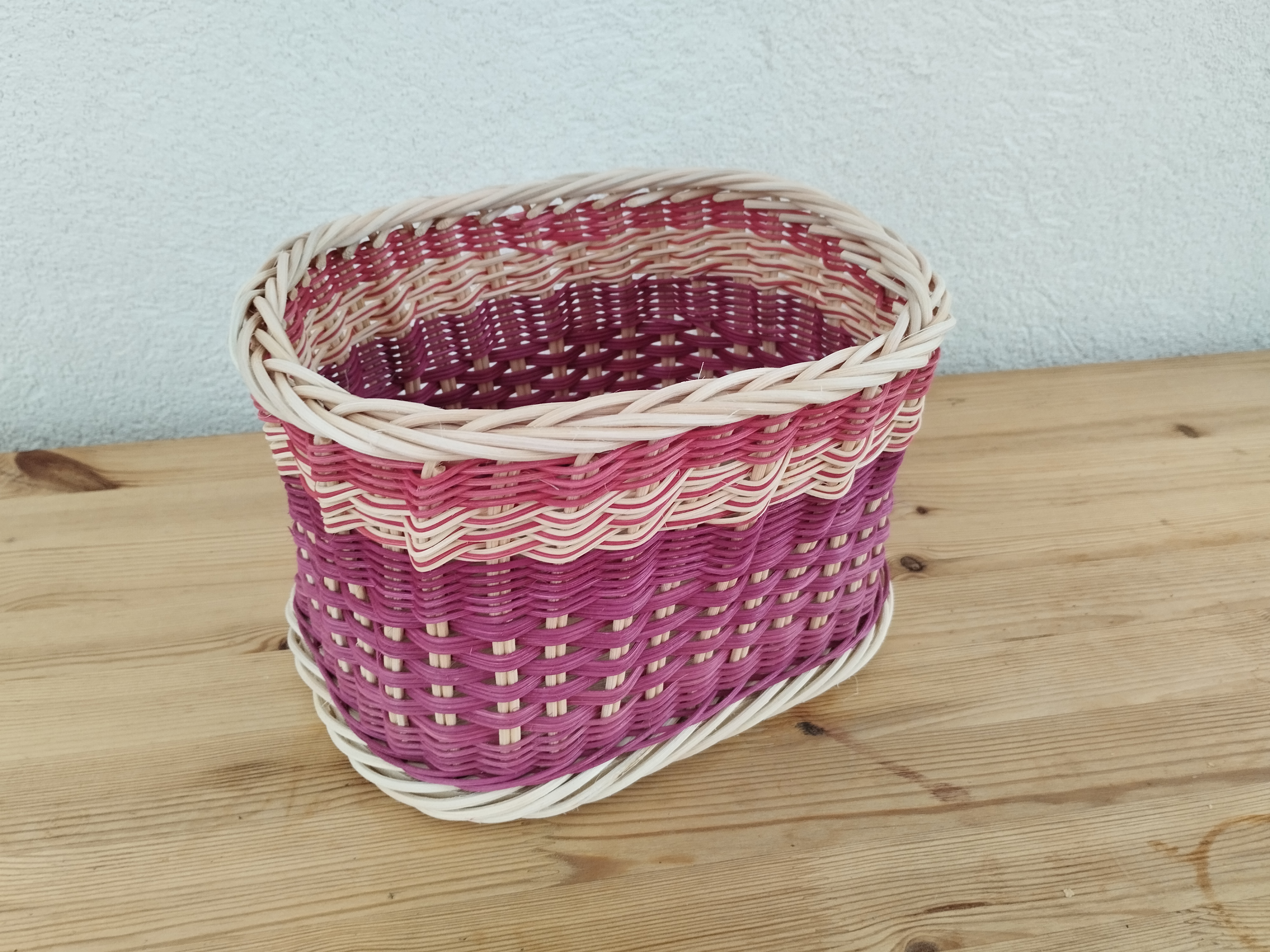 Sur un fond en bois, Nelly a réalisé cette corbeille haute. Elle a tressé en super et en planchettes avec de l’éclisse de rotin.