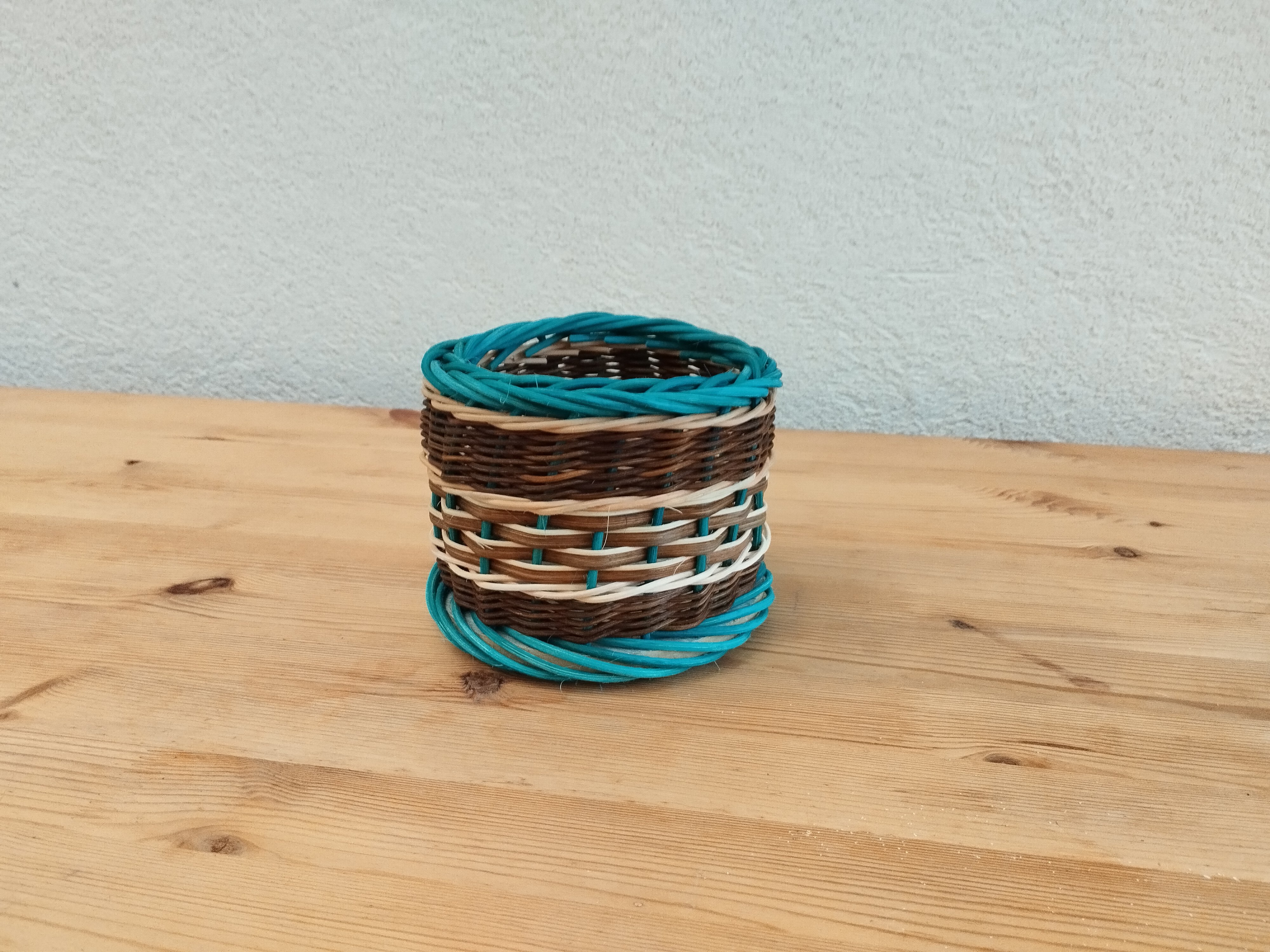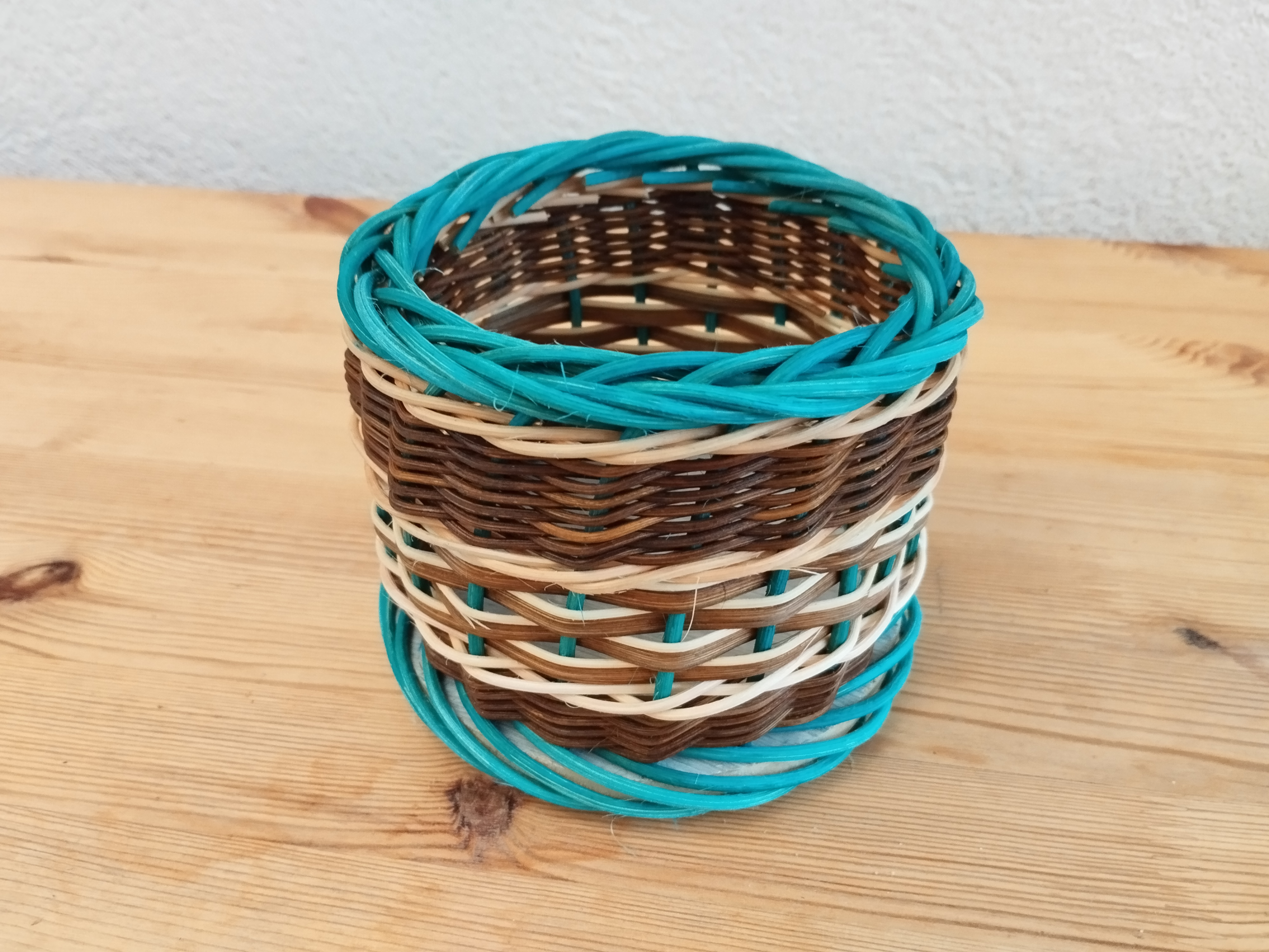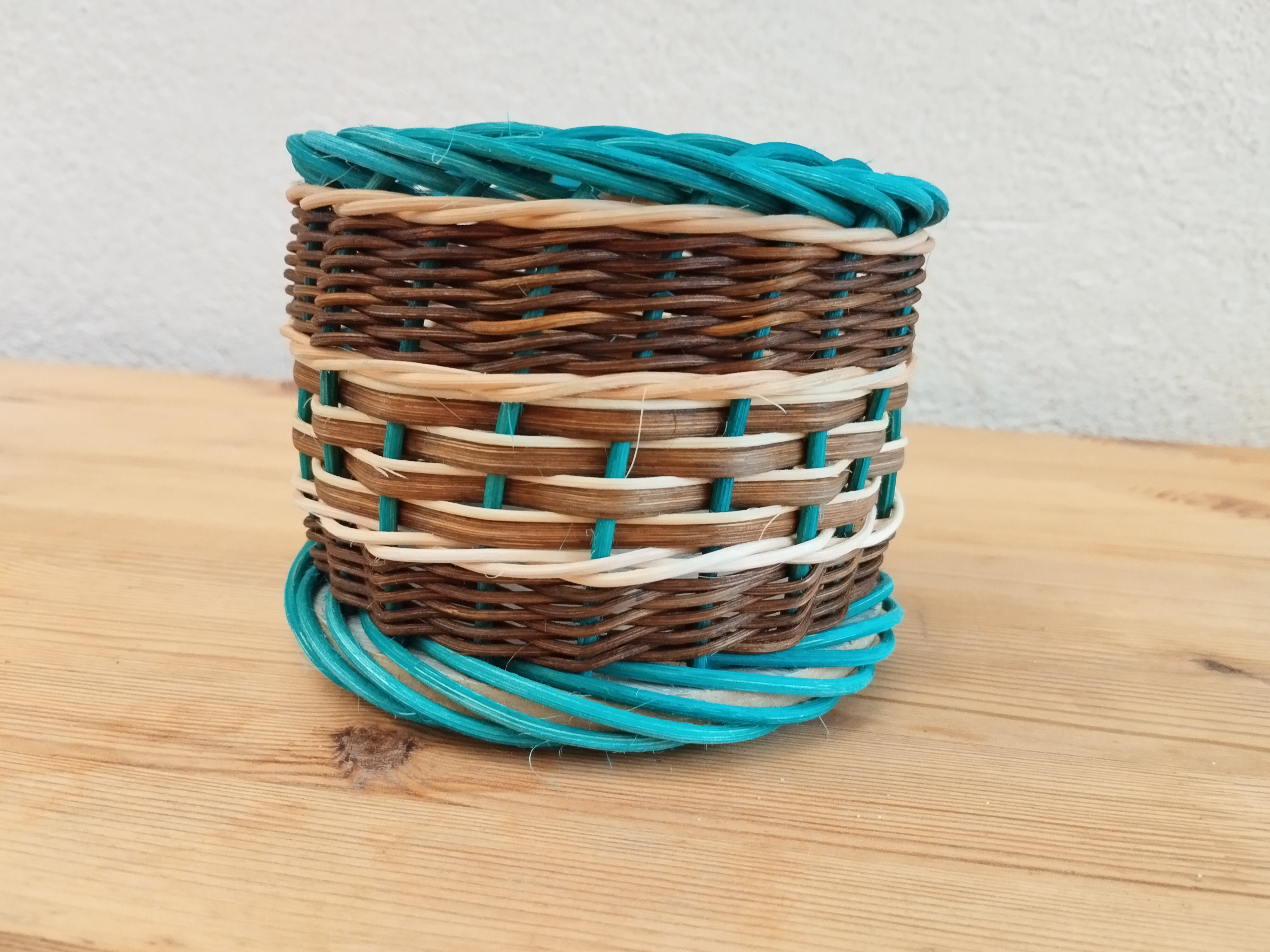 Pour sa première séance de vannerie, Bernard a réalisé cette petite corbeille. Il a tressé en super et en torche avec de la moelle et de l’éclisse de rotin sur un fond en bois.