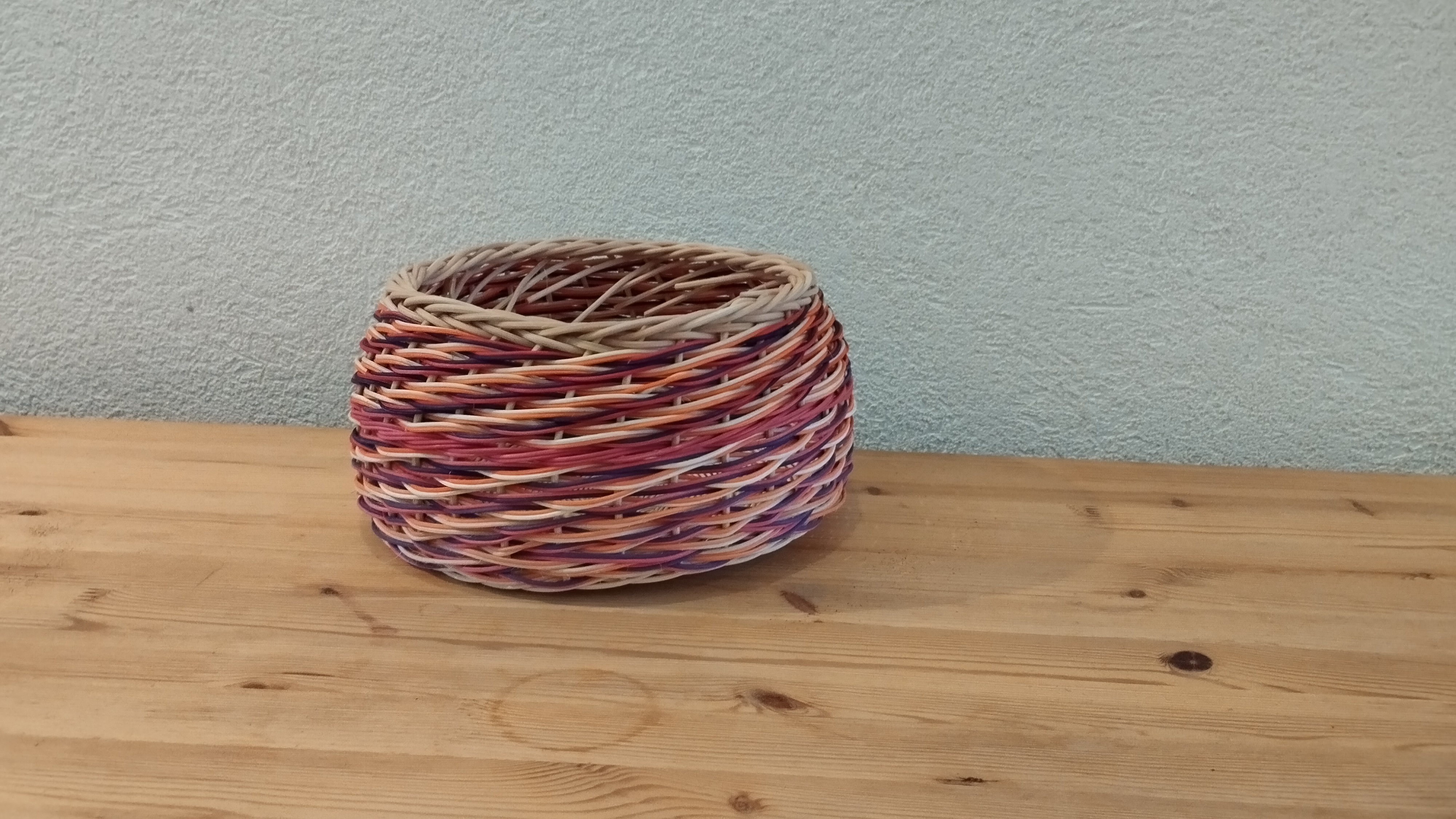 Deuxième corbeille de la série de trois que Nicole projette de réaliser, faite tout en moelle de rotin. La troisième et dernière est déjà en cours.