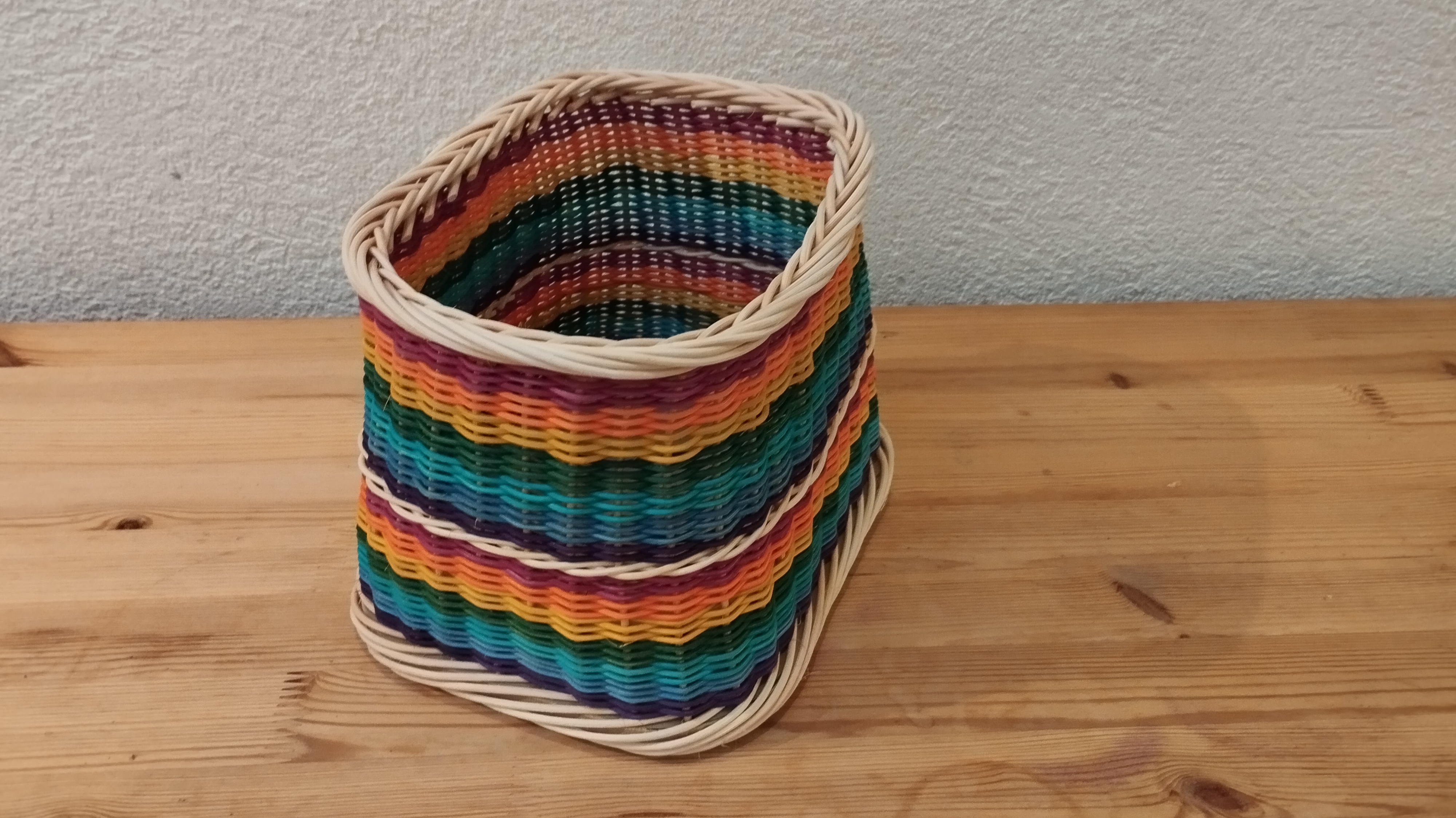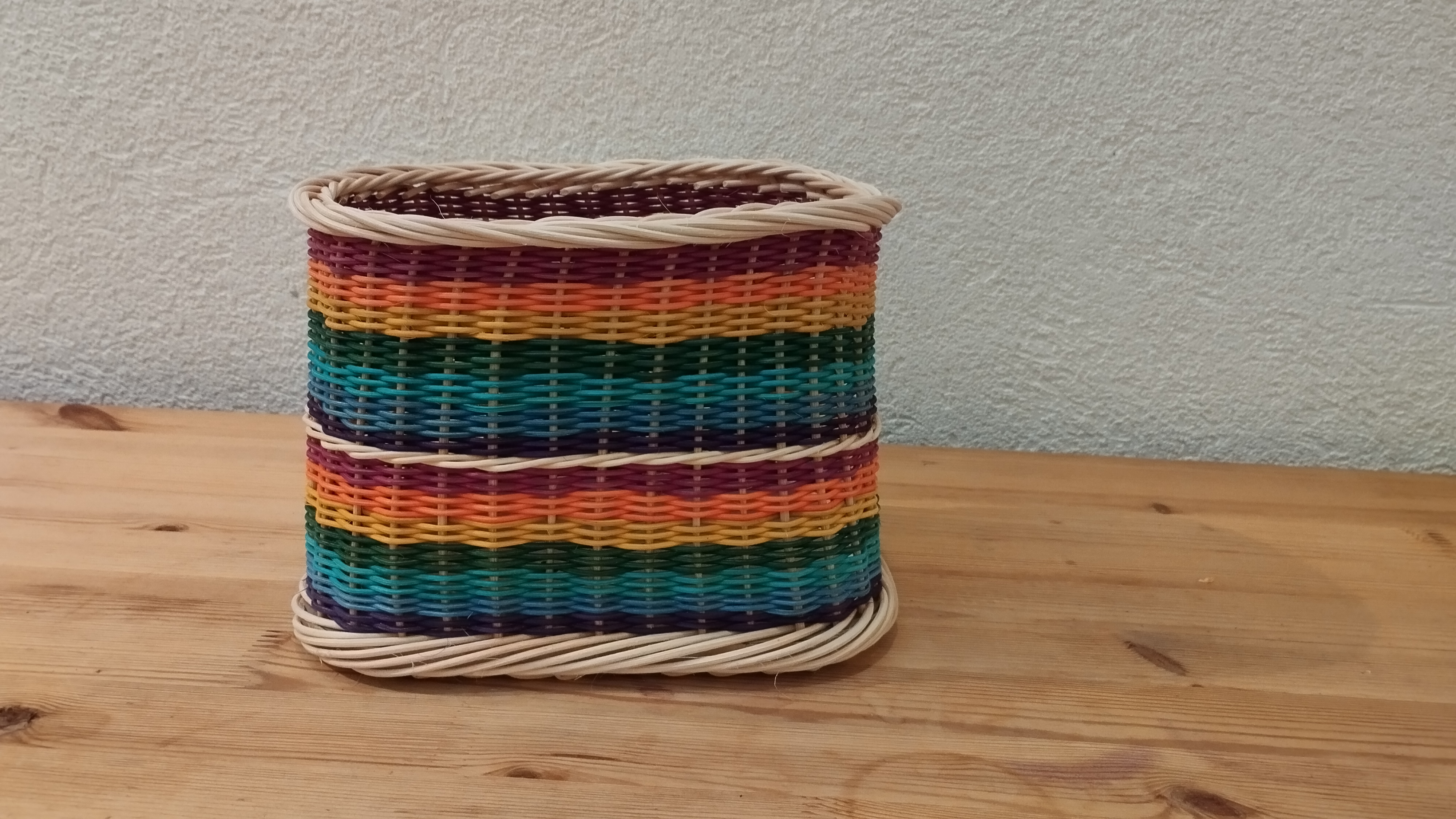 Sur un fond en bois, Béatrice a tressé cette petite corbeille en brins suivis avec de la moelle de rotin et a décoré d’un cordon blanc.