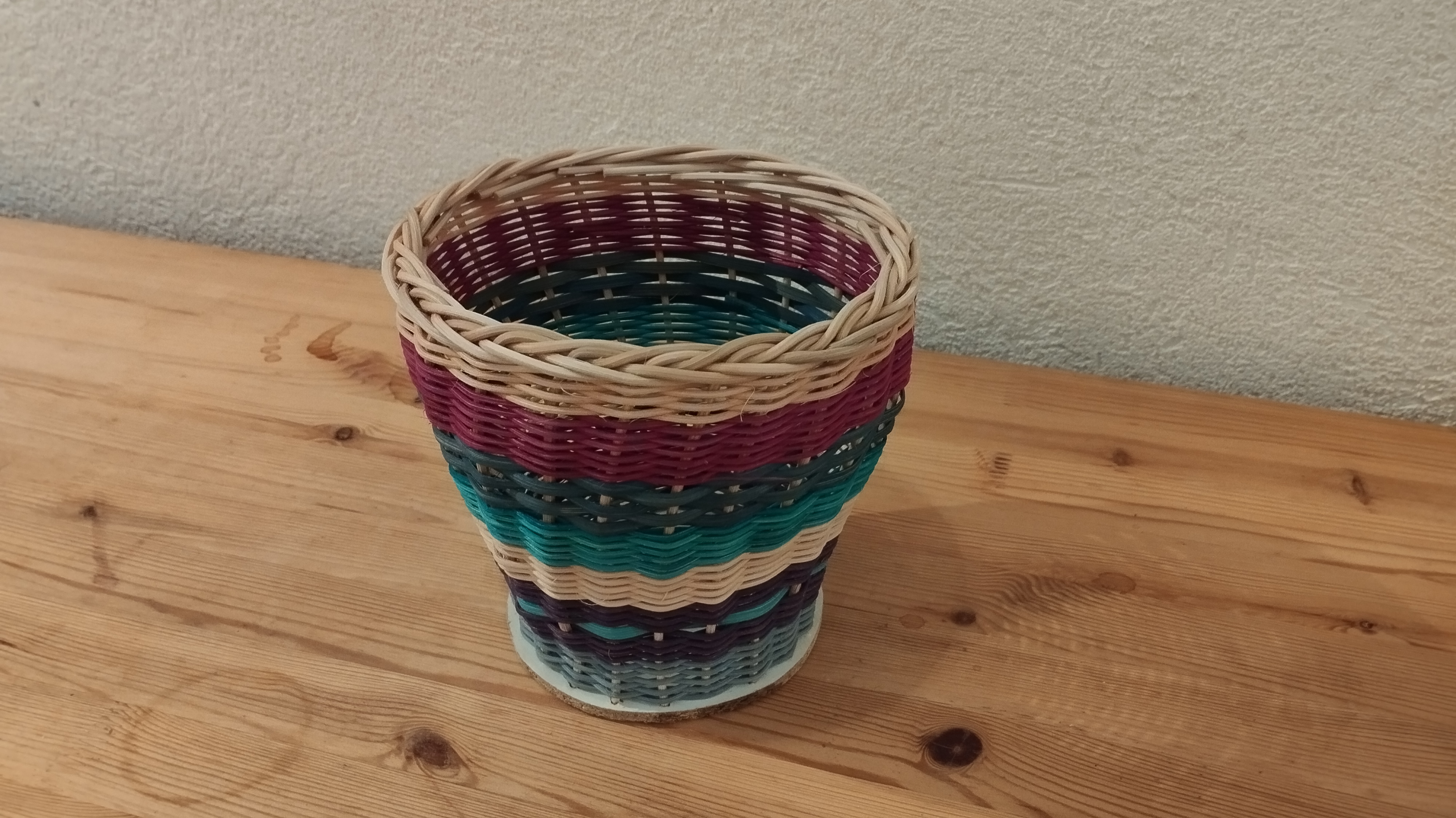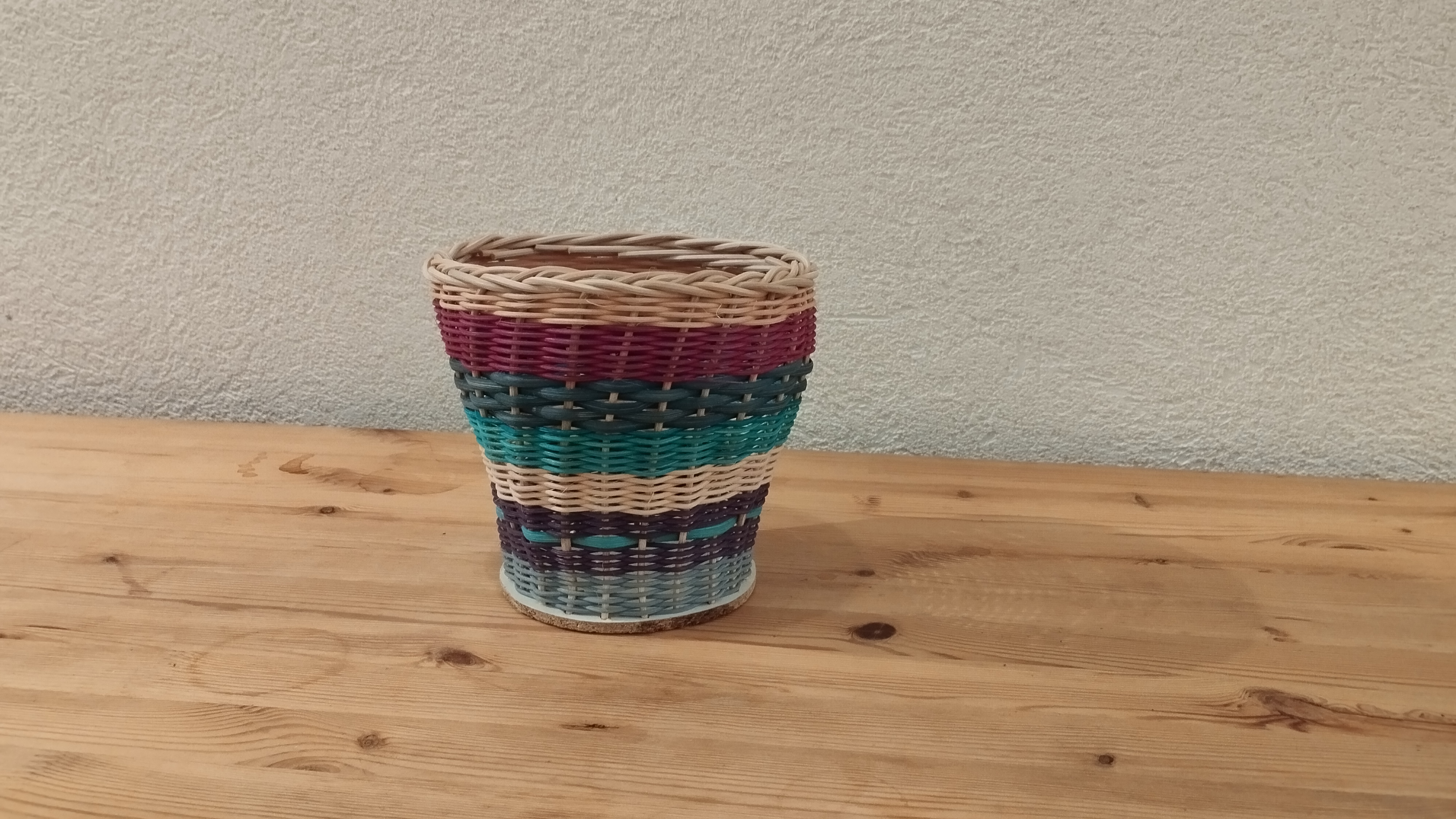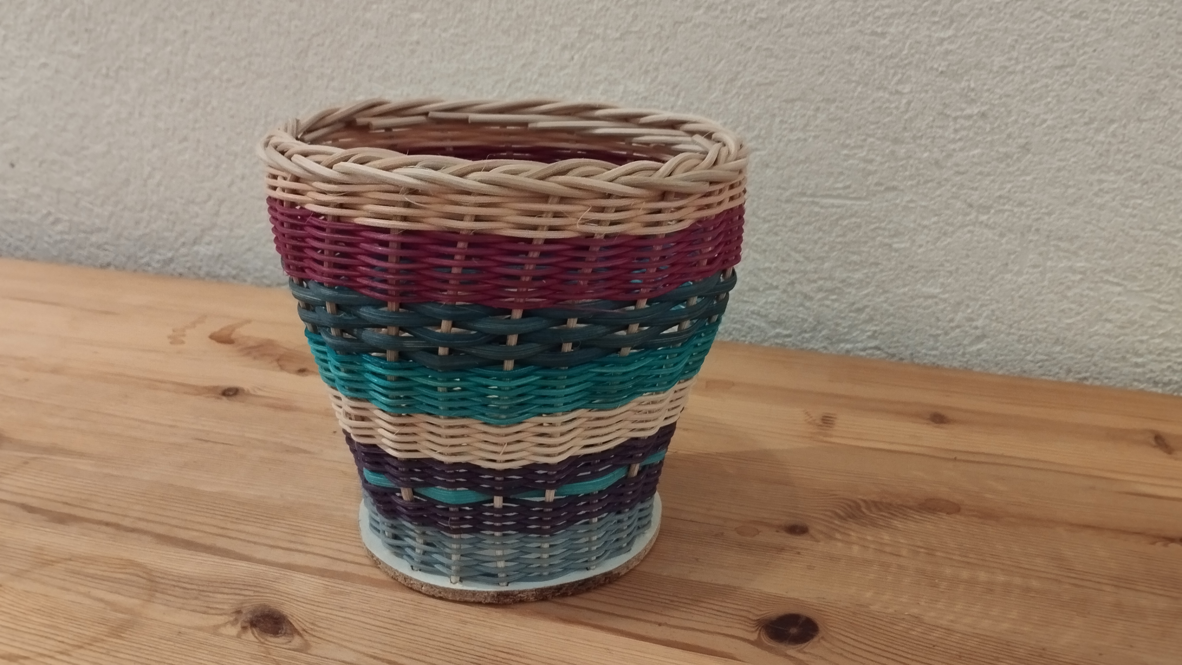 Cara a tressé sa première corbeille en rotin. Elle est partie d’un support en bois et a tressé avec de la moelle et de l’éclisse.