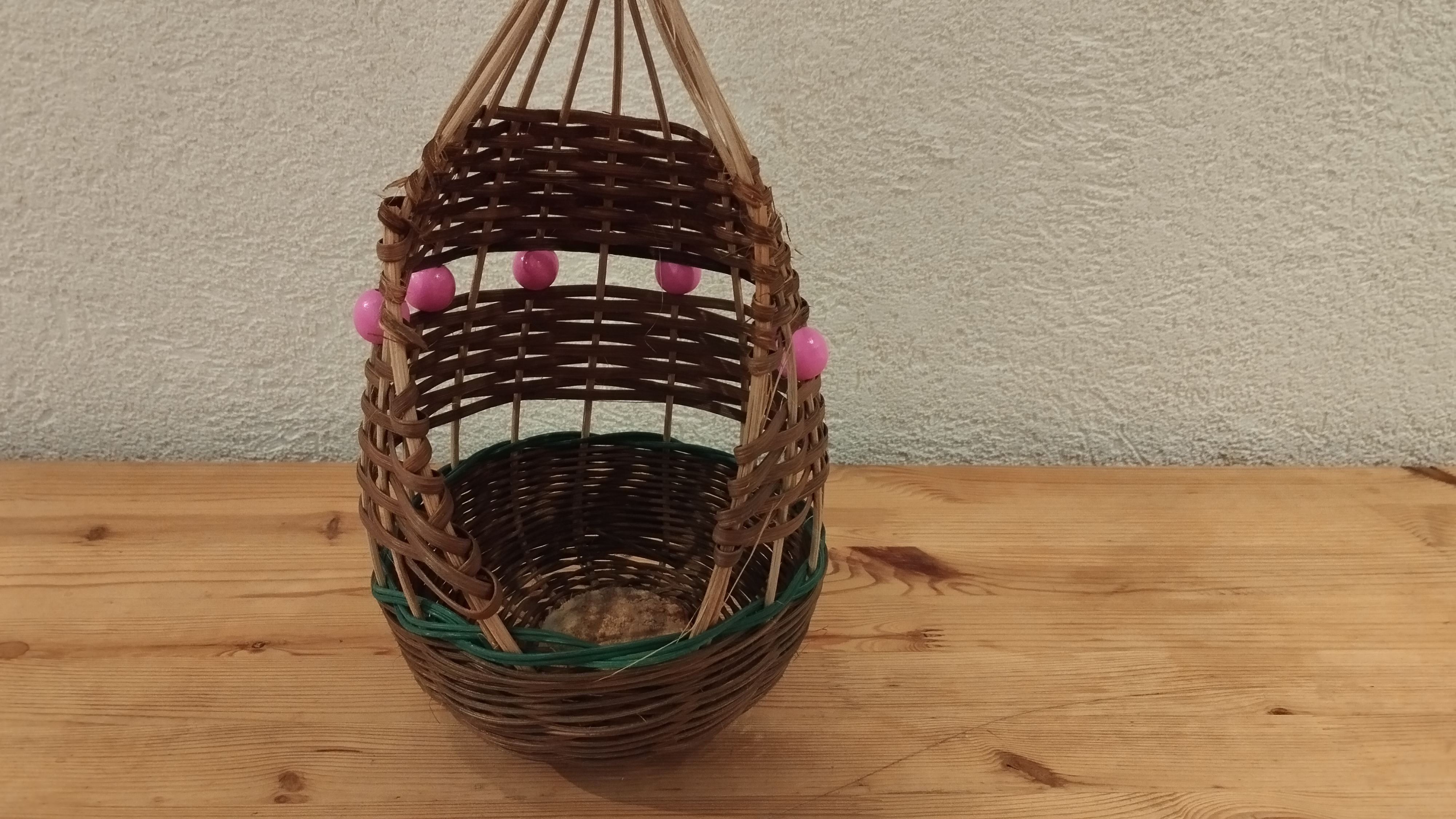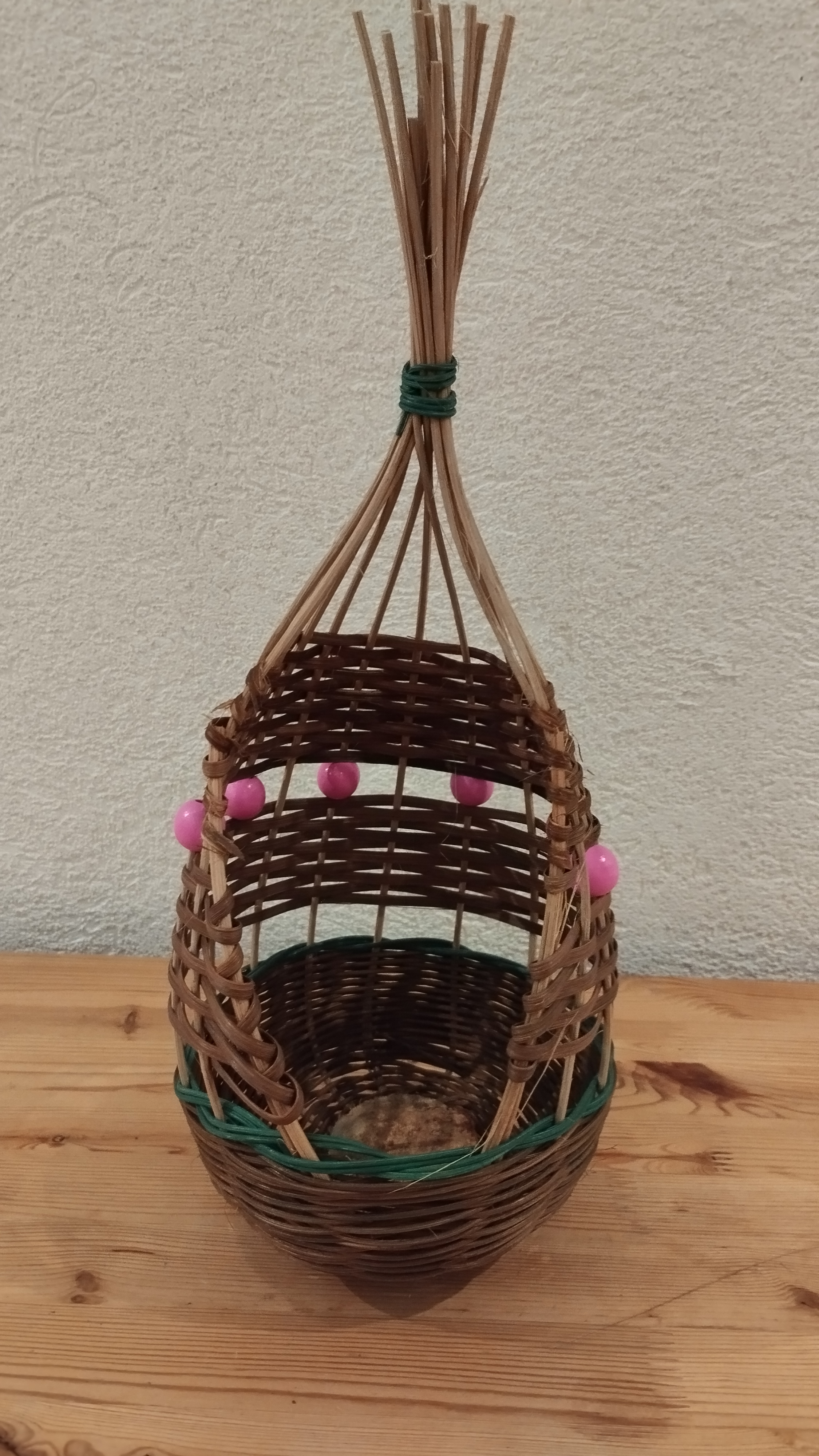 Nelly a réalisé sa deuxième corbeille de ce type. Elle est partie d’une rondelle de bois pour fond et a tressé avec de la moelle et de l’éclisse de rotin. Elle a ajouté quelques perles pour la déco et terminé en attachant les montants avec un nœud japonais.
