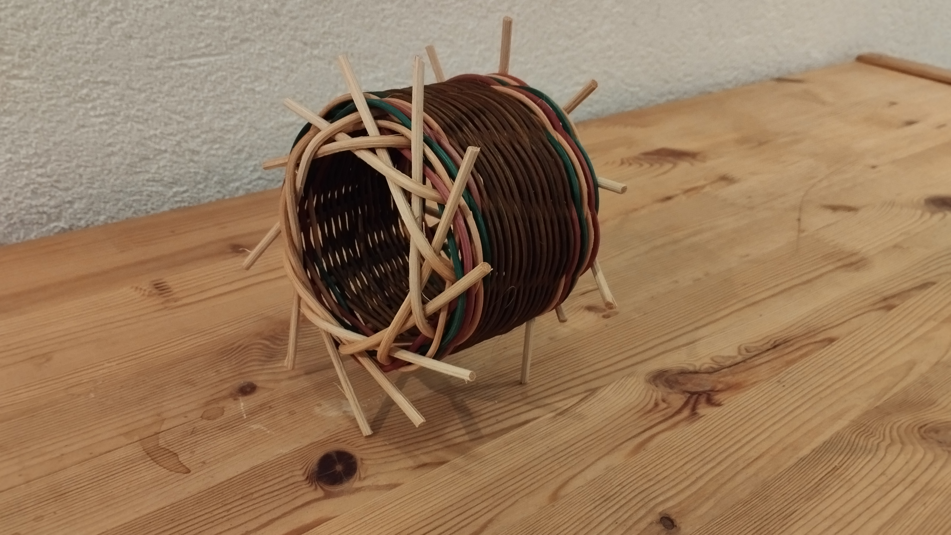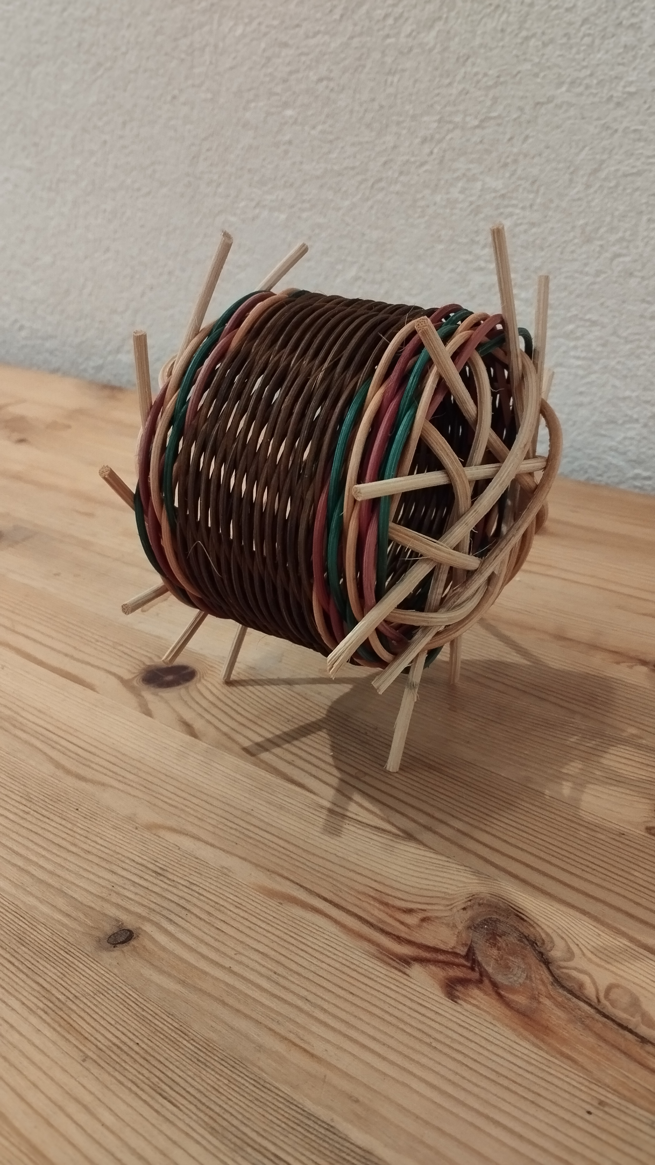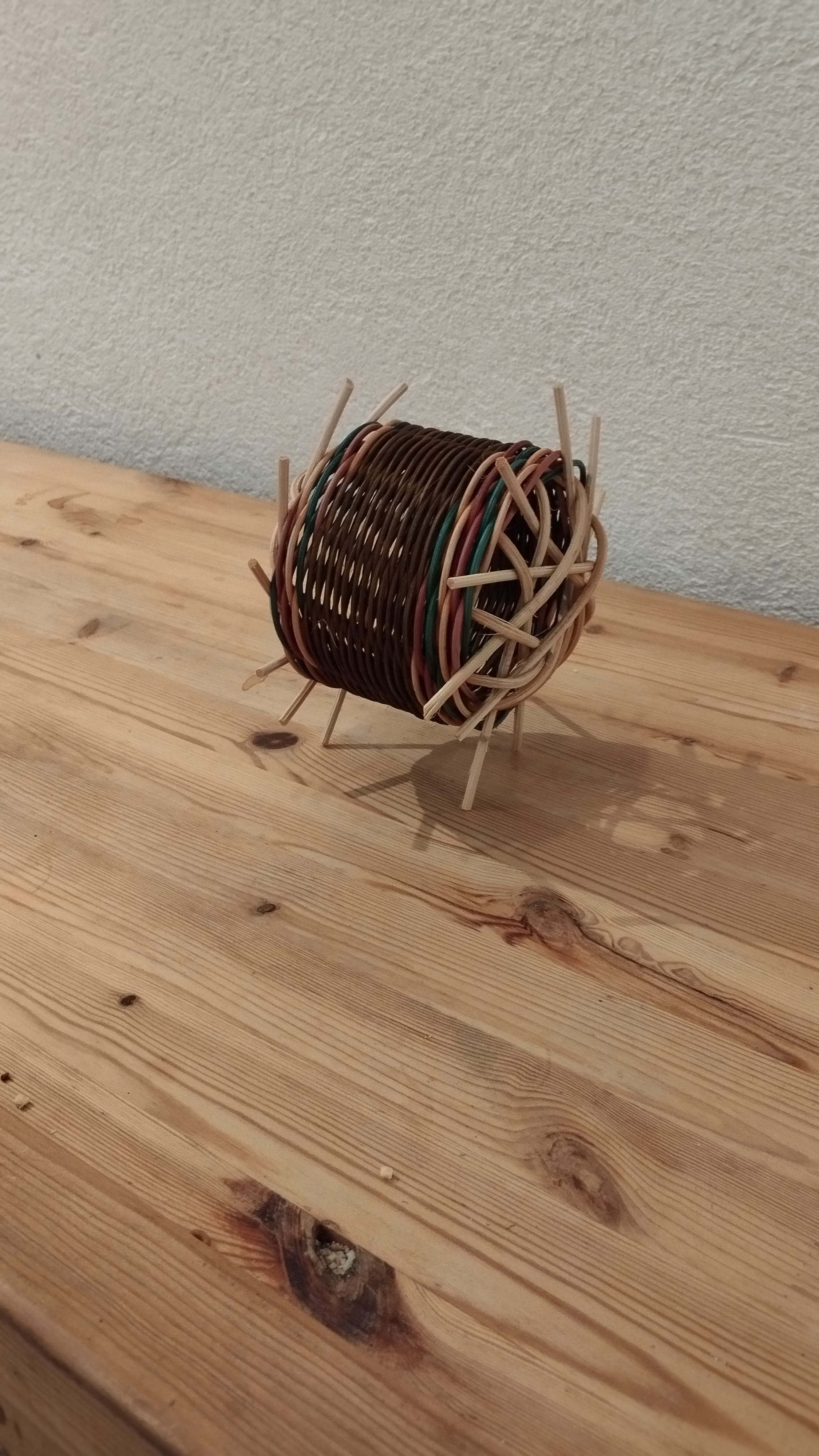 Changement dans le style de mangeoire ! Nelly a tressé cette mangeoire en forme de rouleau pour placer les boules de graisse.