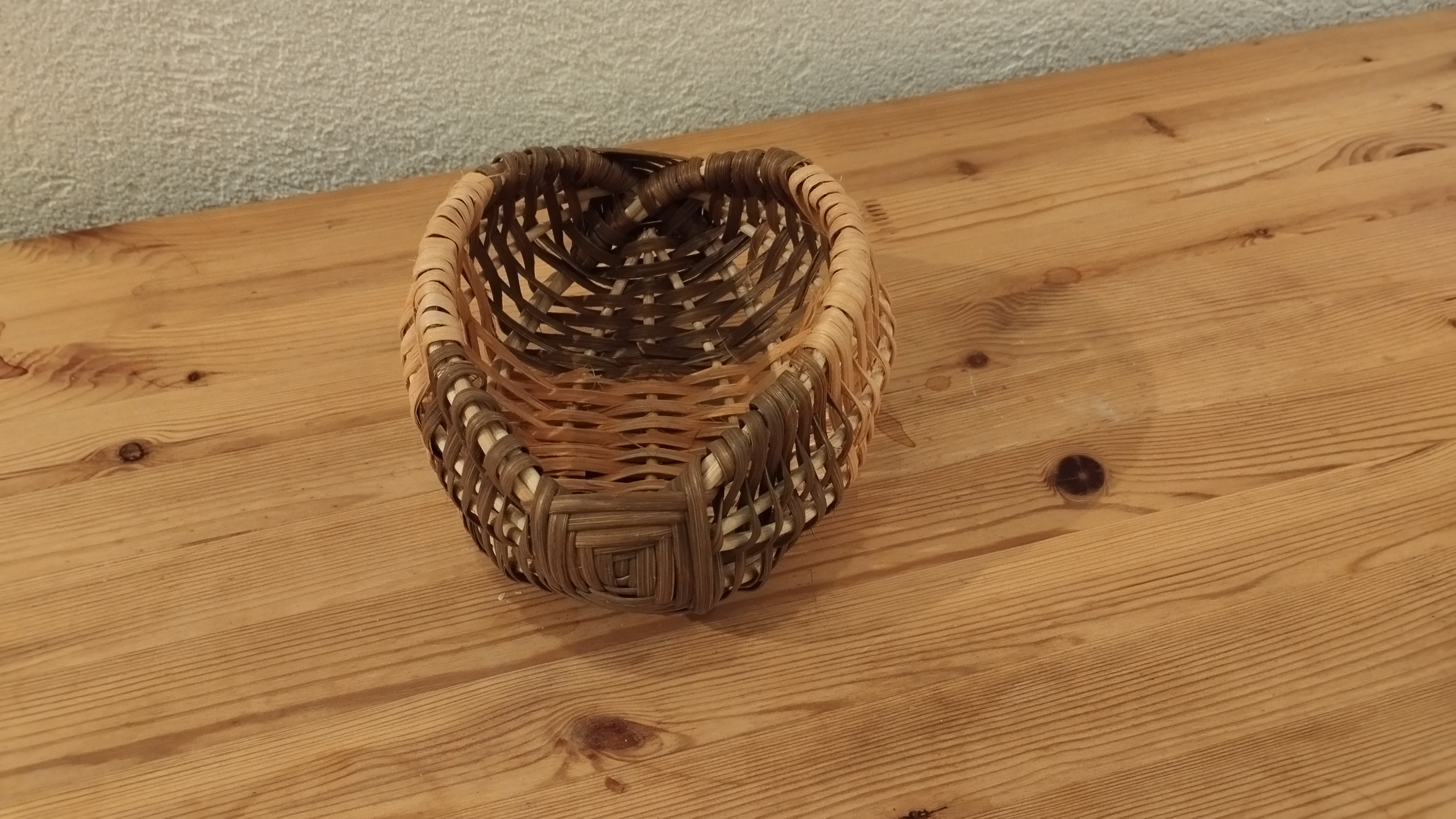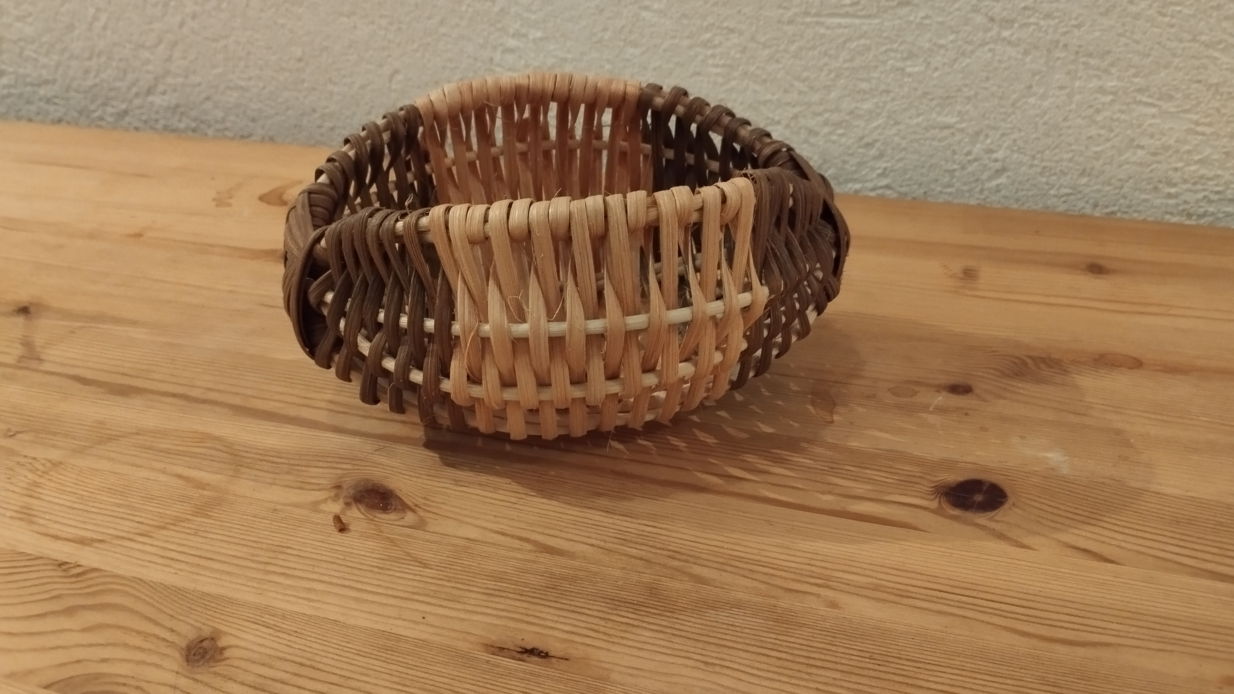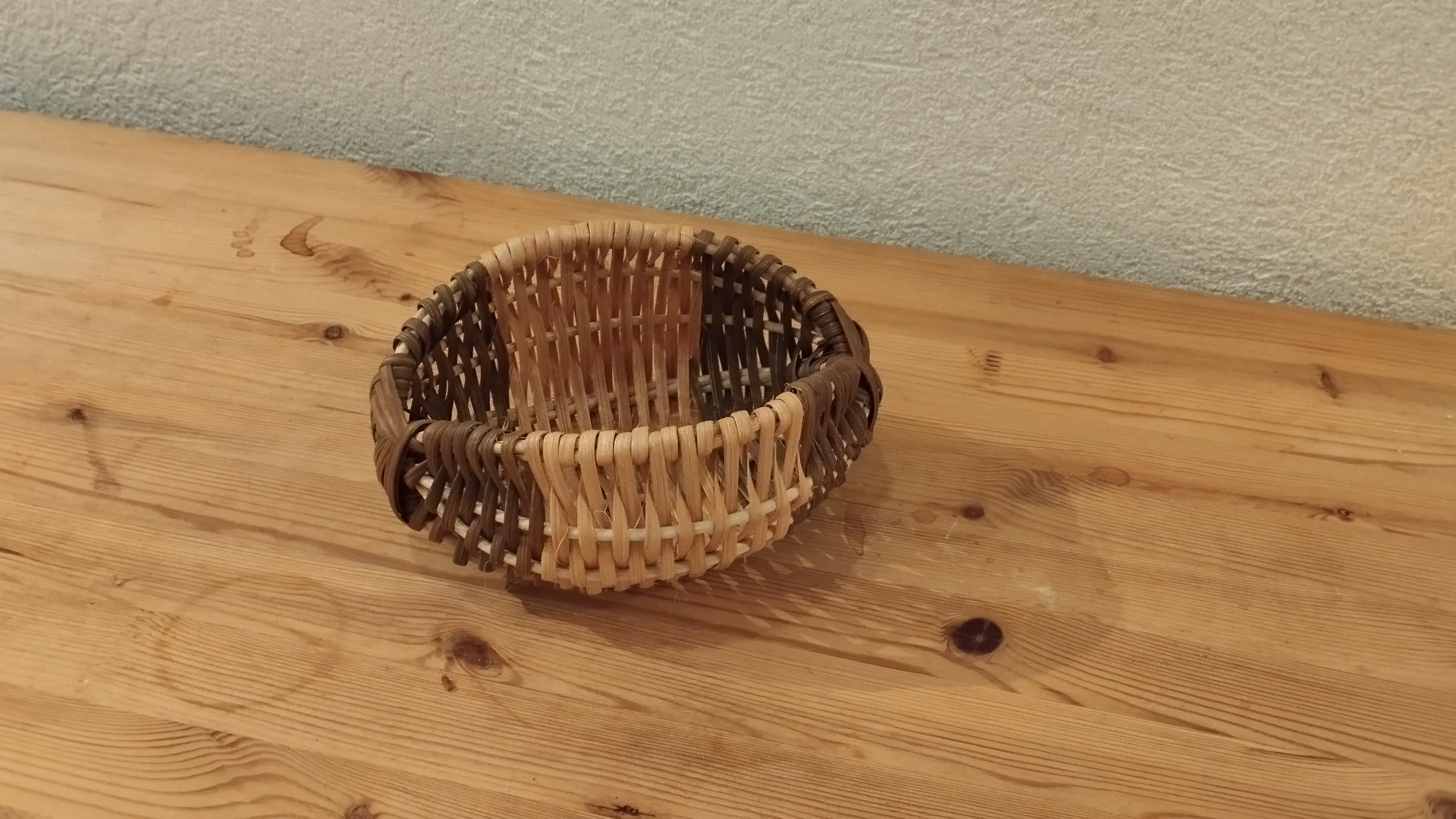 Marie-Alix s’est elle aussi lancée dans les mini corbeilles. Sur le modèle du panier sur arceaux, elle a tressé en éclisse de rotin sur une base en moelle.