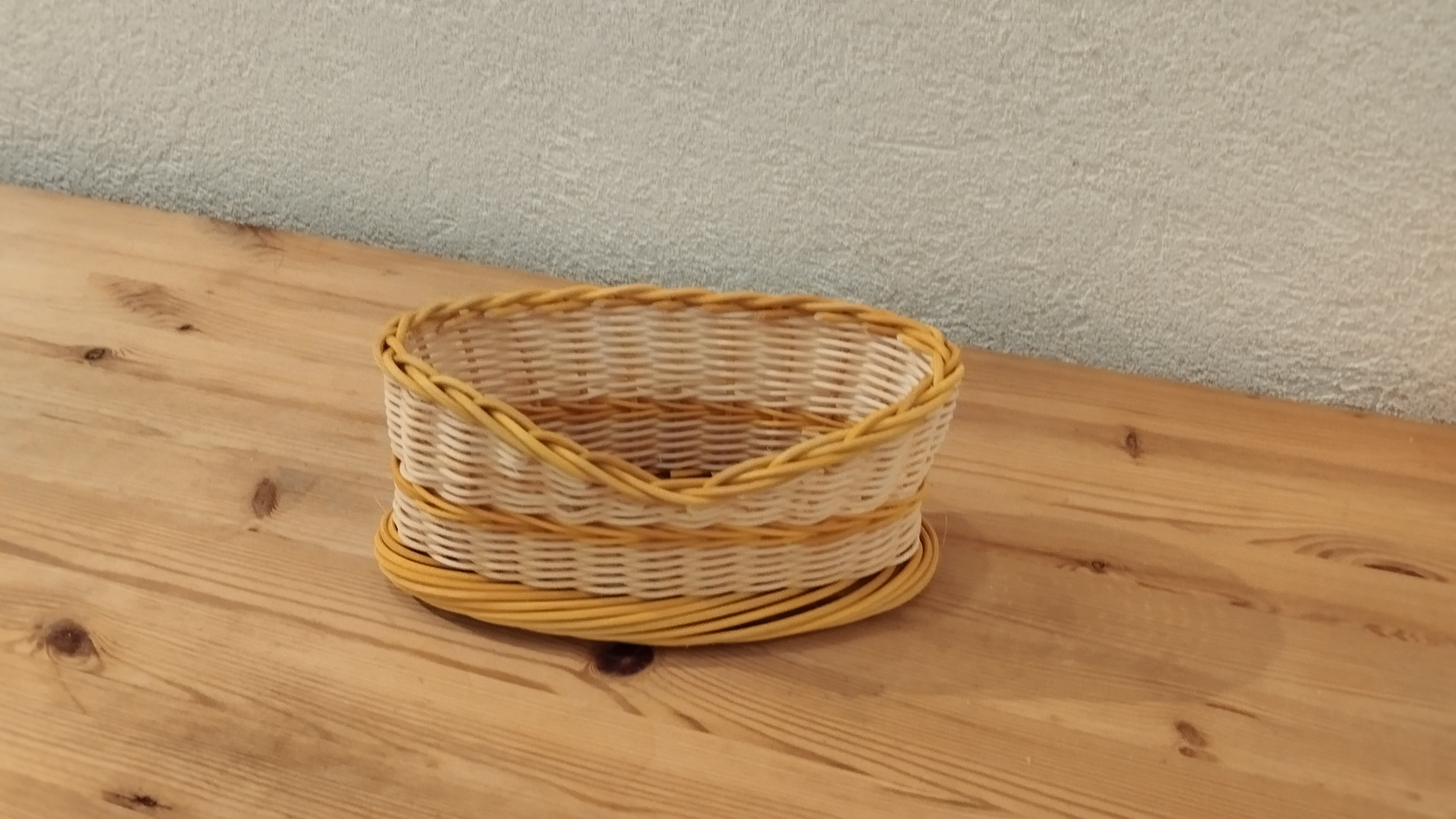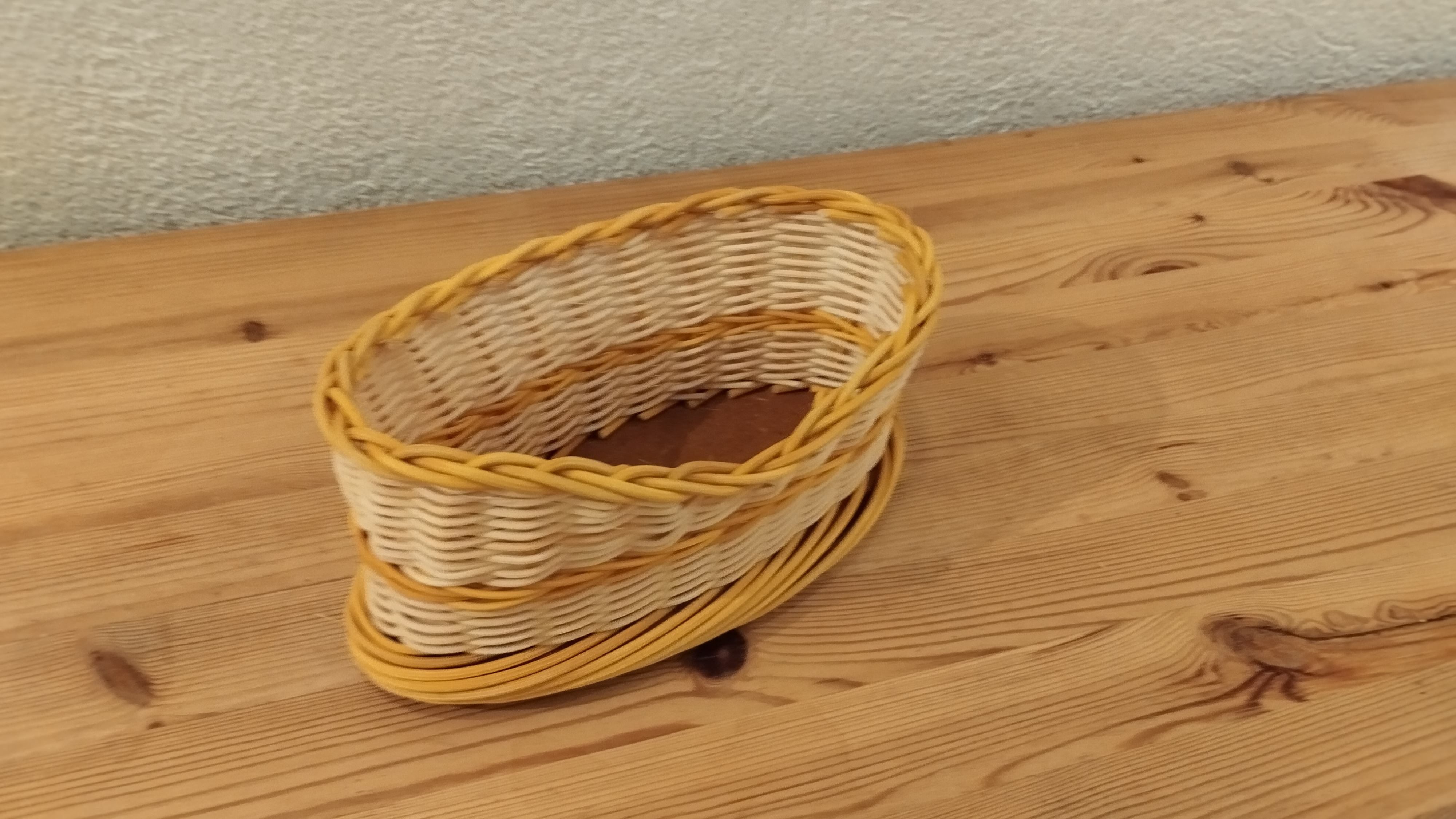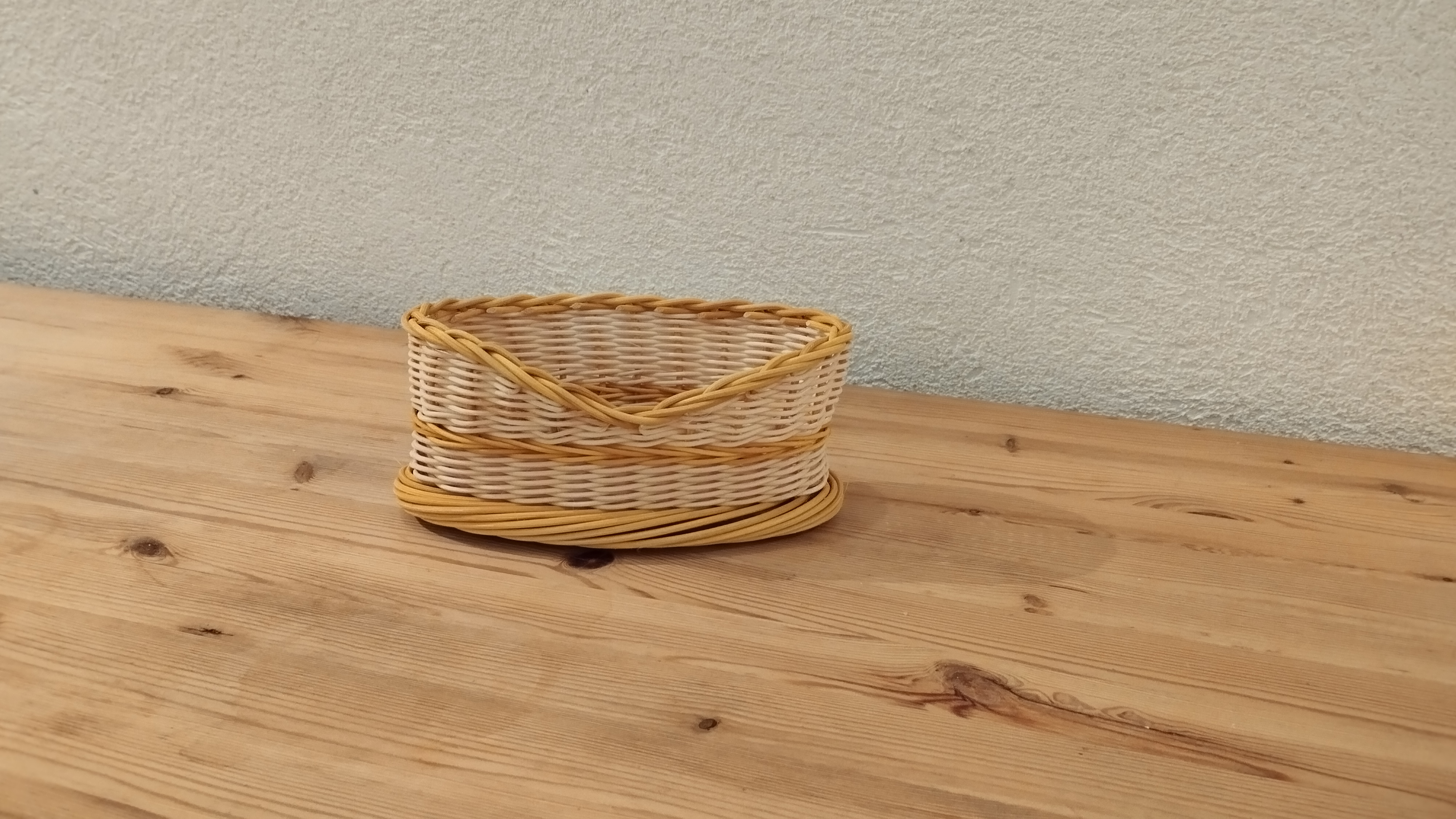 Pour sa fille, Marie-Alix a réalisé cette corbeille pour paquets de chips ! Sur un support en bois, elle a tressé avec de la moelle de rotin en super et fleur de lys.