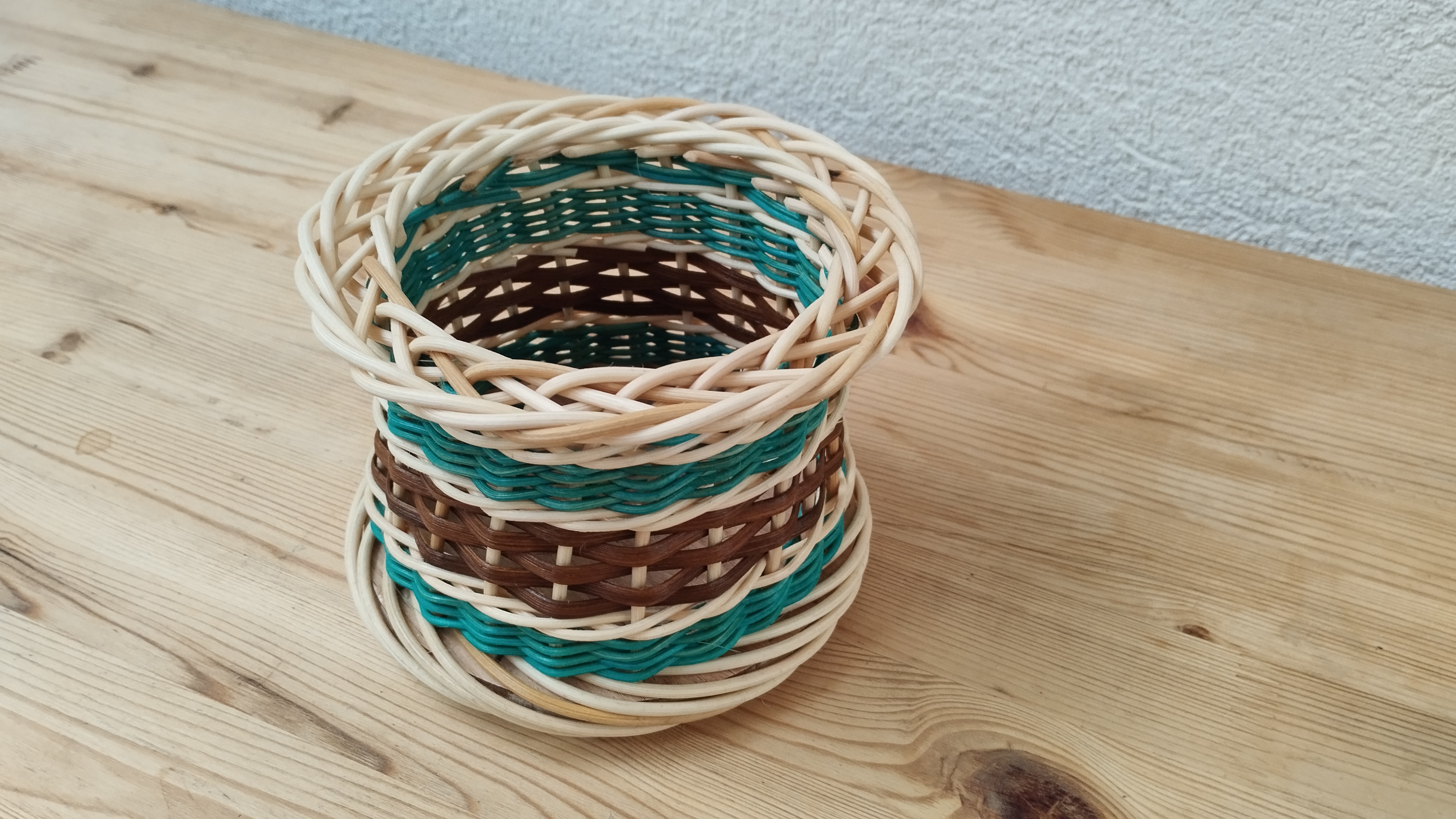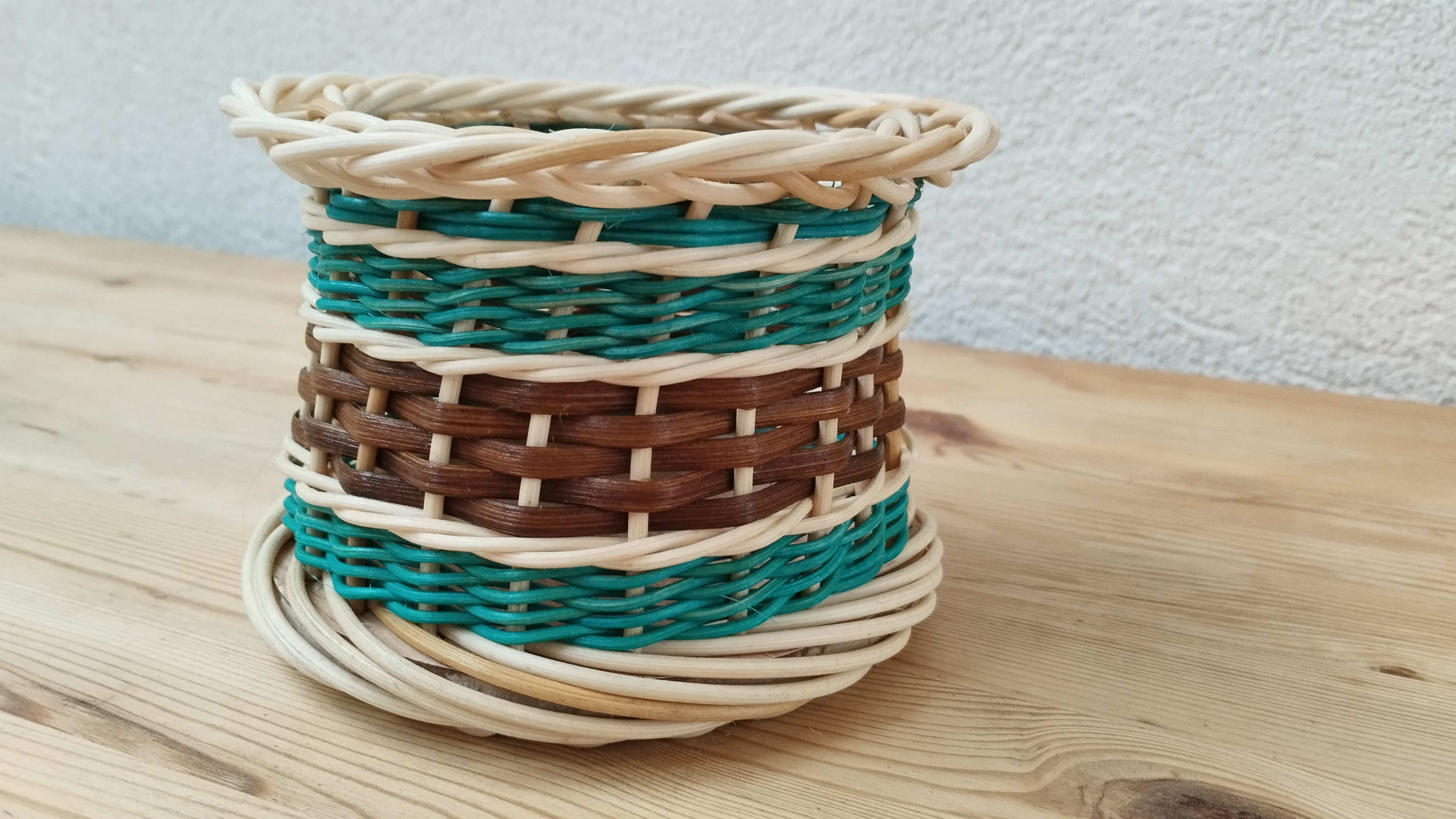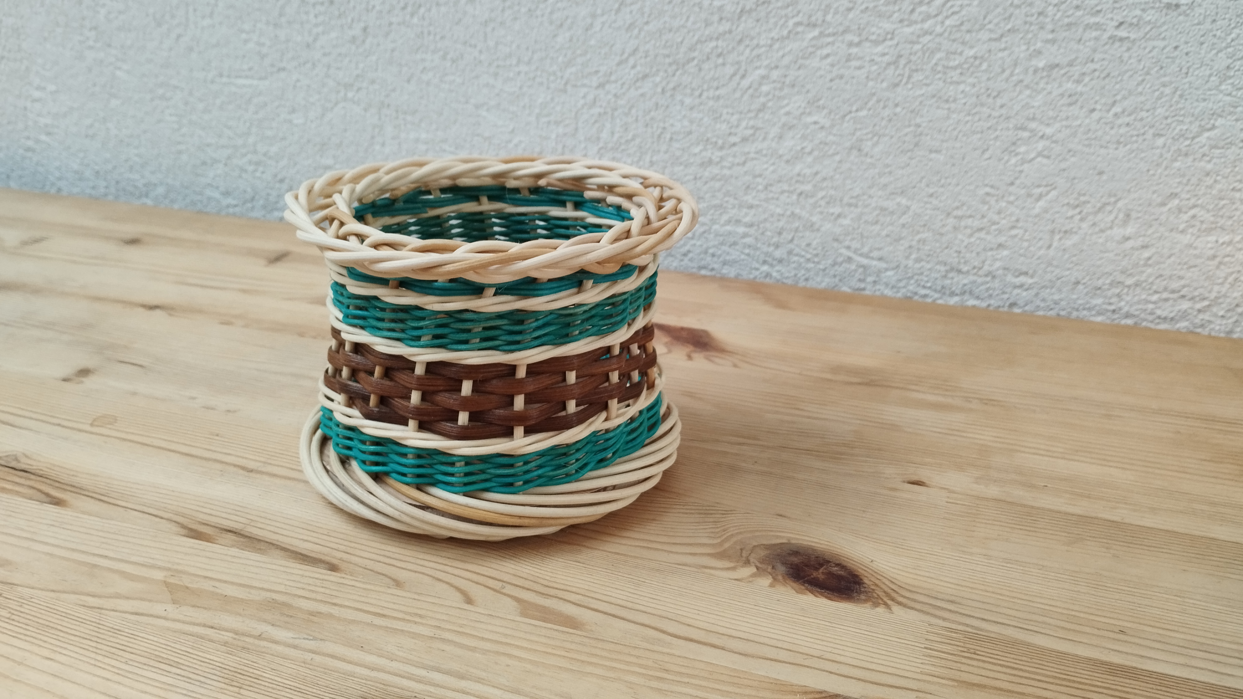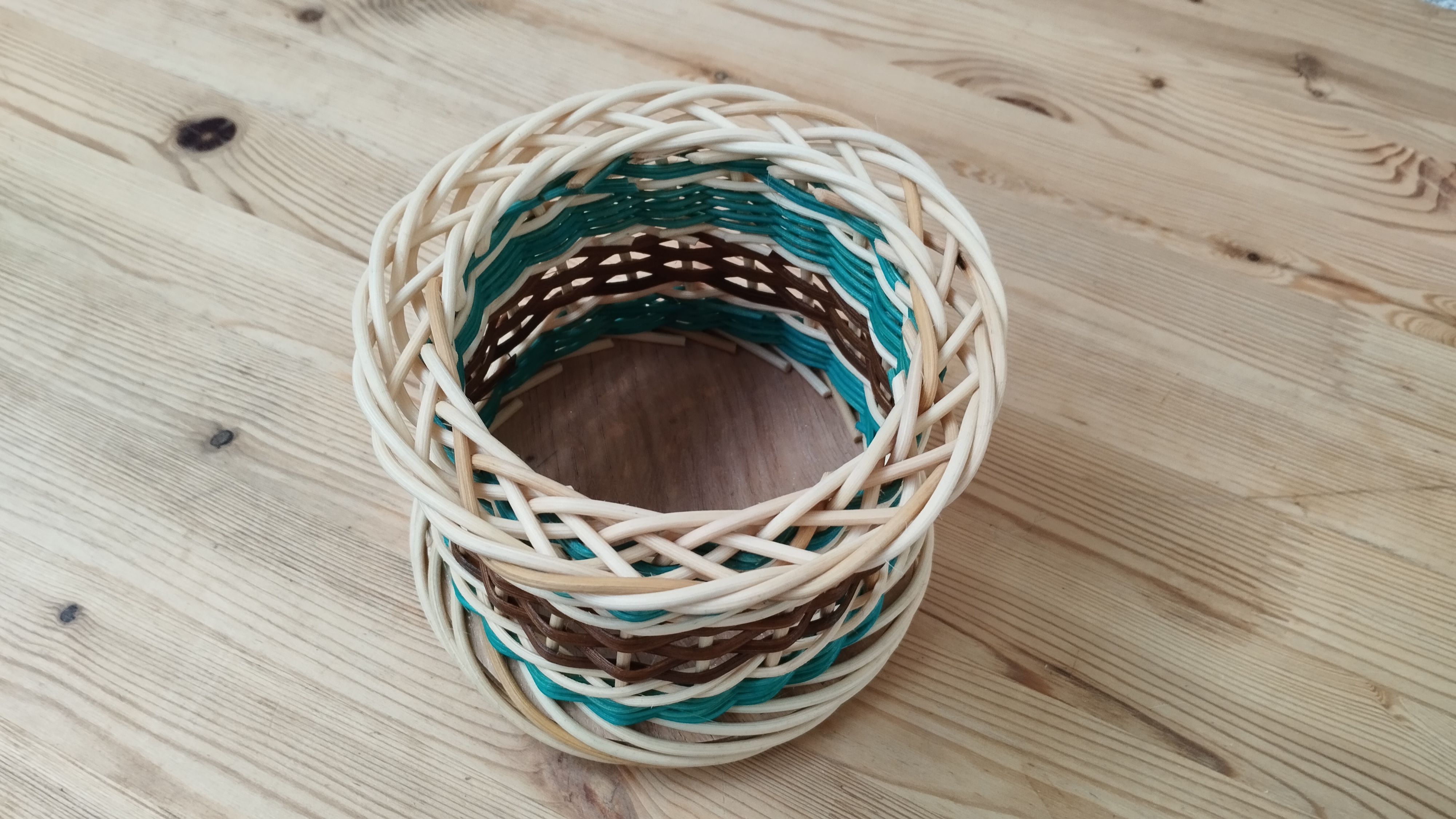 Sur un fond en bois, Bernard a réalisé ce pot en moelle et éclisse de rotin. Pour sa 2e création, il a tressé en super et en torche et utilisé de la moelle et de l’éclisse de rotin.