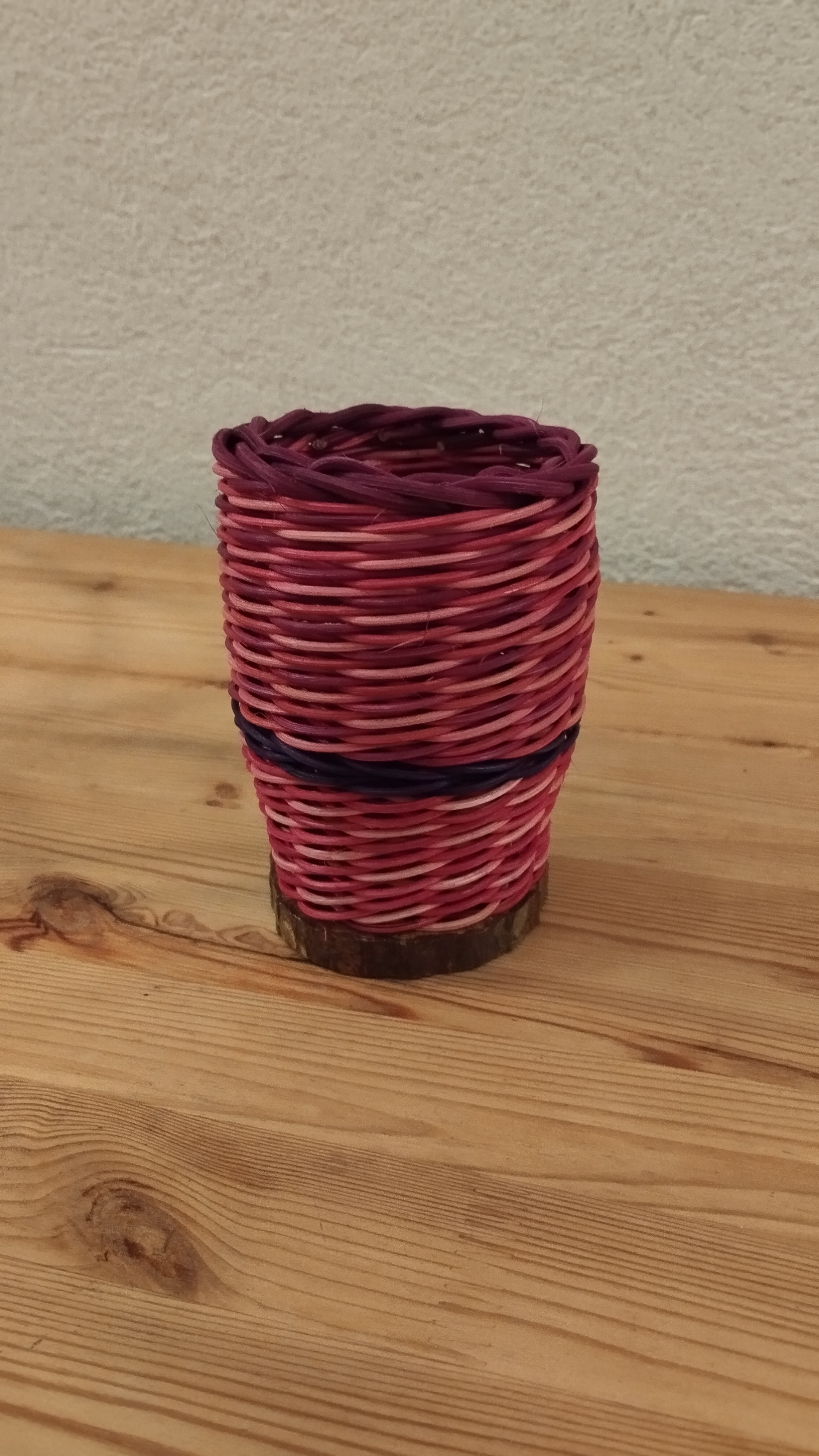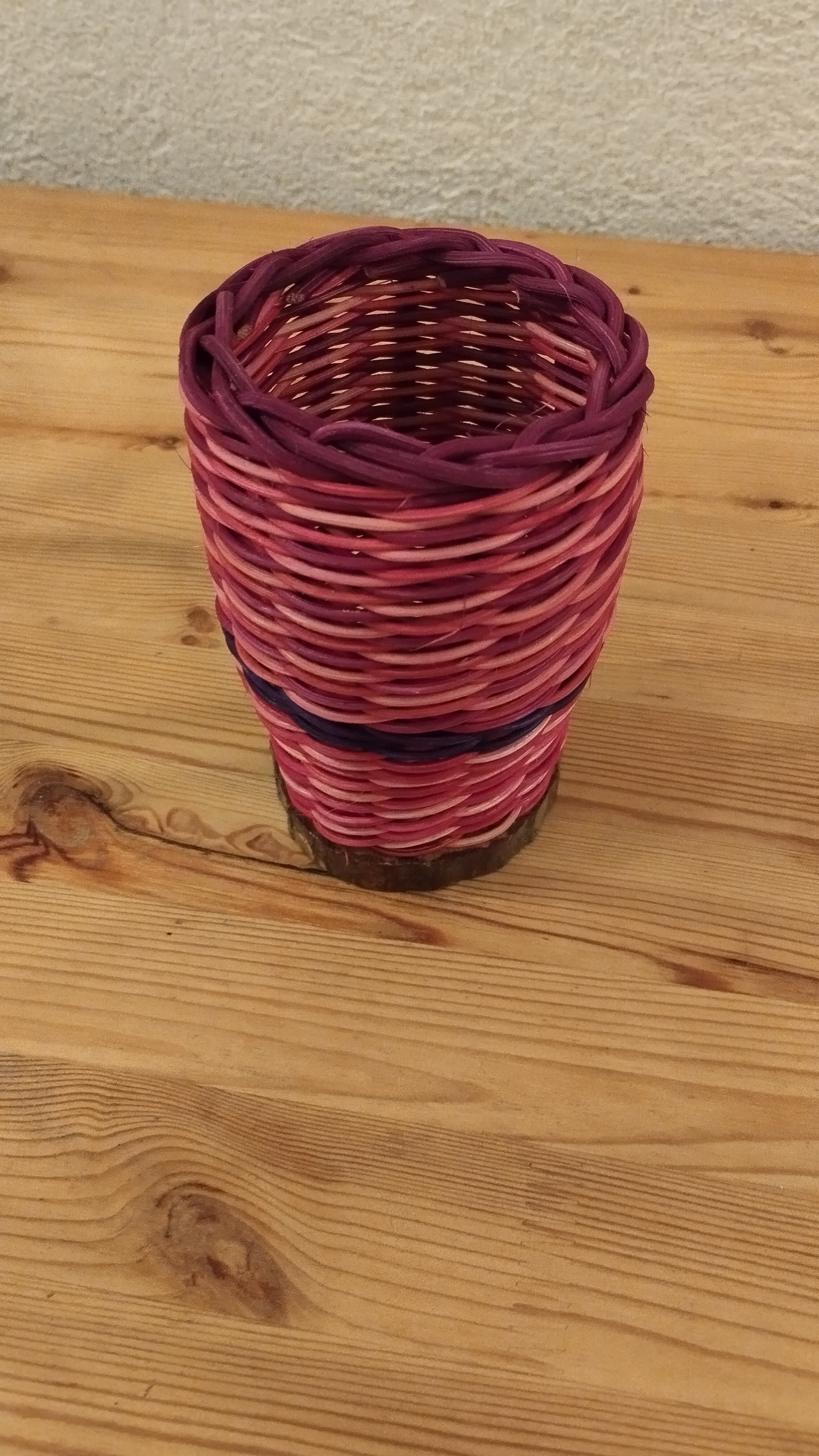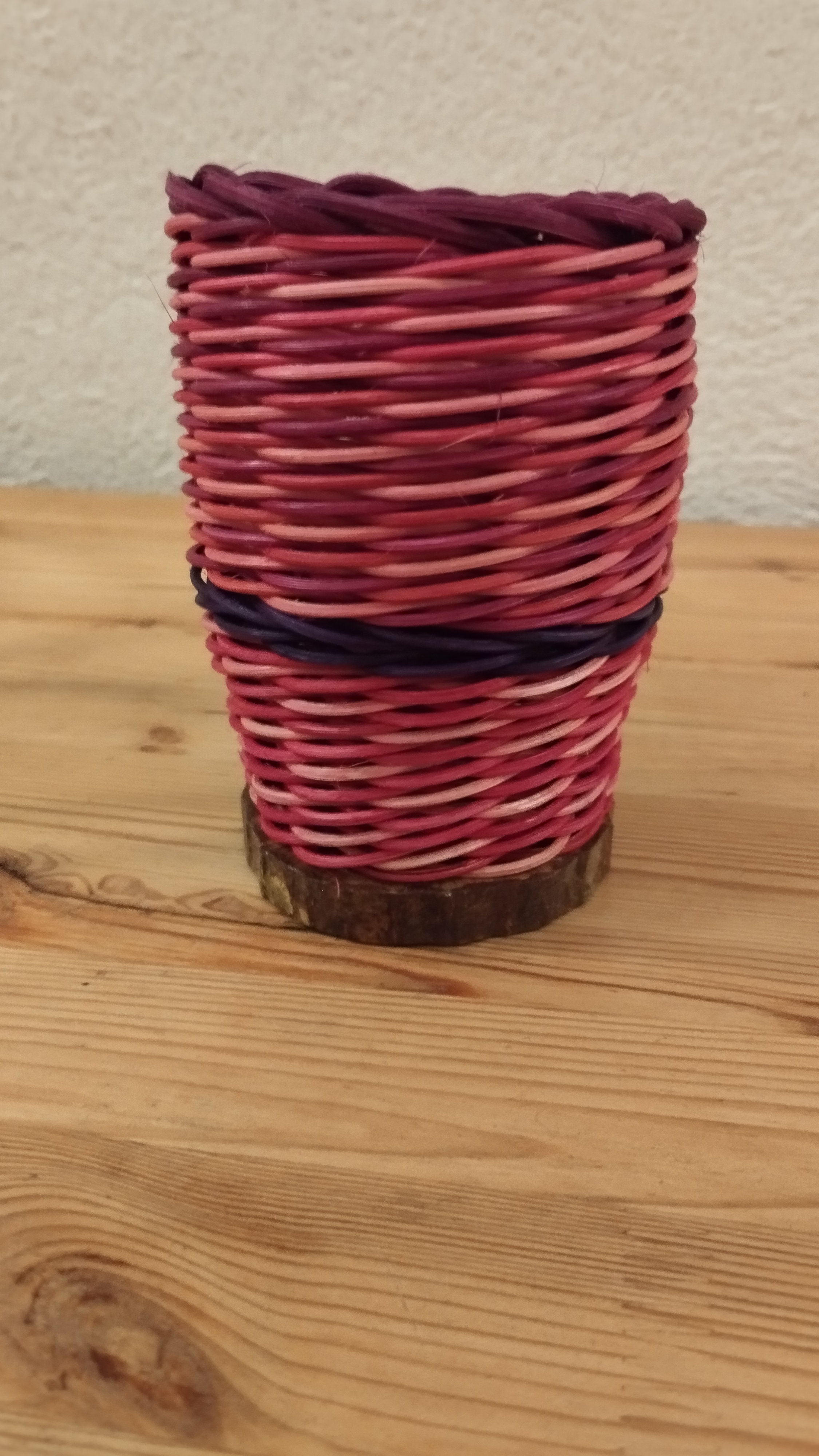 Sur la base d’une rondelle en bois, Marie-Alix a tressé en torche, avec trois couleurs de moelle de rotin, ce petit pot à crayons.