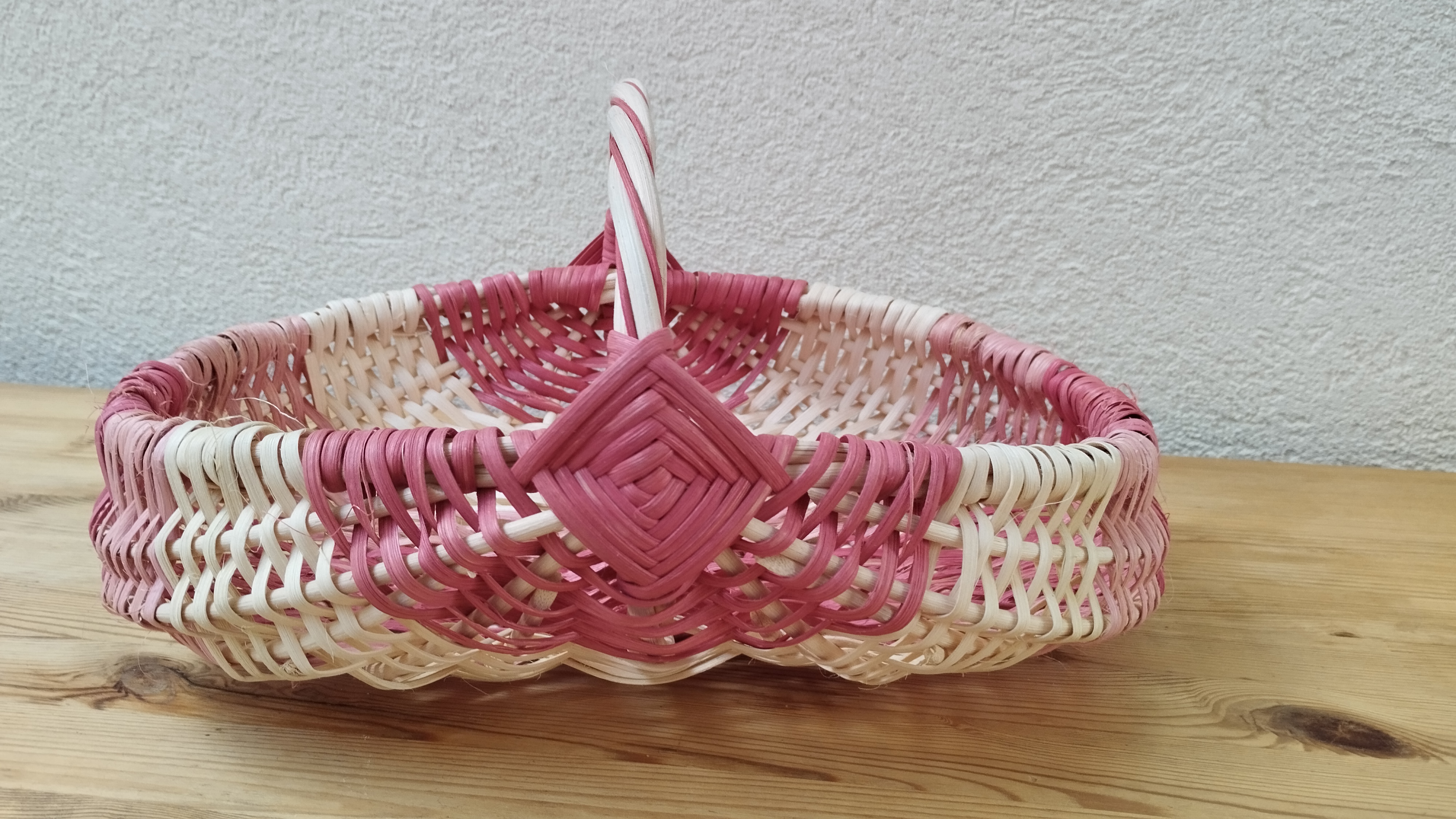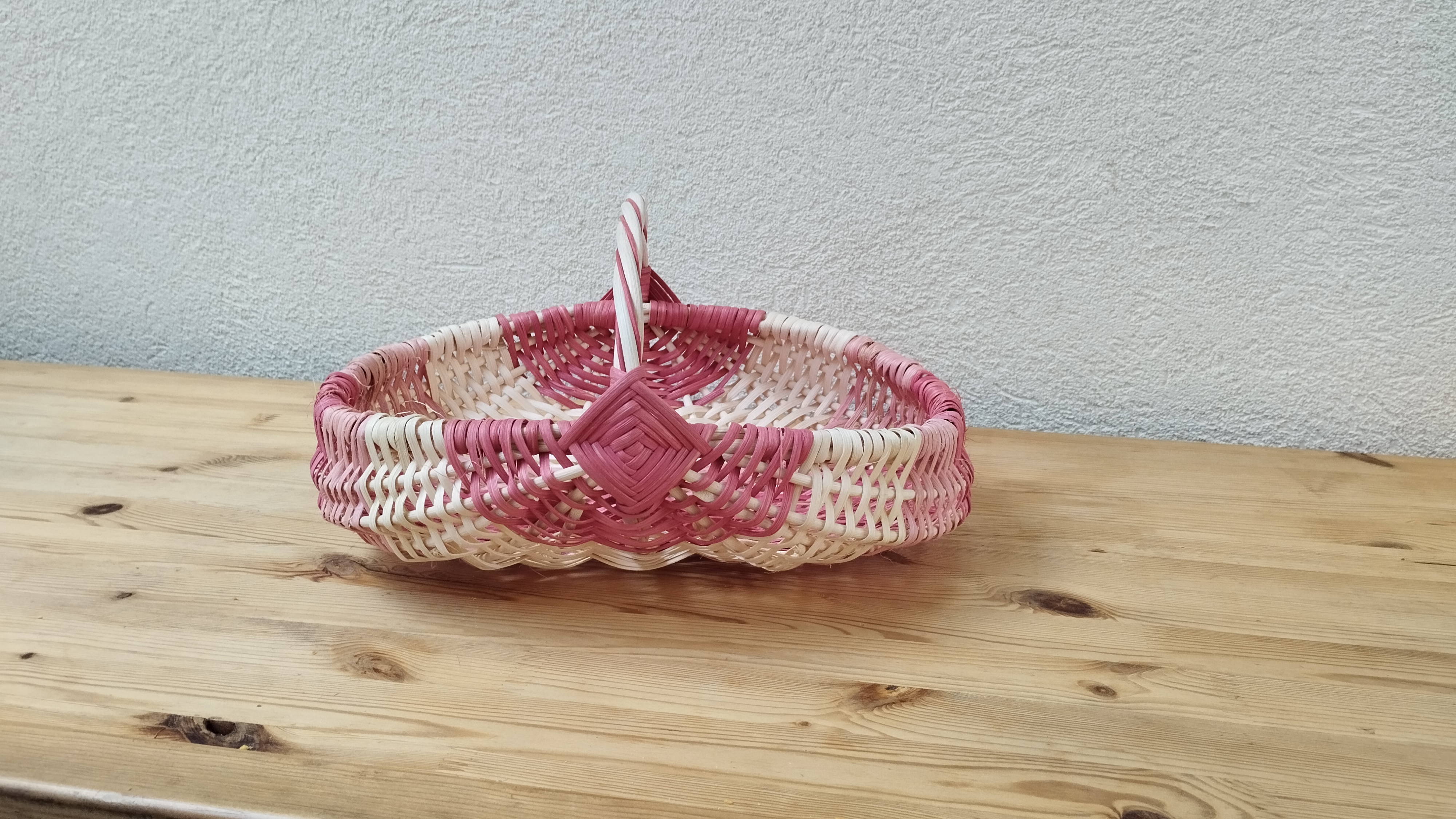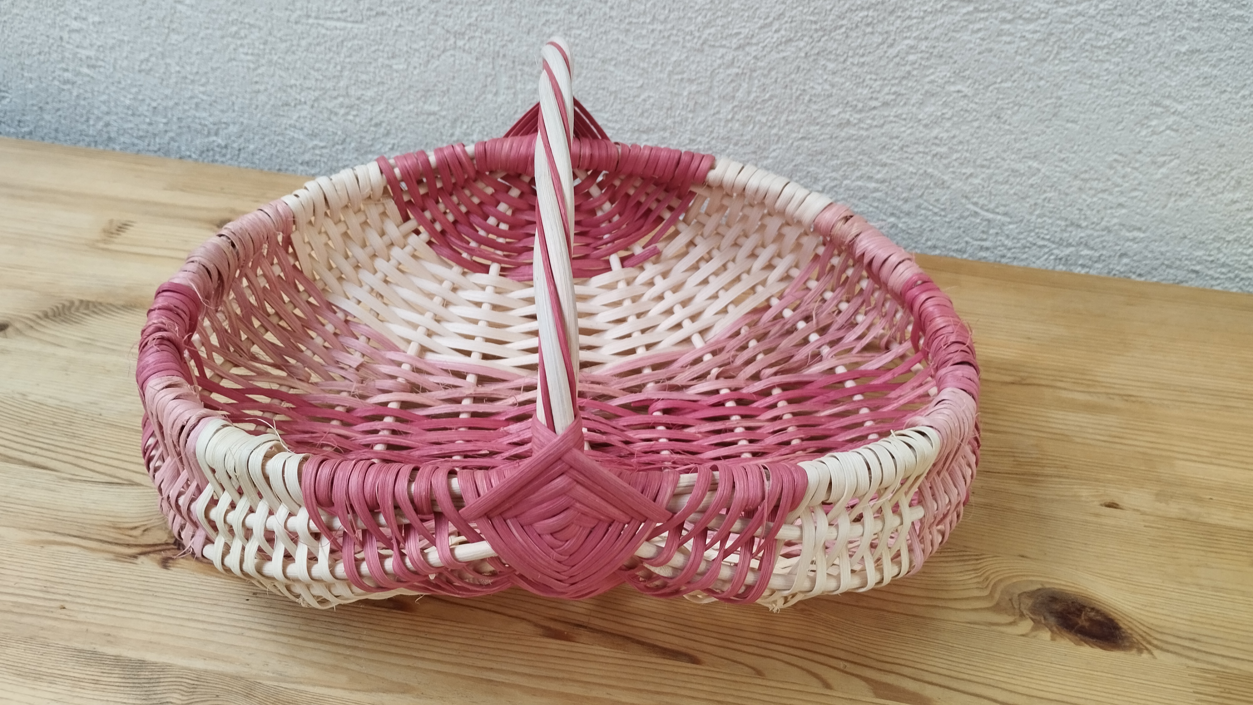 Première journée de vannerie en rotin pour Fanny qui a réalisé ce joli panier sur arceaux avec une armature en moelle de rotin et un tressage en éclisse.