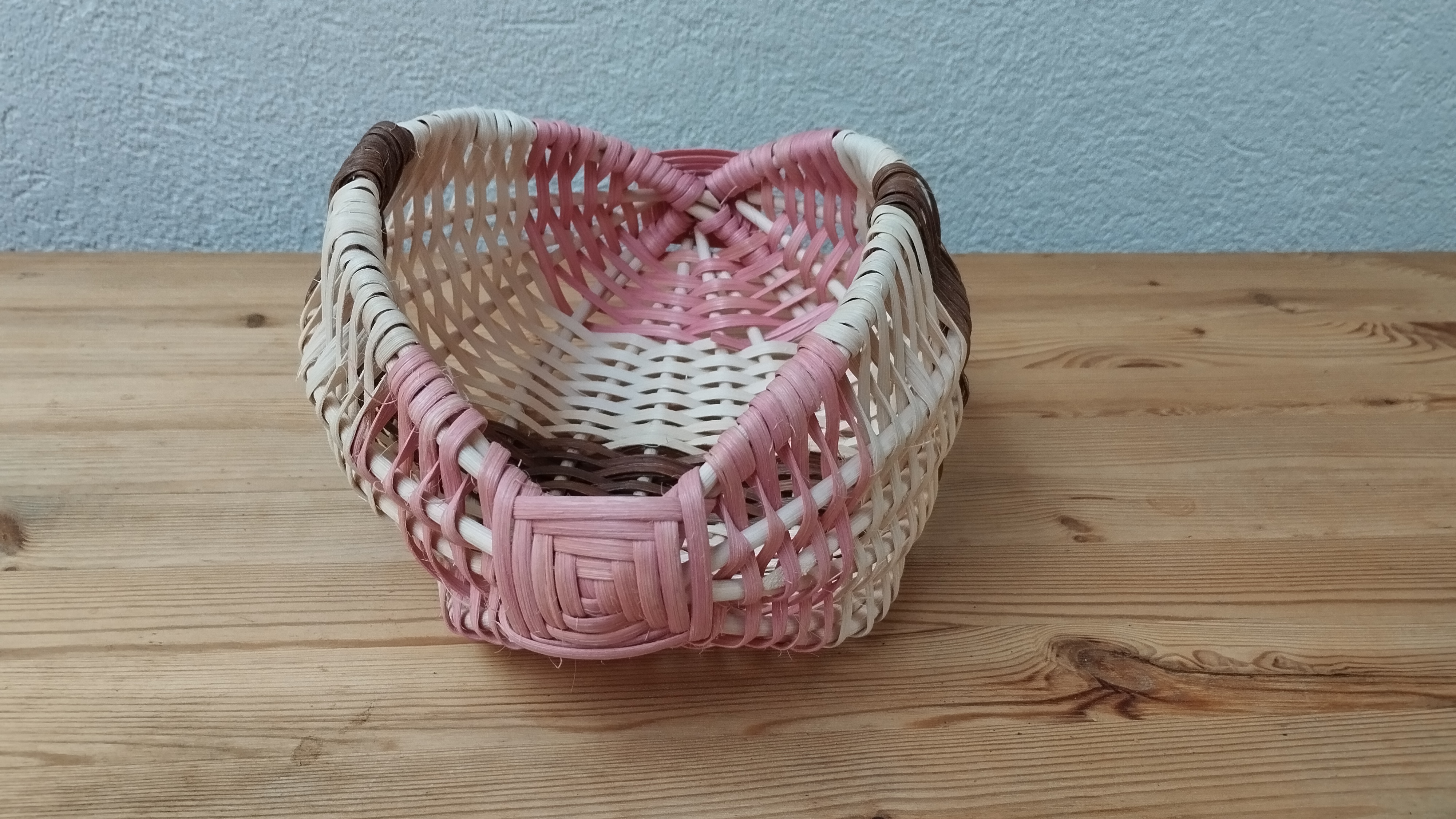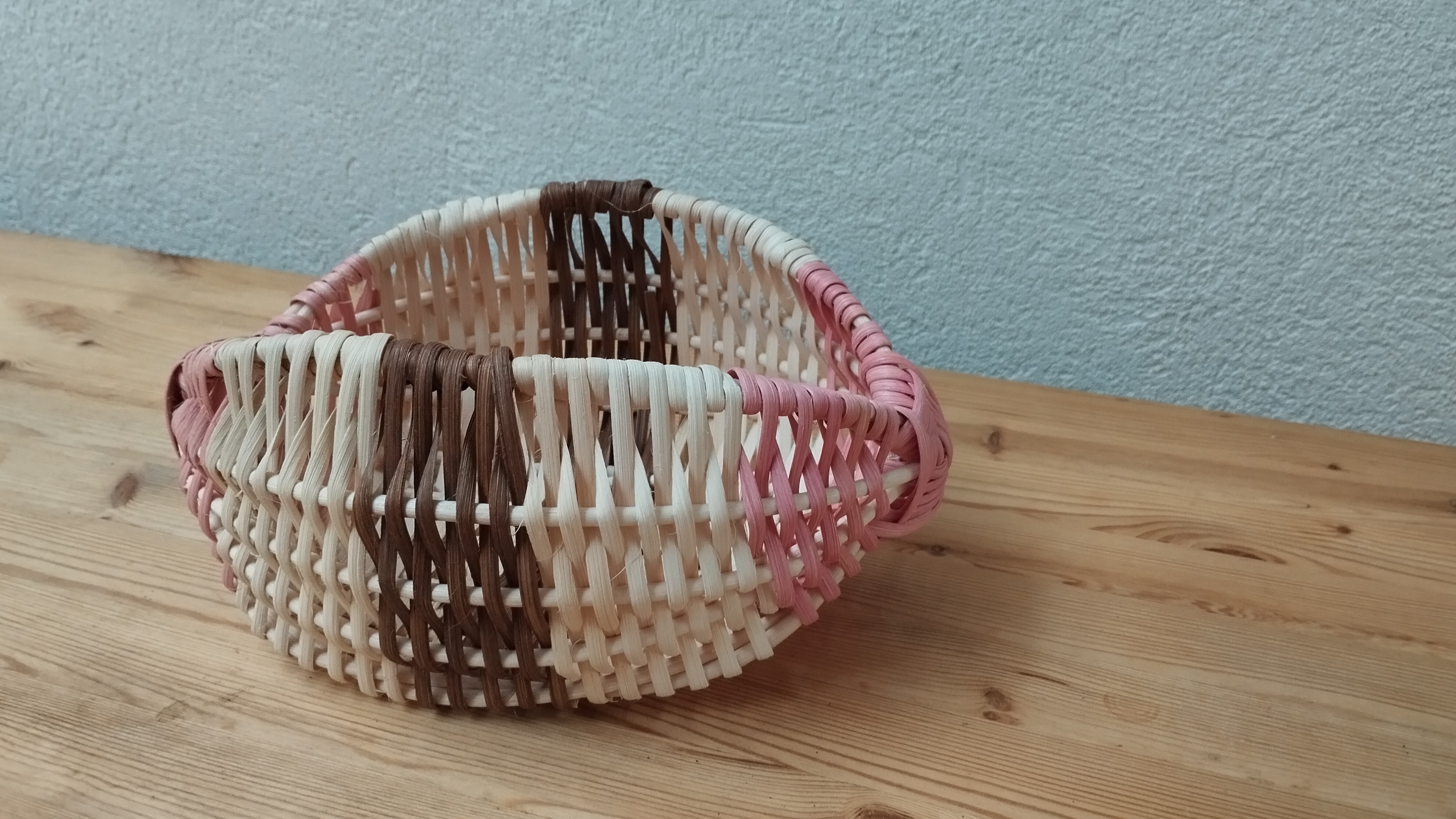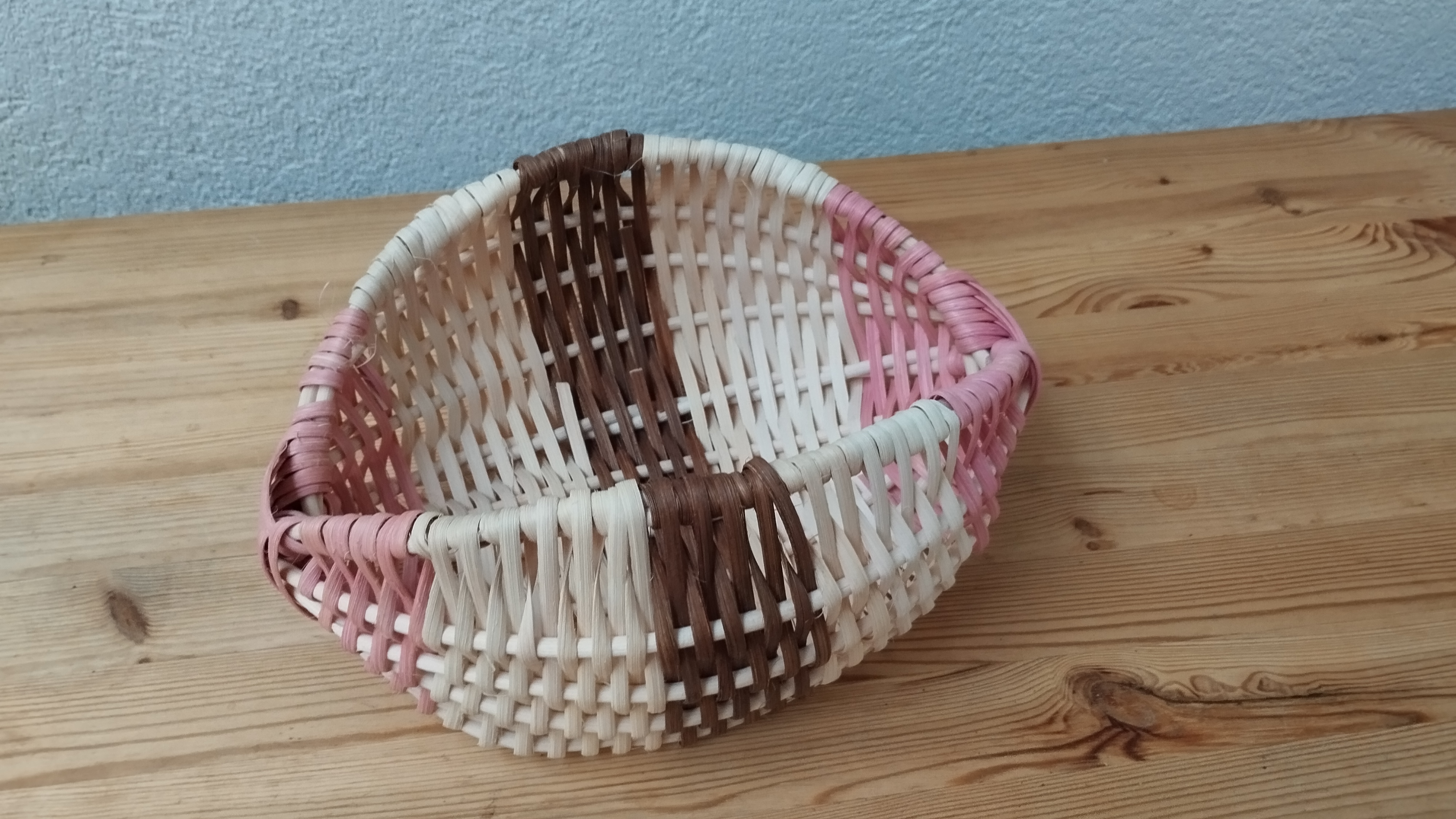 Une nouvelle corbeille sur arceaux pour Marie-Alix, réalisée avec de l’éclisse de rotin nature, rose et marron sur une structure en moelle de rotin.