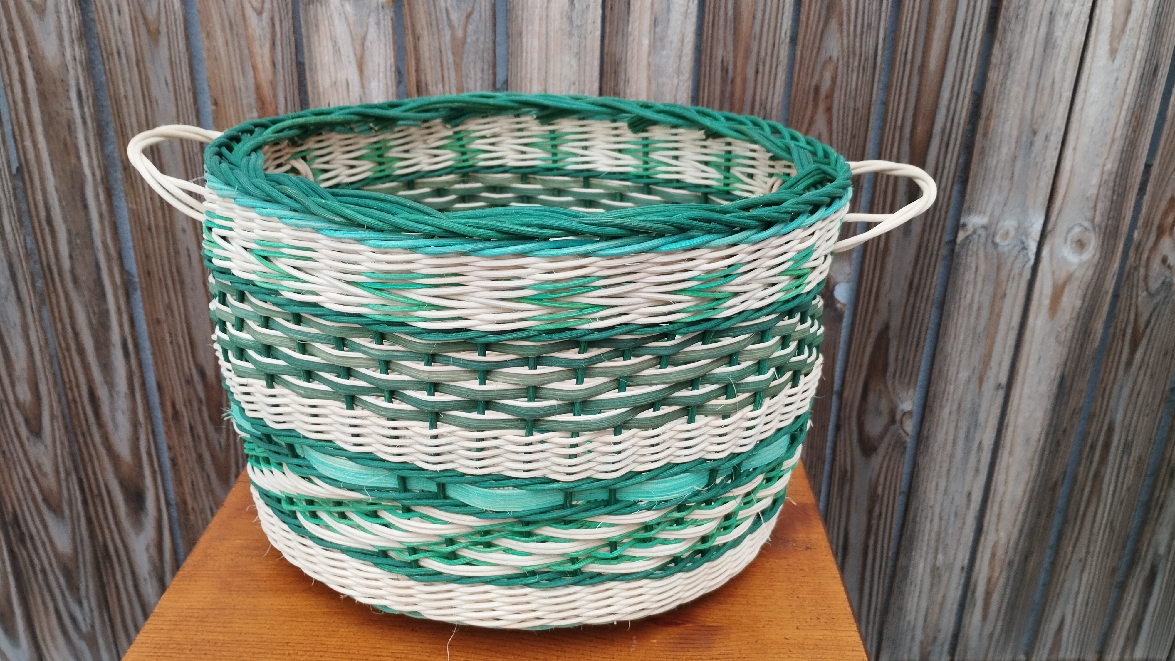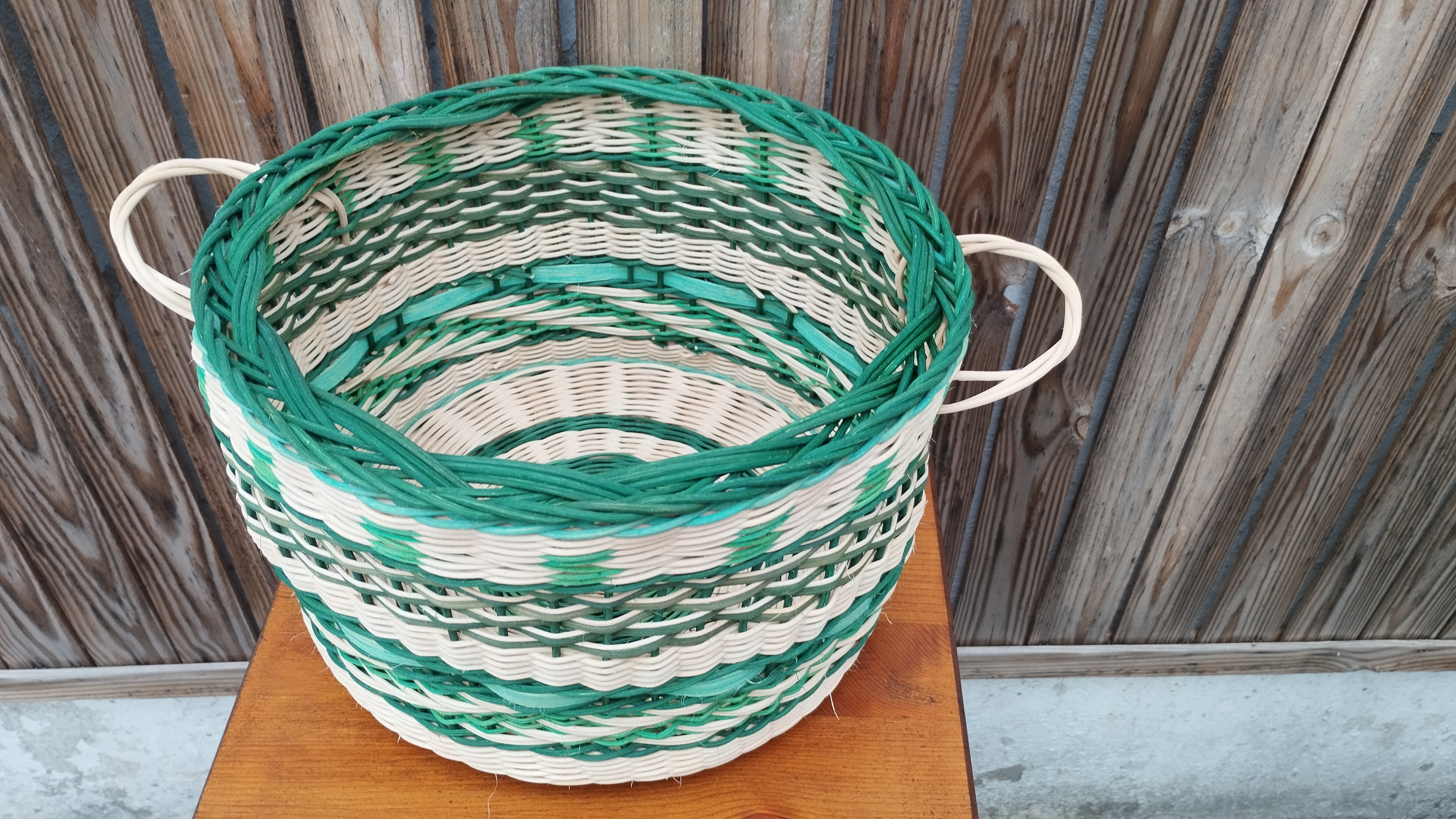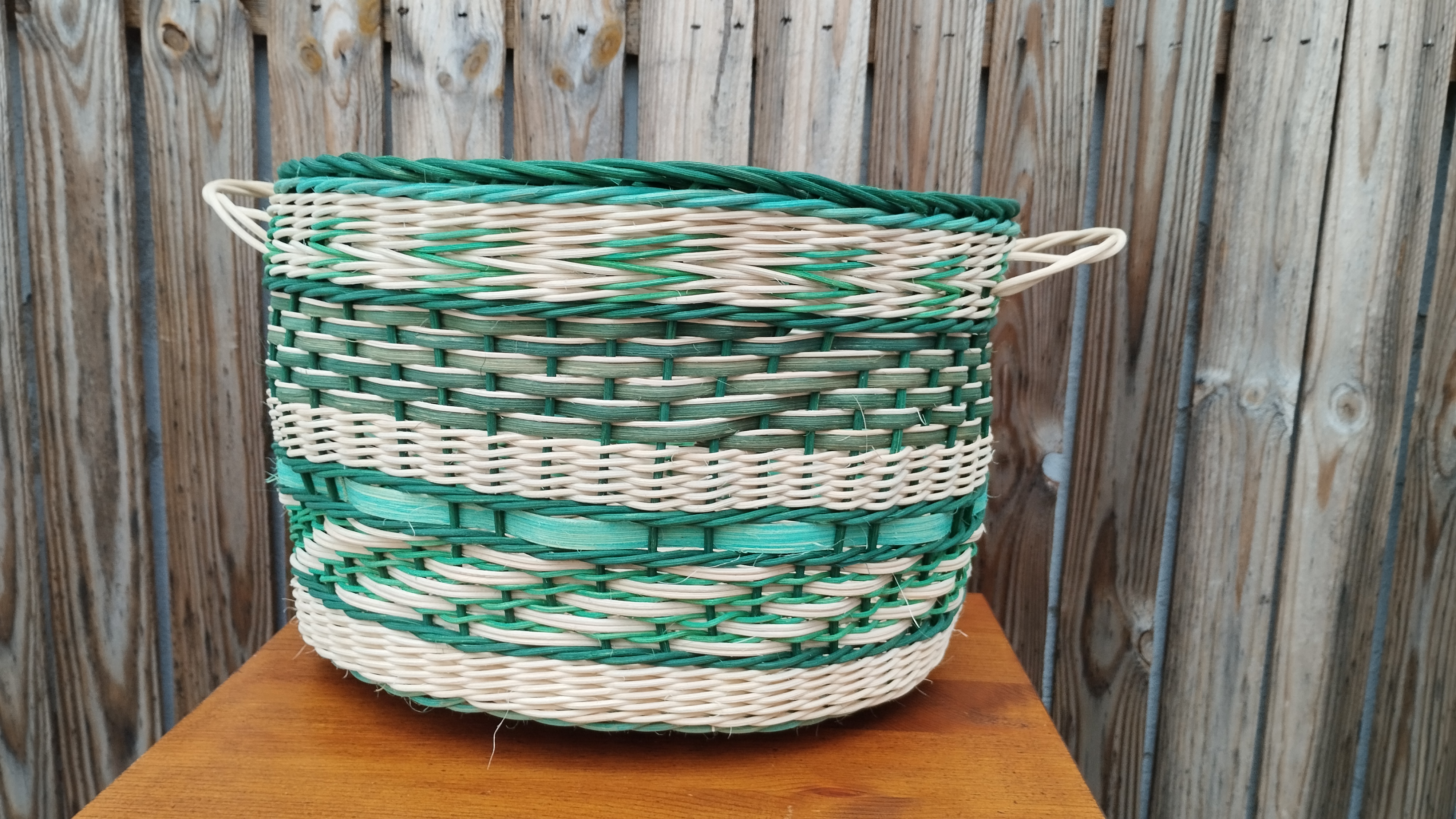 Un assortiment de verts, de tressages (super, torche, planchette, fleur de lys) et de rotin (moelle, éclisse, bande) pour cette grande panière avec ces deux petites anses.