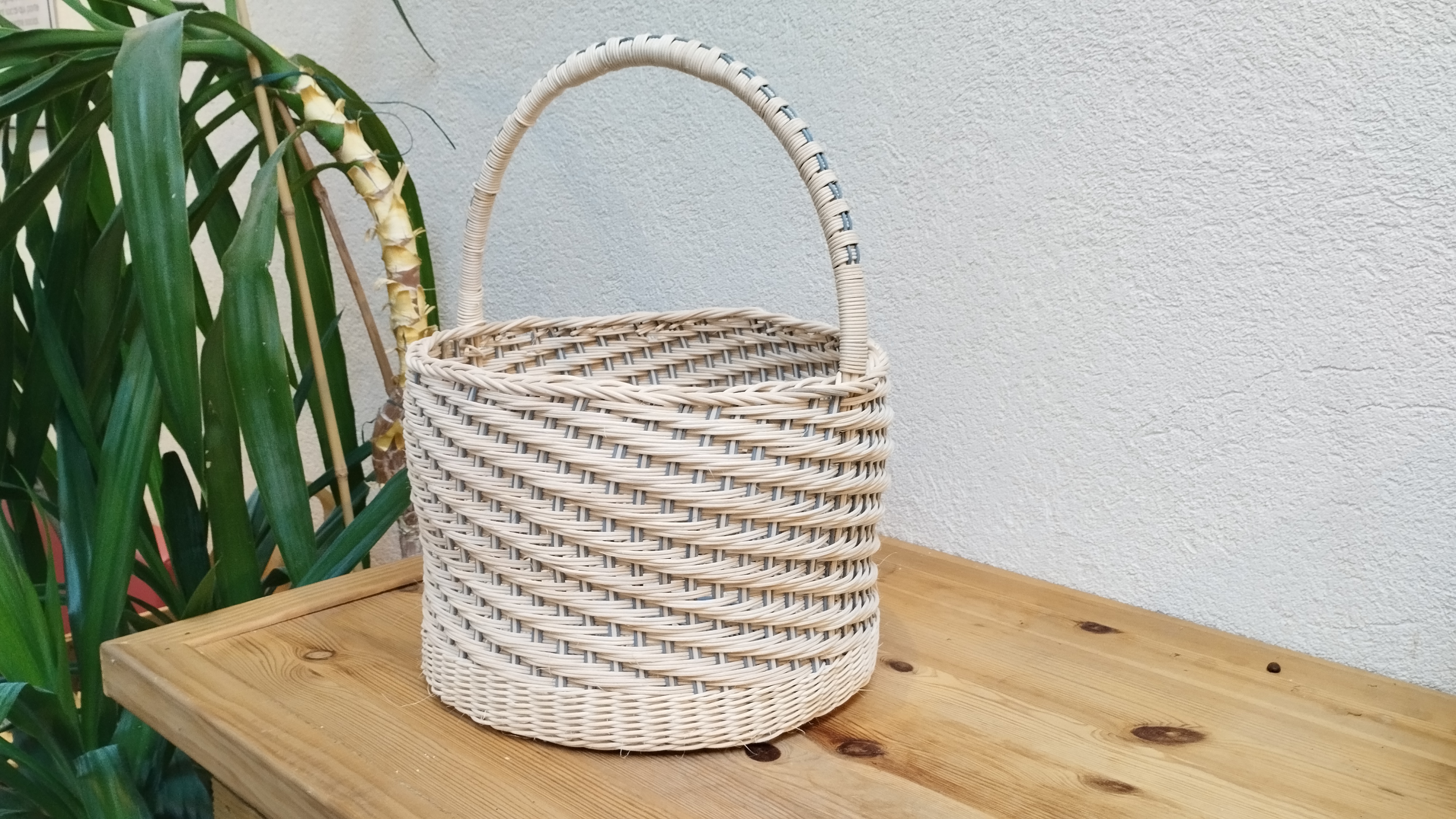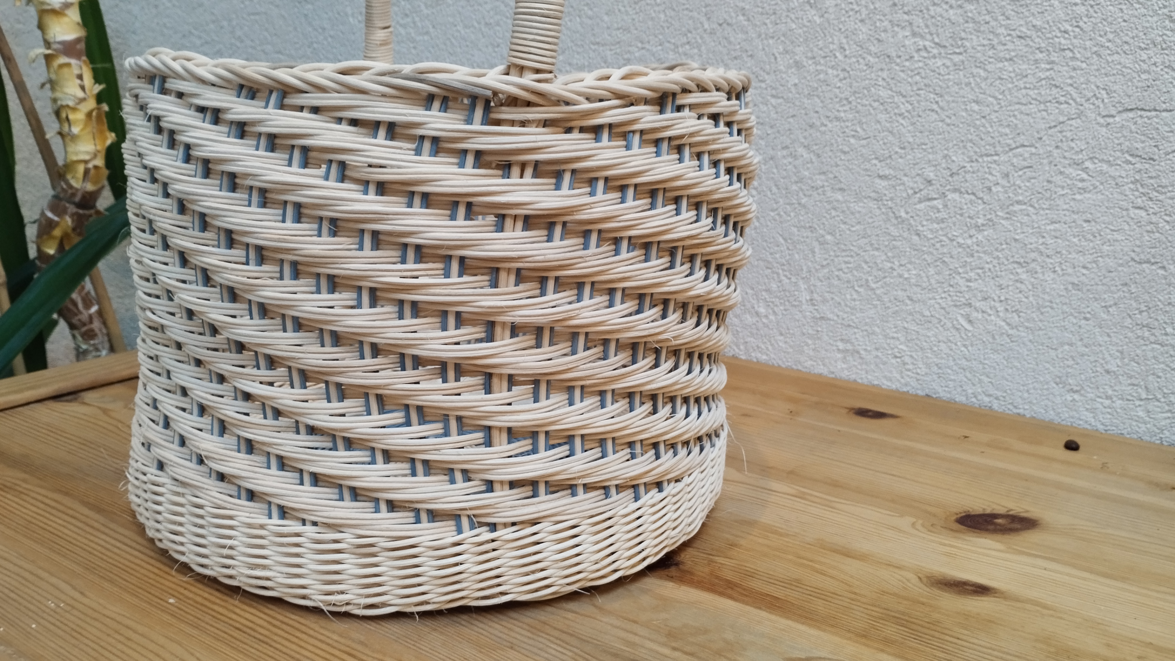 Francis a tressé un grand panier en moelle de rotin naturel. Le tressage est en torche et en planchette décalée. Il a inséré deux montants bleu clair dans la clôture, ce qui fait ressortir l’effet spiralée du tressage. Le panier est terminée par une jolie anse naturelle et bleue elle aussi.
