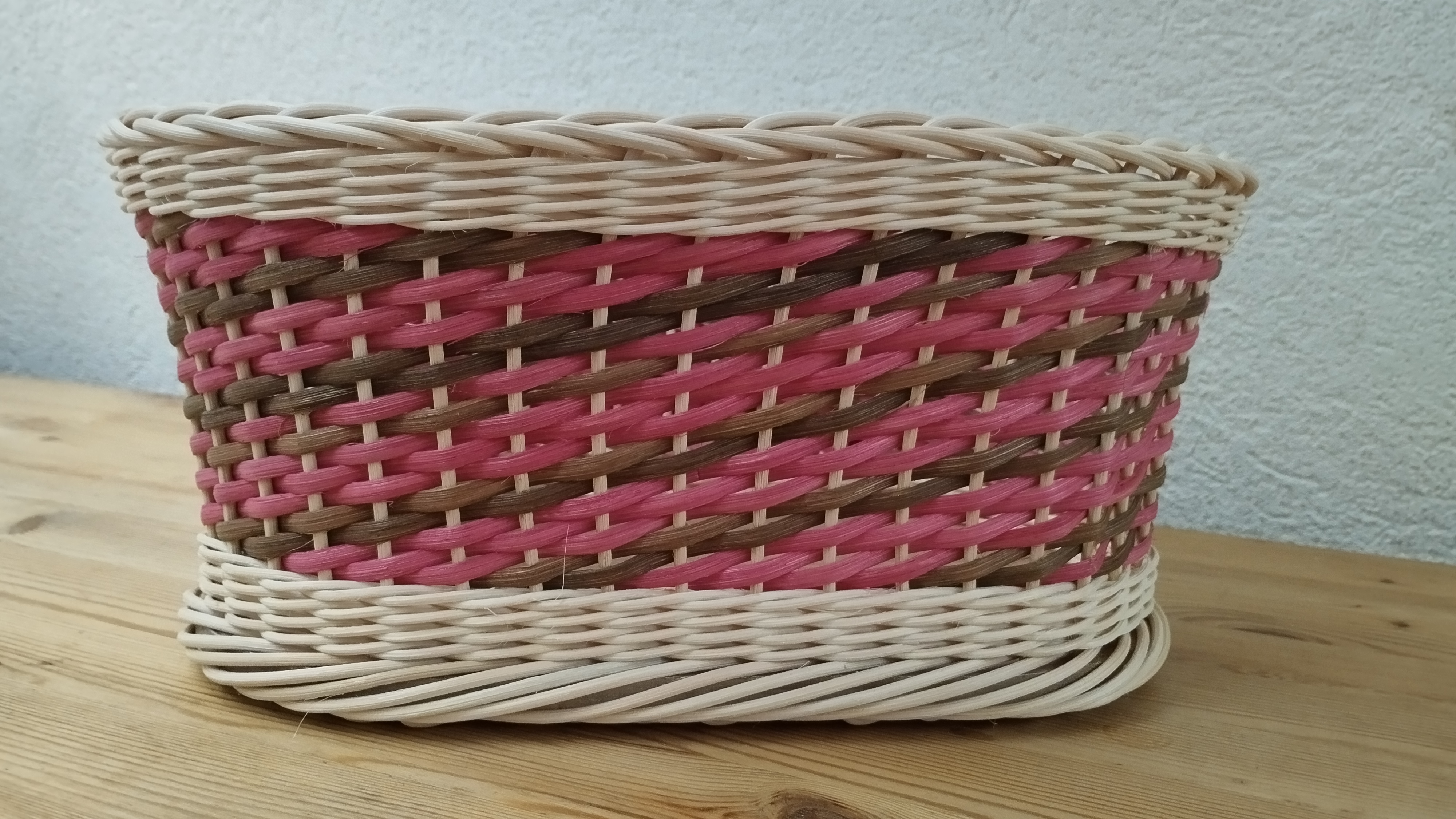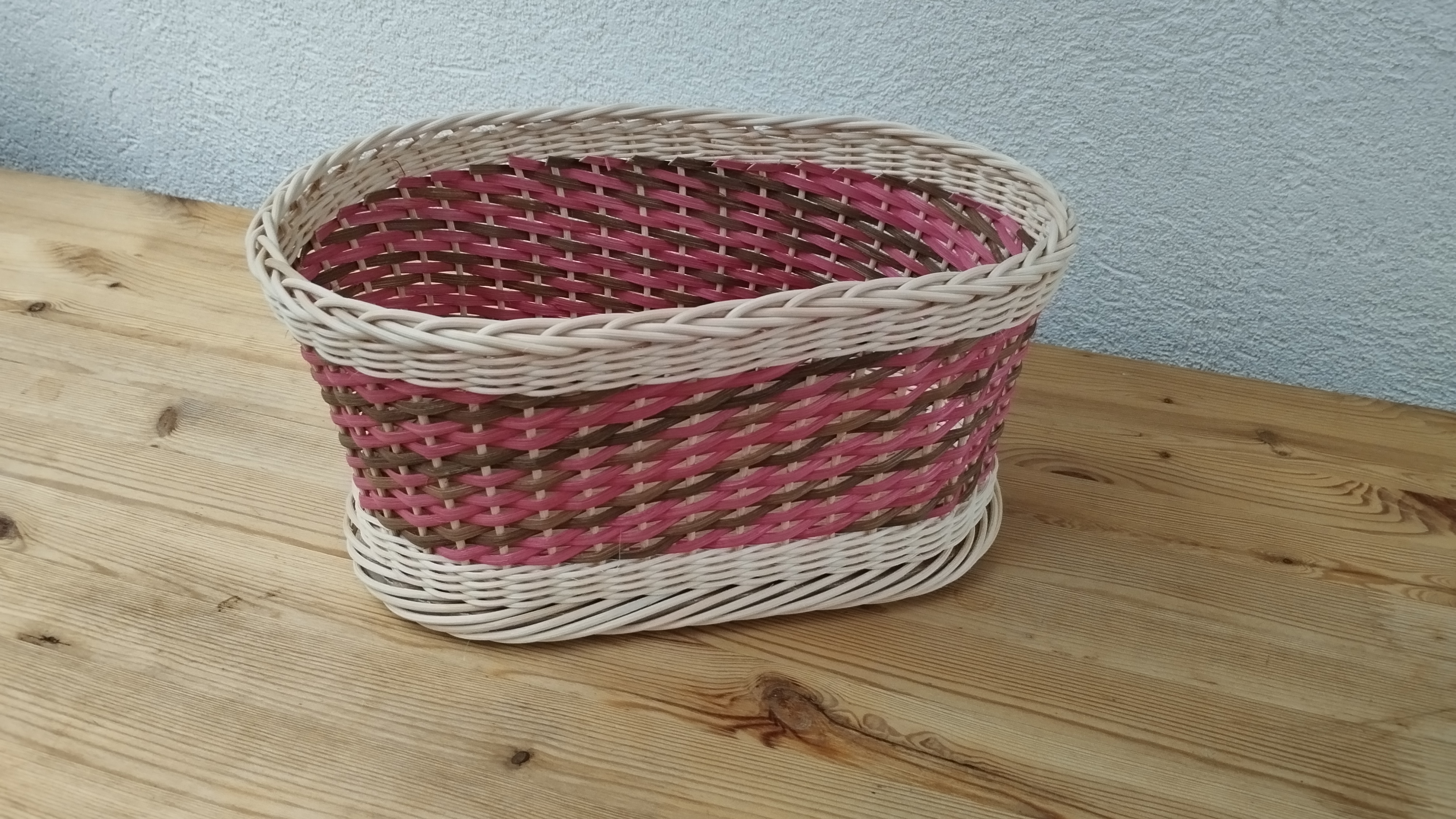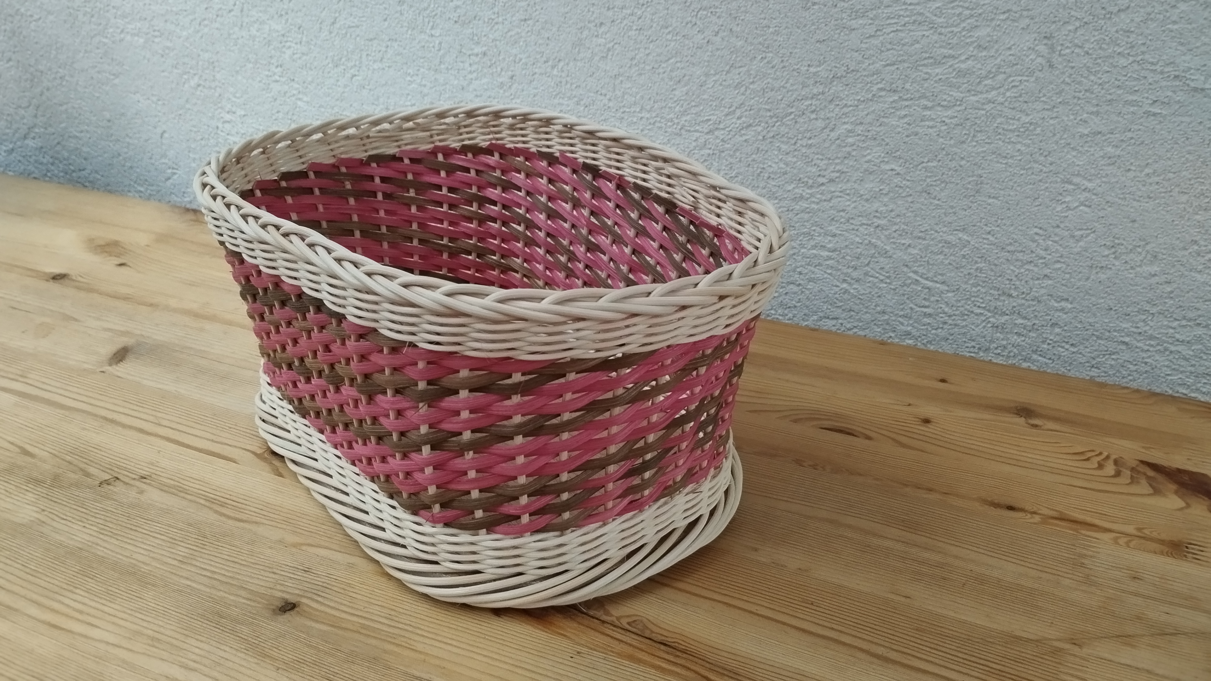 Très jolie corbeille réalisée par Nelly. Sur un fond en bois, elle a tressé en torche avec de la moelle de rotin et en crocane avec de l’éclisse.
