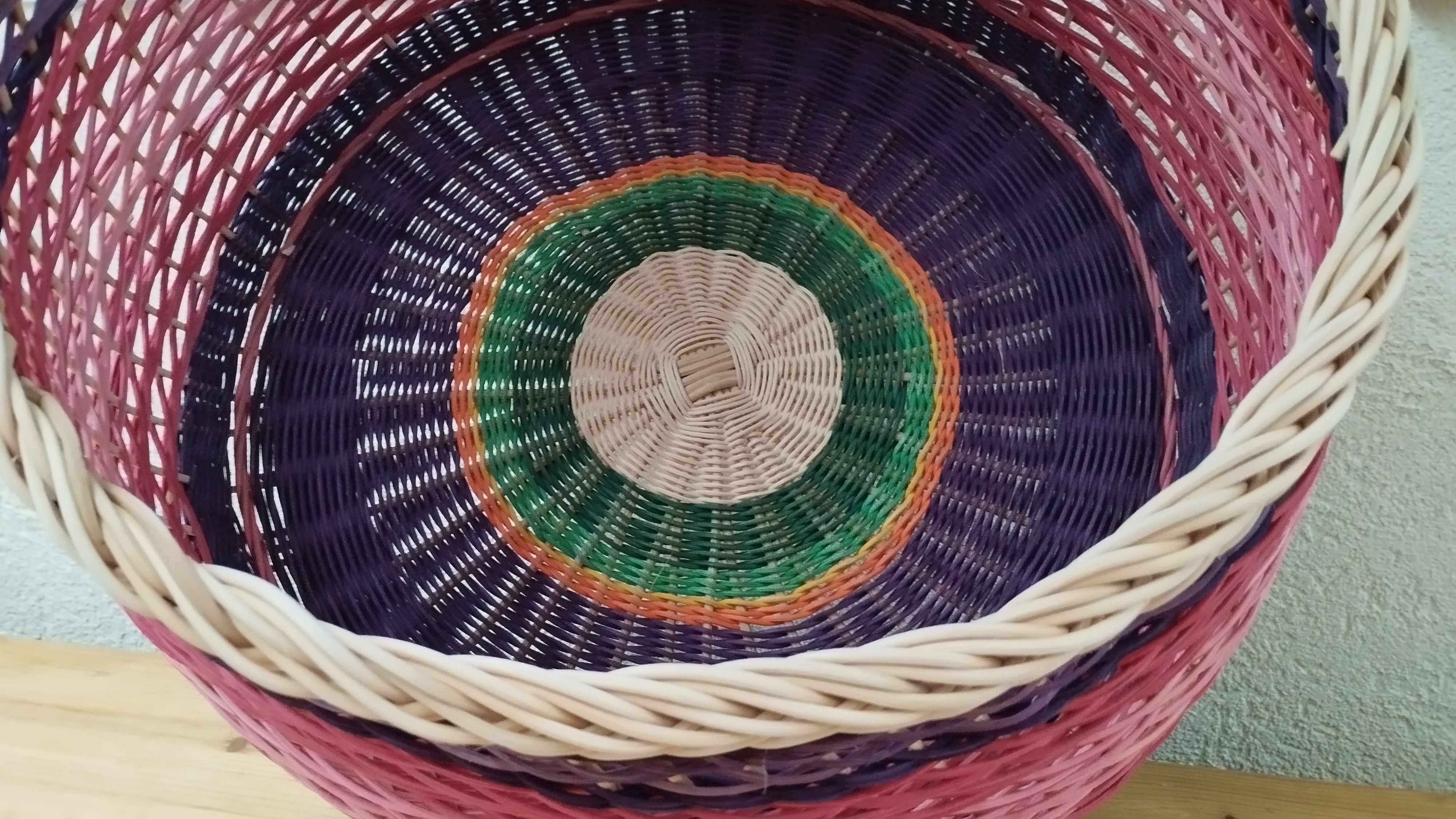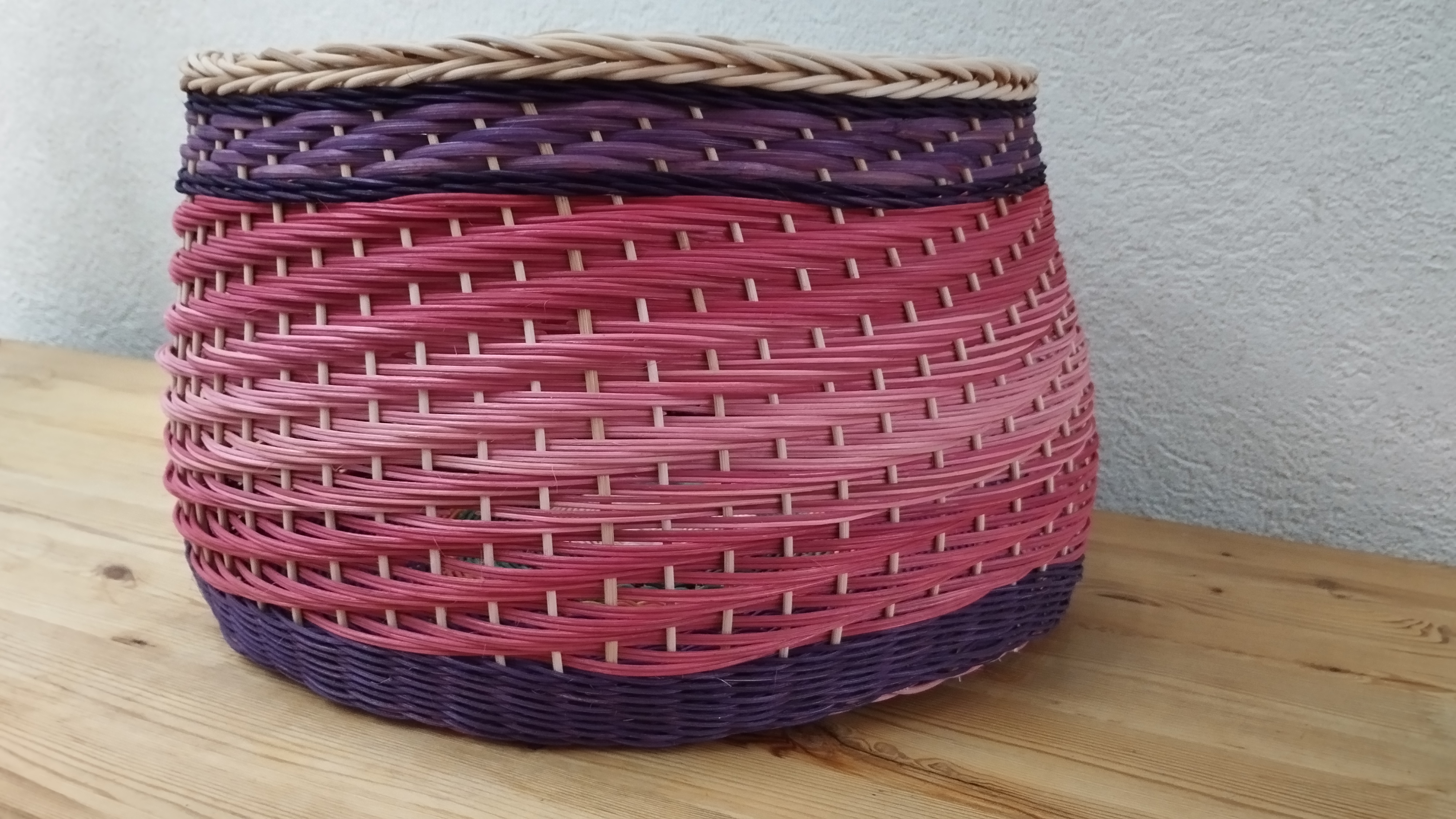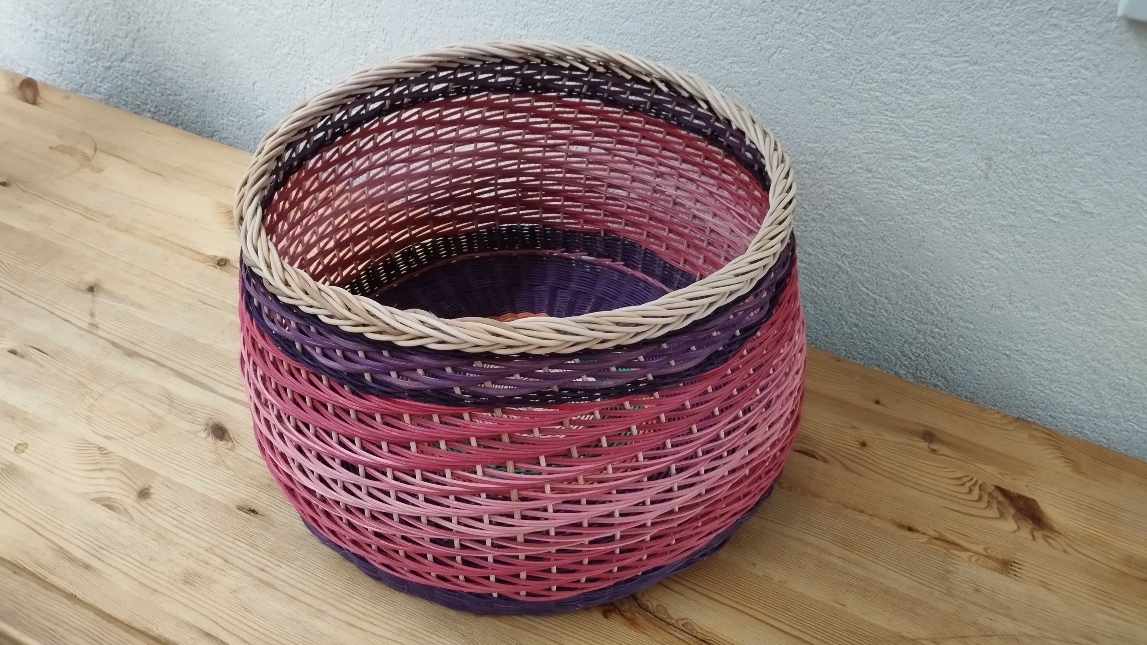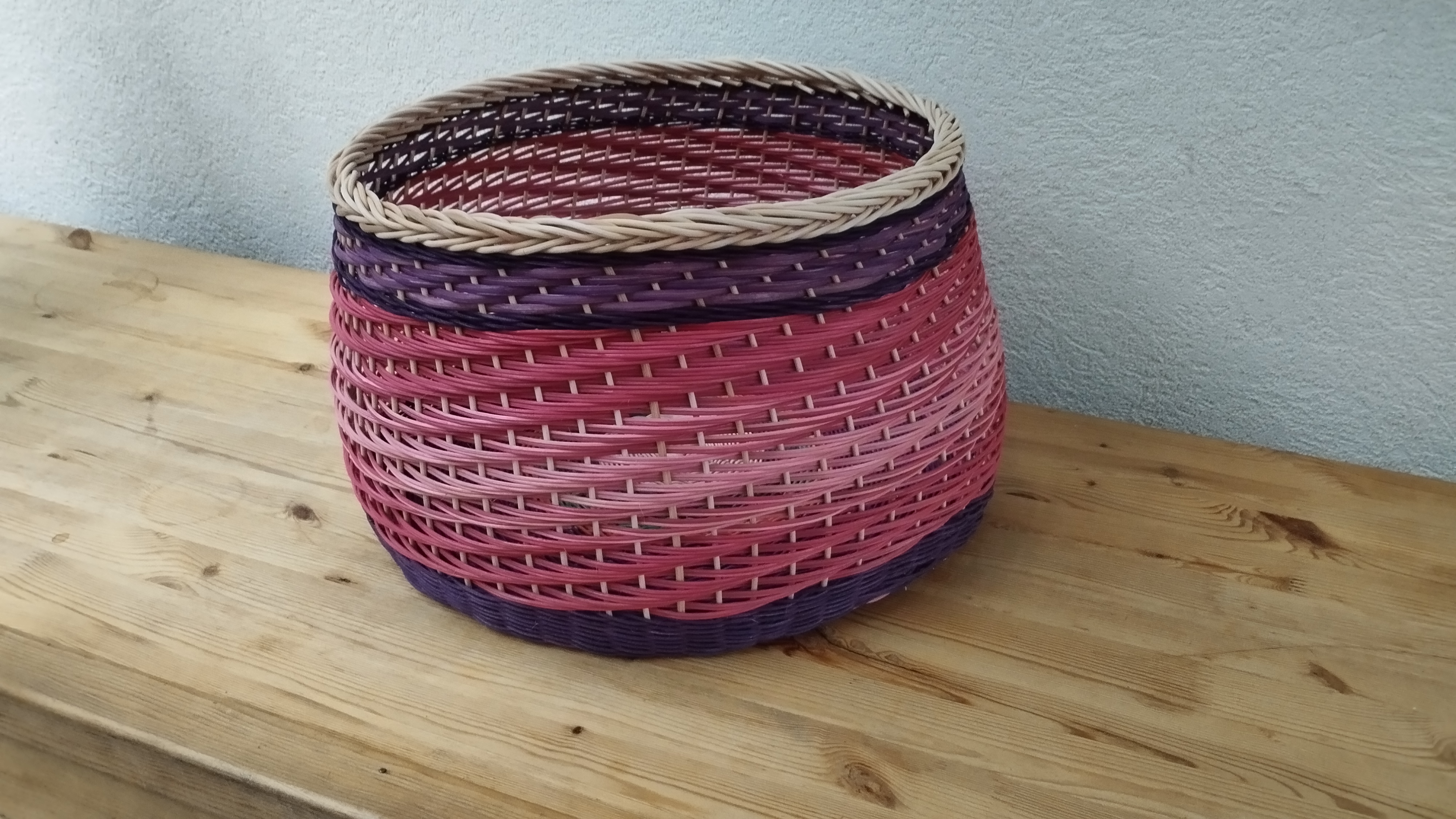 Une grande corbeille pour ranger des doudous réalisée par Laura en moelle et éclisse de rotin avec un tressage en torche et en planchette décalée. Très bel effet de dégradé de roses 🙂