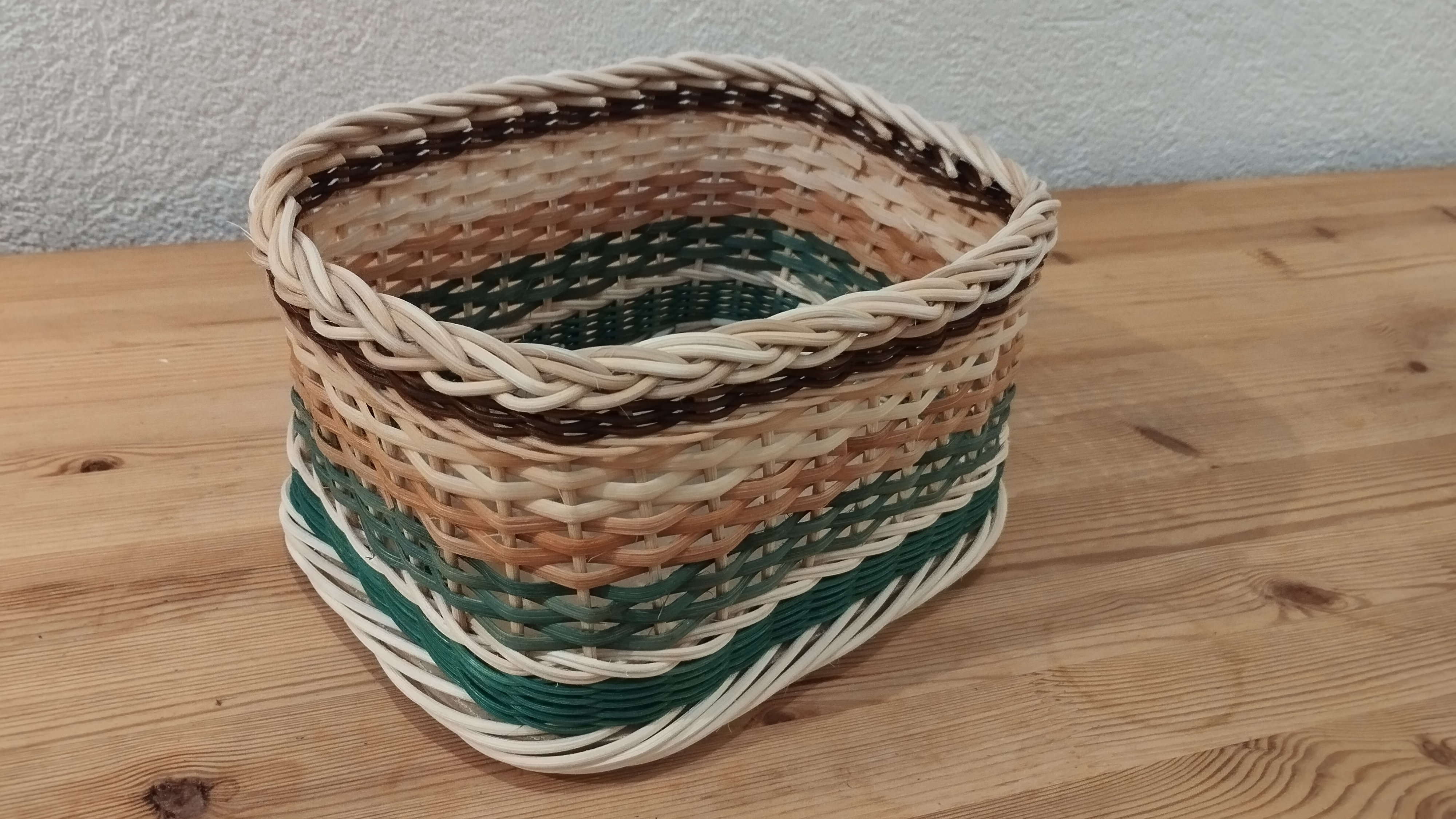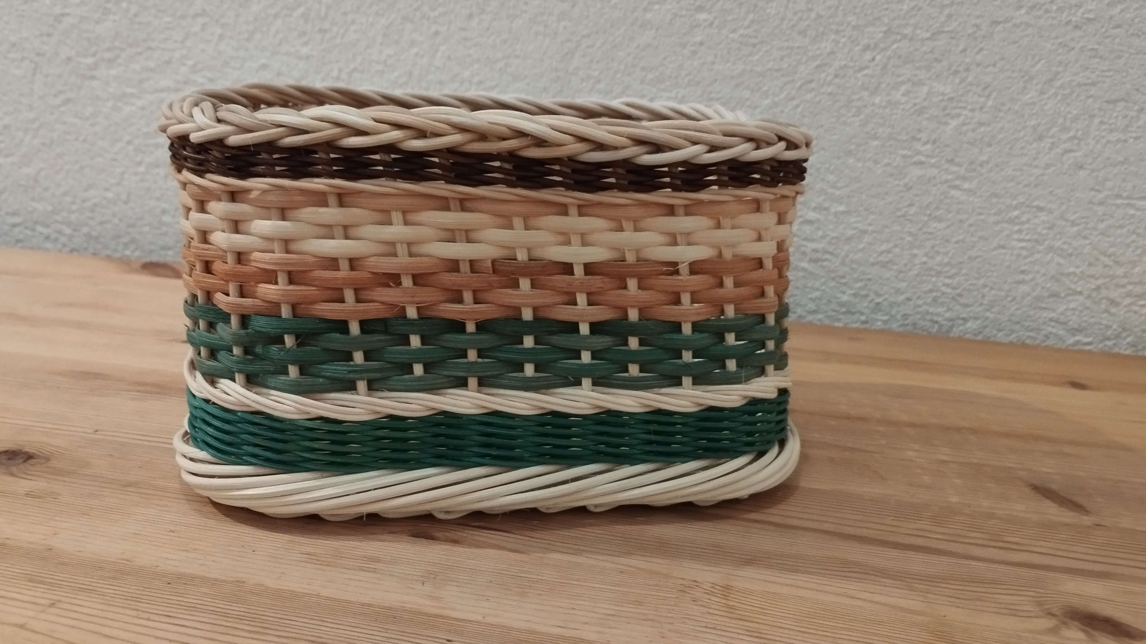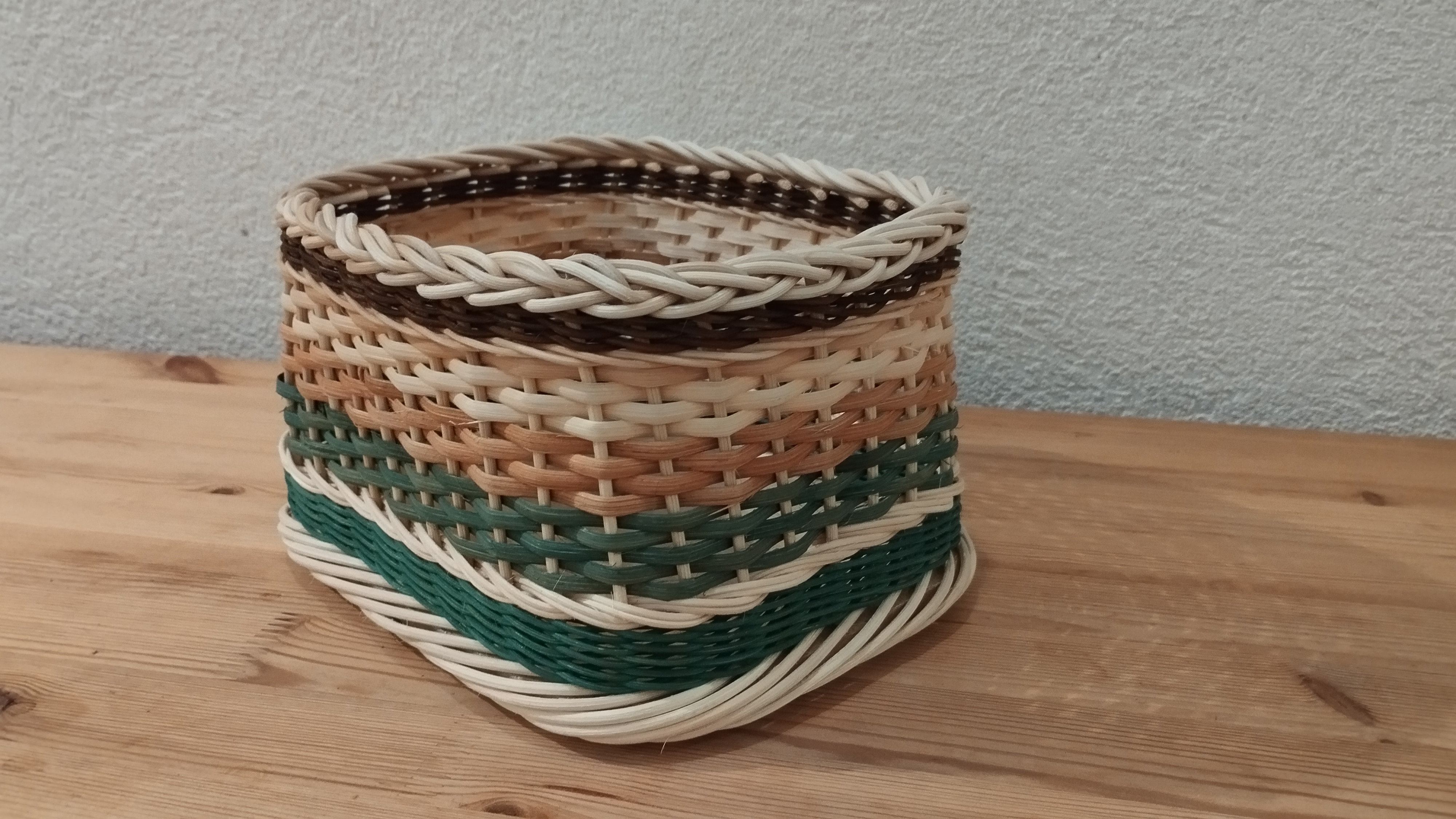 Pour la reprise, Laura est partie sur un fond en bois et a tressé cette jolie corbeille en moelle et éclisse de rotin. Elle a varié les points de tressage : super, torche, brins perdus et bordure ordinaire.
