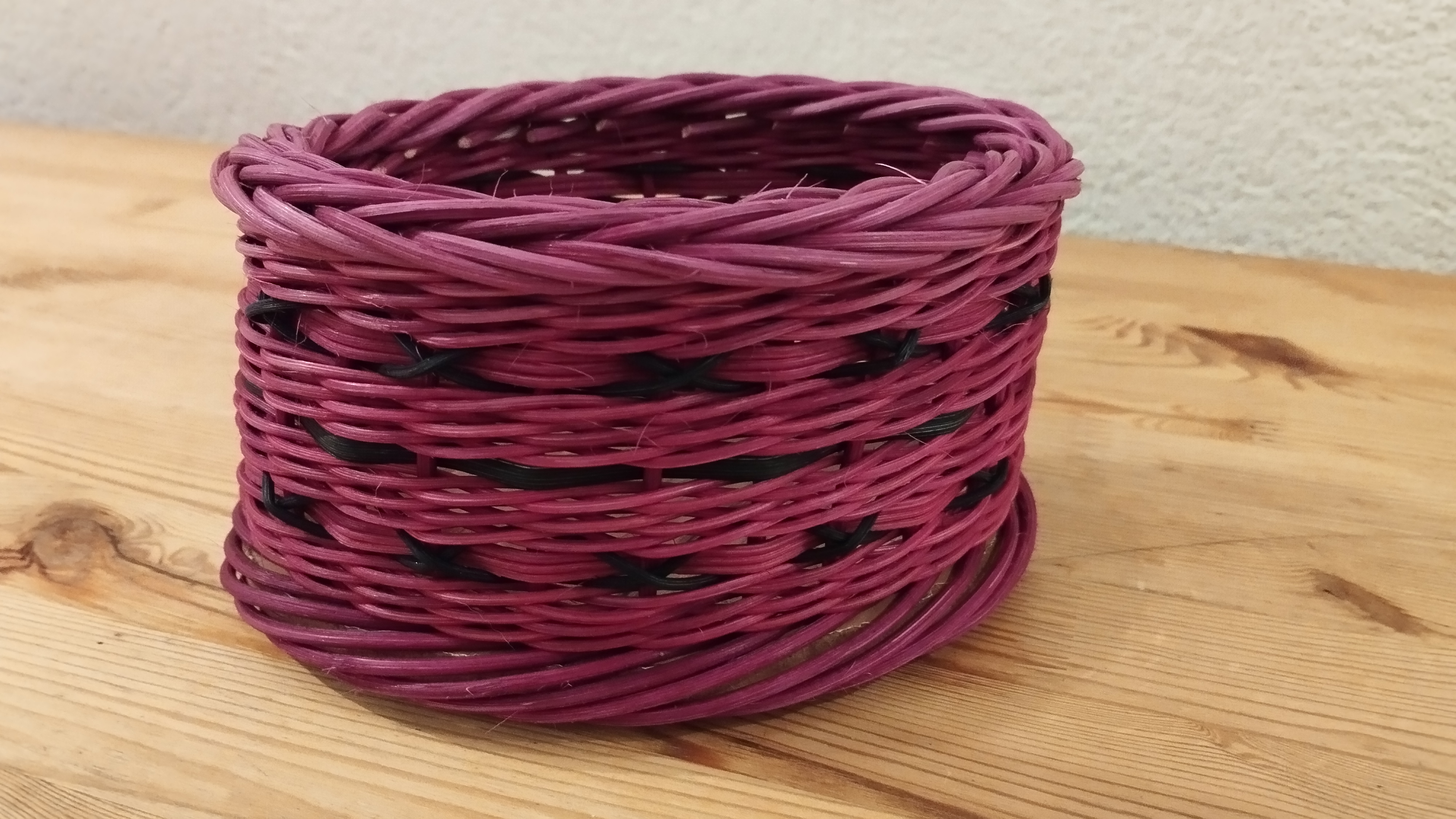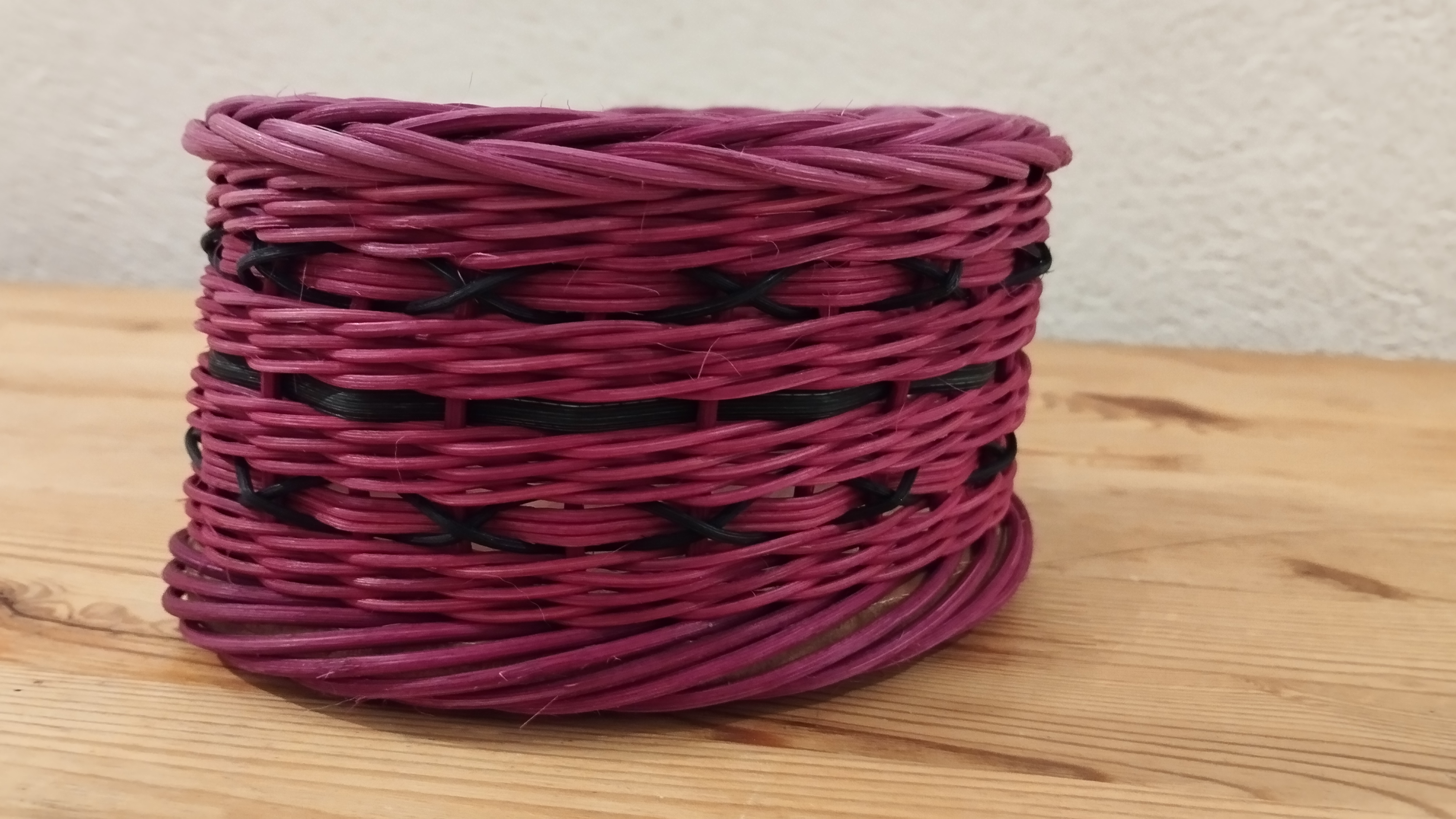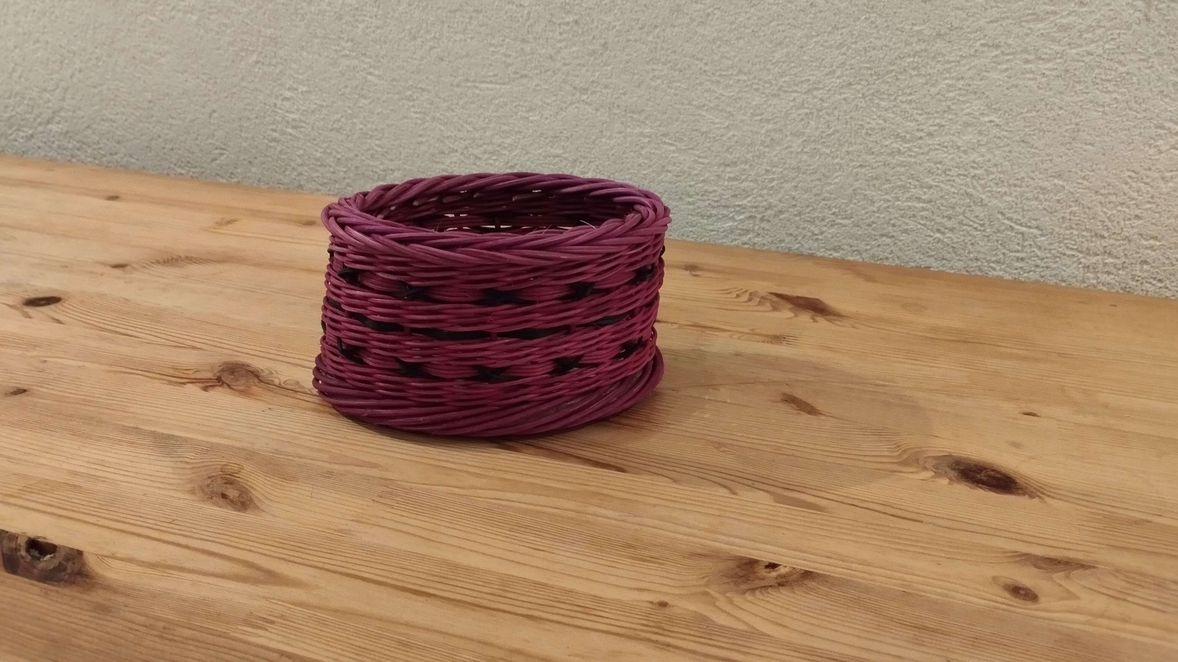 Sur un fond en bois, Dominique a réalisé cette corbeille avec de la moelle de rotin. Elle a tressé en torche et point diamant et terminé par une bordure ordinaire. .